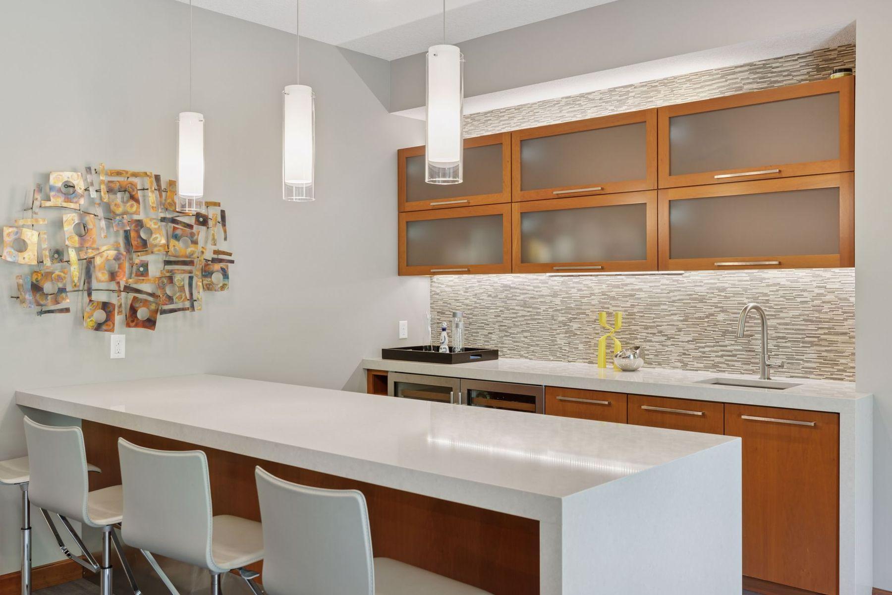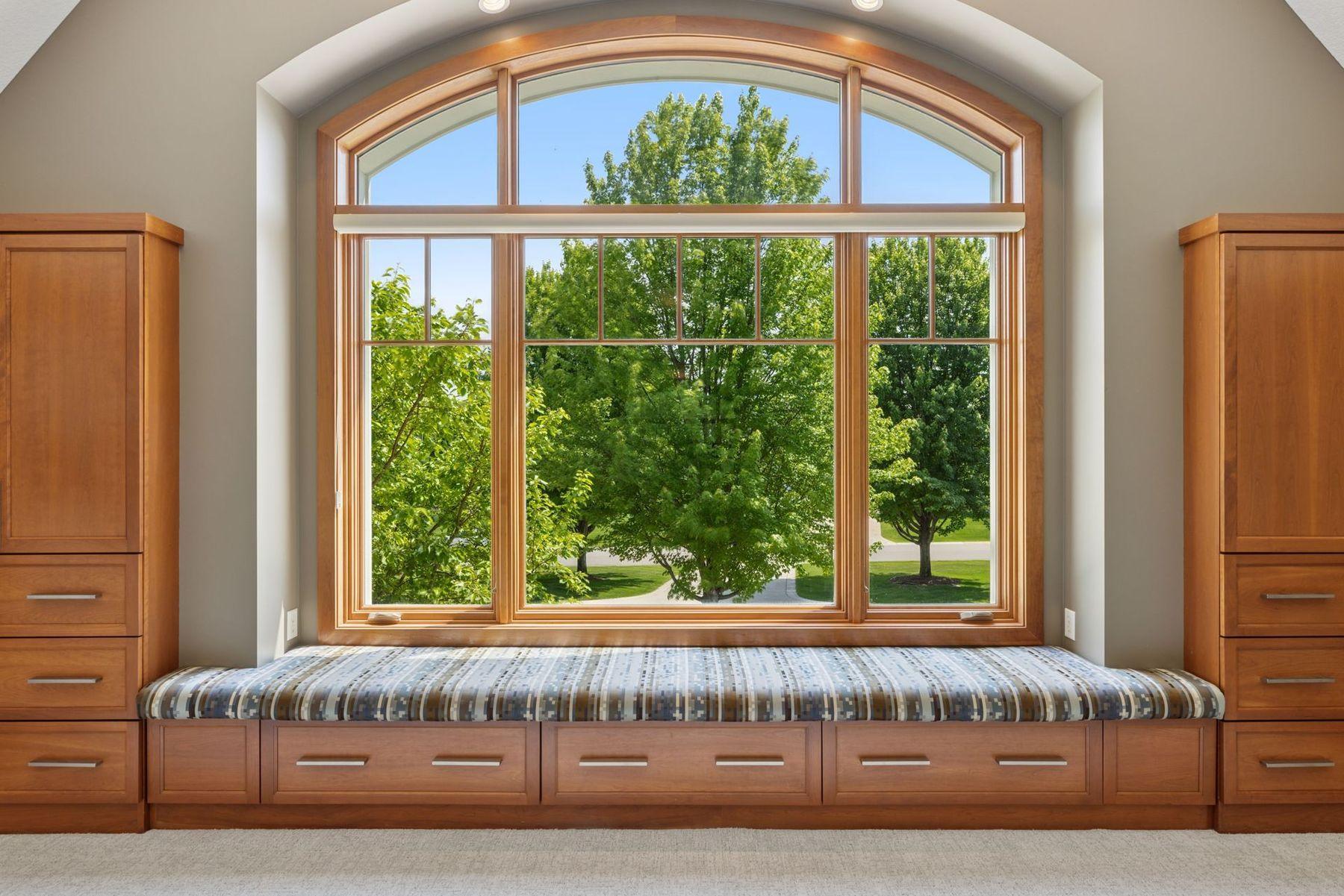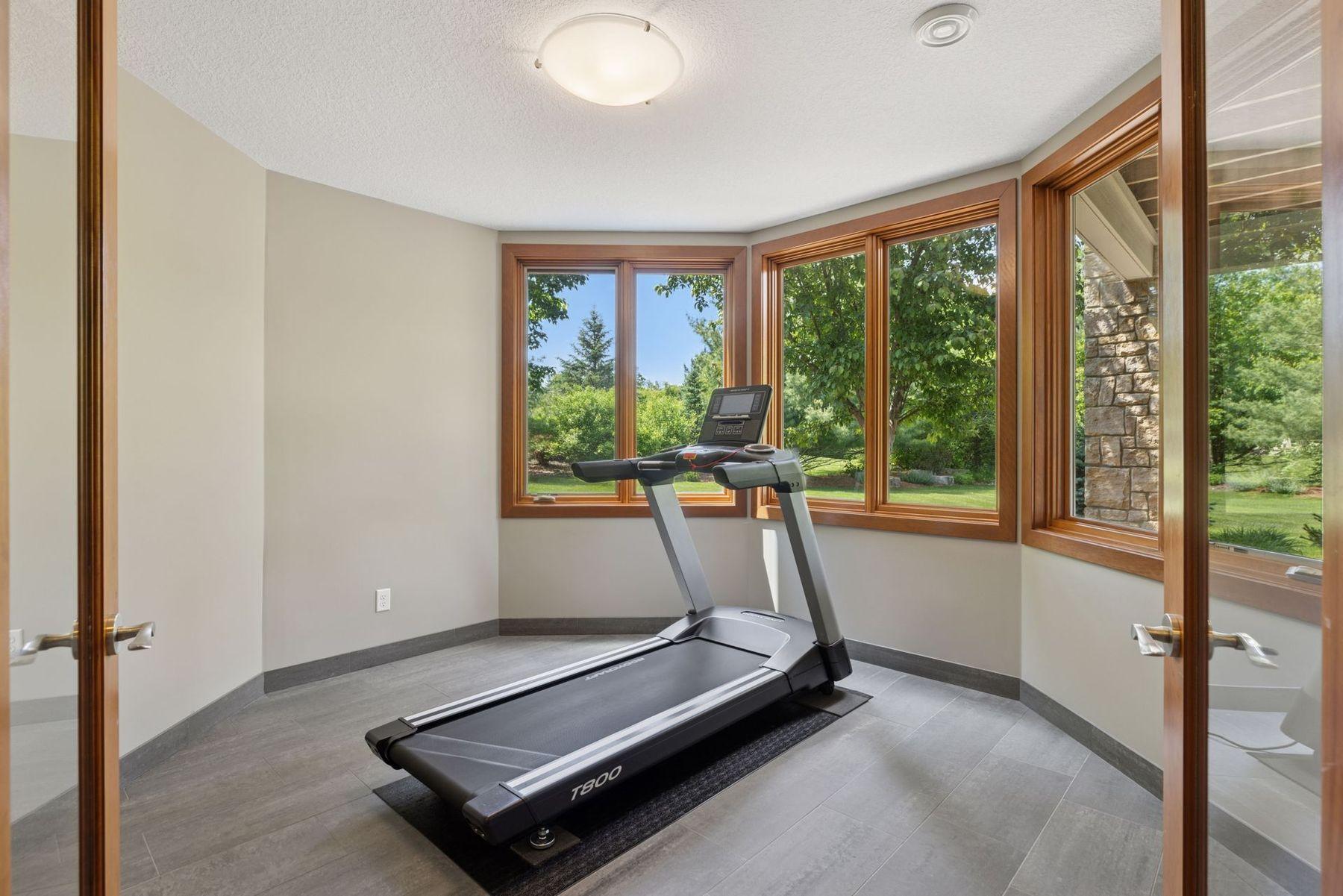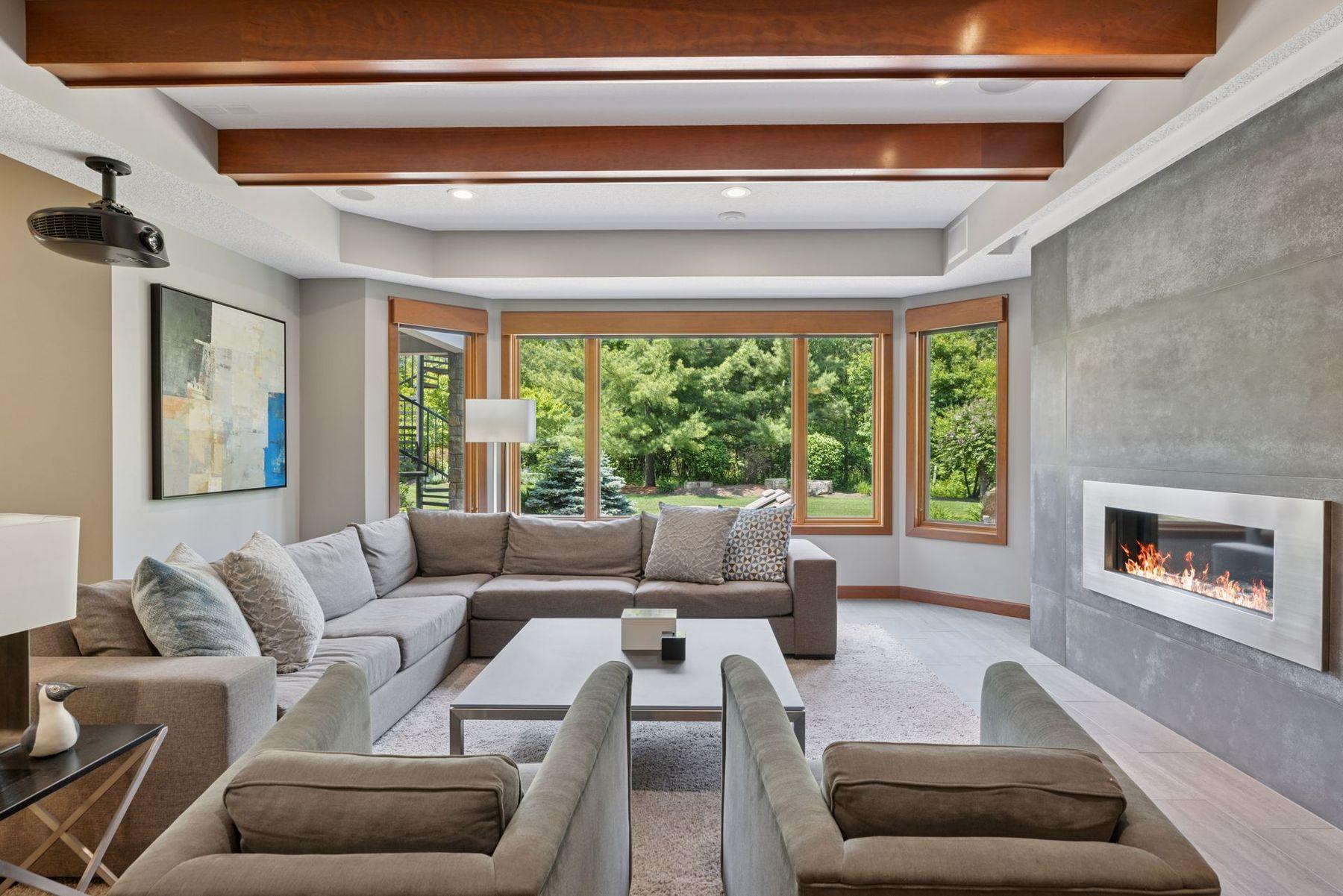 Exquisite custom craftsmanship by Anderson Sorenson sets the tone for this breathtaking estate, where timeless elegance meets modern sophistication. Nestled on a manicured lot with stunning curb appeal, the home is framed by a circular driveway and showcases a prominent peninsula surrounded by lush, professionally designed landscaping. Step inside to a bright and spacious floor plan bathed in natural light, where wide-open rooms reveal serene, treetop views from nearly every angle, and rich cherry millwork and premium finishes lend a warm, refined ambiance throughout. The showstopping great room is crowned by a dramatic two-story, barrel vault ceiling with coffered beams and oversized windows, anchored by a monumental, floor-to-ceiling fireplace made of real stone. For entertaining, host in grand style in the massive formal dining room or gather in the gourmet kitchen, where a two-tier center island provides extra seating, and beautiful cherry cabinetry is accompanied by top-tier appliances. Plus, an informal dining nook is cozy and comfortable with its wall-mounted gas fireplace and more of those priceless views through walls of windows. The main-level Owner’s suite offers luxurious tranquility with its spa-like en suite and a walk-through, walk-in closet complete with a custom organization system; and you’ll be sure to appreciate a functional mudroom off the oversized, three-car garage, which provides laundry, a walk-in closet, and extensive cabinetry and counter space to organize the day’s mess. Upstairs, an open catwalk lends expansive views of the entire home and leads to an enormous office, impressive family room with a gas fireplace flanked by built-ins and access to a balcony deck, two bedrooms with walk-in closets, and a full bath. And if you’re looking for more options to entertain, the lower level is a dream come true with its theater system, incredible stamped concrete gas fireplace, full wet bar with a modern design and bonus game and exercise areas, not to mention two additional bedrooms and baths, perfect for guests. The walkout then leads to a generous patio and maintenance-free deck above in one of the most breathtaking and private backyards you’ve ever seen…and with plenty of room for a pool! Located near Lake Elmo Park Reserve with quick access to I-94 and Woodbury amenities, this home offers unmatched privacy, beauty, and convenience.