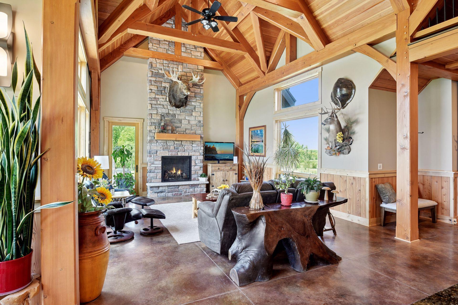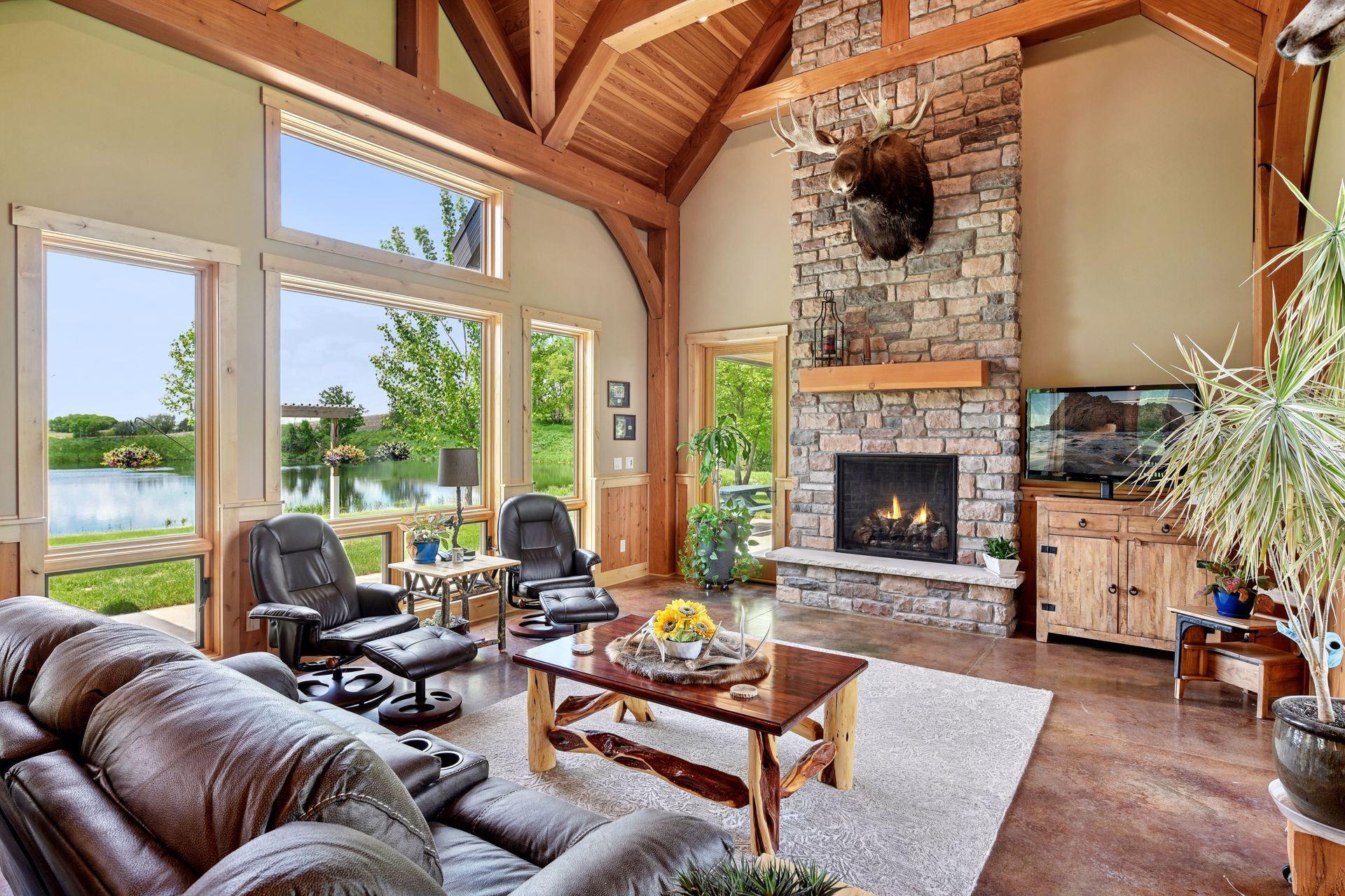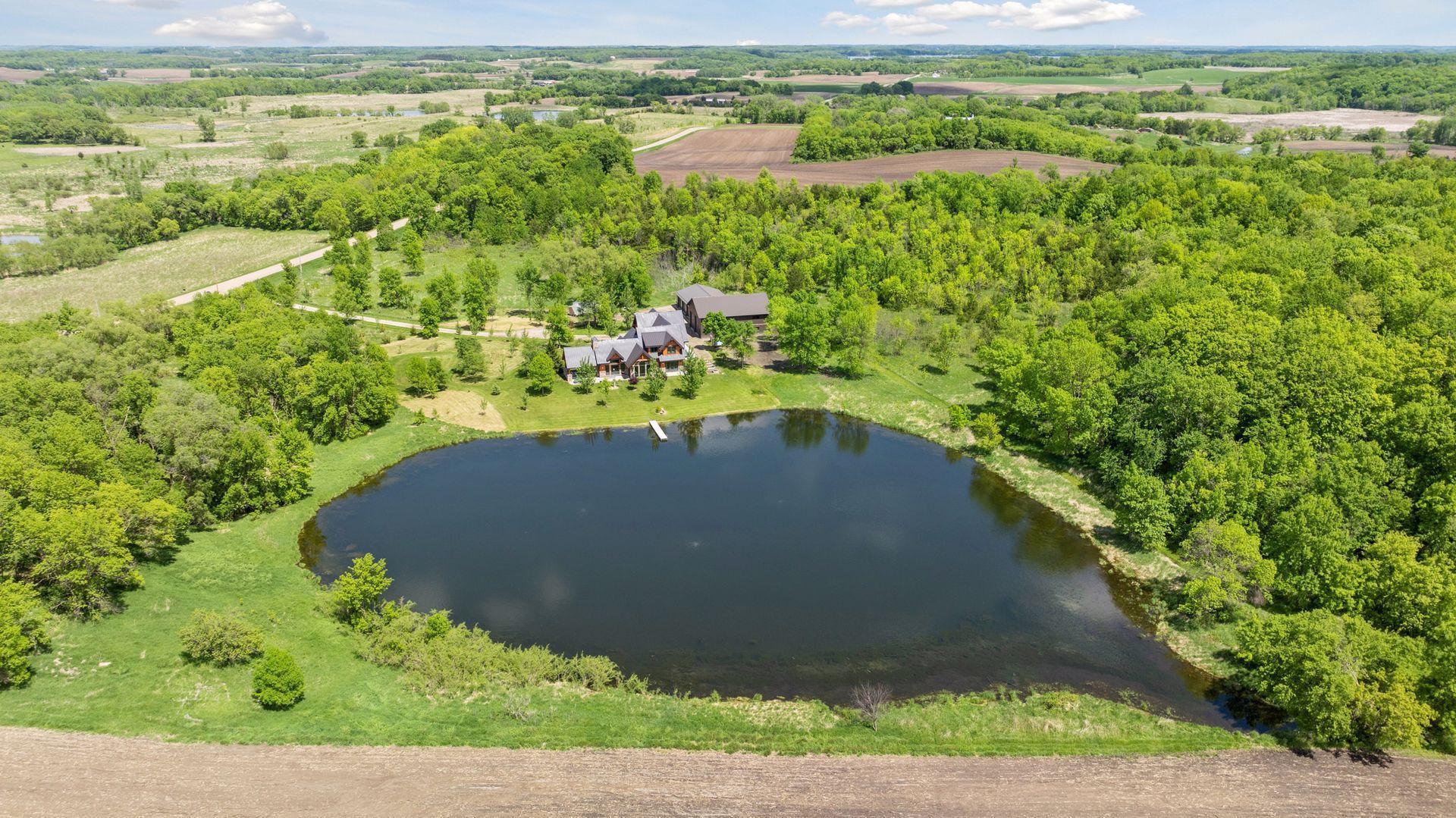 Welcome to Minnesota's Outdoor Paradise – Live Where Adventure Begins! This is THE property your wildlife and outdoor enthusiast has been waiting for! No expense was spared and no detail was missed to make this home truly spectacular. The home offers 3,393 finished sq ft, 4 bed, 3 bath and all living on main level. The high quality details include Wirsbo in floor heat, 18' vaulted ceilings, timber framed main structure with US Coastal grown Douglas Fir and a slab on grade home with ample storage. The high end kitchen has Rustic Hickory cabinetry, granite countertops, Thermador appliances, Miele dishwasher and a spacious working pantry. The main floor primary offers amazing water views, walk in shower with 5 shower heads and a spacious closet that connects to the laundry room. The upper level has a loft, 3 additional bedrooms, an office/bunk room and lots of closet storage space. Step outside to the covered patio to enjoy serene sunsets. Over 30 acres to hunt Pope and Young bucks and trophy turkeys, fish for 13"+ sized crappies in the aerated pond. The huge 36' x 70' pole building and 40'x56' main garage make up the climate controlled pole building with 8 stalls (11 total with 3 car attached to house) with RV parking, boat, workshop, mezzanine area, etc. Don't miss your chance to own this rare Minnesota gem—where every season brings a new adventure right to your doorstep.