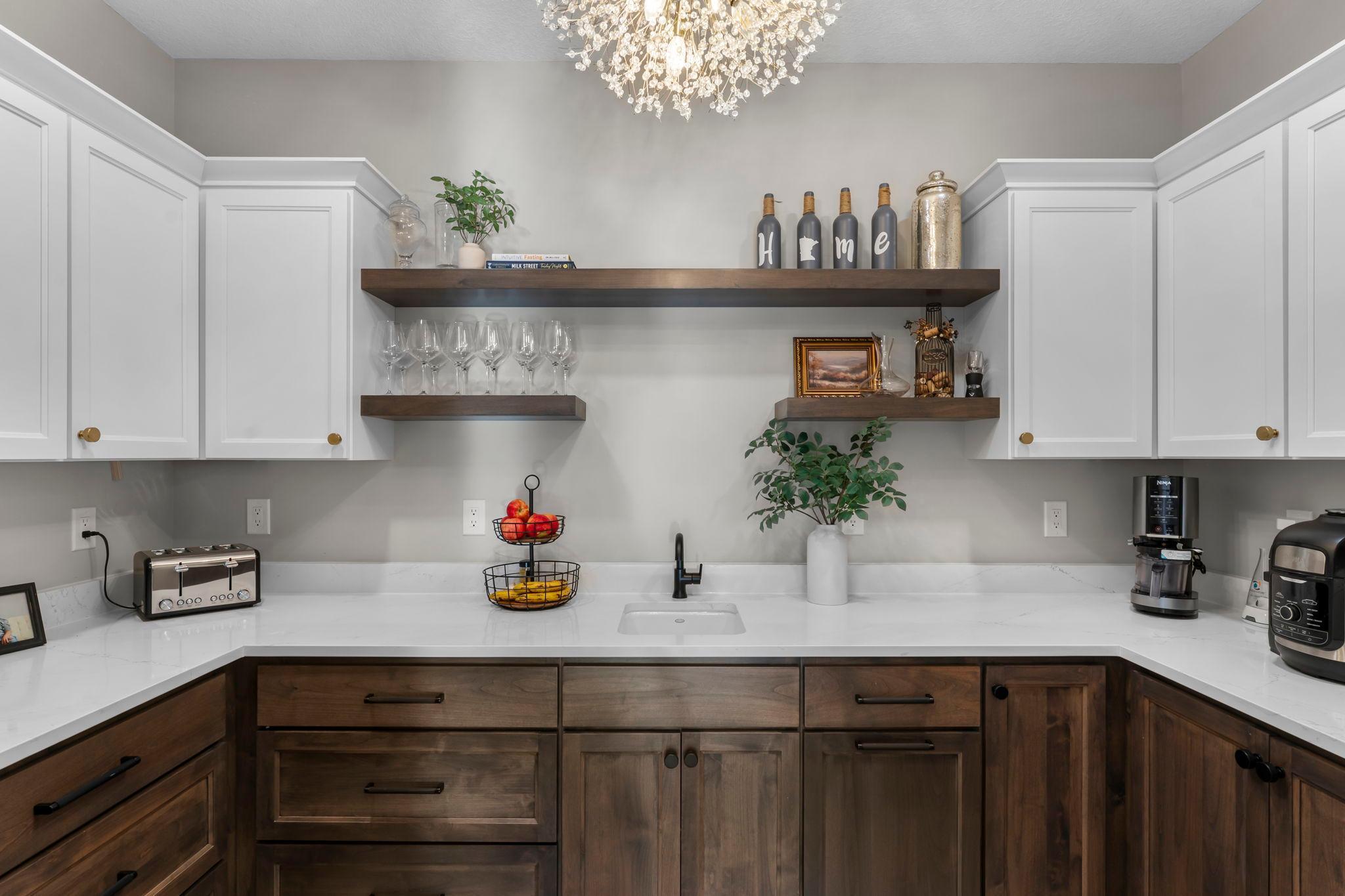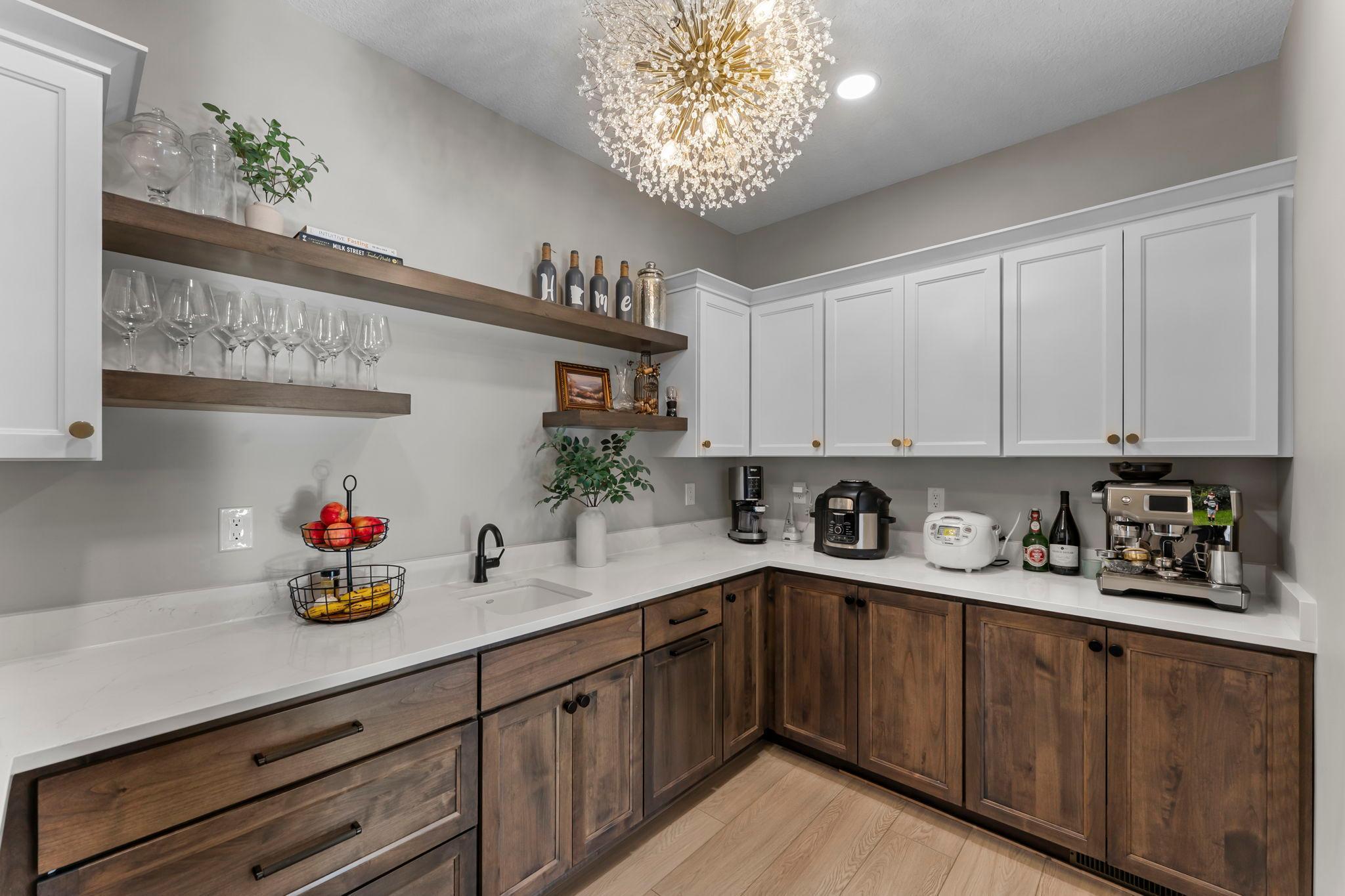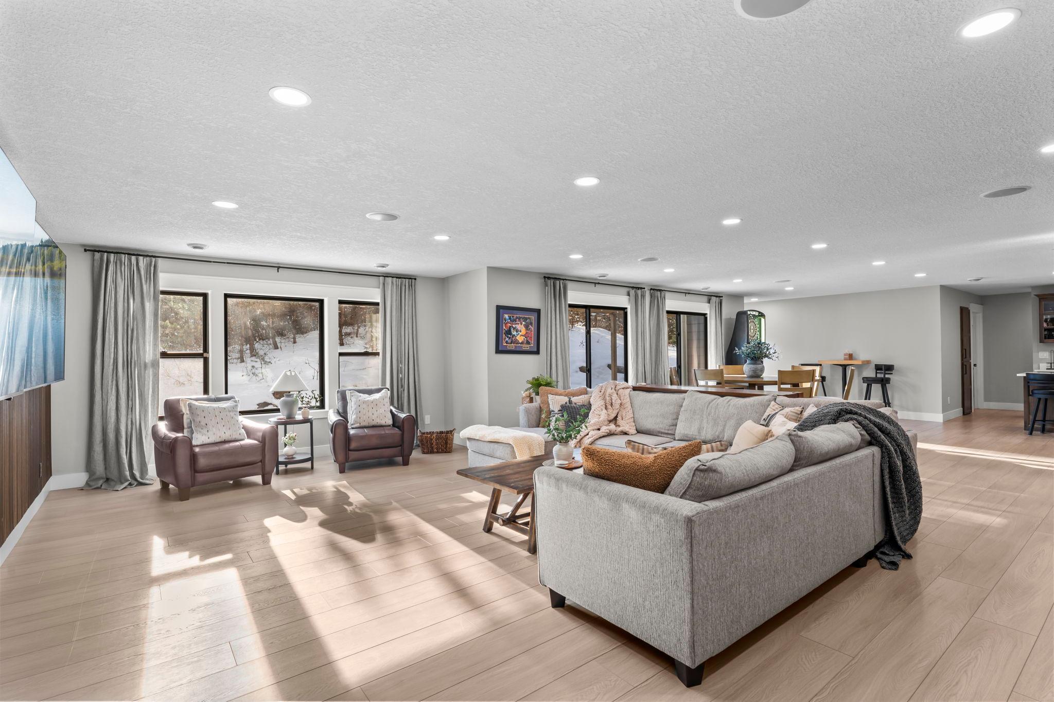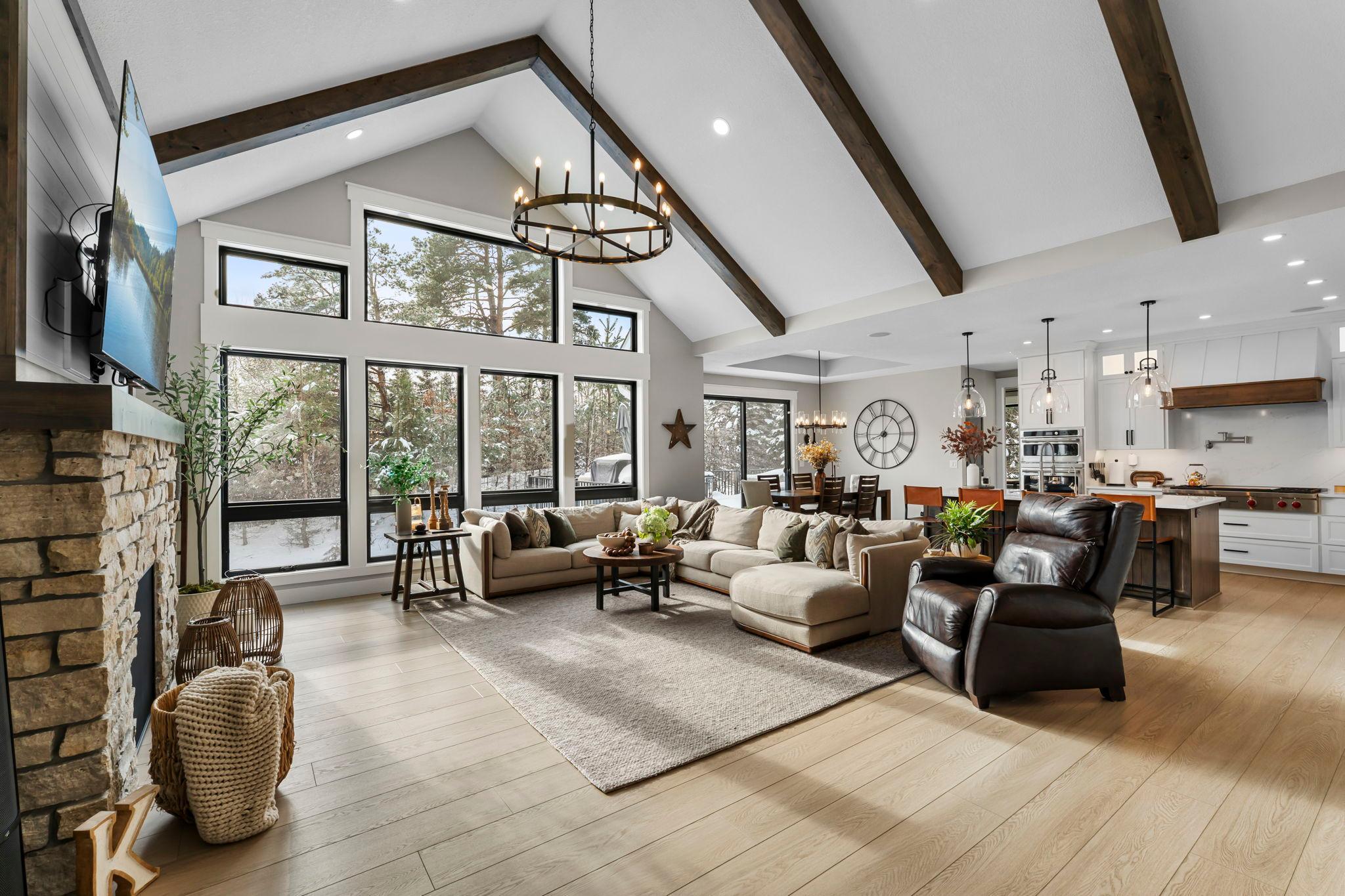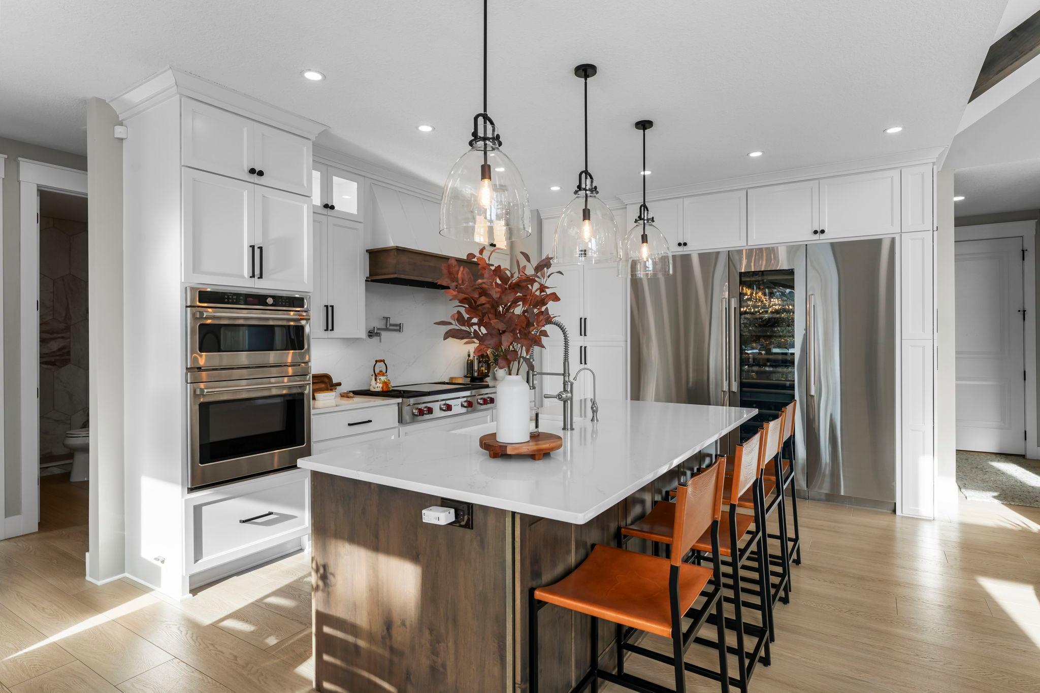 This massive luxury rambler immediately impresses with an oversized 4-car garage offering over 1,200 square feet — large enough for vehicles, storage, a workshop, and all your recreational toys. Inside, the home features a spectacular chef’s kitchen designed for entertaining, along with five spacious bedrooms and four beautifully finished bathrooms, including three conveniently located on the main level for true one-level living. Seller will consider a contract for deed Welcome to Forest Hills Farms, the premier executive neighborhood on Forest Lake. This exceptional one-story home offers an extremely rare layout featuring full primary suites on both the main level and the lower level. Each suite includes a private ensuite bathroom, walk-in closet, and its own dedicated laundry area, making the home ideal for multigenerational living or extended guests while still maintaining complete privacy and comfort. The main level features soaring 10-foot ceilings and a dramatic open layout leading into a spectacular great room with an expansive window wall overlooking an incredibly private backyard. A beautiful fireplace anchors the space while natural light pours through oversized windows. The main-level primary suite includes a spa-caliber ensuite featuring a zero-entry tiled shower and a massive soaking tub. The chef’s kitchen is truly extraordinary, offering commercial-grade amenities including a flat-top grill with hood, commercial refrigerator and freezer, wine fridge, pot filler, and an incredible hidden butler’s pantry disguised as cabinetry. The pantry features its own sink, prep area, and extensive storage to keep the kitchen functional and clutter-free. All four bathrooms feature floor-to-ceiling custom tile showers and commercial power-flush toilets. Comfort is unmatched with seven thermostats controlling forced air and extensive in-floor radiant heat. The entire lower level and the oversized garage are fully heated with in-floor radiant heat powered by a newer boiler, allowing the radiant system to warm the home independently of forced air when desired. The lower level is enormous — ideal for entertaining large gatherings — and includes a second kitchen or bar area, a fitness room with its own thermostat, and an incredible media wall featuring three 90-inch televisions. This entire level enjoys full in-floor radiant heat for year-round comfort. Bedrooms throughout the home feature oversized 6' x 6' Andersen windows that flood the space with natural light. A Dayton Audio whole-house sound system provides independently controlled speakers throughout major living areas, all easily managed from your phone. The exterior features LP SmartSide siding and beautifully stamped and colored concrete that wraps the entire home for a clean, low-maintenance finish. Additional highlights include a concrete driveway, in-ground sprinkler system, massive 9' x 8' garage doors with direct-drive openers, a large Trex maintenance-free deck, and a professionally designed stone retaining wall. The property also includes deeded access to Forest Lake, offering lake privileges within one of the area’s most sought-after neighborhoods. This rare luxury rambler combines three main-level bedrooms, dual primary suites, commercial-grade finishes, extensive in-floor heating, and countless high-end features that would cost hundreds of thousands more to replicate today. A truly exceptional home in one of Forest Lake’s most prestigious communities.