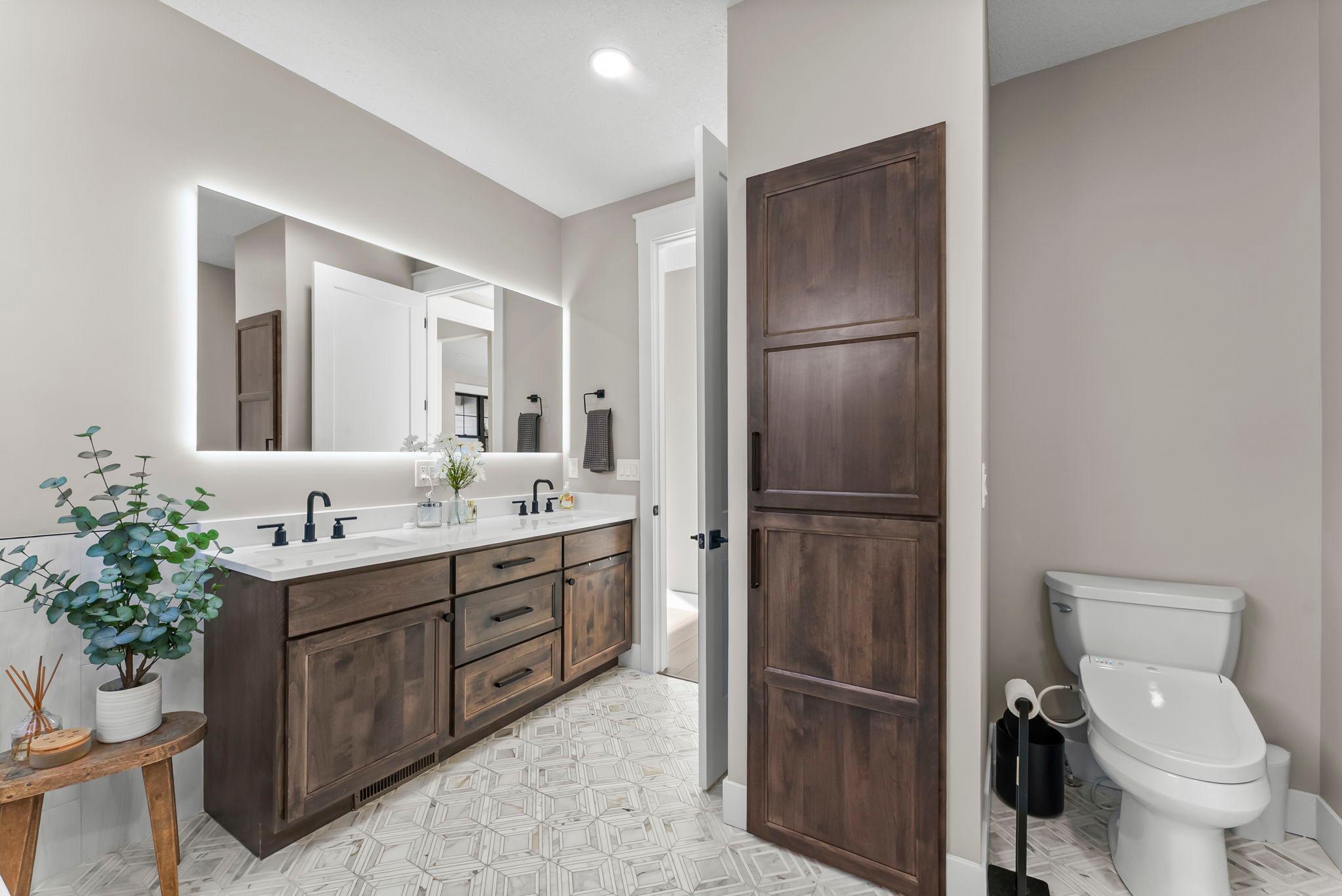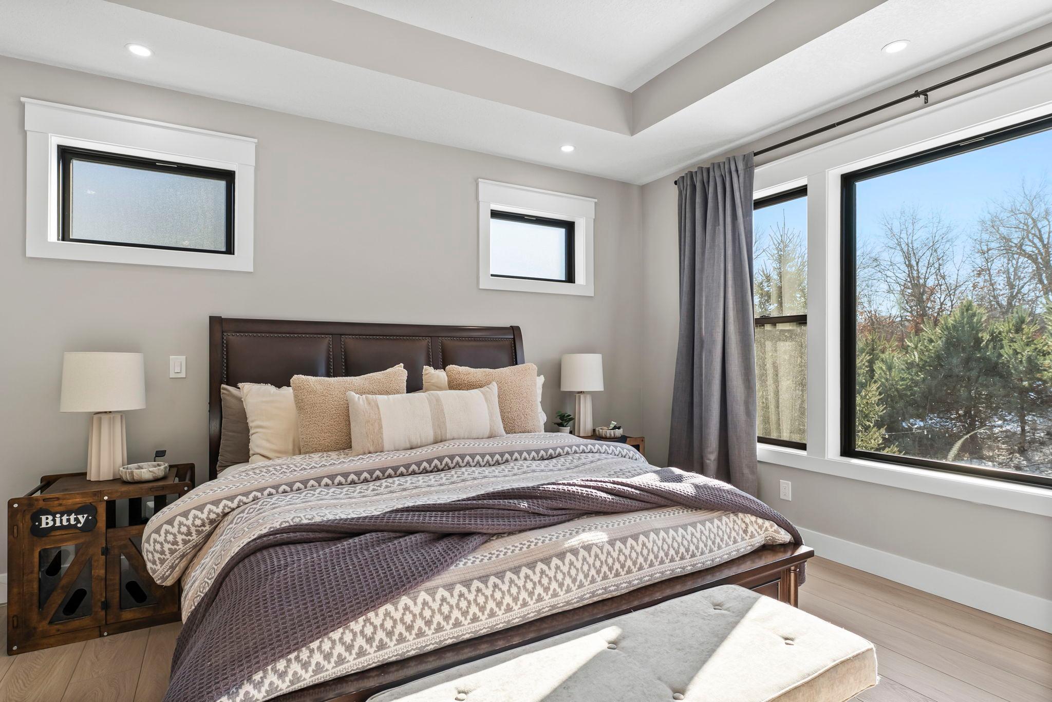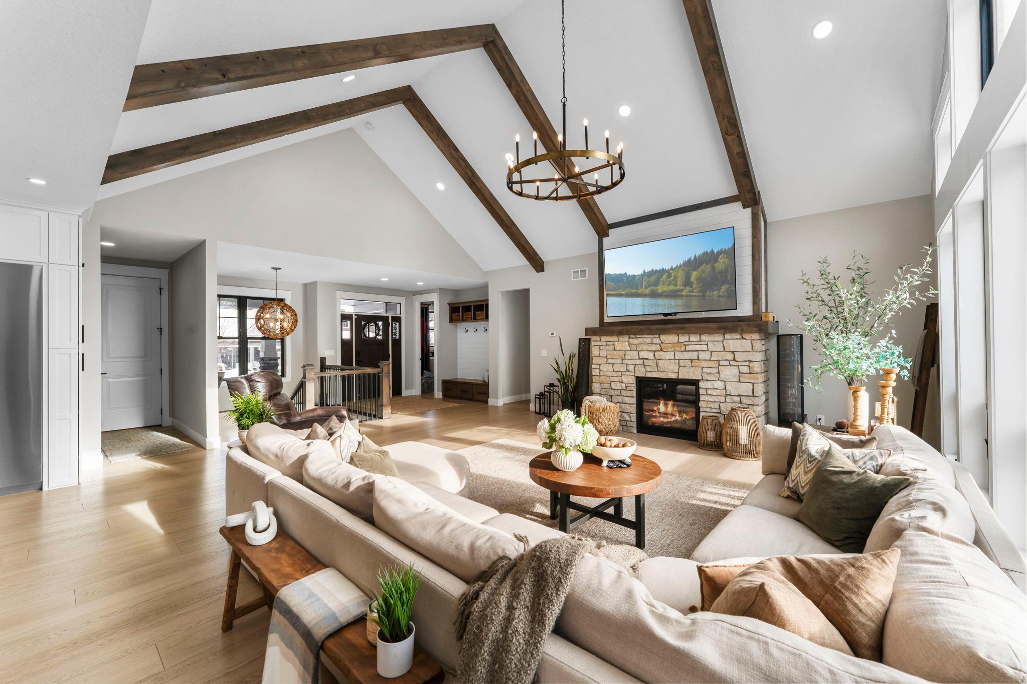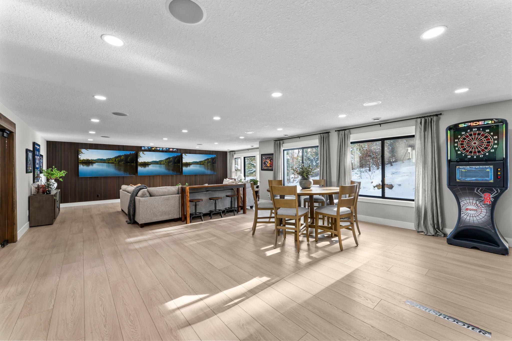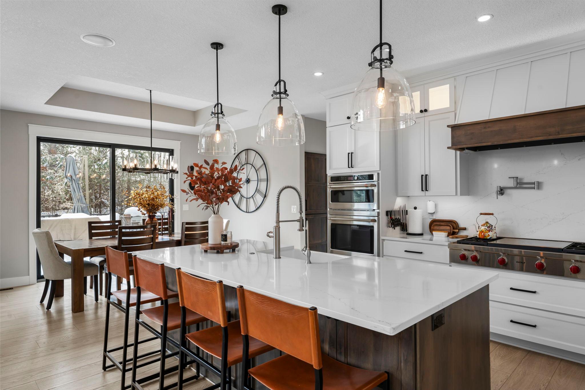 This massive luxury rambler immediately impresses with an oversized 4-car garage offering over 1,200 square feet — large enough for vehicles, storage, a workshop, and all your recreational toys. Inside, the home features a spectacular chef’s kitchen designed for entertaining, along with five spacious bedrooms and four beautifully finished bathrooms, including three conveniently located on the main level for true one-level living. Seller will consider a contract for deed Welcome to Forest Hills Farms, the premier executive neighborhood on Forest Lake. This exceptional one-story home offers an extremely rare layout featuring full primary suites on both the main level and the lower level. Each suite includes a private ensuite bathroom, walk-in closet, and its own dedicated laundry area, making the home ideal for multigenerational living or extended guests while still maintaining complete privacy and comfort. The main level features soaring 10-foot ceilings and a dramatic open layout leading into a spectacular great room with an expansive window wall overlooking an incredibly private backyard. A beautiful fireplace anchors the space while natural light pours through oversized windows. The main-level primary suite includes a spa-caliber ensuite featuring a zero-entry tiled shower and a massive soaking tub. The chef’s kitchen is truly extraordinary, offering commercial-grade amenities including a flat-top grill with hood, commercial refrigerator and freezer, wine fridge, pot filler, and an incredible hidden butler’s pantry disguised as cabinetry. The pantry features its own sink, prep area, and extensive storage to keep the kitchen functional and clutter-free. All four bathrooms feature floor-to-ceiling custom tile showers and commercial power-flush toilets. Comfort is unmatched with seven thermostats controlling forced air and extensive in-floor radiant heat. The entire lower level and the oversized garage are fully heated with in-floor radiant heat powered by a newer boiler, allowing the radiant system to warm the home independently of forced air when desired. The lower level is enormous — ideal for entertaining large gatherings — and includes a second kitchen or bar area, a fitness room with its own thermostat, and an incredible media wall featuring three 90-inch televisions. This entire level enjoys full in-floor radiant heat for year-round comfort. Bedrooms throughout the home feature oversized 6' x 6' Andersen windows that flood the space with natural light. A Dayton Audio whole-house sound system provides independently controlled speakers throughout major living areas, all easily managed from your phone. The exterior features LP SmartSide siding and beautifully stamped and colored concrete that wraps the entire home for a clean, low-maintenance finish. Additional highlights include a concrete driveway, in-ground sprinkler system, massive 9' x 8' garage doors with direct-drive openers, a large Trex maintenance-free deck, and a professionally designed stone retaining wall. The property also includes deeded access to Forest Lake, offering lake privileges within one of the area’s most sought-after neighborhoods. This rare luxury rambler combines three main-level bedrooms, dual primary suites, commercial-grade finishes, extensive in-floor heating, and countless high-end features that would cost hundreds of thousands more to replicate today. A truly exceptional home in one of Forest Lake’s most prestigious communities.