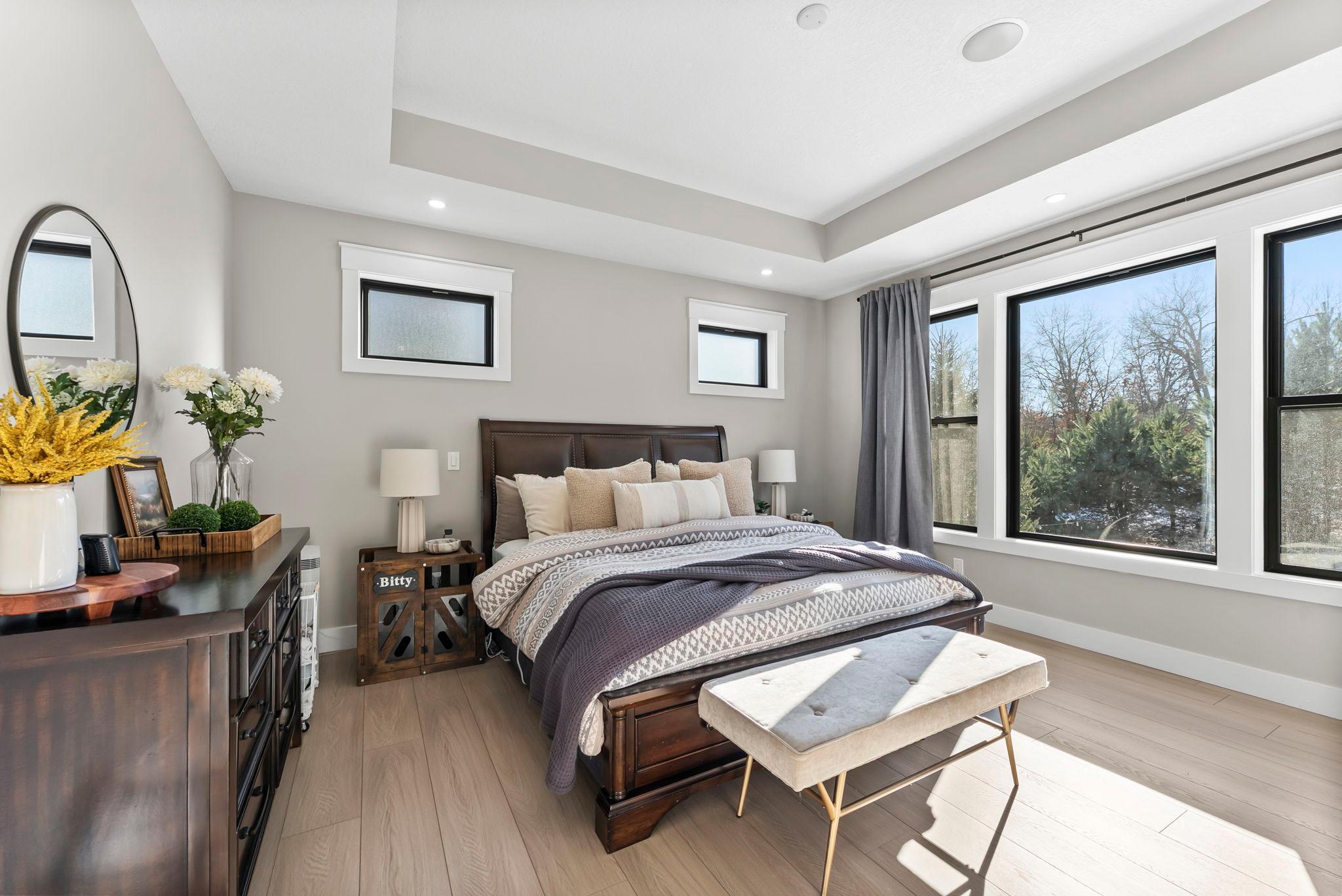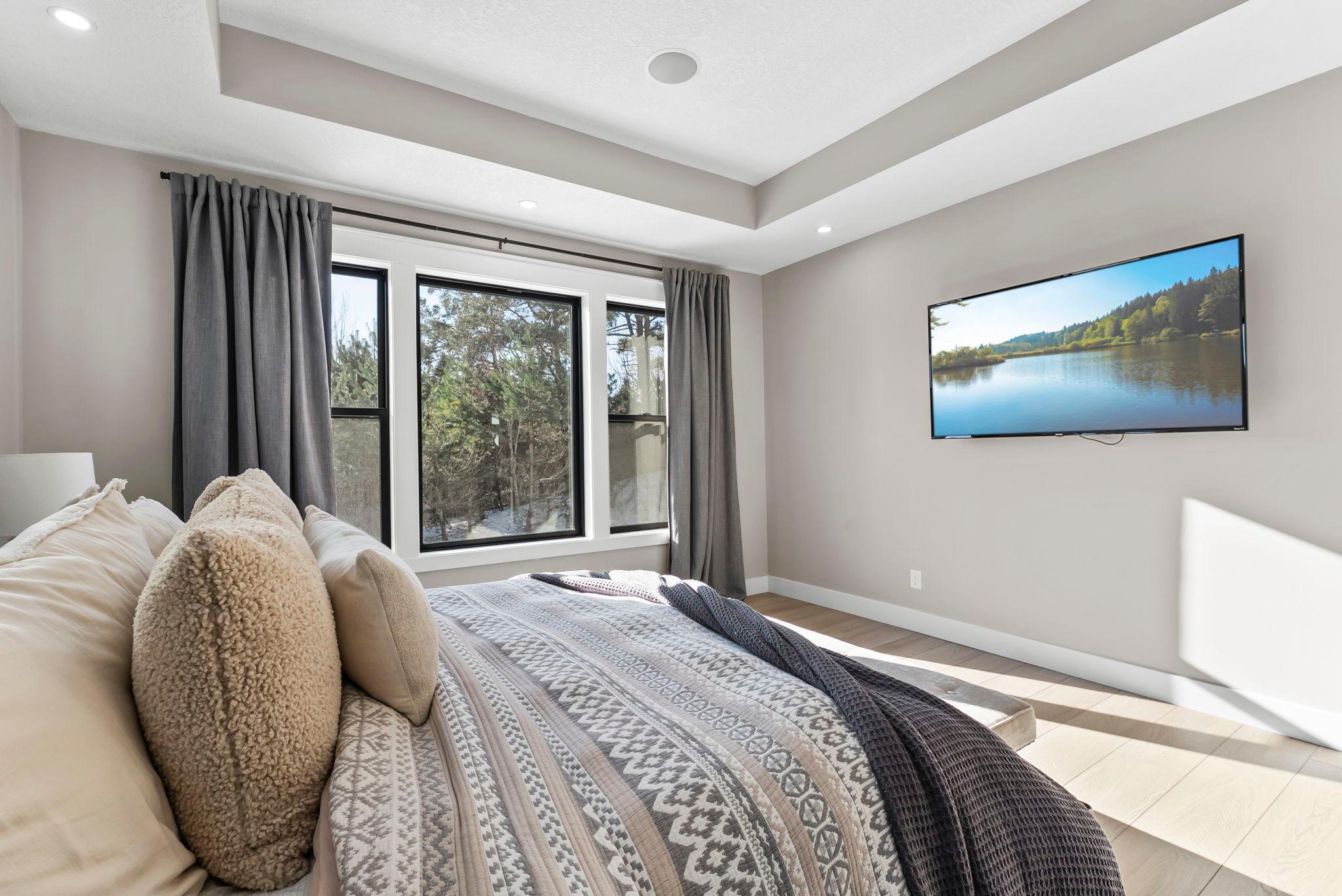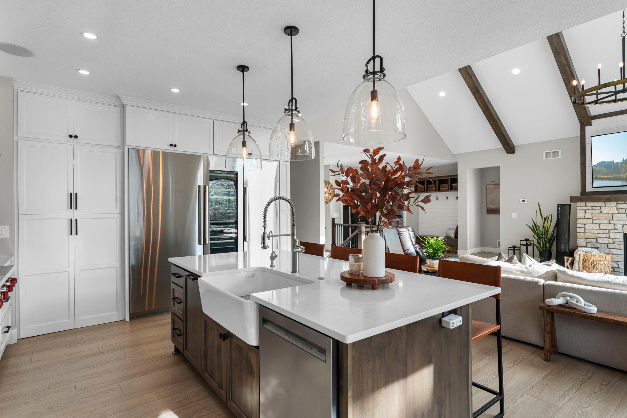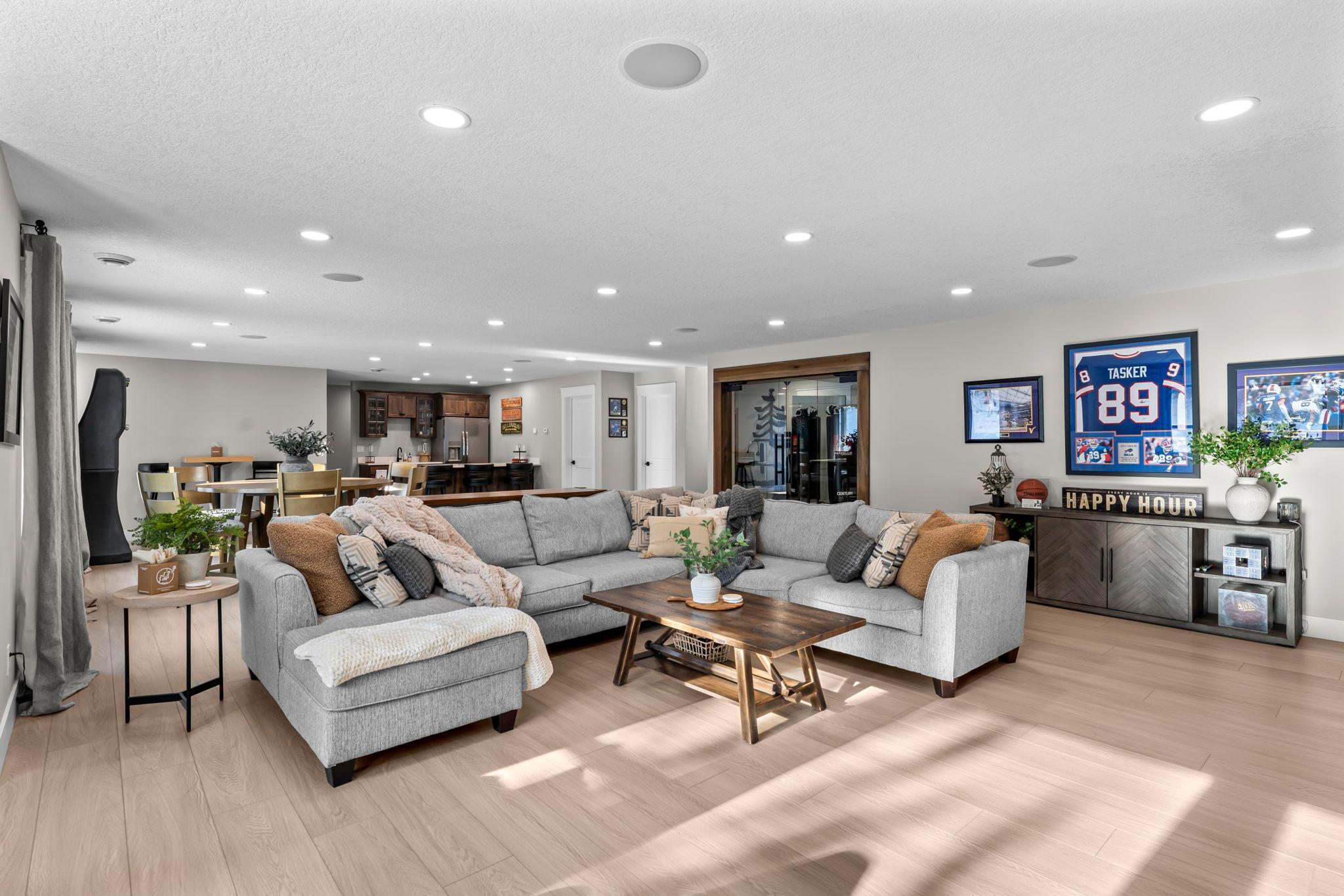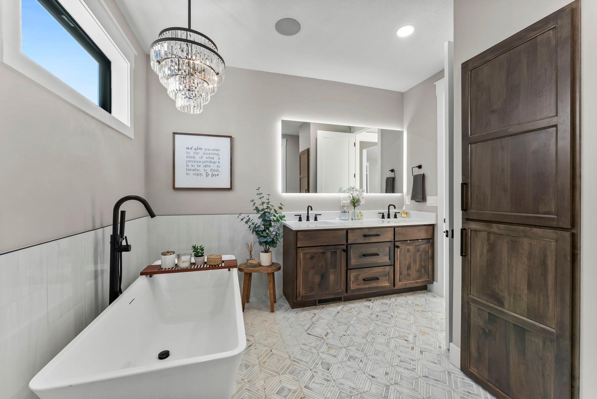 This massive luxury rambler immediately impresses with an oversized 4-car garage offering over 1,200 square feet — large enough for vehicles, storage, a workshop, and all your recreational toys. Inside, the home features a spectacular chef’s kitchen designed for entertaining, along with five spacious bedrooms and four beautifully finished bathrooms, including three conveniently located on the main level for true one-level living. Seller will consider a contract for deed Welcome to Forest Hills Farms, the premier executive neighborhood on Forest Lake. This exceptional one-story home offers an extremely rare layout featuring full primary suites on both the main level and the lower level. Each suite includes a private ensuite bathroom, walk-in closet, and its own dedicated laundry area, making the home ideal for multigenerational living or extended guests while still maintaining complete privacy and comfort. The main level features soaring 10-foot ceilings and a dramatic open layout leading into a spectacular great room with an expansive window wall overlooking an incredibly private backyard. A beautiful fireplace anchors the space while natural light pours through oversized windows. The main-level primary suite includes a spa-caliber ensuite featuring a zero-entry tiled shower and a massive soaking tub. The chef’s kitchen is truly extraordinary, offering commercial-grade amenities including a flat-top grill with hood, commercial refrigerator and freezer, wine fridge, pot filler, and an incredible hidden butler’s pantry disguised as cabinetry. The pantry features its own sink, prep area, and extensive storage to keep the kitchen functional and clutter-free. All four bathrooms feature floor-to-ceiling custom tile showers and commercial power-flush toilets. Comfort is unmatched with seven thermostats controlling forced air and extensive in-floor radiant heat. The entire lower level and the oversized garage are fully heated with in-floor radiant heat powered by a newer boiler, allowing the radiant system to warm the home independently of forced air when desired. The lower level is enormous — ideal for entertaining large gatherings — and includes a second kitchen or bar area, a fitness room with its own thermostat, and an incredible media wall featuring three 90-inch televisions. This entire level enjoys full in-floor radiant heat for year-round comfort. Bedrooms throughout the home feature oversized 6' x 6' Andersen windows that flood the space with natural light. A Dayton Audio whole-house sound system provides independently controlled speakers throughout major living areas, all easily managed from your phone. The exterior features LP SmartSide siding and beautifully stamped and colored concrete that wraps the entire home for a clean, low-maintenance finish. Additional highlights include a concrete driveway, in-ground sprinkler system, massive 9' x 8' garage doors with direct-drive openers, a large Trex maintenance-free deck, and a professionally designed stone retaining wall. The property also includes deeded access to Forest Lake, offering lake privileges within one of the area’s most sought-after neighborhoods. This rare luxury rambler combines three main-level bedrooms, dual primary suites, commercial-grade finishes, extensive in-floor heating, and countless high-end features that would cost hundreds of thousands more to replicate today. A truly exceptional home in one of Forest Lake’s most prestigious communities.