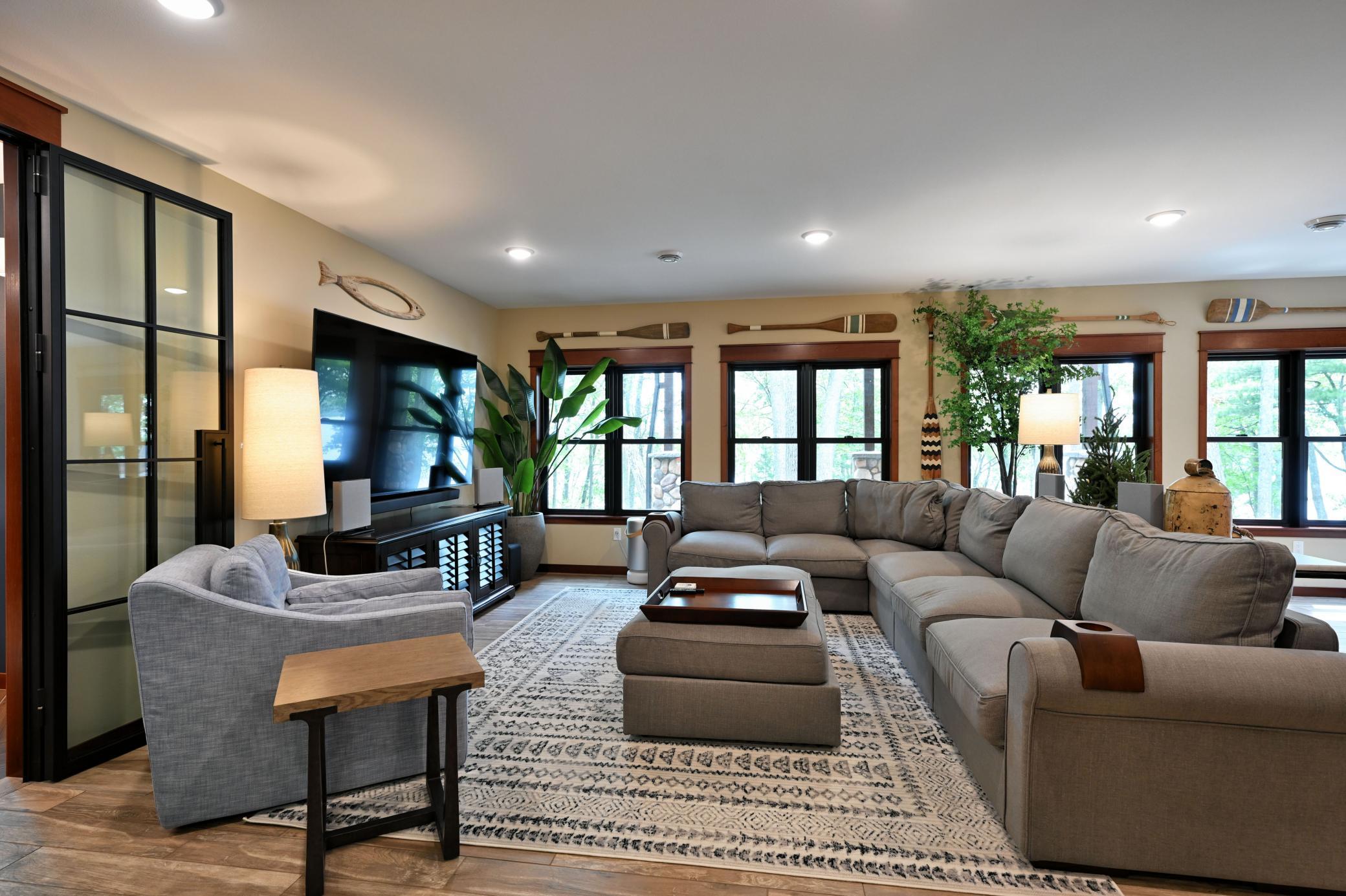 An extraordinary lakefront retreat on Victory Heights offering 240 feet of flat, sandy shoreline and breathtaking lake views. This home was completely rebuilt, taken down to the studs, and expanded from 1,176 sq ft to 5,816 sq ft, creating a rare, move-in-ready luxury estate on one of Wisconsin’s most sought-after lakes. Professionally landscaped with $150,000 in improvements, the property is designed for effortless enjoyment and entertaining. The spacious owner’s suite provides a private escape with its own HVAC system, fireplace, office, sitting area, and spa-like bath with lake views. High-end finishes include custom hardwood flooring, granite countertops, designer lighting, and a chef’s kitchen with Thermador appliances. The heated lower level features a bar and wine room ideal for hosting family and friends. Additional amenities include dual generators, EV-ready garage, high-speed fiber internet for remote work, hot tub, outdoor fire pits, paved driveway to the lake, lakefront storage, and a fish shed, offering the perfect blend of Northwoods serenity and modern luxury.