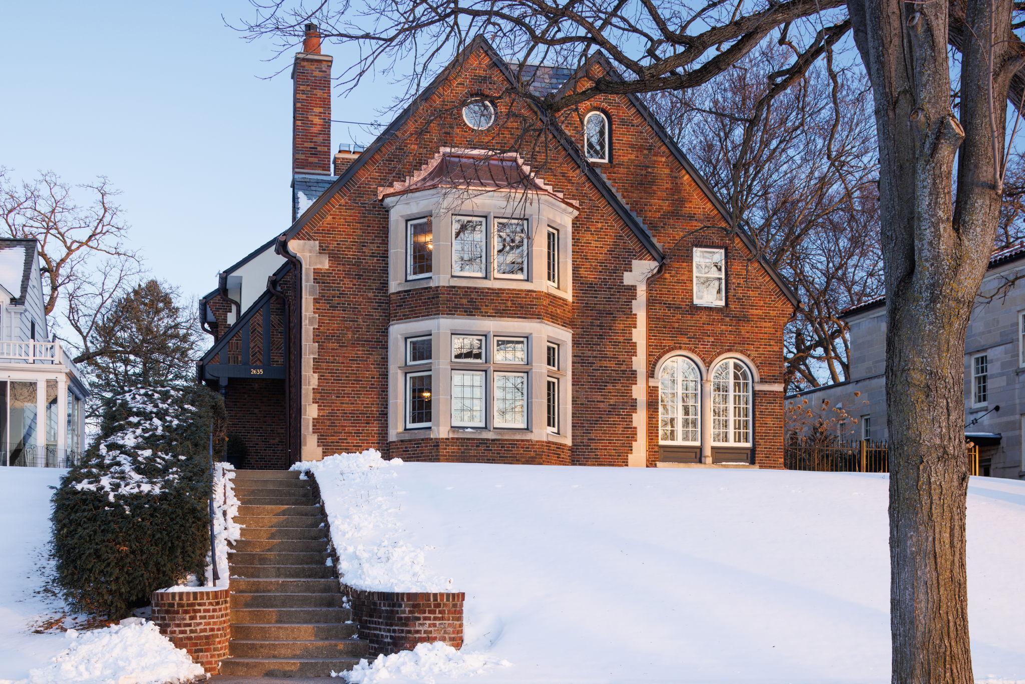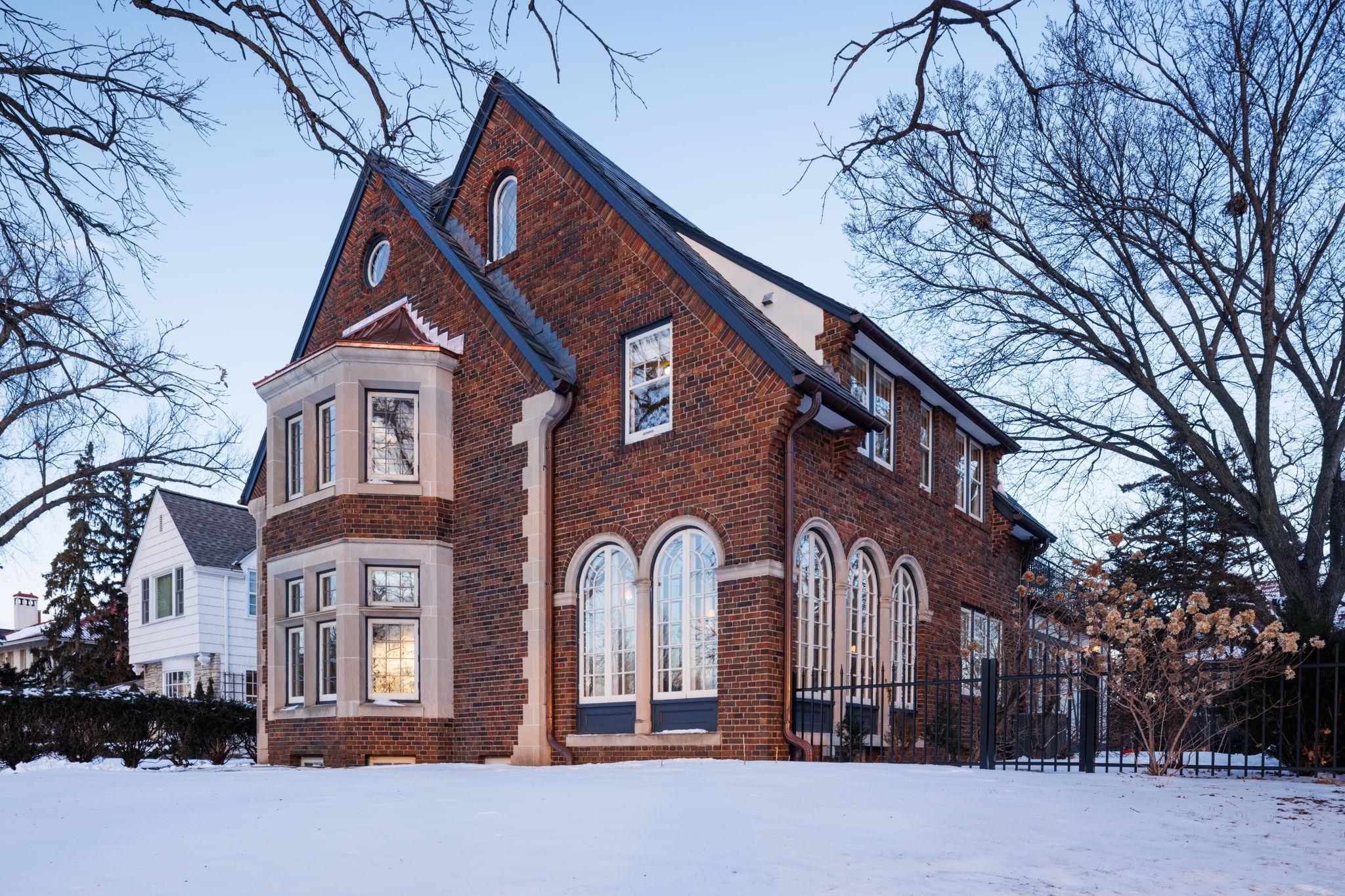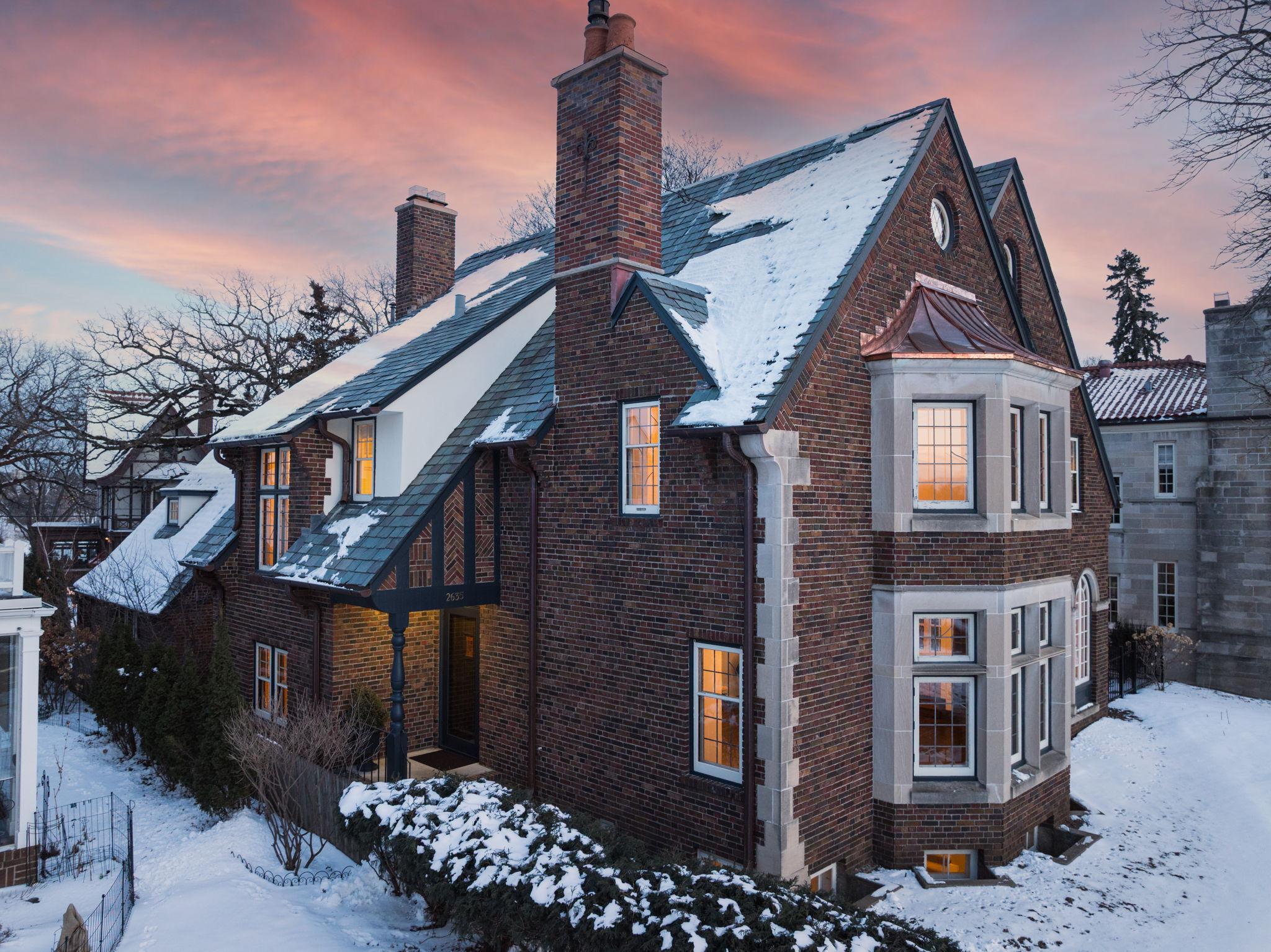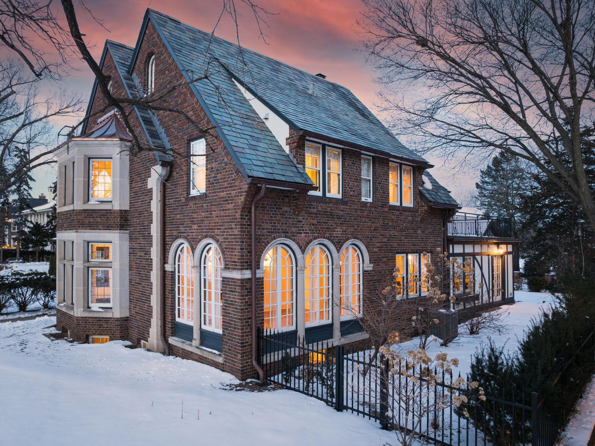 Classic Lake of the Isles Tudor, ideally sited to offer lake views from all six bedrooms. Summer canoeing/kayaking, bicycle paths & Shakespeare in the Park are just steps away, while winter brings ski trails, ice skating & the Luminary Loppet. Handsome hardwood floors, original ceramic-tiled foyer & leaded windows anchor the home, whose main level includes the lake-facing living room with Tudor arched fireplace, sunroom with newer hardwood floors, formal dining room, brick-walled den and architect designed new kitchen with handmade British tile backsplash, enameled cabinetry & top-of-the-line appliances. The main level also includes ½ bath, office & attached garage. All 4 second floor baths have been recently remodeled, 3 with in-floor heat, and California closet systems have been added to the family bedrooms. The freshly carpeted 3rd floor is a wonderful family recreation room. The lower level was extensively remodeled; it features a beautiful family room with gas fireplace, architect designed wet bar with leaded glass display cabinet, sink, microwave & beverage cooler. Adjacent are an exercise room & sauna. With a welcome attached garage and landscaped rear yard with bluestone patios, this is truly an exceptional home.