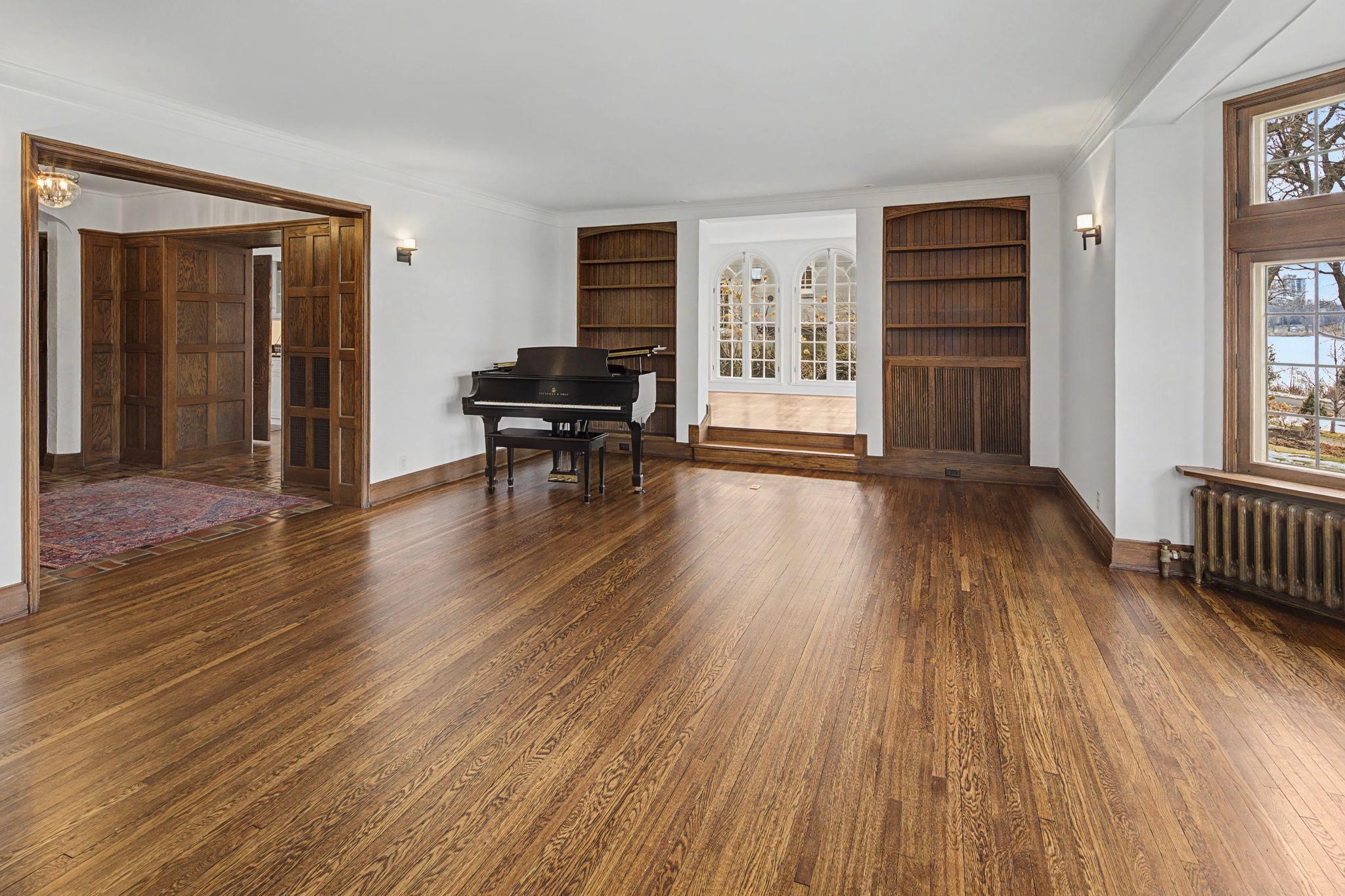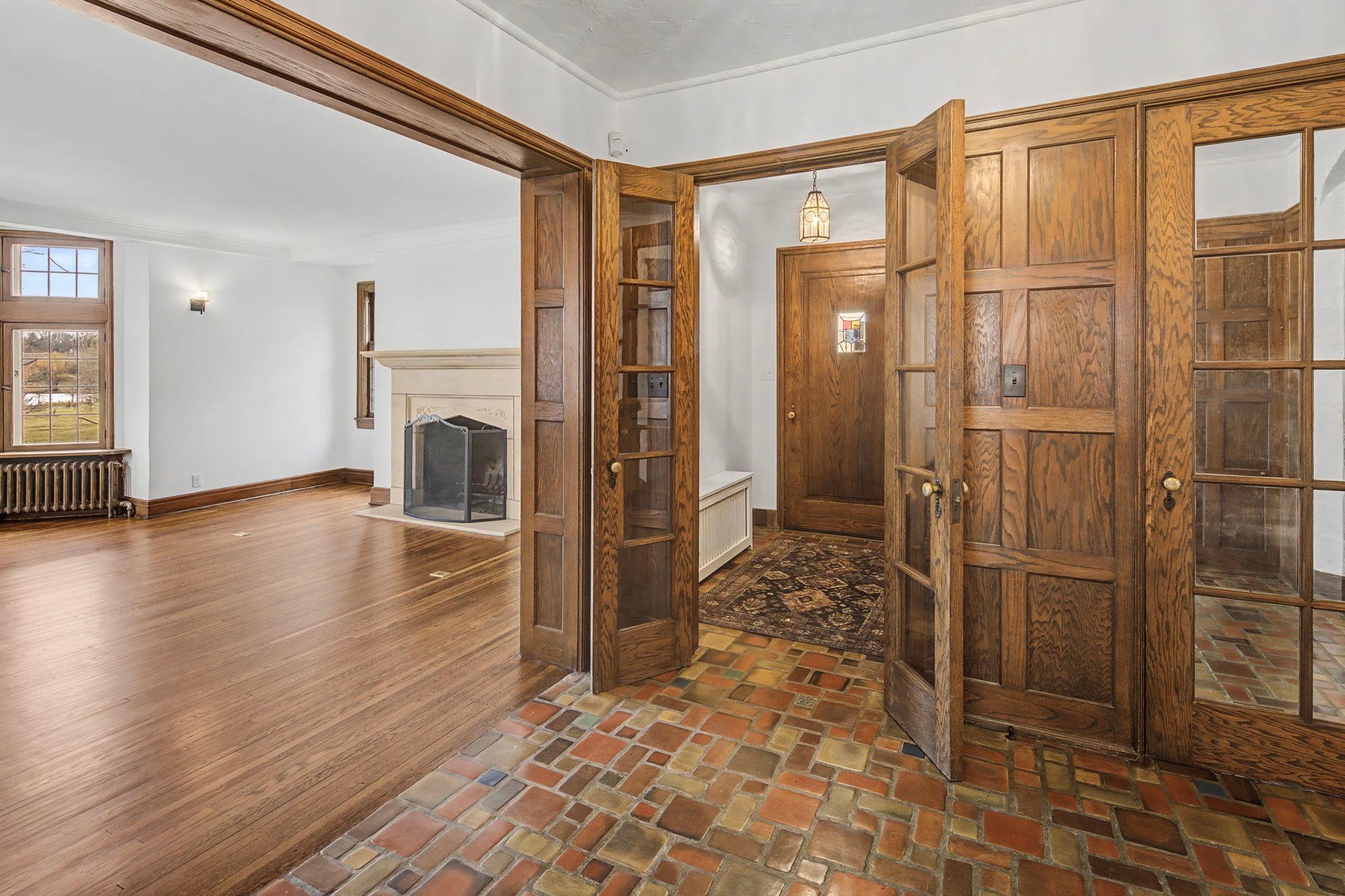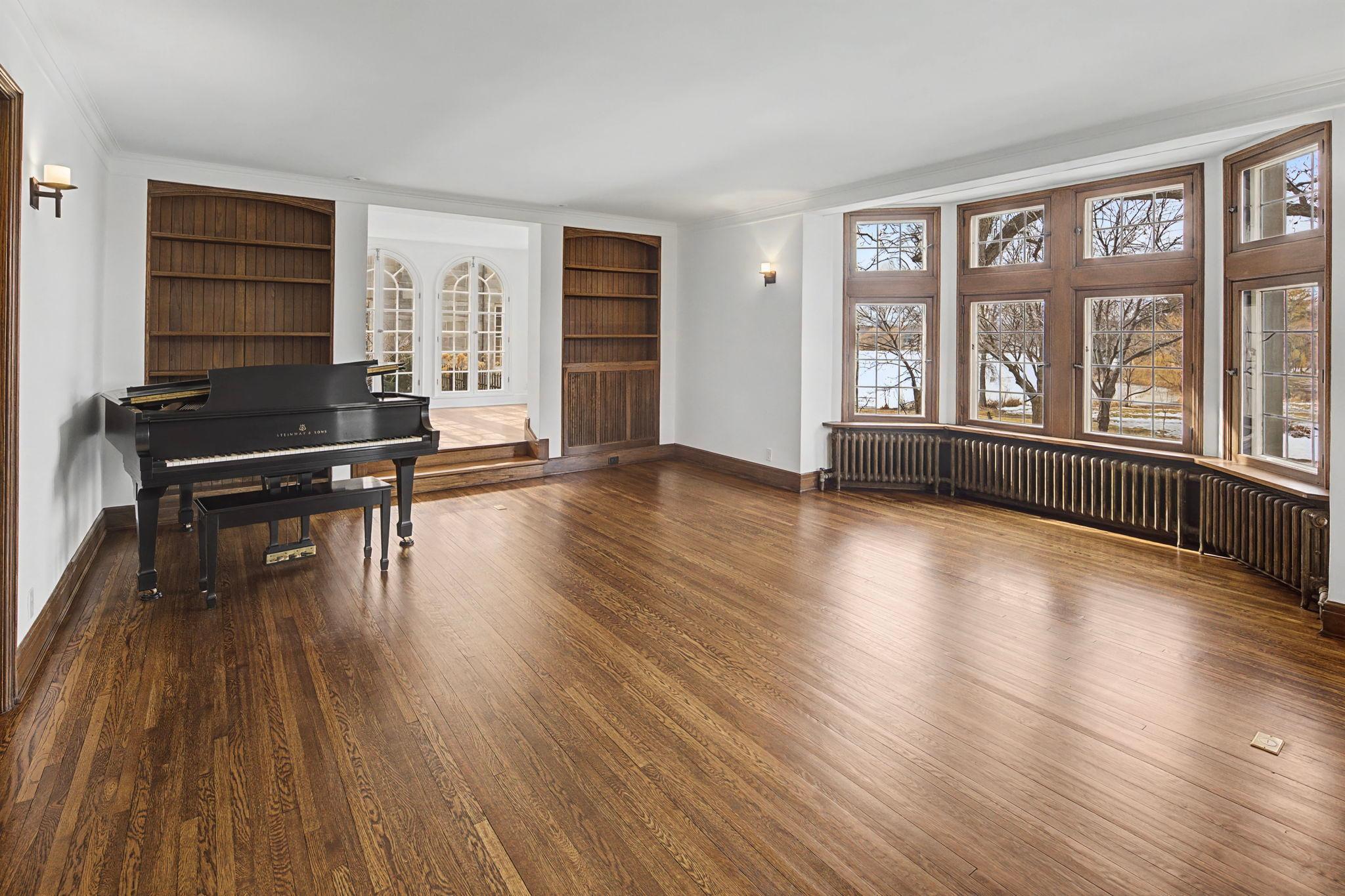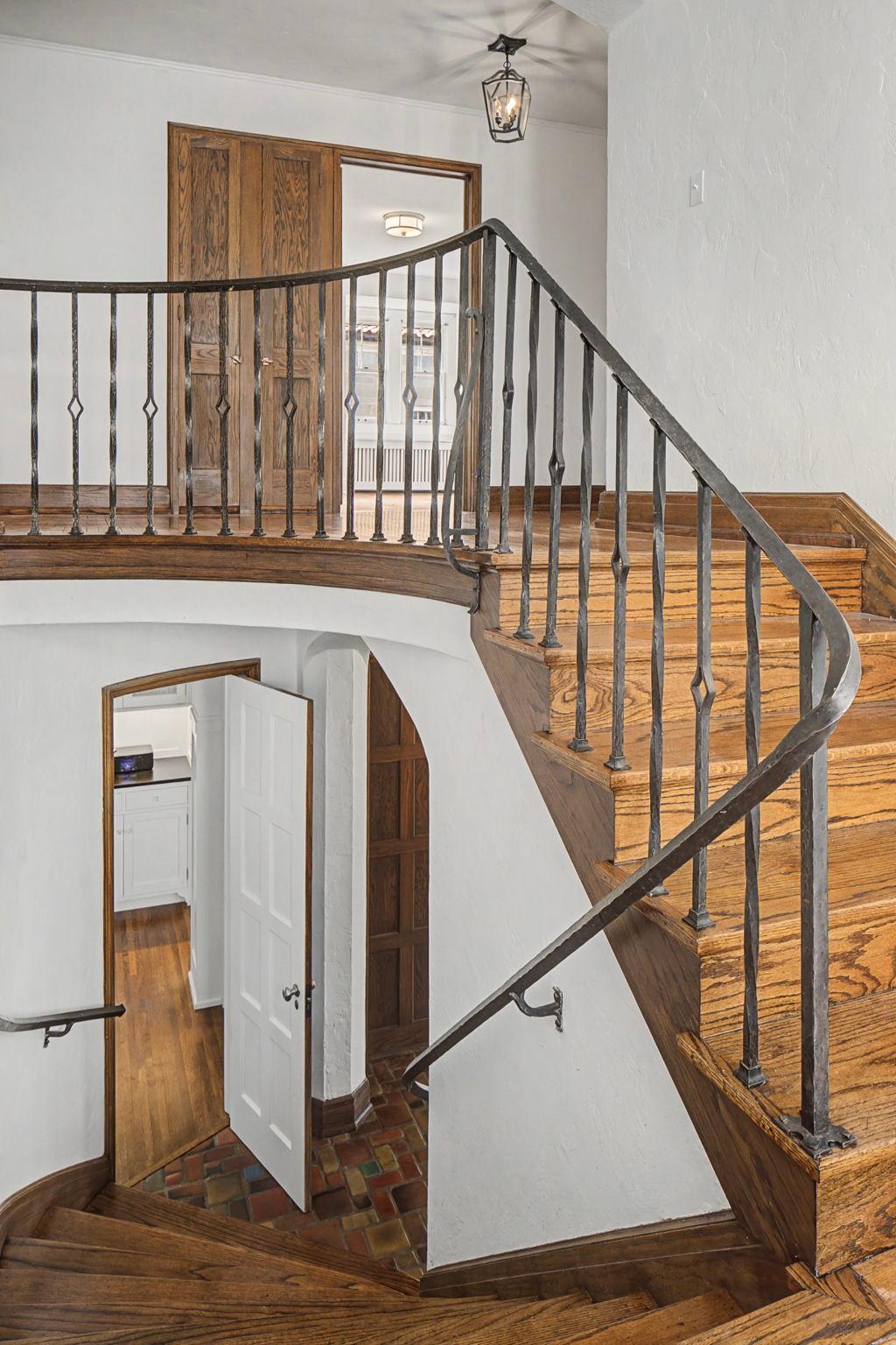 Classic Lake of the Isles Tudor, ideally sited to offer lake views from all six bedrooms. Summer canoeing/kayaking, bicycle paths & Shakespeare in the Park are just steps away, while winter brings ski trails, ice skating & the Luminary Loppet. Handsome hardwood floors, original ceramic-tiled foyer & leaded windows anchor the home, whose main level includes the lake-facing living room with Tudor arched fireplace, sunroom with newer hardwood floors, formal dining room, brick-walled den and architect designed new kitchen with handmade British tile backsplash, enameled cabinetry & top-of-the-line appliances. The main level also includes ½ bath, office & attached garage. All 4 second floor baths have been recently remodeled, 3 with in-floor heat, and California closet systems have been added to the family bedrooms. The freshly carpeted 3rd floor is a wonderful family recreation room. The lower level was extensively remodeled; it features a beautiful family room with gas fireplace, architect designed wet bar with leaded glass display cabinet, sink, microwave & beverage cooler. Adjacent are an exercise room & sauna. With a welcome attached garage and landscaped rear yard with bluestone patios, this is truly an exceptional home.