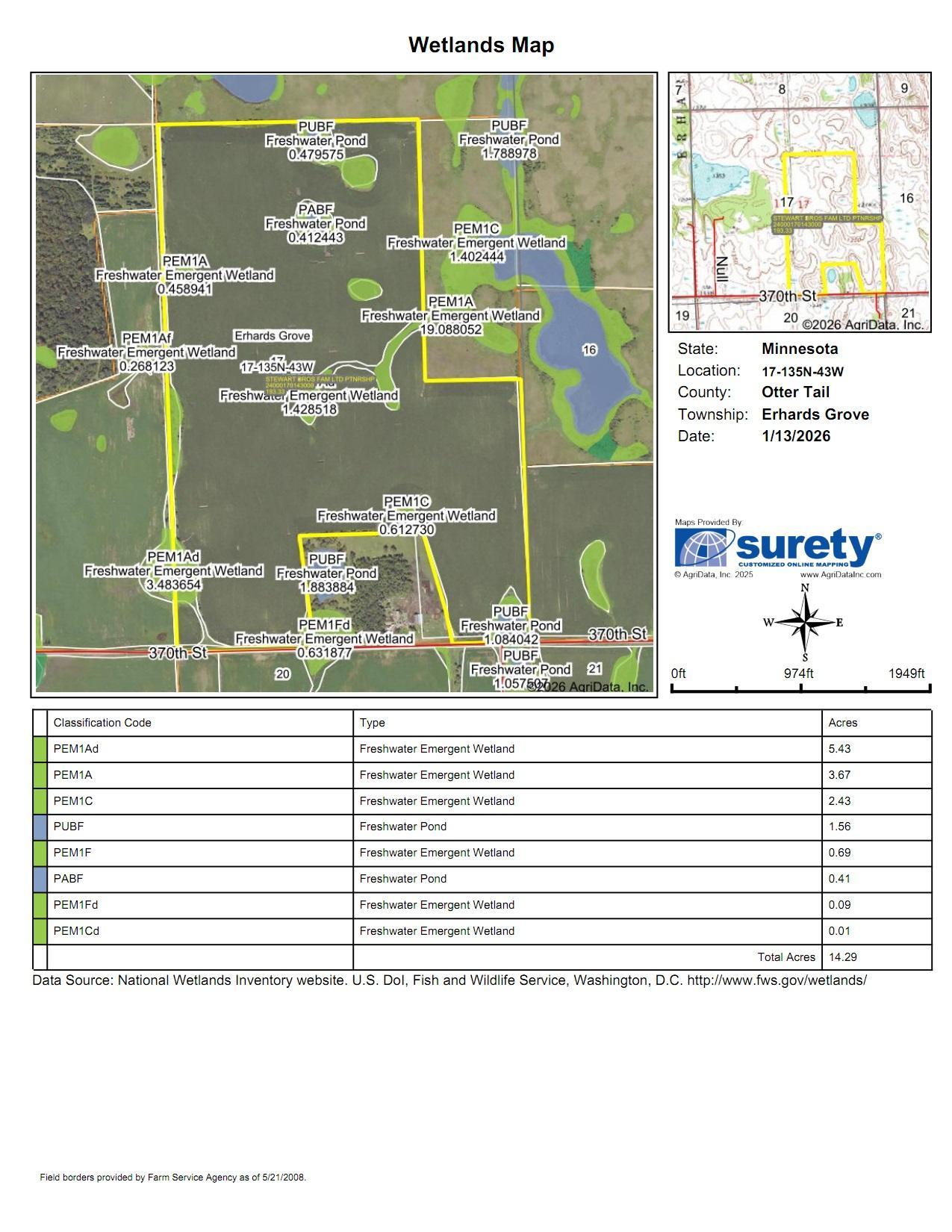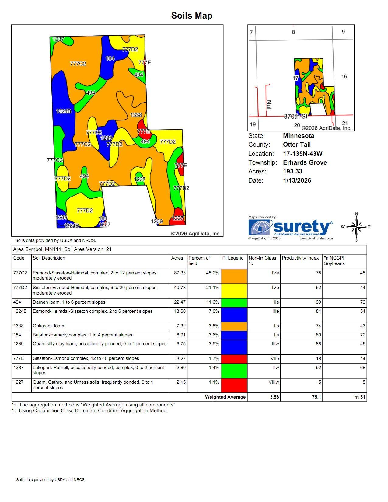Online Only Reserve Auction! March 10th starting at 9 am through March 12th ending at 2 pm. SOLD IN 2 PARCELS - 80 acre and 190.52 Positioned just two miles northwest of Erhard, Minnesota, in the agricultural heartland of Otter Tail County, this 270.52-acre tract presents a valuable opportunity for both farmers and land investors. Located along 370th Street in Erhard Grove Township, the property combines exceptional tillable acreage with the natural advantages of a well-managed landscape, making it ideal for row crop production and potential long-term growth. Of the total acreage, approximately 237 acres are currently being farmed under an existing lease, which is set to expire at the end of the calendar year. The farmland is mostly flat to gently rolling, allowing for smooth, efficient operation of equipment throughout the growing season. With its open layout and wide field exposure, the property is well-suited for modern precision farming methods, offering operators excellent ease of access and workflow continuity. The soil quality is one of the key strengths of this farm. It carries a soil productivity index of 75.6 and a National Commodity Crop Productivity Index (NCCPI) of 51.3, both indicators of solid yield potential. The property is comprised of proven and productive soil series including Lakepark-Parnell, Darnen loam, and Esmond-Sisseton-Heimdal complexes. These soils are known regionally for their favorable structure, drainage, and capacity to support high-performing crops such as corn, soybeans, and small grains. An additional highlight of the property is the presence of an artesian well located in one corner of the tract. This natural water source provides flexibility for future irrigation, livestock watering, or specialty agriculture. It also adds a unique asset to the land’s infrastructure, supporting a range of agricultural or rural development possibilities. Beyond its farming value, the property also carries recreational appeal. Its wide-open layout, coupled with surrounding natural cover and subtle elevation changes, offers habitat that attracts deer and upland game species. Hunters and wildlife enthusiasts will find potential for seasonal recreation without compromising the productivity of the land. But beyond its agricultural backbone, the land is equally compelling for the outdoorsman. A series of small, tree-lined corridors and brush-laced edges wind naturally through the property, creating ideal travel routes and bedding zones for white-tailed deer. These natural transitions between field and cover have long attracted trophy bucks, making the land a favorite for local deer hunters. The property's secluded feel and varied topography allow for multiple stand locations, supporting archery and rifle hunting throughout the season,In addition to its draw for whitetails, the property has also seen activity from Minnesota’s elusive black bear population. The brushy edges, dense understory, and quiet wooded pockets provide attractive cover and forage for bears moving through the area. Game trails and signs are evident throughout the transitional zones, enhancing the property's appeal for big game enthusiasts. Adding to its recreational value is a small pond, framed by cattails and surrounded by natural grasses. This water feature has proven to be a consistent draw for migrating ducks and Canada geese, offering excellent opportunities for waterfowl hunting during the fall. Early mornings on the pond provide classic decoy spreads and strong flight paths. Whether you prefer pass shooting from the edge or settling in for a cold sunrise hunt in layout blinds, the pond is a ready-made spot for quality duck and goose action. It also serves as a watering source for other wildlife and a hub of biodiversity throughout the seasons.