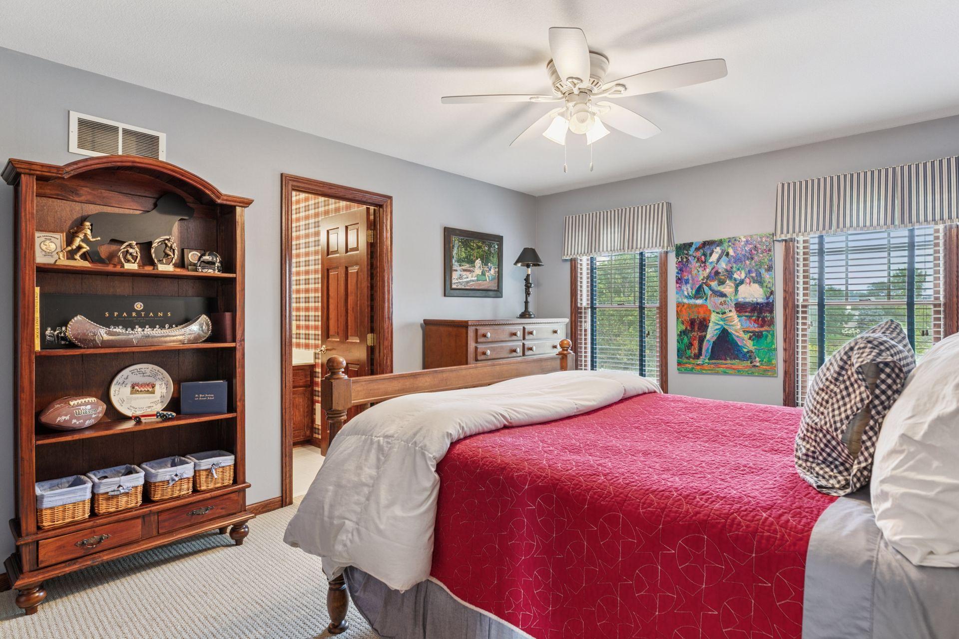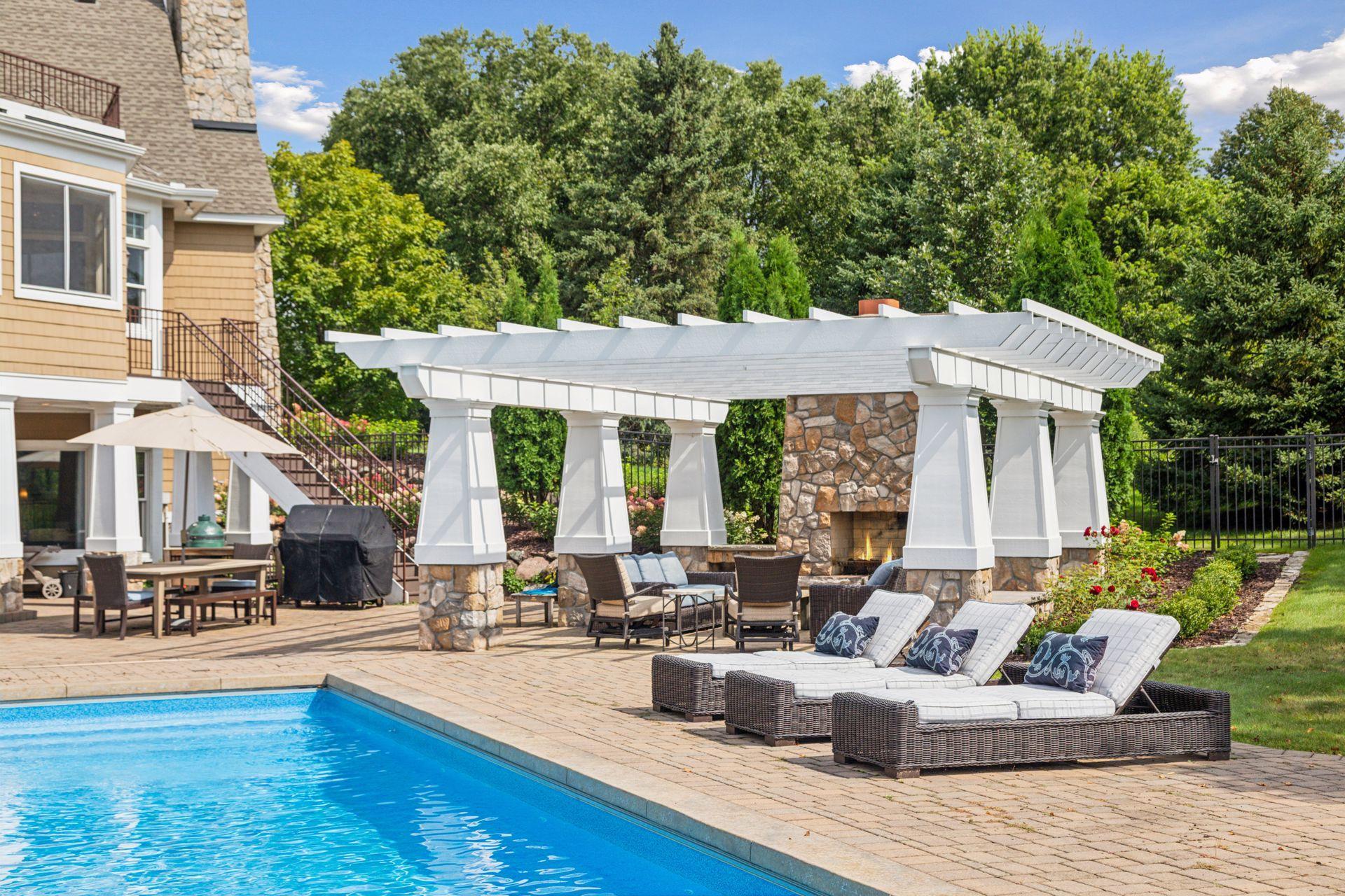 Discover the pinnacle of refined living in this extraordinary DeWitt Custom Home, ideally situated on 2.8 private acres in the highly sought-after Cloverdale Farms community. A true sanctuary, this property offers a stunning outdoor oasis featuring a sparkling pool, expansive paver patio, wood-burning fireplace beneath a charming pergola, and a large sport court—perfect for entertaining and recreation. From the moment you step inside, you’ll be captivated by the grand volute staircase with wrought iron railings, soaring vaulted ceilings, paneled wood walls, and a welcoming built-in bench. Rich wood floors flow throughout the home, complemented by inset custom cabinetry, crown molding, shiplap ceiling details with exposed beams, and upgraded baseboards and casing. A concrete fireplace surround adds architectural depth to the living space. The chef’s kitchen is a masterpiece, showcasing Wolf and Sub-Zero appliances, marble countertops and backsplash, a beverage refrigerator, built-in hutch, walk-in pantry, and custom banquette seating in two locations—ideal for casual dining and gatherings. Two private offices with built-in cabinetry provide the perfect work-from-home flexibility. The oversized mudroom features in-floor heat, abundant cubbies, and storage cabinetry, while the adjacent laundry room is thoughtfully designed with quartz countertops, floor-to-ceiling storage, and a built-in dog kennel. Upstairs, you’ll find four spacious bedrooms including a Jack-and-Jill suite, a private guest suite, and a truly luxurious primary suite worthy of Architectural Digest. The primary bedroom features a custom walk-in closet with a center island, glass-front cabinetry, and a second laundry area conveniently located just off the closet. The spa-inspired ensuite includes heated floors, an oversized walk-in shower, freestanding soaking tub, dual vanities with marble counters, and exquisite finishes throughout. The walkout lower level is an entertainer’s dream, featuring a spacious great room with fireplace, billiards room, game area, exercise/guest room, and a large wet bar complete with wine fridge, bar fridge, microwave, and Corian countertops. A charming three-season porch with beadboard walls and paneled ceiling provides a serene space to enjoy warm summer days. Additional features include three-zone heating, Andersen windows, a new driveway (2025), extensive professional landscaping (2025), and an oversized heated garage with epoxy floors and direct access to the lower level. This is truly the jewel of Cloverdale Farms—a must-see for the discerning buyer seeking privacy, luxury, and timeless craftsmanship.