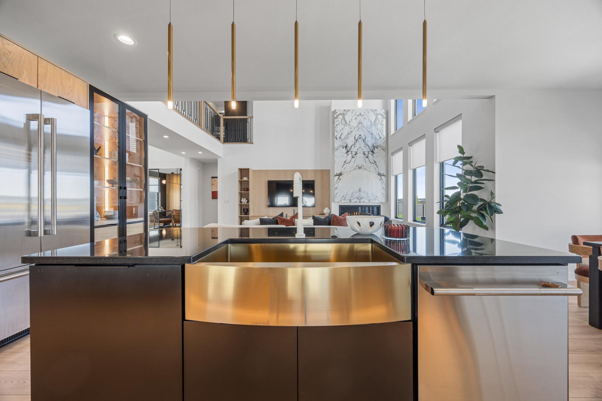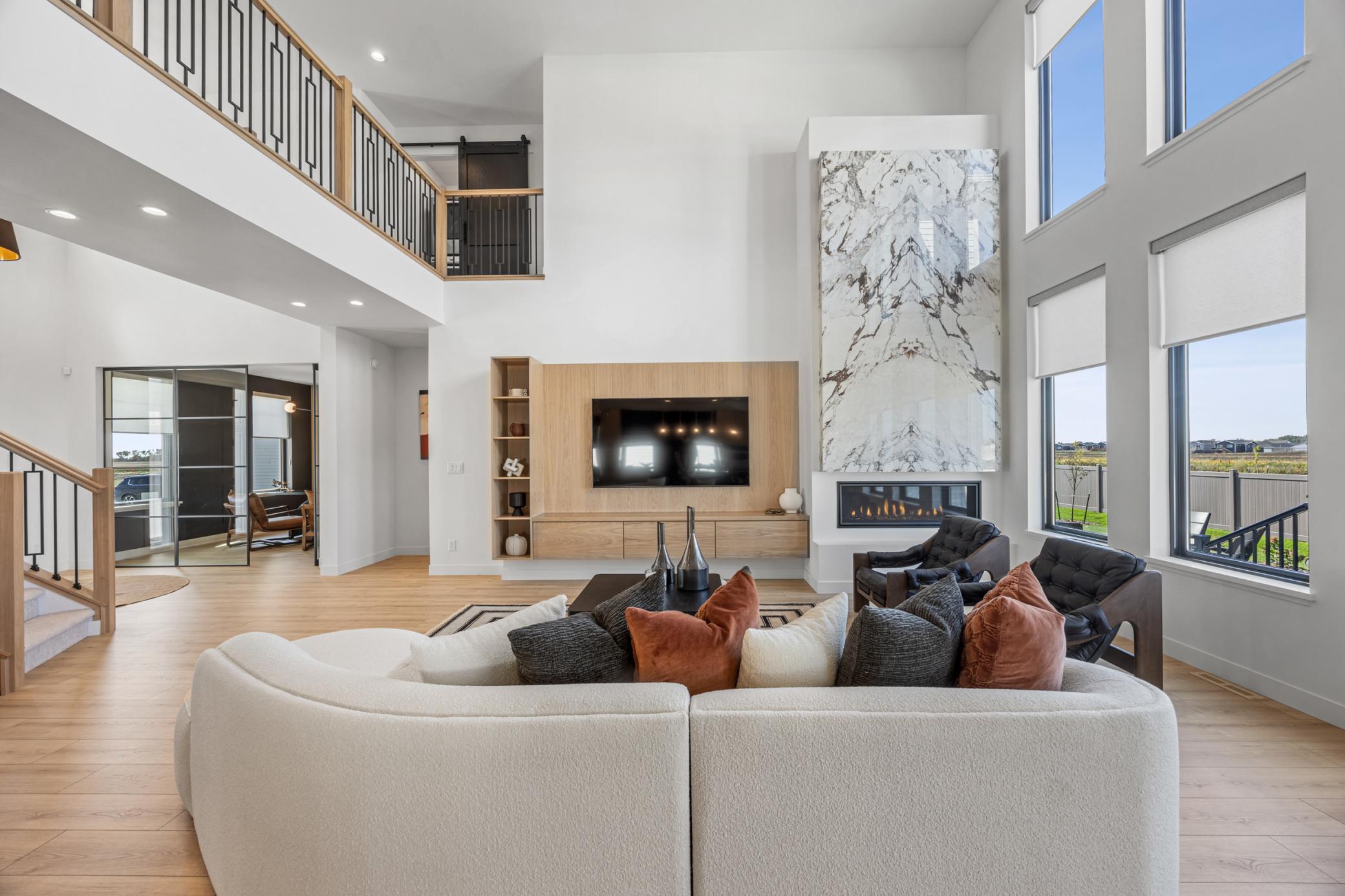 Step into a space that truly has it all. Soaring 9-foot ceilings and a dramatic double-volume great room with stunning angled staircase create an unforgettable first impression, while the cozy fireplace with porcelain detail invites you to stay awhile. The main floor primary suite offers everyday ease with dual closets, spa bathroom with tile shower and tub, and convenient laundry access. Your dream kitchen awaits with sleek custom cabinets, Jenn-Air appliances, and a spacious walk-in pantry. The rear foyer keeps life organized with a built-in bench and cubbies—plus a pet pot filler station that makes filling a water dish a breeze.