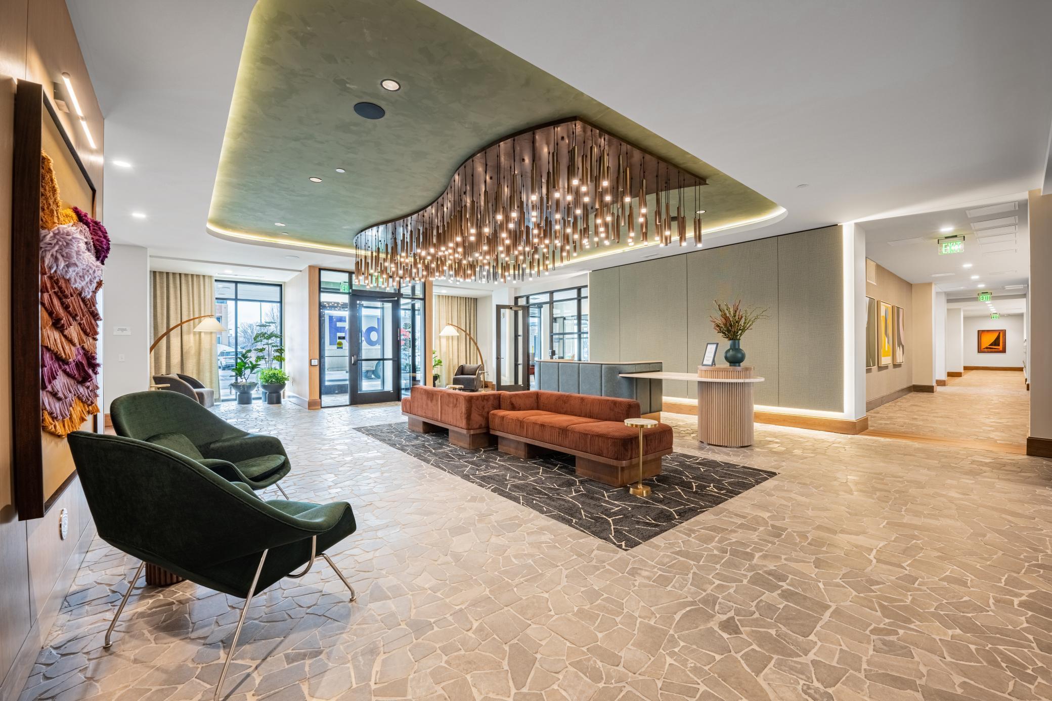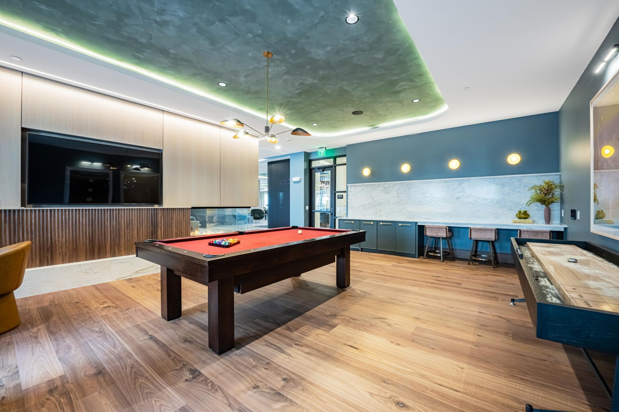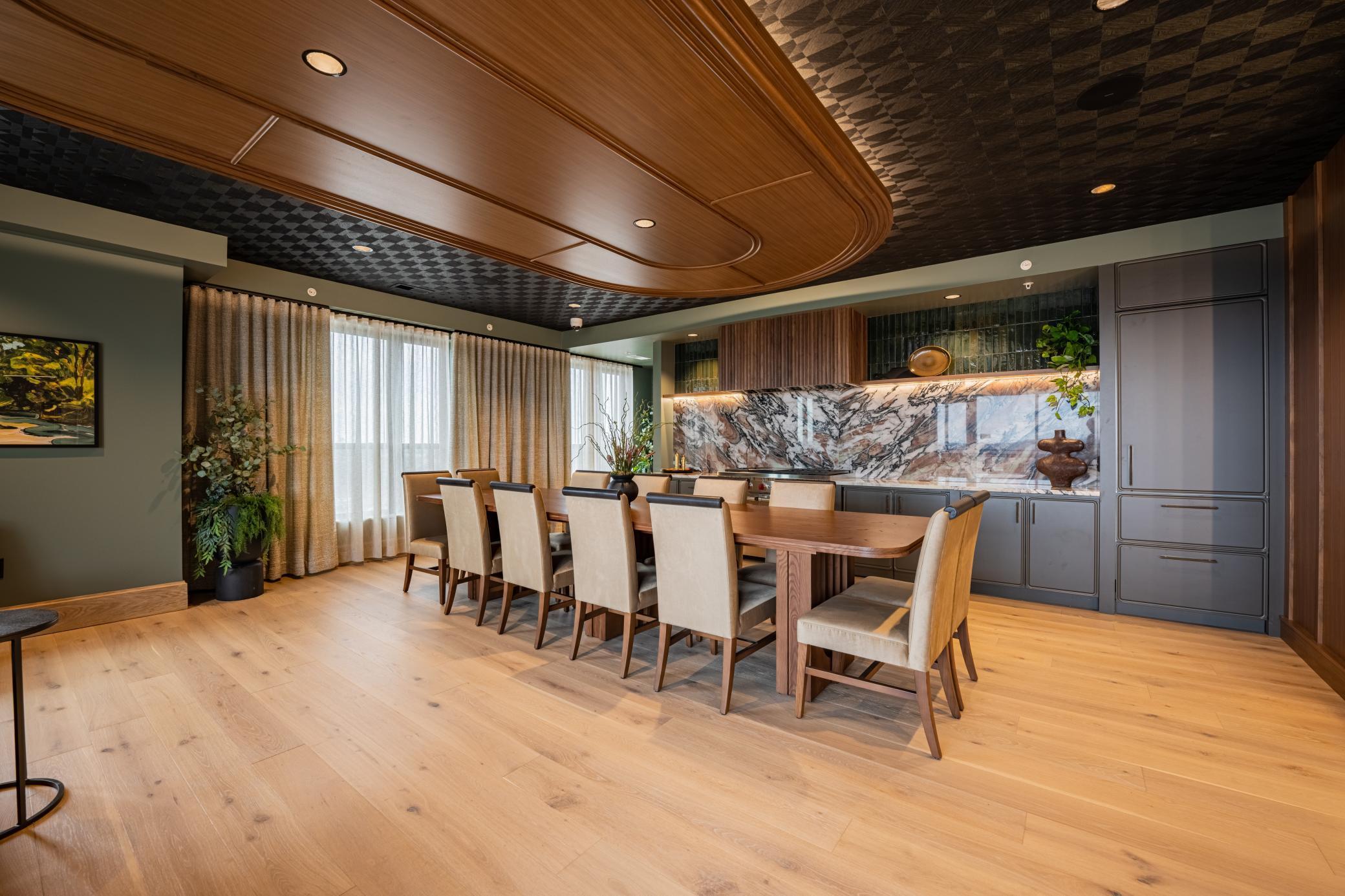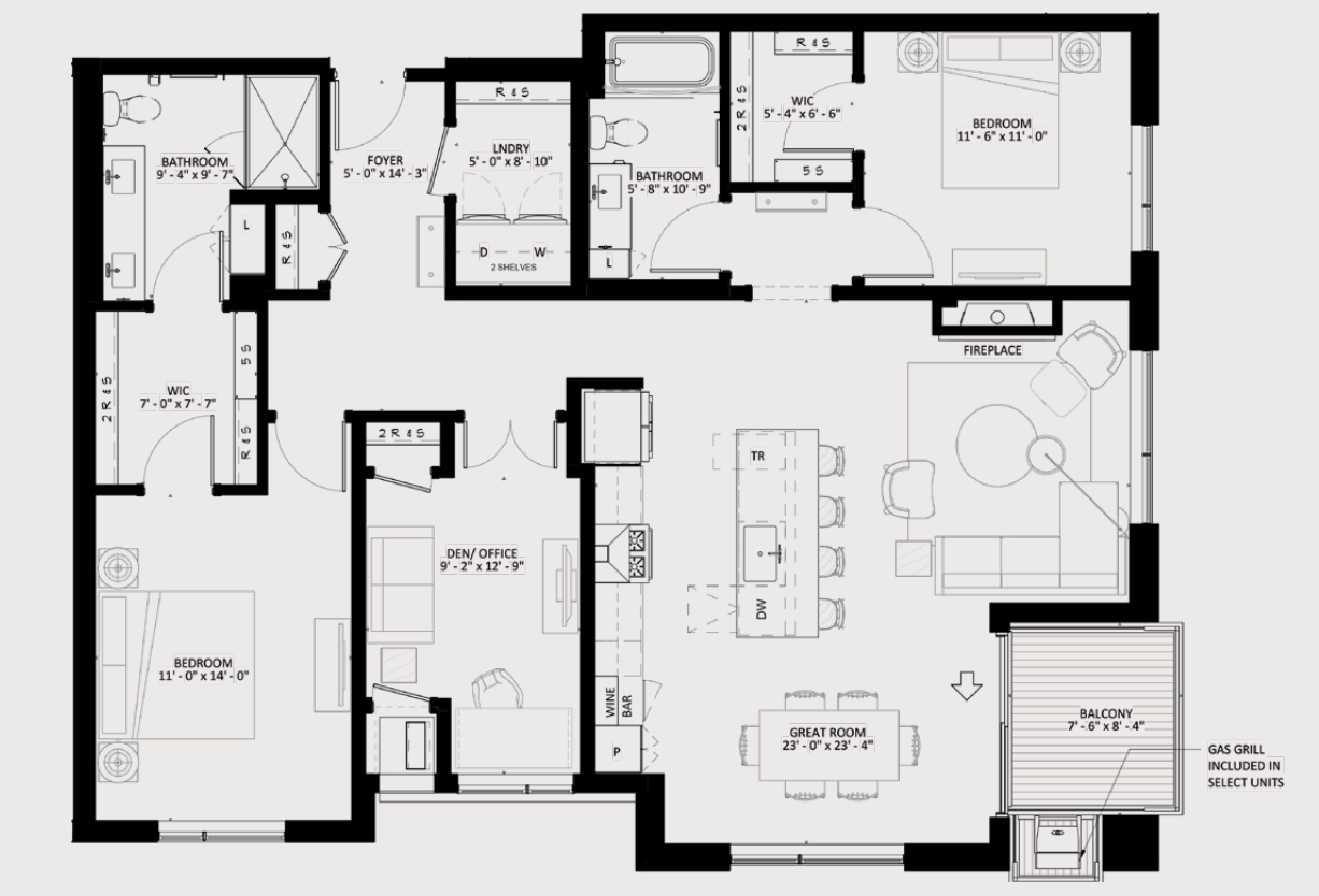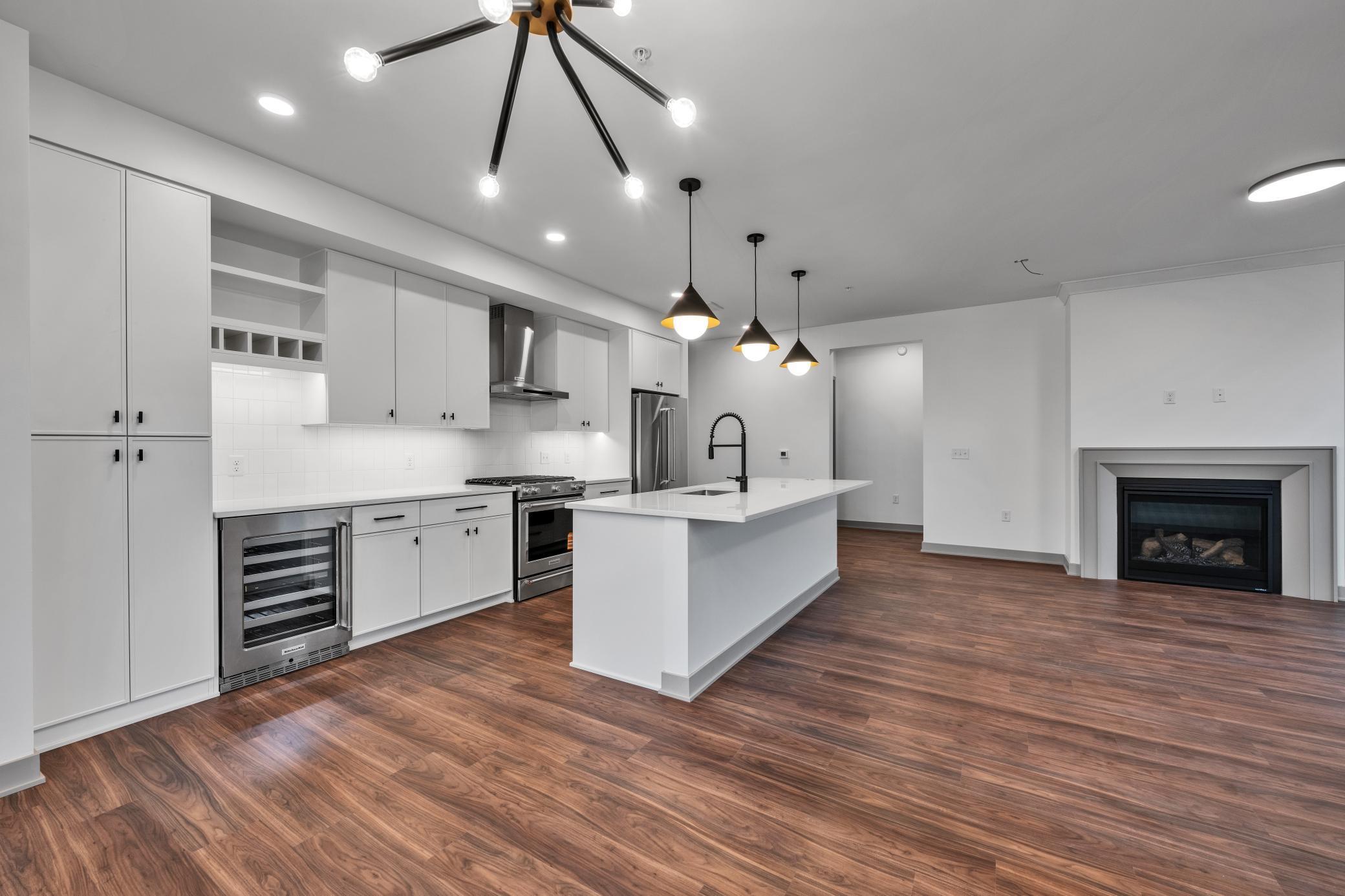 Welcome to The Winn! This expansive 2-bedroom plus den residence features the Brookview floorplan, offering a generous layout with an exclusive corner location and distinct spaces for living, dining, and working from home. Highlights include a gourmet kitchen with designer hood and island, a dedicated dining space with modern chandelier, and a walk-in laundry room with folding counter. Select homes offer a private balcony with gas grill and a modern gas fireplace.