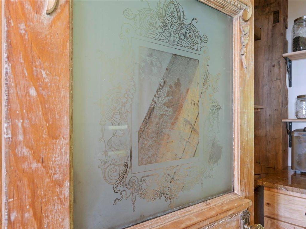 This extraordinary residence unfolds over a canvas of hand-hewn timber, alder wood accents, and centuries-old salvaged materials sourced from historic American landmarks. Custom alder front doors are flanked by cast iron Craftsman lanterns with original 1917 slag glass. Throughout the home, each element evokes a tactile connection to the past—whether it’s the 1920s Art Deco sconces from Valley City, North Dakota, or the pantry door adorned with hand-etched 1910 glass.