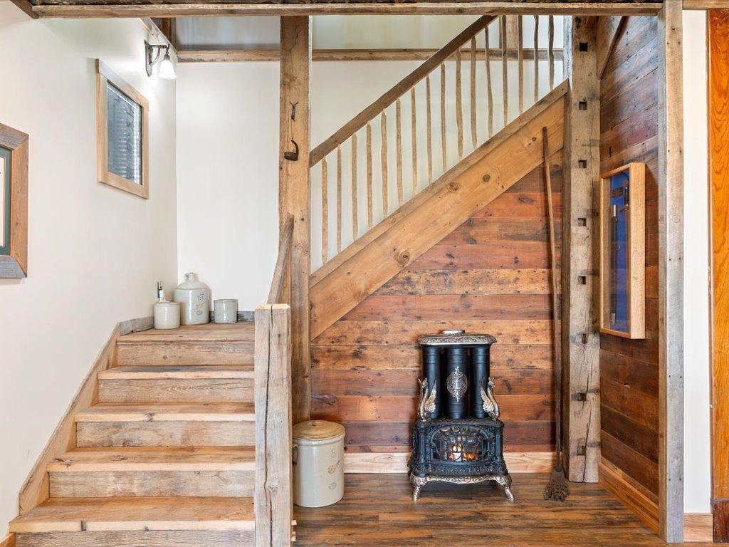 Reclaimed wood flooring from 1800s Ohio barns flows seamlessly through the main living spaces, where an 1885 parlor stove anchors the room. The staircase, constructed of solid oak threshing boards from Ohio and Pennsylvania—features decorative cast iron panels originally part of an 1860s Cincinnati fireplace insert.