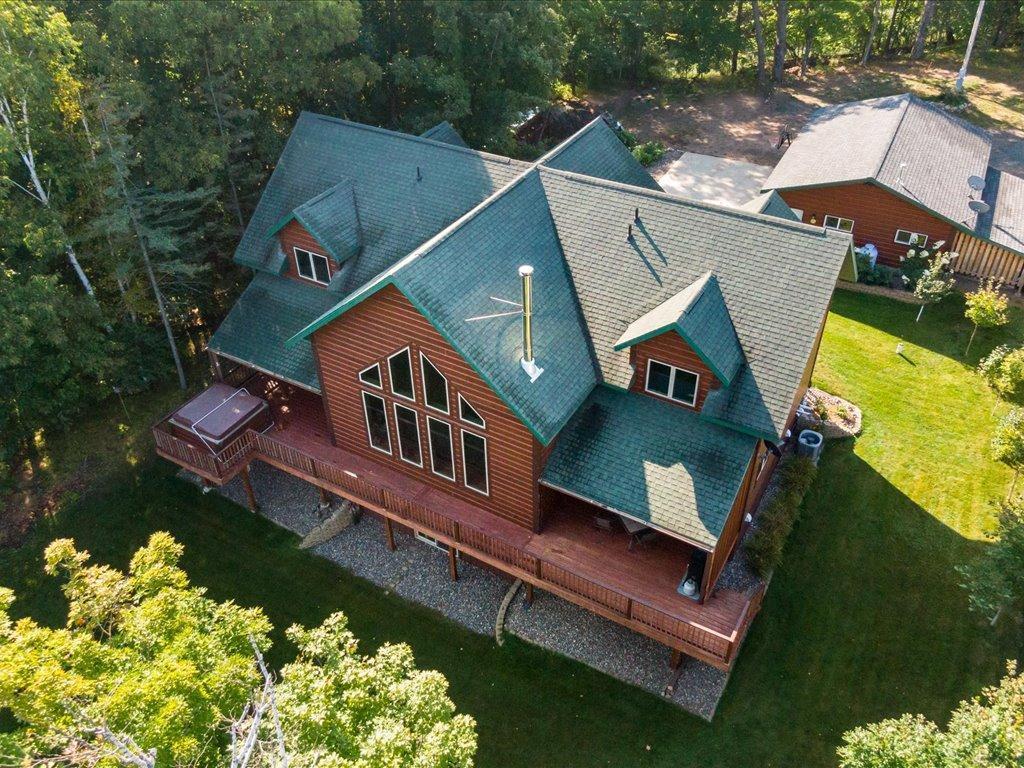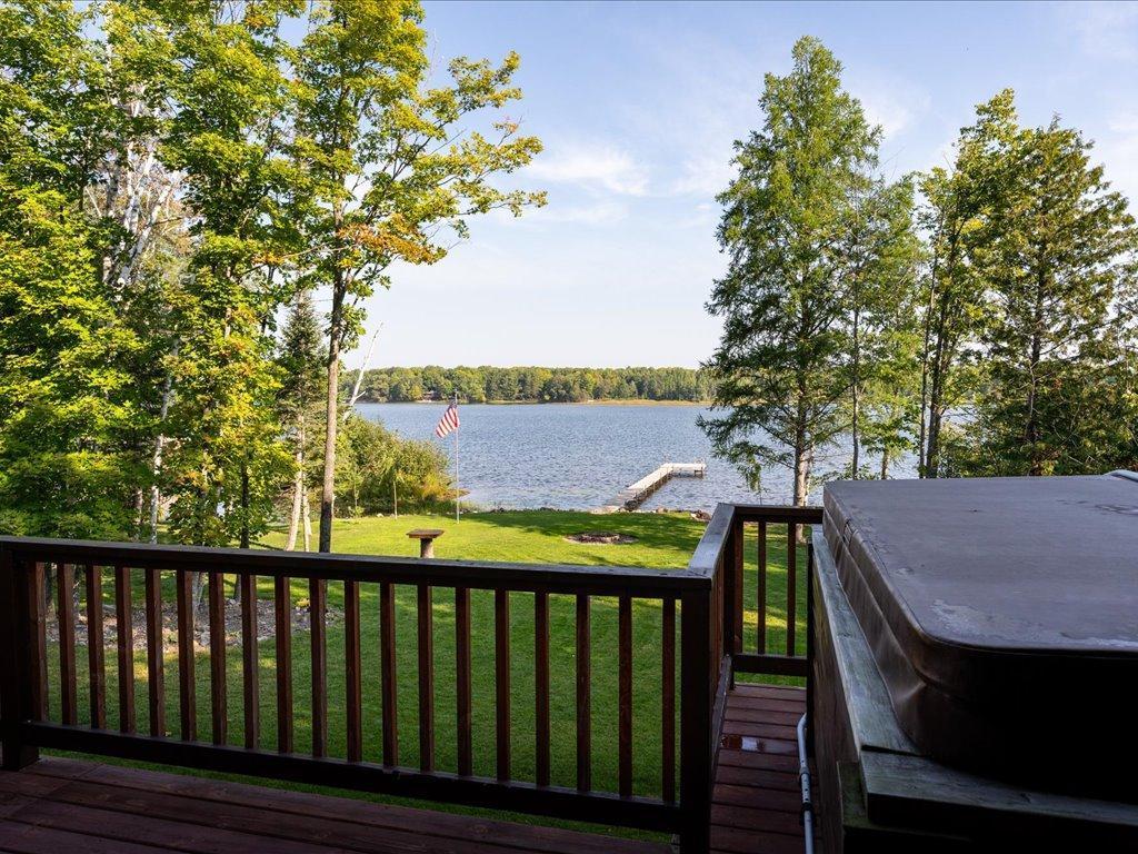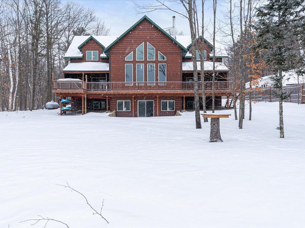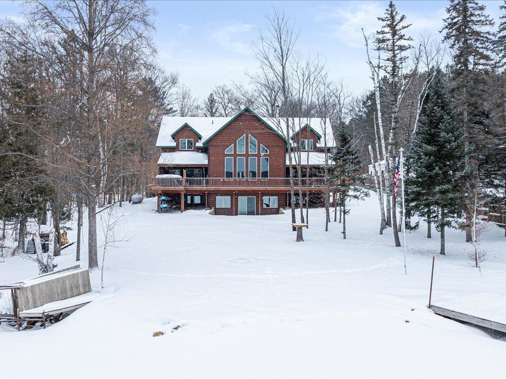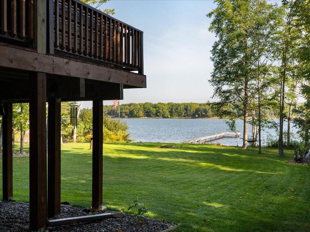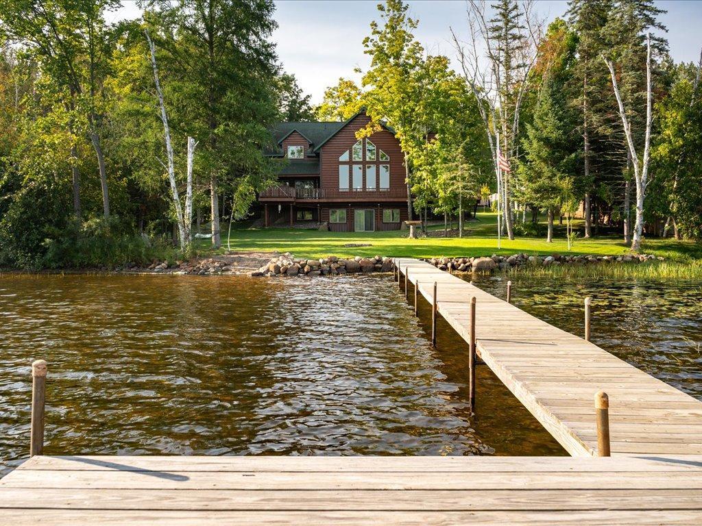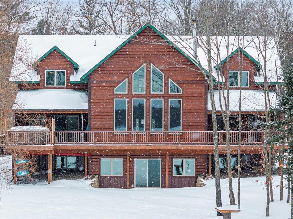 Step into lakeside luxury with this stunning 4+ bedroom, 5-bathroom home boasting over 4,000 sq. ft. on Sugar Lake. Nestled at the end of a secluded, private tree-lined drive, this home offers peaceful privacy and a magical journey through the woods every time you arrive. Cozy up in the family room with wood stove that climbs to the ceiling crackling warmly on cold winter days. The custom built-ins with an electronic hiding space for the TV, blends style and function seamlessly. Enjoy the amazing lake views from the wall of windows that extend to the vaulted ceilings.. A built-in wine bar with cork back splash is around the corner and adds a touch of elegance. The over sized chef’s kitchen has custom hickory soft-close cabinets/ drawers with under cabinet lighting, a lighted corner pantry, LG stainless steel appliances including built-in double wall ovens and gas cooktop stove centered in the breakfast bar that comfortably seats 4. Featuring throughout home is knotty alder trim and six panel wood doors. The bamboo wood floors flow nicely starting in foyer and expanding through parts of home. Step outside onto the expansive lake-sized deck the runs from one side of the house to the other and relax. The finished lower level walks out to a lush green lawn watered by the lake and perfect for summer days. The inviting open lower level features 2 bedrooms with double closets, full bathroom, living room, game room, rustic accent walls, storage and a great spot to add a wet bar. The upper level loft overlooks family room with log railing wrapping up the stairs etched with character. The open loft offers stunning lake views overlooking the level sandy shoreline thru the wall of windows. You find another lakeside bedroom suite with walk in closet and private bathroom, an office, hobby room and another bathroom. Stay comfortable year-round with dual-zone furnaces and central air. Park in comfort with your heated, insulated two-car detached garage set up with floor drain and openers. Sit on dock and fish or jump off and swim. This home is calling your name....