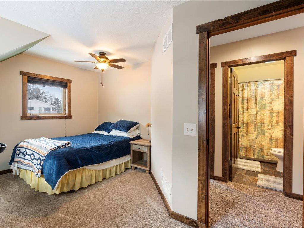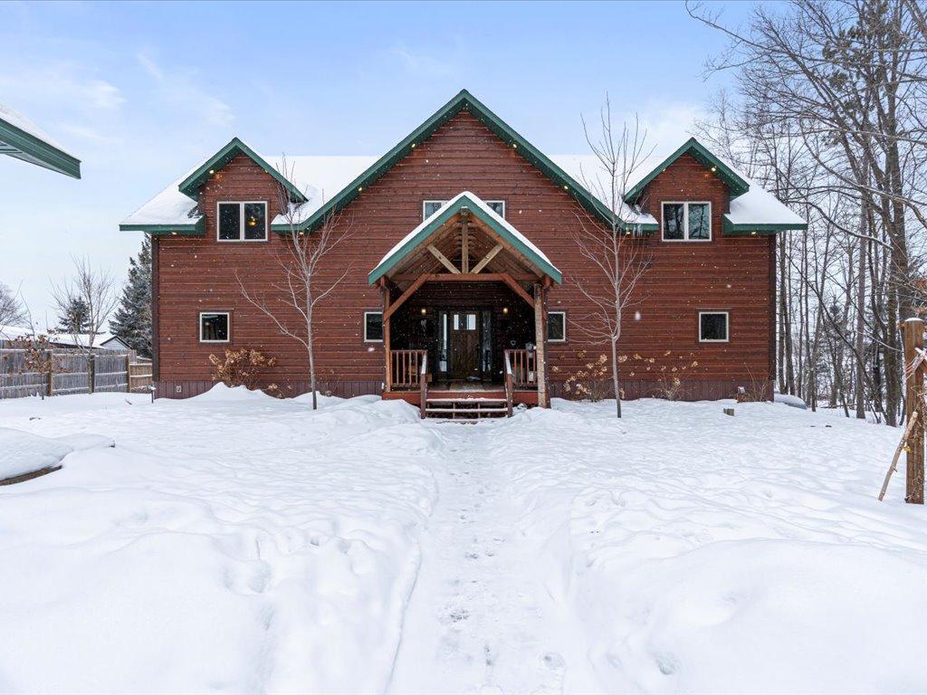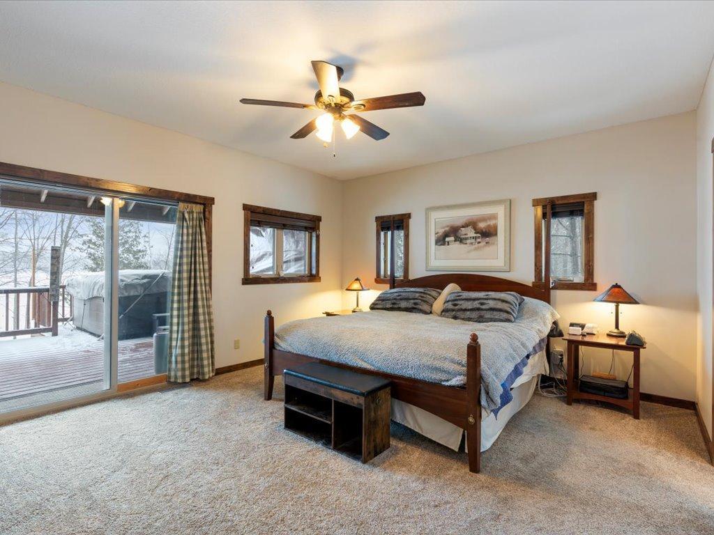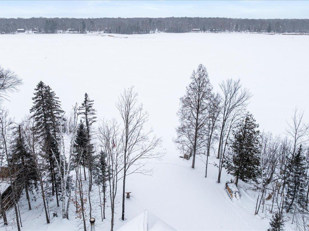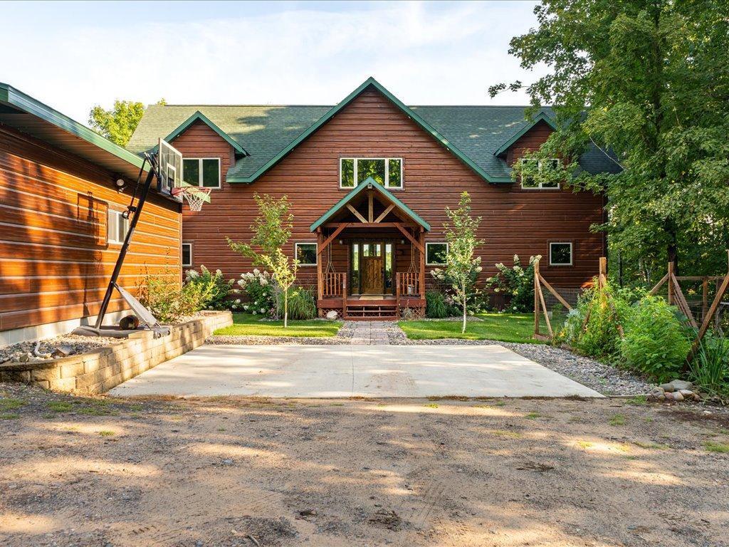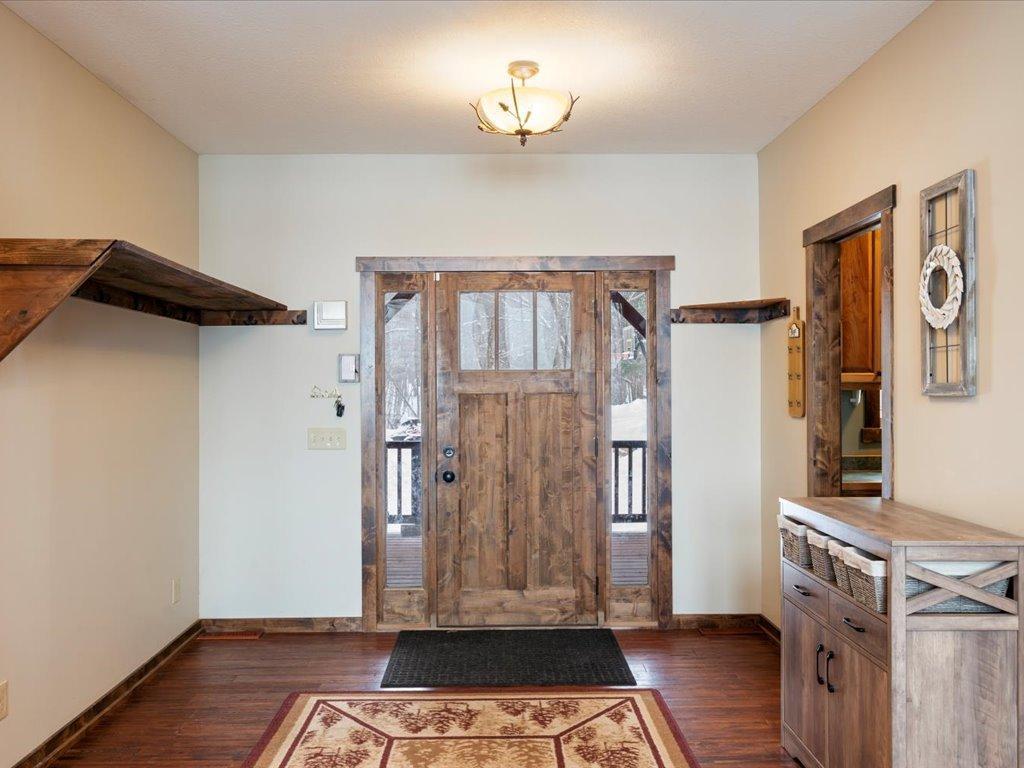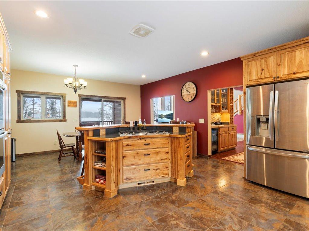 Step into lakeside luxury with this stunning 4+ bedroom, 5-bathroom home boasting over 4,000 sq. ft. on Sugar Lake. Nestled at the end of a secluded, private tree-lined drive, this home offers peaceful privacy and a magical journey through the woods every time you arrive. Cozy up in the family room with wood stove that climbs to the ceiling crackling warmly on cold winter days. The custom built-ins with an electronic hiding space for the TV, blends style and function seamlessly. Enjoy the amazing lake views from the wall of windows that extend to the vaulted ceilings.. A built-in wine bar with cork back splash is around the corner and adds a touch of elegance. The over sized chef’s kitchen has custom hickory soft-close cabinets/ drawers with under cabinet lighting, a lighted corner pantry, LG stainless steel appliances including built-in double wall ovens and gas cooktop stove centered in the breakfast bar that comfortably seats 4. Featuring throughout home is knotty alder trim and six panel wood doors. The bamboo wood floors flow nicely starting in foyer and expanding through parts of home. Step outside onto the expansive lake-sized deck the runs from one side of the house to the other and relax. The finished lower level walks out to a lush green lawn watered by the lake and perfect for summer days. The inviting open lower level features 2 bedrooms with double closets, full bathroom, living room, game room, rustic accent walls, storage and a great spot to add a wet bar. The upper level loft overlooks family room with log railing wrapping up the stairs etched with character. The open loft offers stunning lake views overlooking the level sandy shoreline thru the wall of windows. You find another lakeside bedroom suite with walk in closet and private bathroom, an office, hobby room and another bathroom. Stay comfortable year-round with dual-zone furnaces and central air. Park in comfort with your heated, insulated two-car detached garage set up with floor drain and openers. Sit on dock and fish or jump off and swim. This home is calling your name....