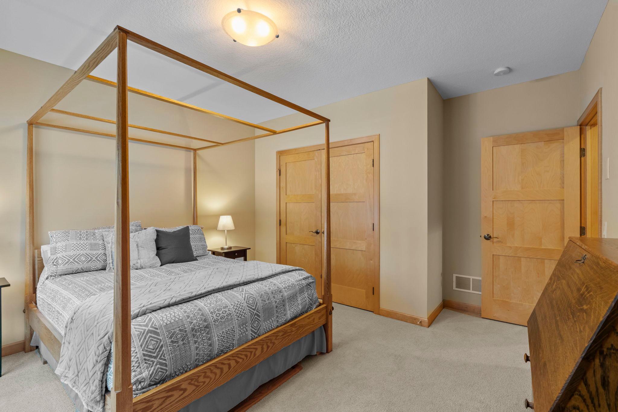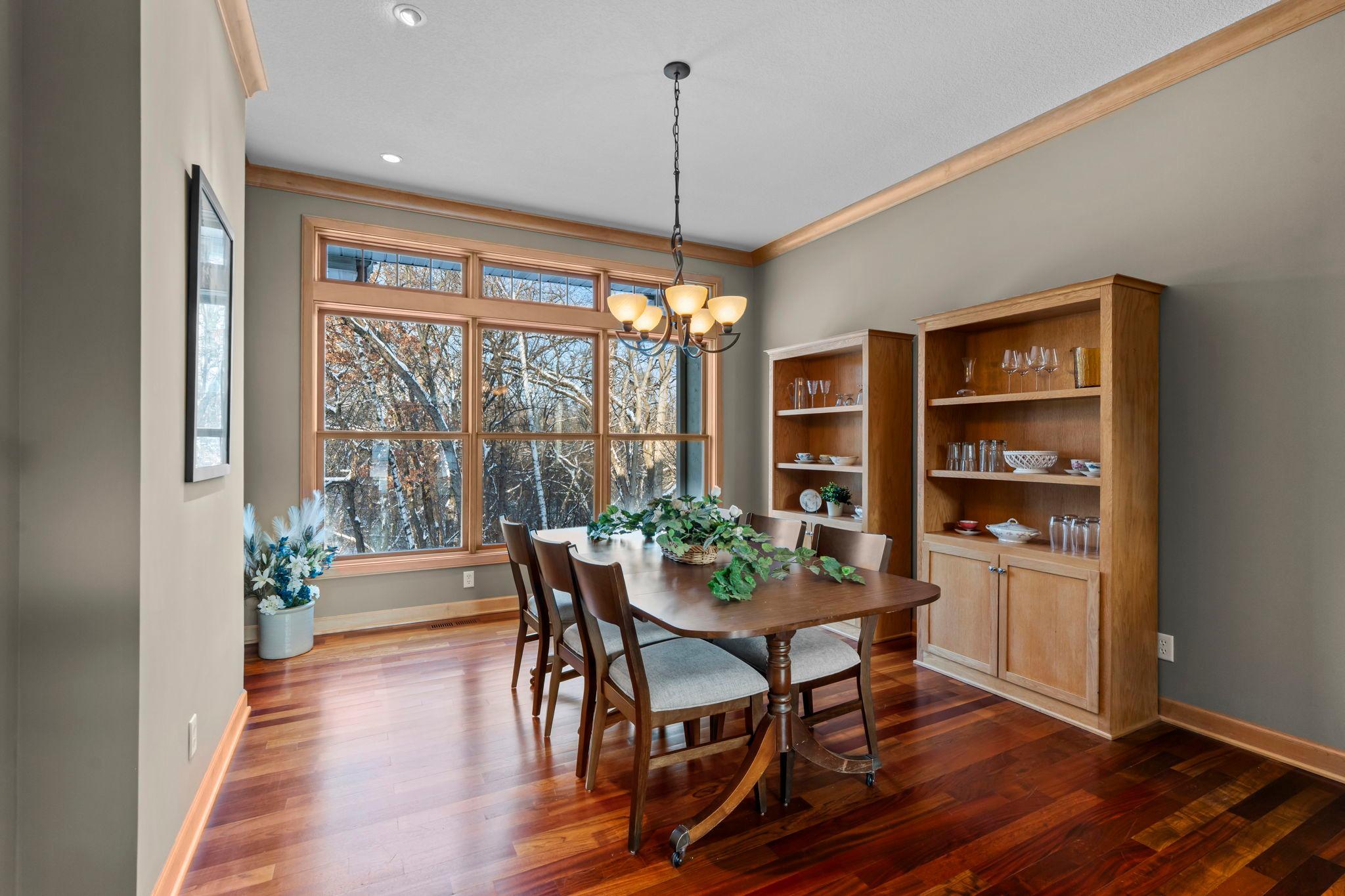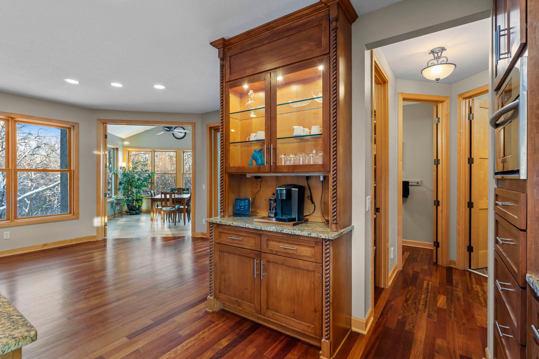 This impressive 5-bedroom, 4-bathroom rambler sits on a serene, wooded 2.5-acre lot, offering the perfect blend of luxury, comfort, and everyday ease. Thoughtfully designed for main-level living with a walkout lower level and generous indoor–outdoor spaces, the home delivers both quiet retreat and standout areas for entertaining. The main level welcomes you with high ceilings, rich Brazilian Cherry flooring, and a bright, open layout ideal for gathering. At the heart of the home, the gourmet kitchen anchors the space with its large island, quality finishes, high-end appliances, and effortless flow to the dining area and deck for easy indoor–outdoor living. A warm and inviting living room features a vaulted ceiling and stone-surround fireplace, while a four-season sunroom adds a cozy year-round escape. The main-level primary suite offers a true haven with a fireplace, walk-in closet, and spa-inspired ensuite with heated floors. Additional rooms on this level provide flexible options for bedrooms, office space, or hobby use, all supported by smart home features and designated mudroom and laundry areas. The walkout lower level expands the living space with a large family room and home theater, recreation area, wet bar, sauna, two bathrooms and three additional bedrooms—perfect for guests or hobbies. Outside, the fully fenced backyard, deck, patio, and beautiful landscaping create an inviting extension of the home. A heated, insulated workshop and EV-ready 3-car garage enhance everyday functionality, while recent mechanical updates add peace of mind. Elegant, comfortable, and designed for effortless living, this home is a true retreat ready to enjoy.