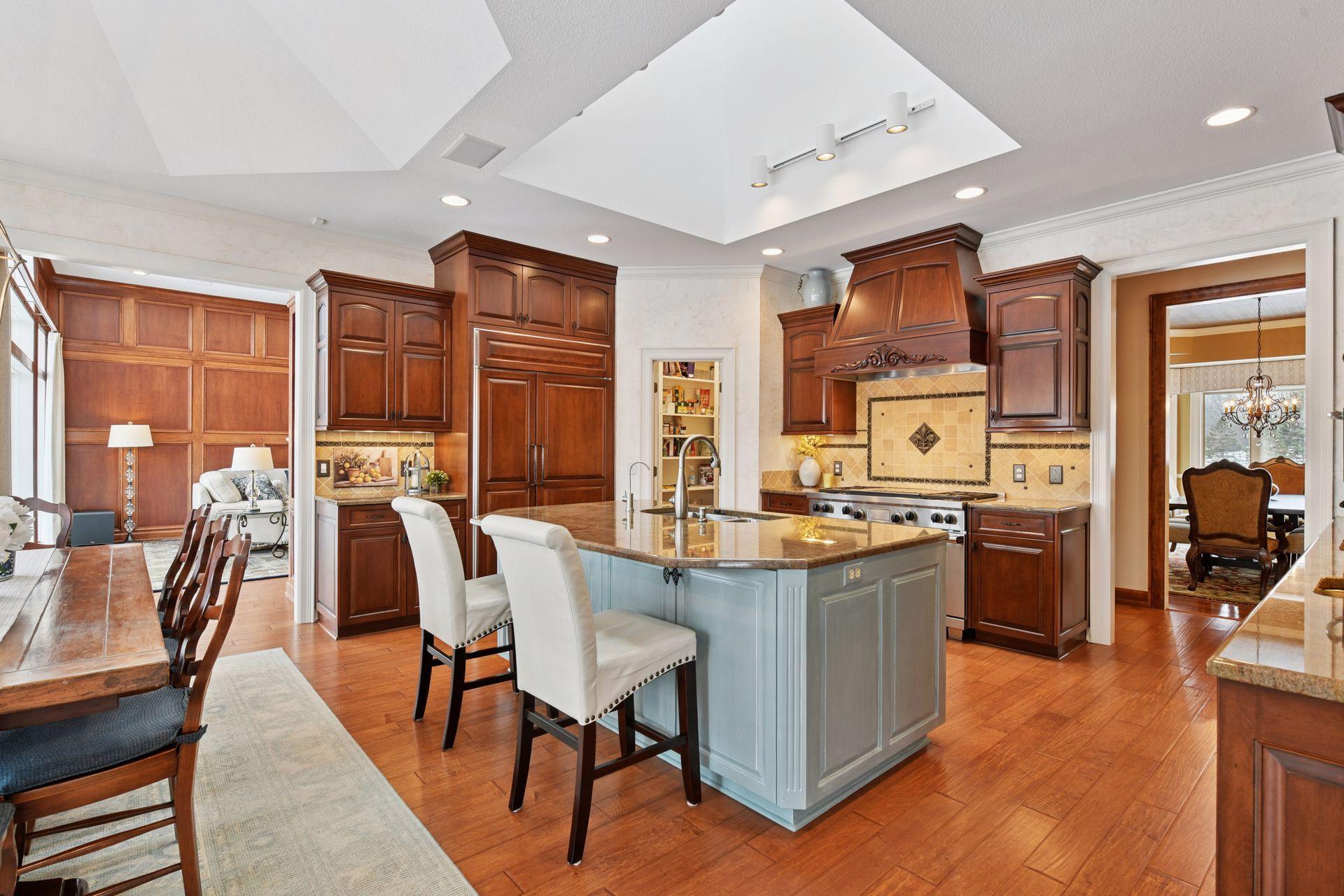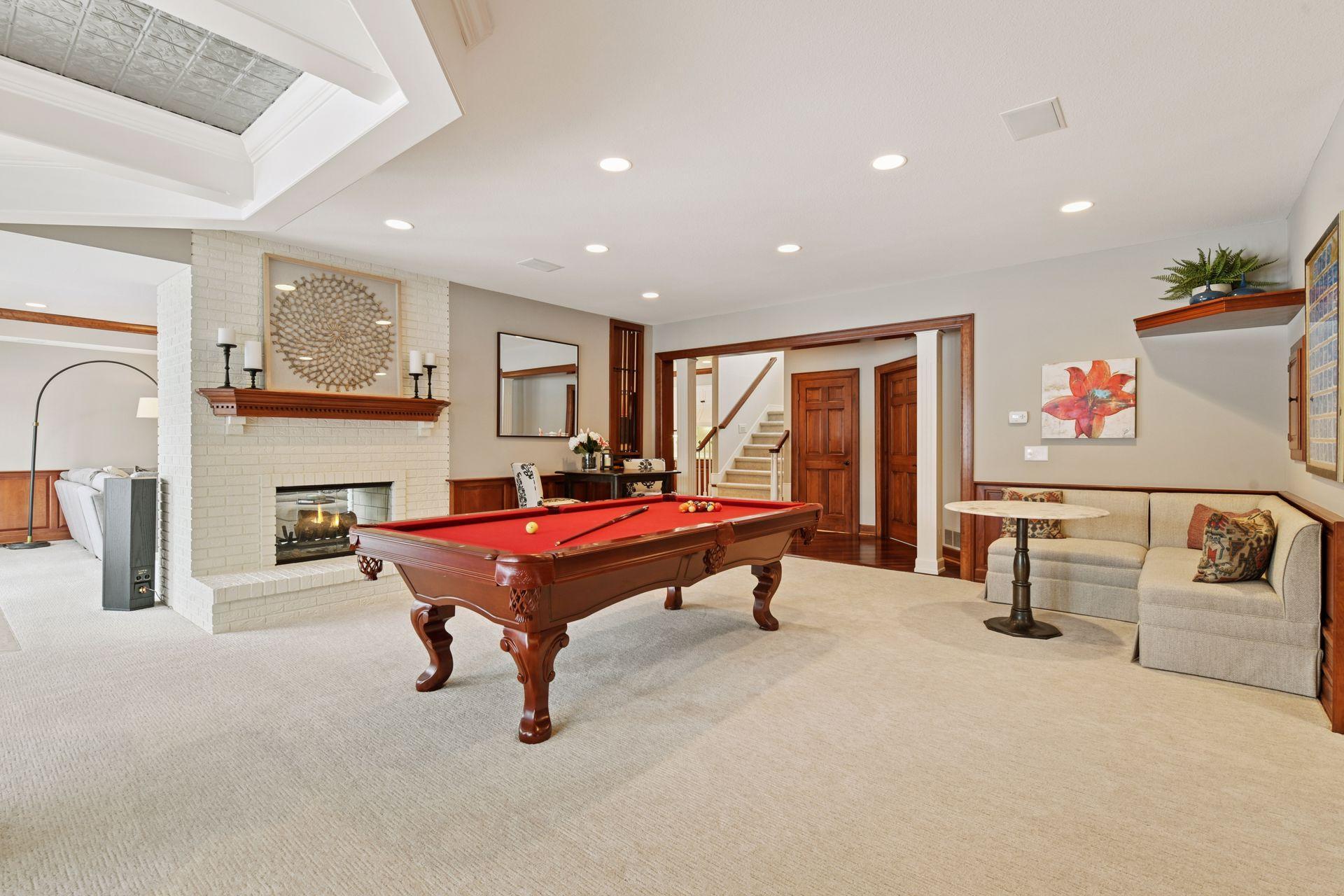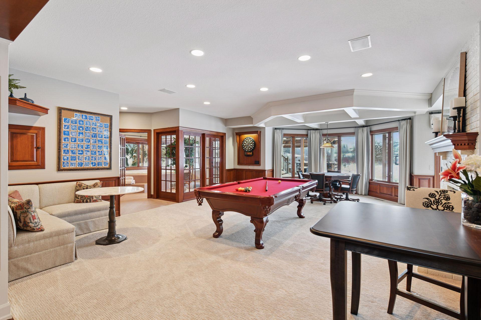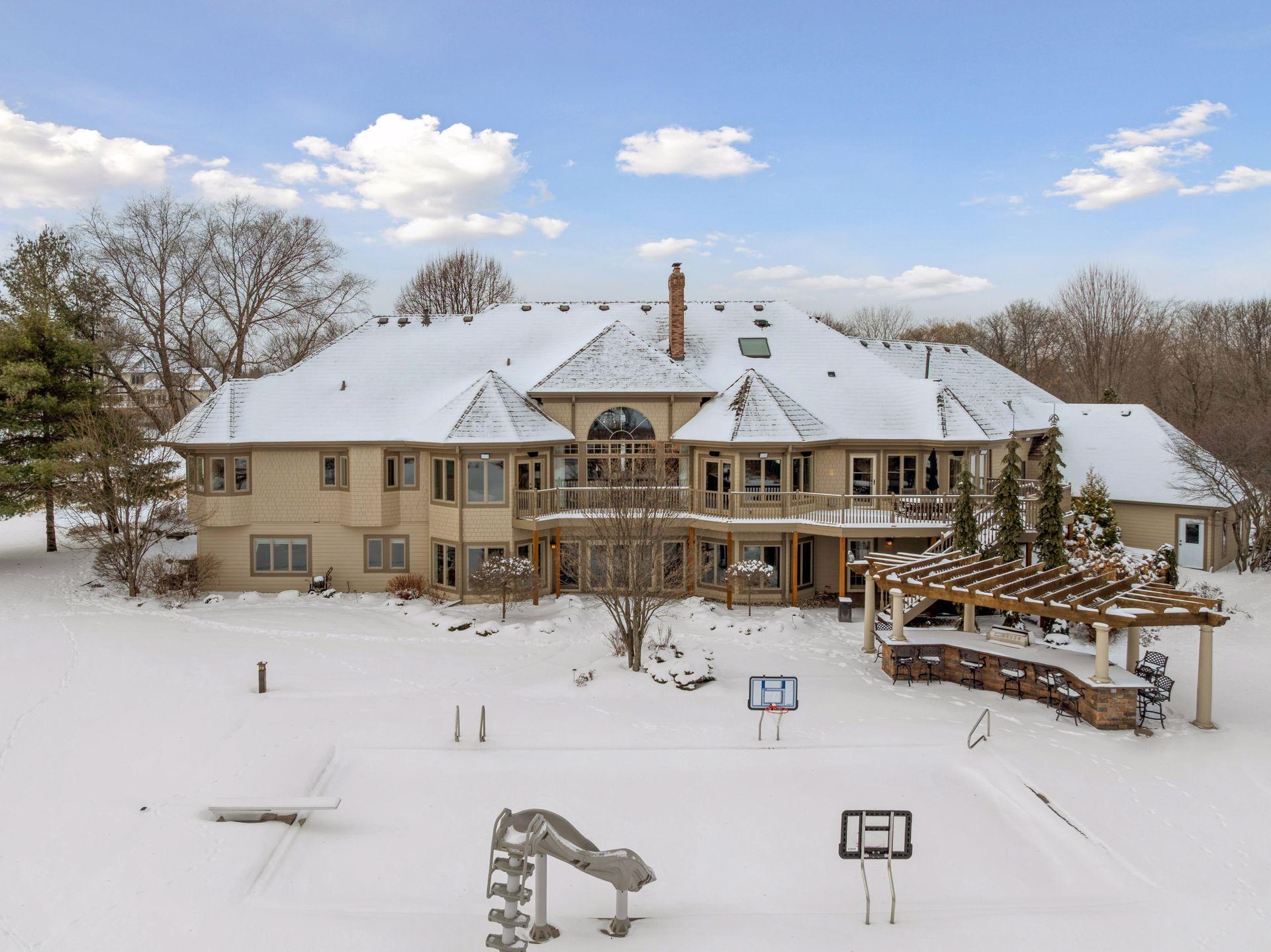Set upon an enchanting and private 5 acres site designed for recreation. This masterfully crafted walkout one-level home features panoramic nature views overlooking manicured grounds and peaceful ponds. Upon entering you are greeted with a stunning barrel-vault ceiling leading through the living room to a wall of windows that invites in the impressive vistas. Richly paneled walls and cozy wood burning fireplace, make it the perfect gathering spot. The gourmet kitchen is appointed with top-of-the-line appliances, center island with seating, ample cabinet space, granite counters, walk-in pantry, vaulted ceiling and a generous informal dining space. The main level primary suite showcases a large bay window and access to the back deck that stretches the length of the home. Enjoy the private bathroom retreat with dual vanities, walk-in shower, soaking tub and two substantial walk-in closets. Two more bedrooms and full bathroom round out the owner’s wing. The main level also offers a formal dining room, living room, 4-season porch/office, laundry, spacious outdoor deck, and more. Entertainment abounds in the lower level! Enjoy a generous sized family room with newer bi-fold Marvin doors that open to the backyard and patios. A full 2nd kitchen, game room with space for billiards, and indoor spa room with hot tub and sauna are not to be missed. Two more bedrooms with private ¾ bathrooms, exercise room, and large storage room complete the walkout lower level. Delight in the backyard oasis complete with large pool including diving board, basketball hoops, and slide. Wonderful entertaining terraces with built-in outdoor kitchen including grill, 2 refrigerators, and warming drawer. Then relax at the gas fire pit overlooking the scenic pond. Car enthusiasts will appreciate the main level 3 car heated garage, 2 ½ car lower garage and the large finished storage room above the lower garage. Neighborhood tennis courts with pickleball lines! It’s all here!