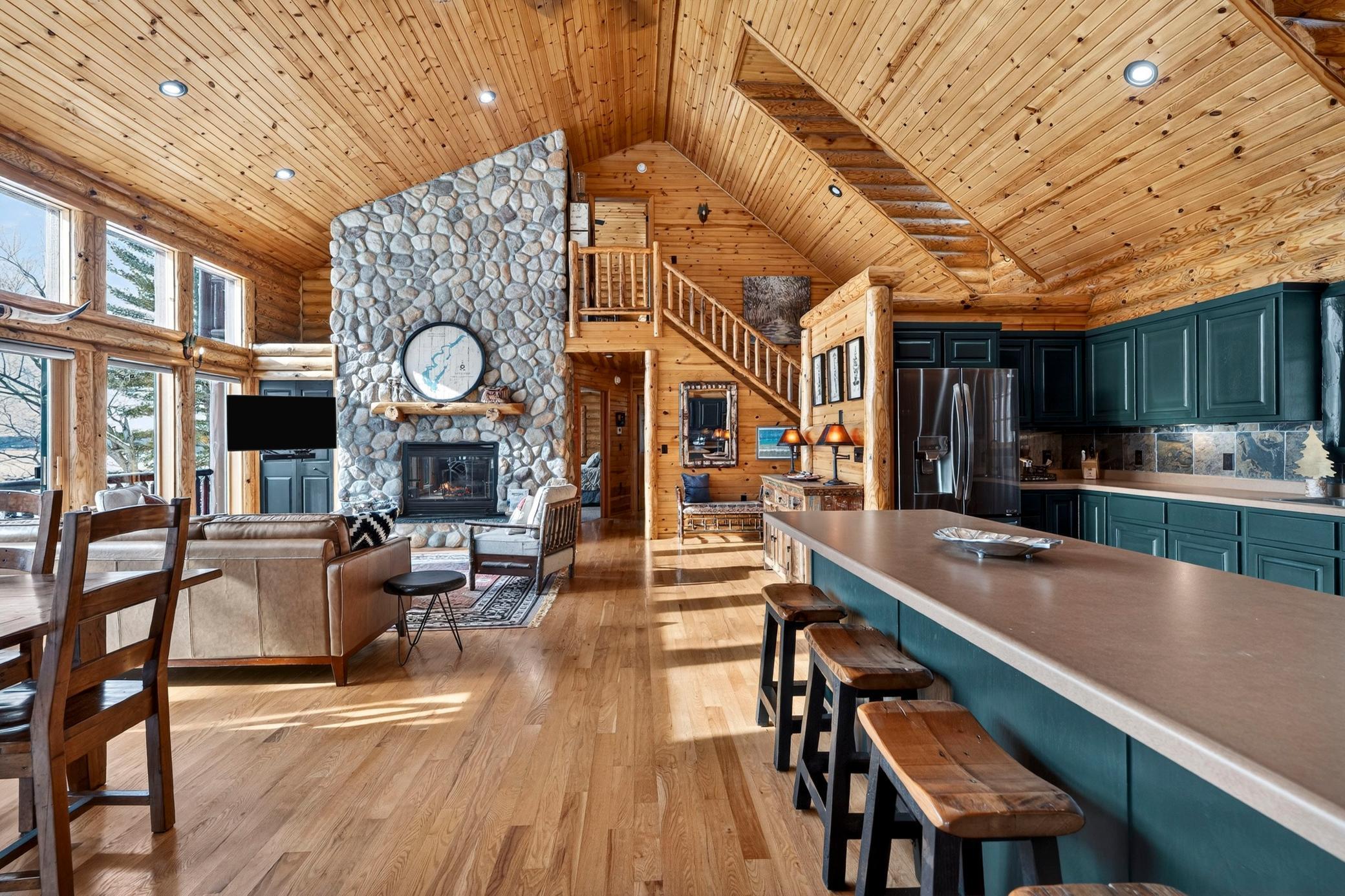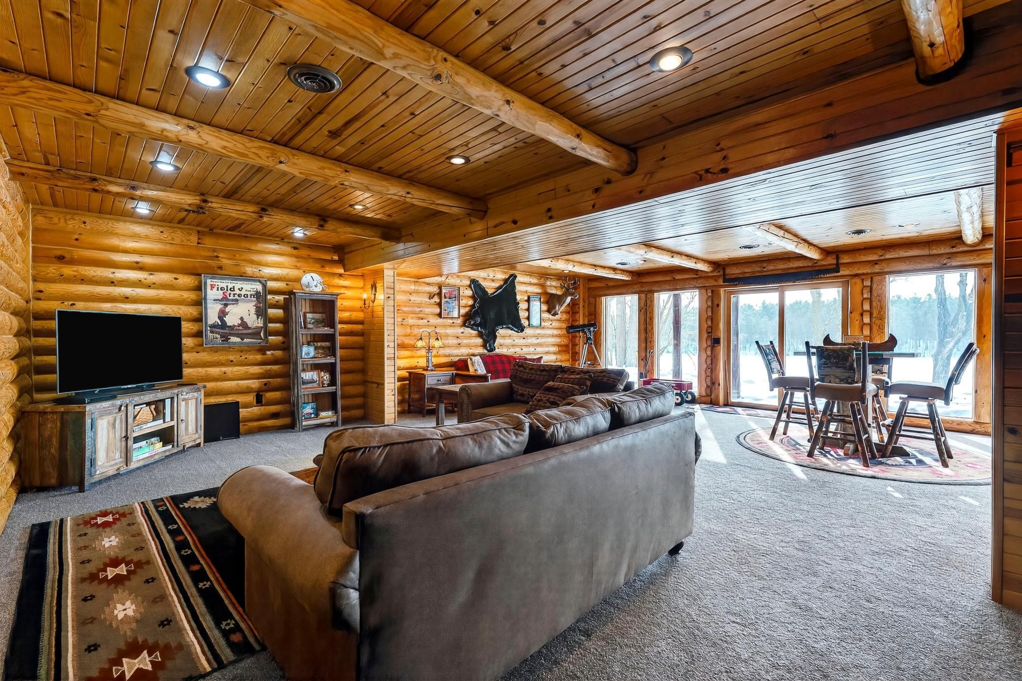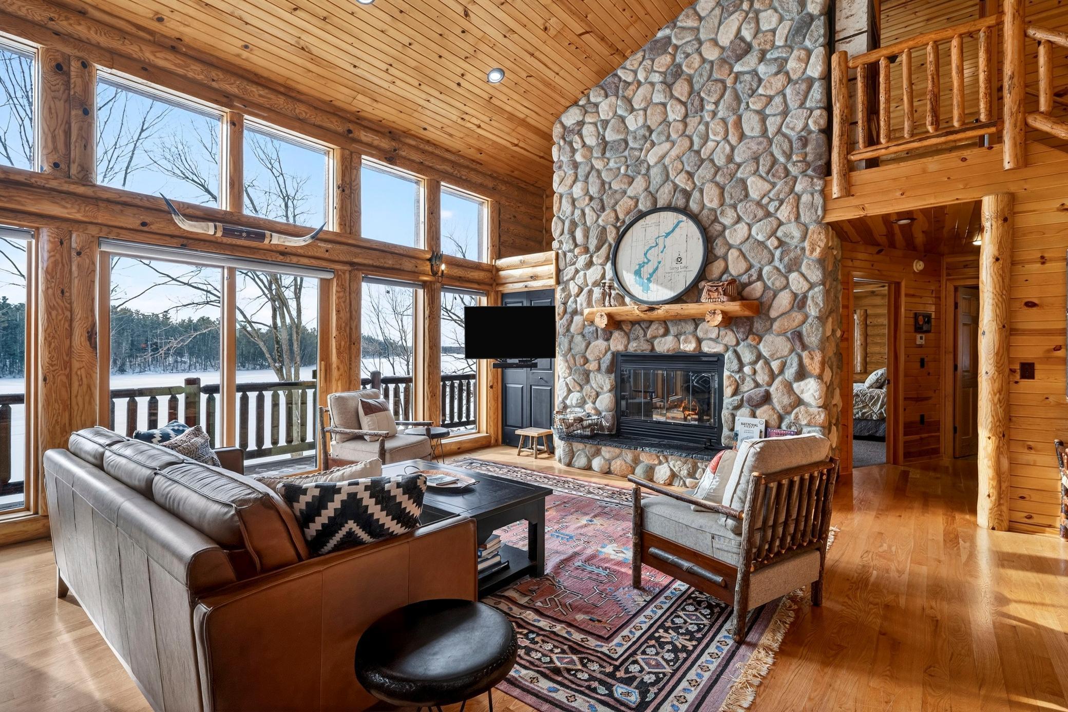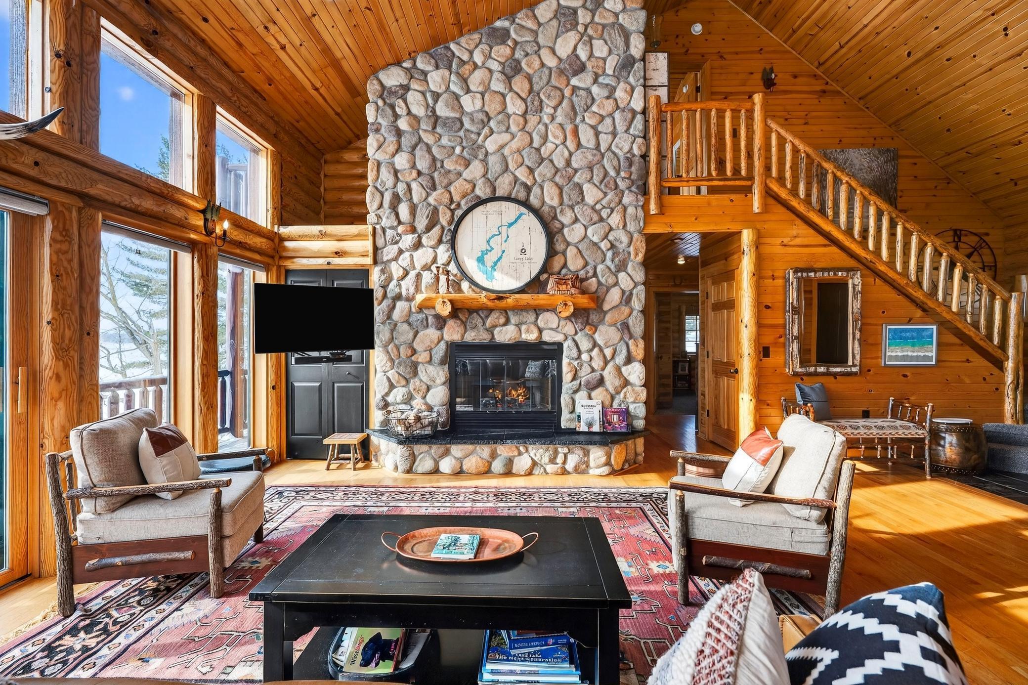 Stunning property on Long Lake! This immaculately cared-for 4-BR, 3-BA chalet-style home offers 3,200 sq ft of open-concept living space with breathtaking lake views on a private lot. Inside, soaring wood ceilings, half-log interior details, hardwood floors, heated tile bathrooms, and a stone fireplace create a cozy yet elegant retreat. The walk-out lower level features a spacious family room with a wet bar, perfect for entertaining. Wake up to lake views from the luxurious owner’s suite with fireplace. Enjoy outdoor living with a screened porch, decks, a lakeside patio, and a professionally landscaped lot with stone steps to the shoreline and a sandy swimming area. Recent updates include a new 50-year roof, heated garage, stamped concrete sidewalks, circular driveway, new laundry room, new furnace, Generac generator, and more. Long Lake offers 19 miles of exceptional fishing and boating, scenic shoreline, sandbars, a marina, and a boat-up golf course. ATV trails nearby. Sold with some furnishings.