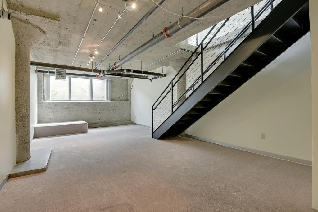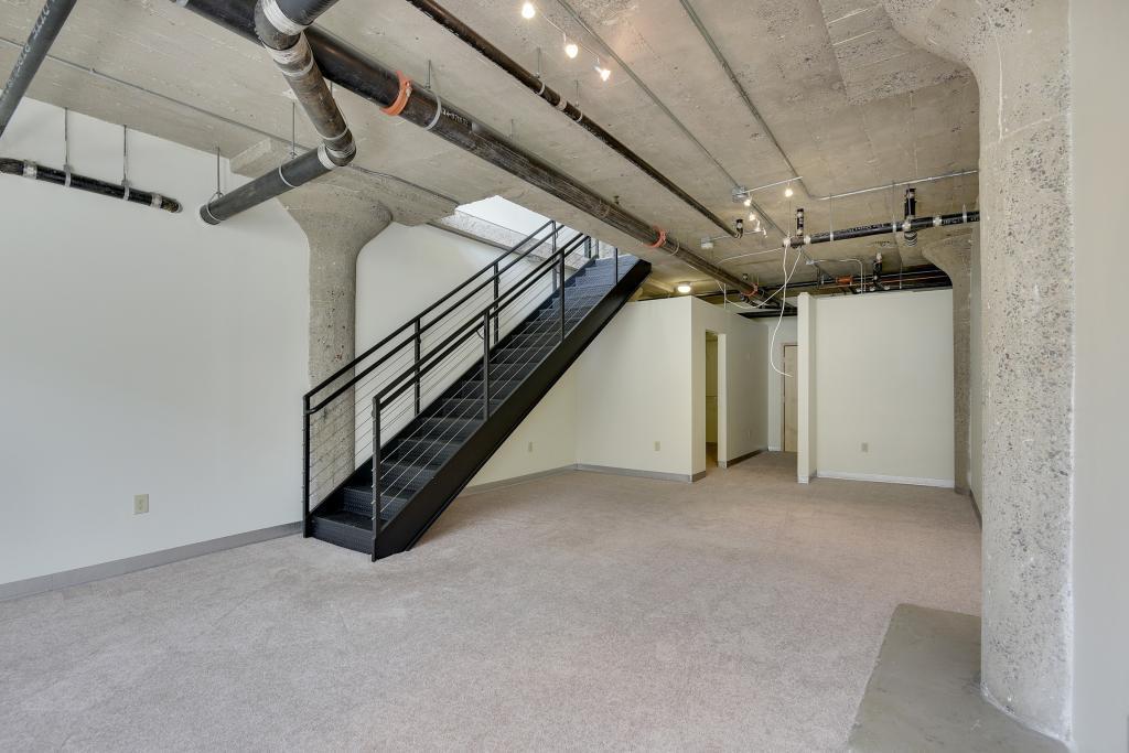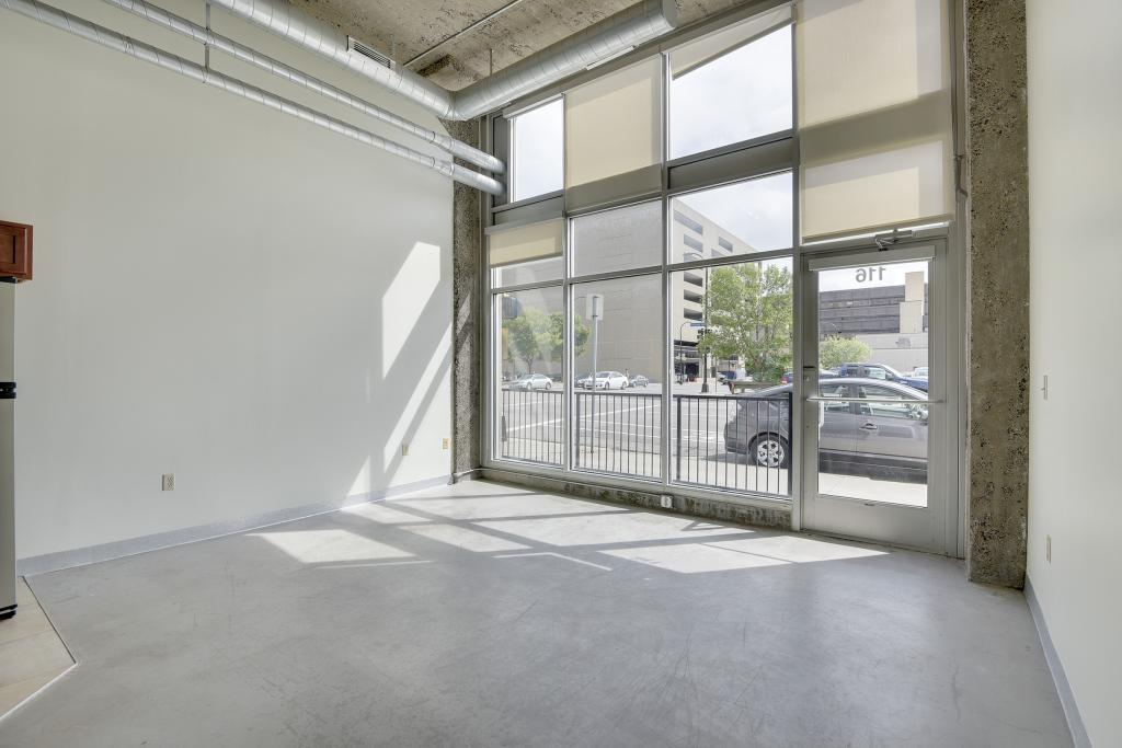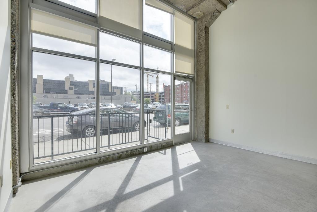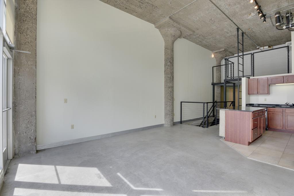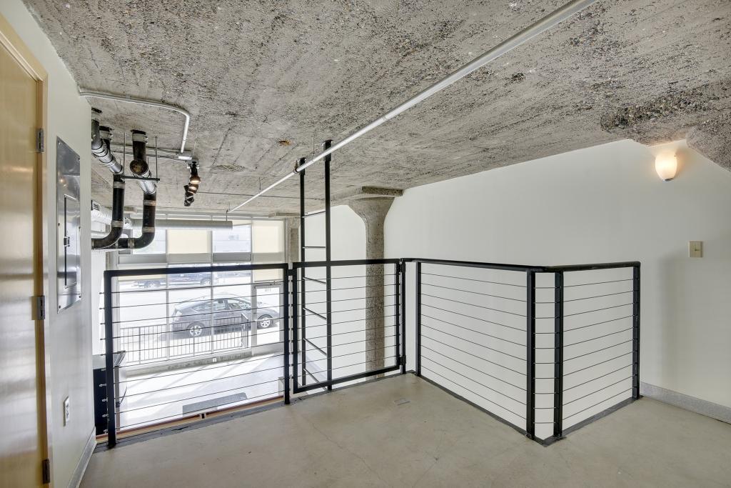 Sun-filled industrial walkout loft now available at historic Sexton Lofts. A wall of oversized windows fills the space with natural light, while the loft overlooks the main living area. The kitchen features granite countertops and generous cabinetry, complemented by a large closet and a full-size washer and dryer for everyday ease.