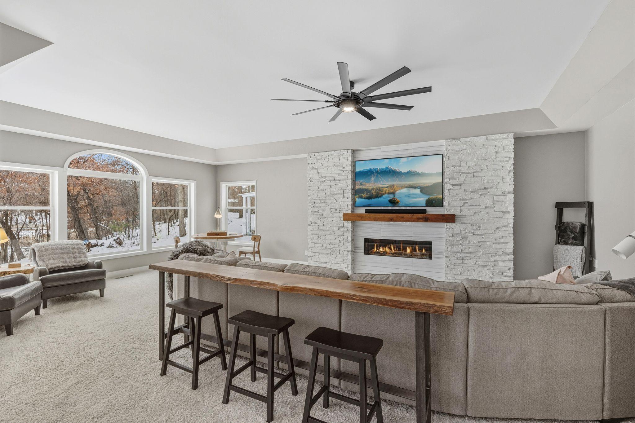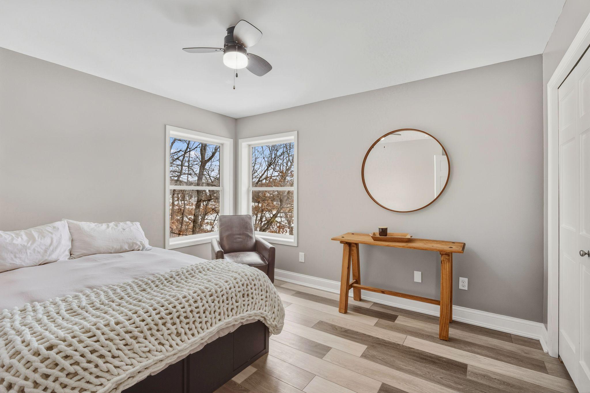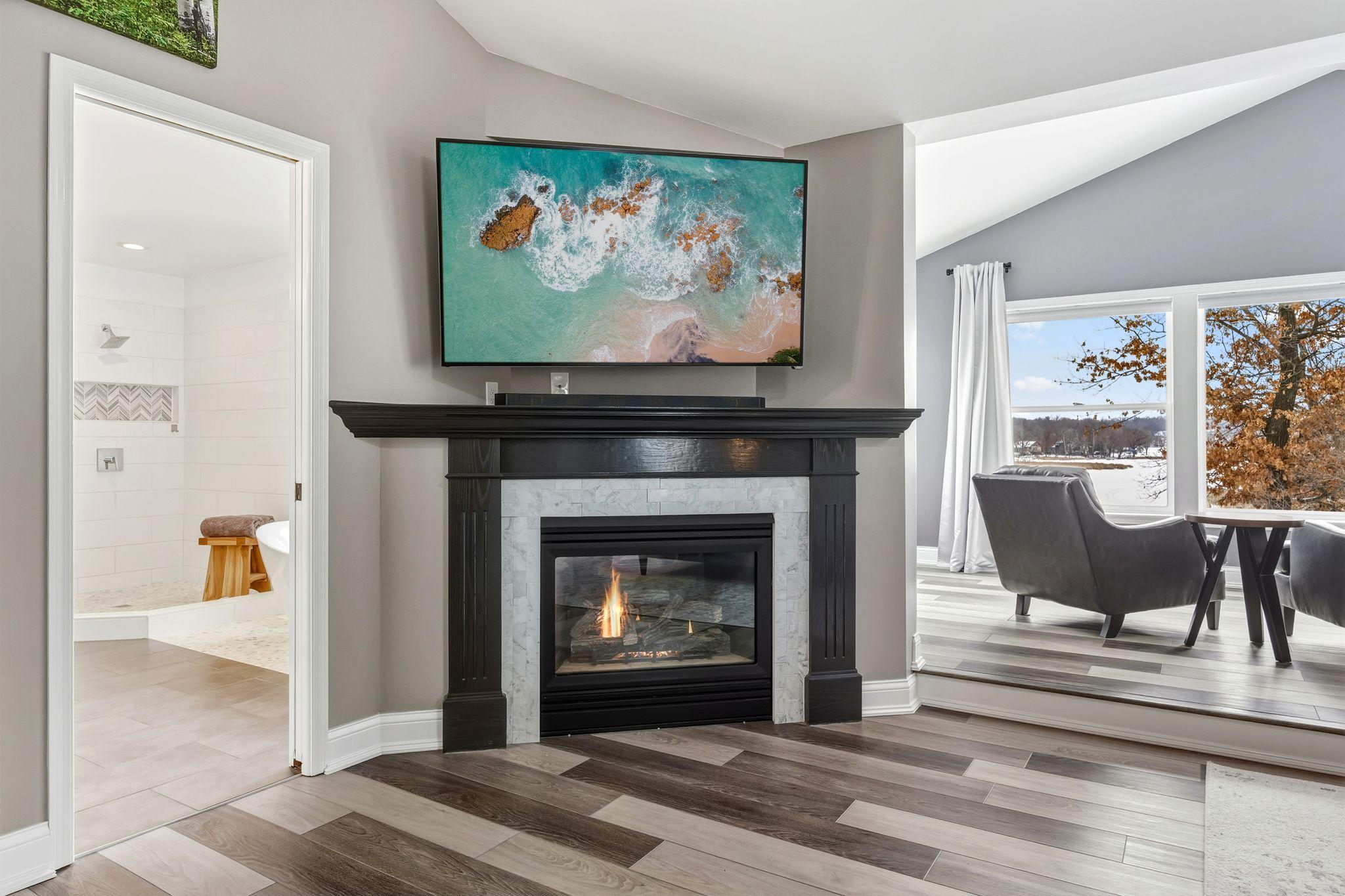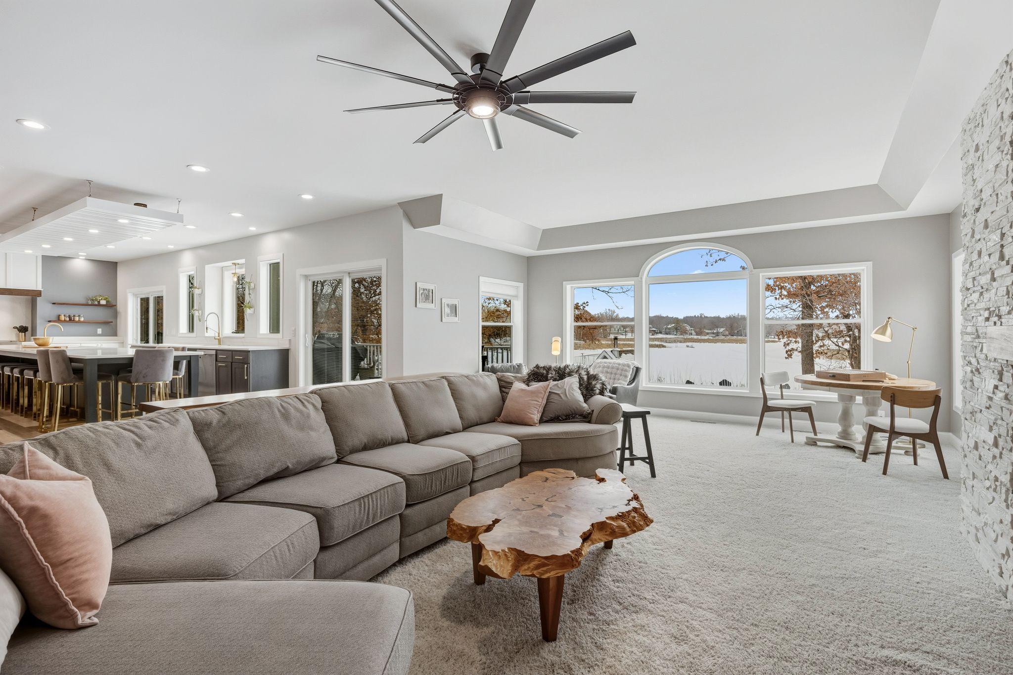 Welcome to Great Oak Shores Point in Lakeville, a convenient getaway. This incredibly remodeled estate has been tastefully remodeled from top to bottom, inside and out. A private and peaceful setting on a .79-acre wooded cul-de-sac lot with approximately 160’ of lake frontage. Easy shoreline access in a deeper bay. Enjoy entertaining, grilling and relaxation on the wrap around deck, firepit, hot tub and sauna. Ranked #4 Best Lake by USA Today in 2025, Lake Marion is a fully recreational lake prime for boating, fishing, swimming at Antlers Park Beach, mountain biking at West Lake Marion Park or exercising around the Juno Trailway. Lakeville Schools are consistently ranked as a Top 10 school district and are highly noted for an excellent athletic program. Convenient to freeway access to the International Airport, shopping and dining in old downtown Lakeville, skiing at Buck Hill that produced Lindsey Vonn, and downtown Minneapolis and St. Paul. This home was built and refreshed into an entertainer’s paradise. As you enter, you’re greeted by an impressive chandelier, wood staircase, luxury vinyl plank flooring throughout, white trim and millwork, shiplap, an office, and a cozy sitting room with library wall, ladder and fireplace. The massive chef’s luxury kitchen has panoramic lake views and is anchored by the massive 18 foot center island with quartzite countertops with ample seating for you and guests, stained maple cabinets, KitchenAid premium appliances with gas range and exhaust hood, icemaker and dual dishwashers. The sun-drenched living room has newer carpet and a toasty warm stone-faced gas fireplace. The upper-level has luxury vinyl plank throughout, a primary suite featuring vaulted ceilings, sunroom with lake views, gas fireplace, dual walk-in closets, spa-like bath with tiled floors, walk in shower, soaker tub and your own private workout studio! The other three upper-level bedrooms are nicely sized and benefit from an upgraded full bath with dual sinks and granite countertop. The lookout lower level has luxury vinyl plank flooring, gas fireplace, a fifth bedroom, walk in tiled shower with dual sinks, and a recreational area with kitchenette and granite countertop. 3+car finished garage with epoxy floors. New LP smart siding and architectural shingles grace the outside. See the video and 3D tour for your own private showing today!