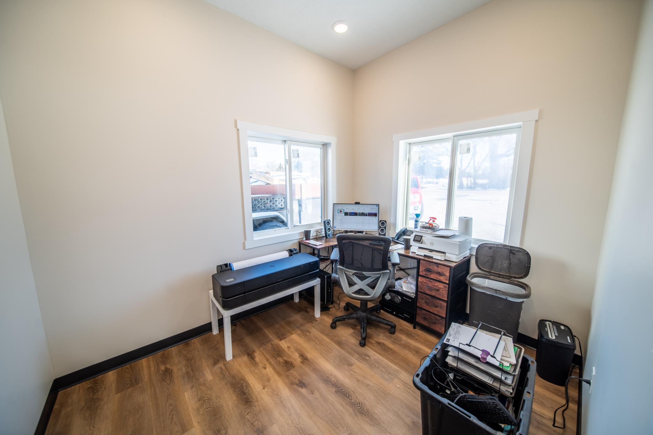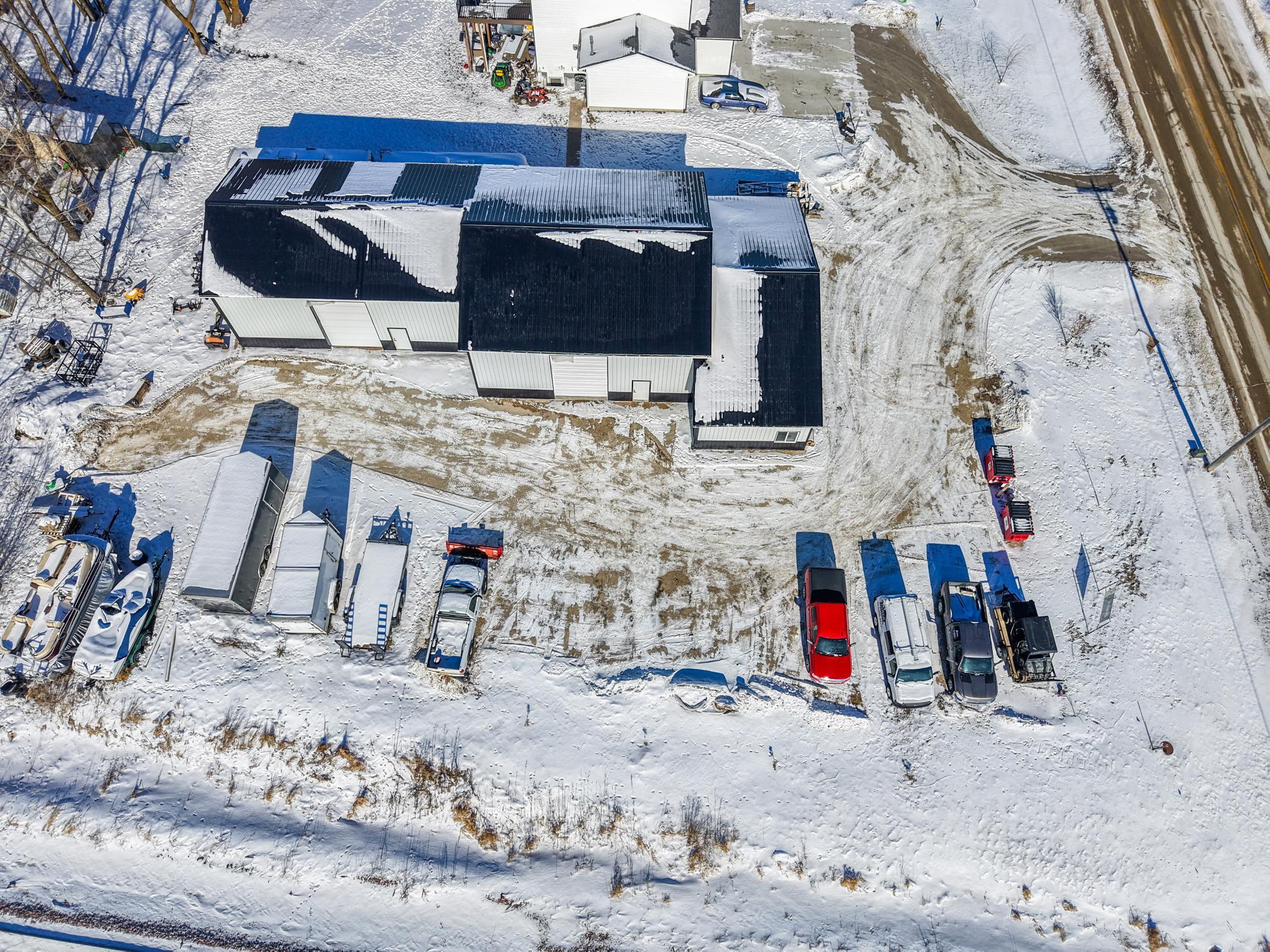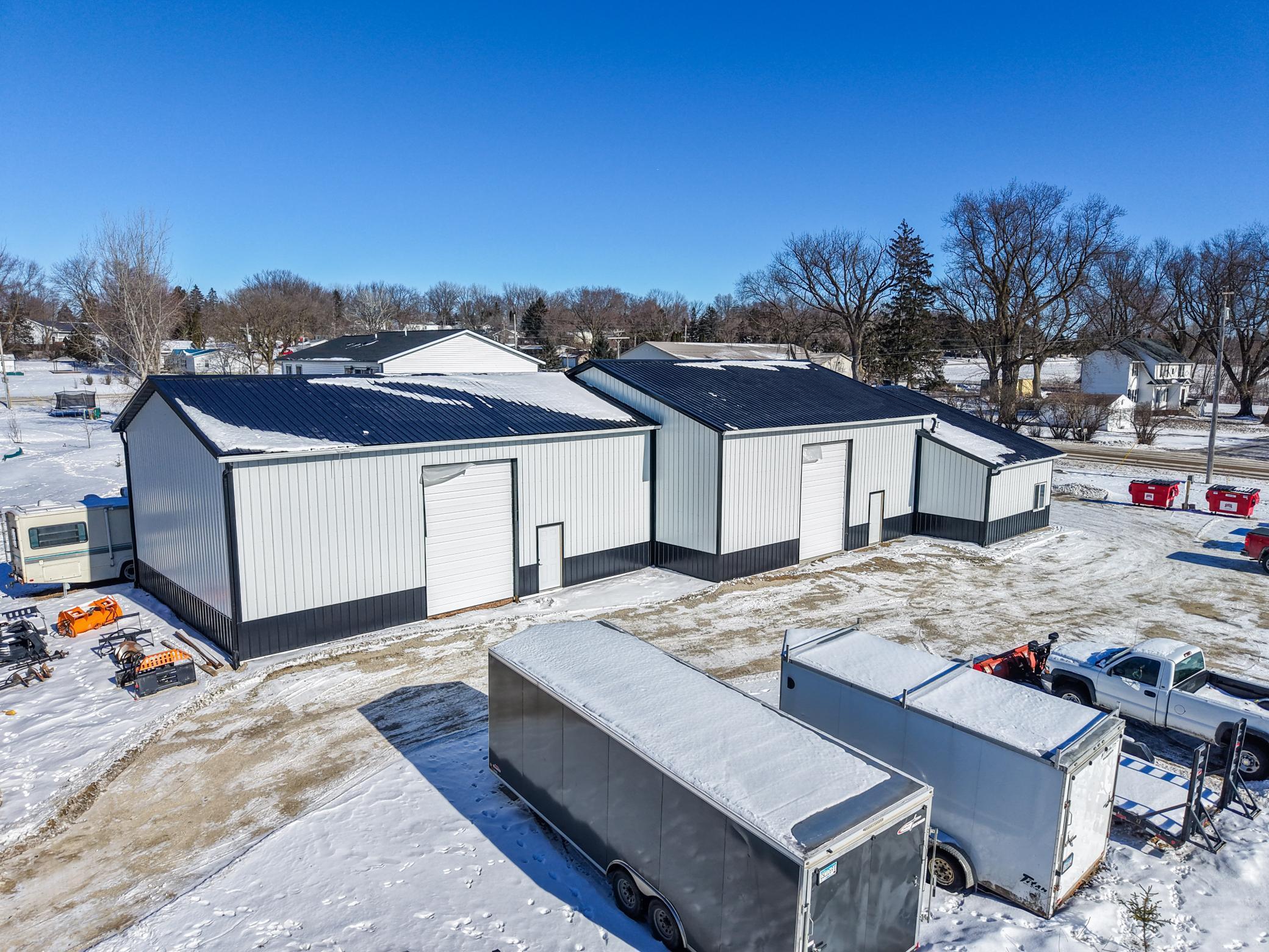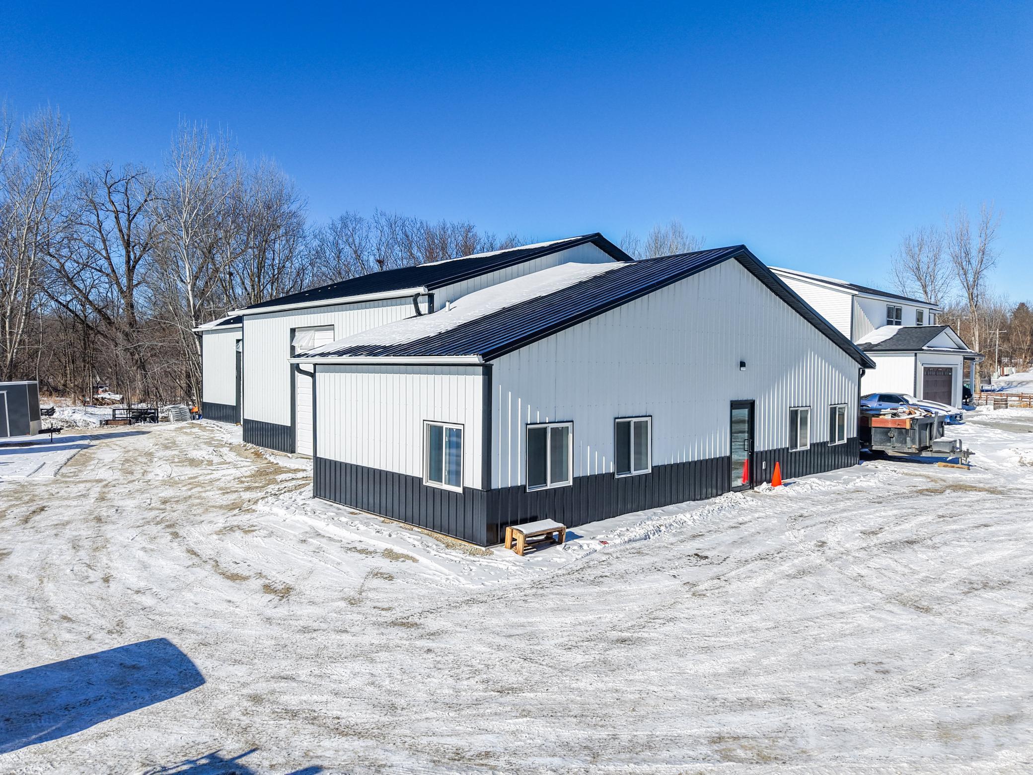 The building includes approximately 3,000 sq ft of shop space, highlighted by a 1,600 sq ft insulated and heated shop directly connected to the office, plus an additional 1,350 sq ft shop area. Sixteen-foot sidewalls and 14-foot overhead doors allow for efficient equipment access and functionality.