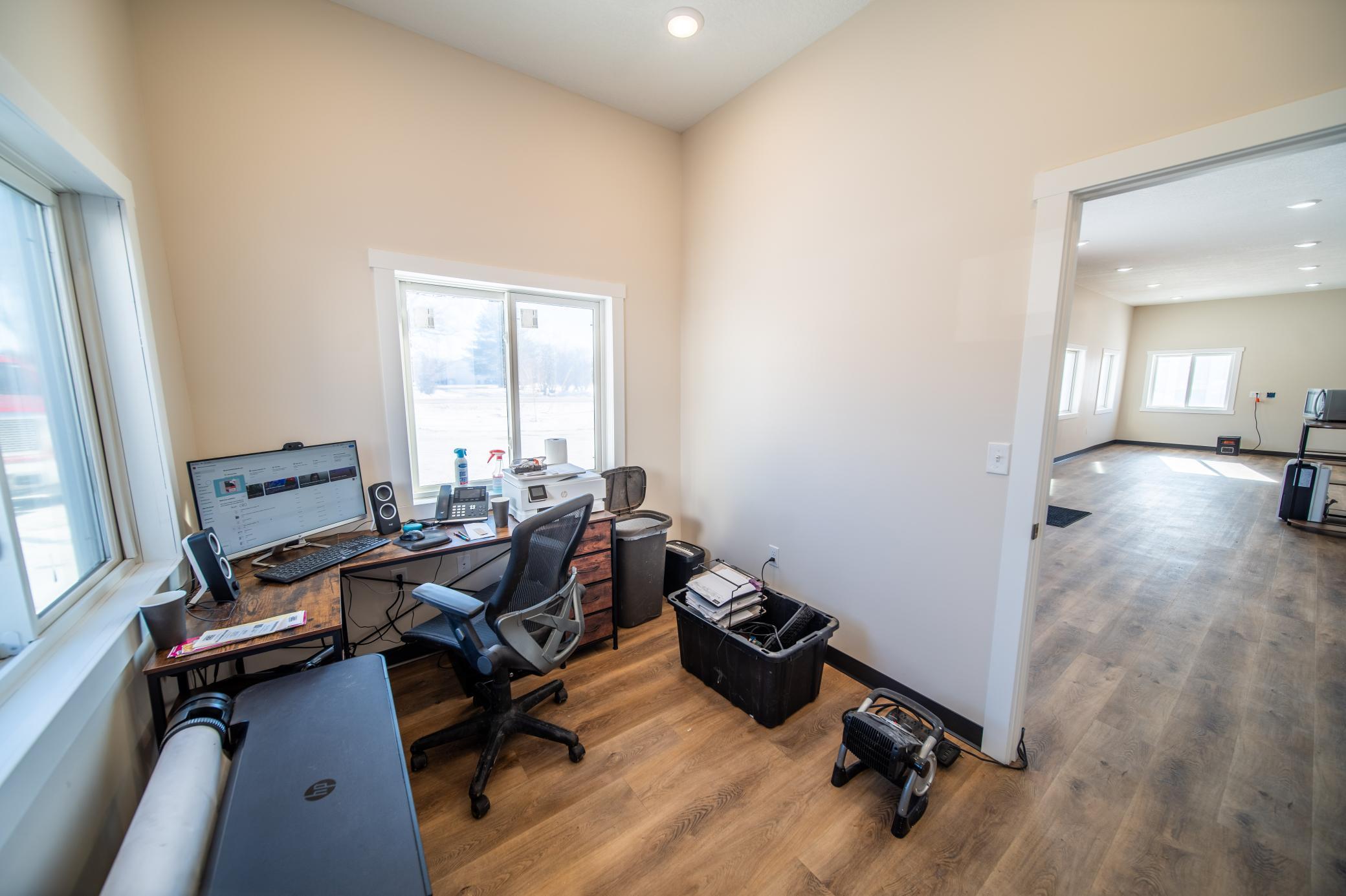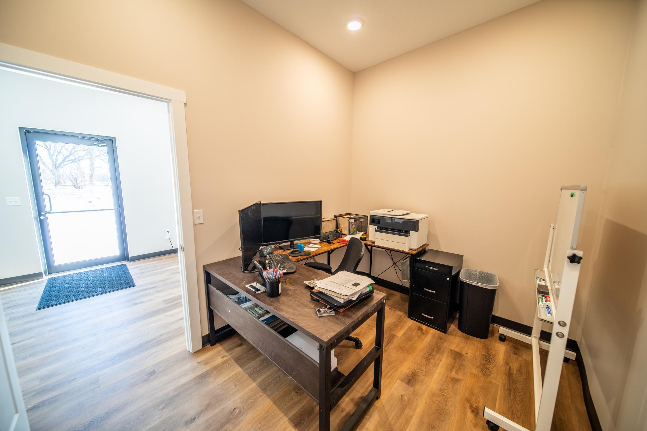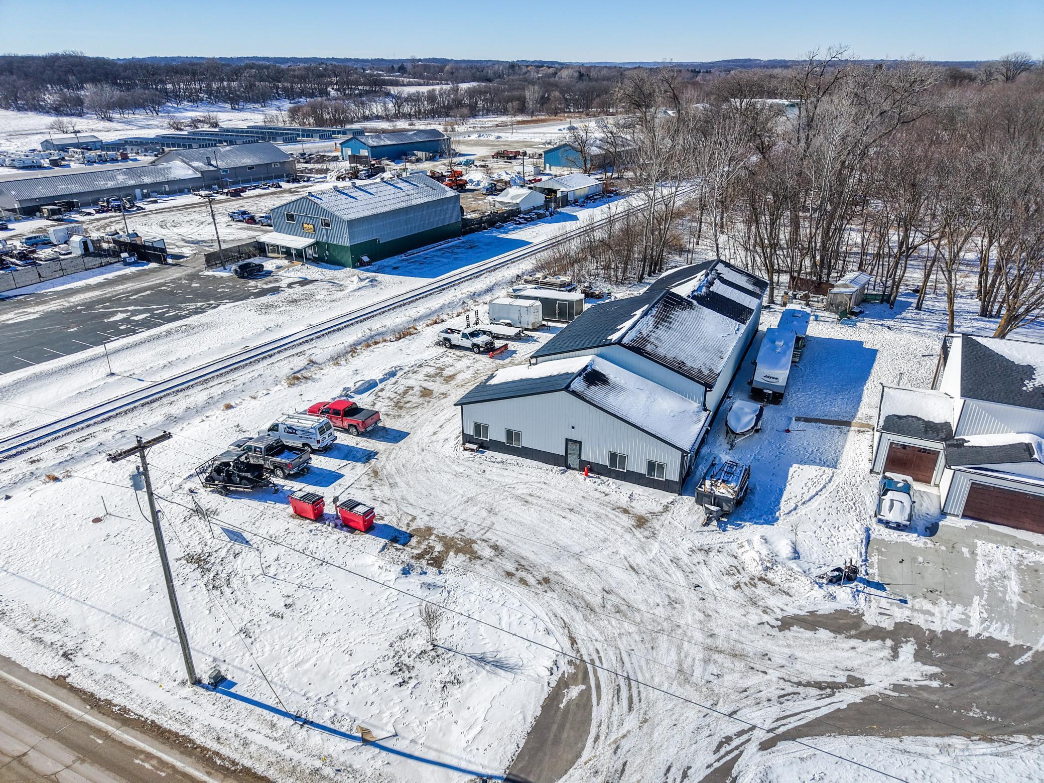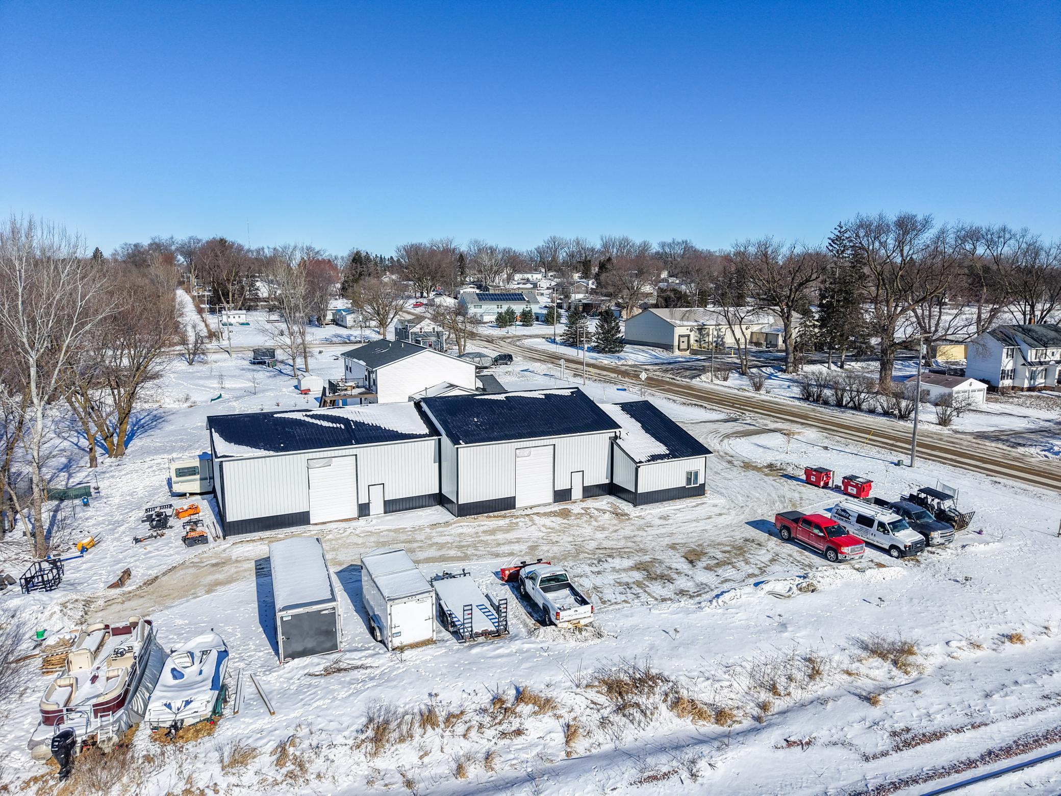 The building includes approximately 3,000 sq ft of shop space, highlighted by a 1,600 sq ft insulated and heated shop directly connected to the office, plus an additional 1,350 sq ft shop area. Sixteen-foot sidewalls and 14-foot overhead doors allow for efficient equipment access and functionality.