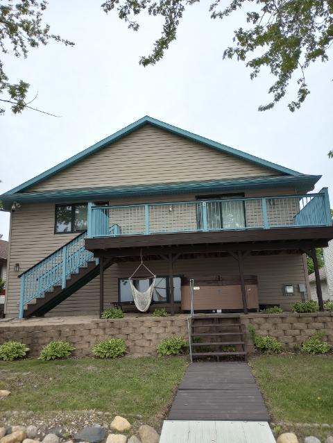 The highlight of the house is the view from the main living room patio on the top floor… You can make your way down to the dock and Lake from the patio stairs as well as from the kitchen side door. Hot tub under dock looks out to lake.