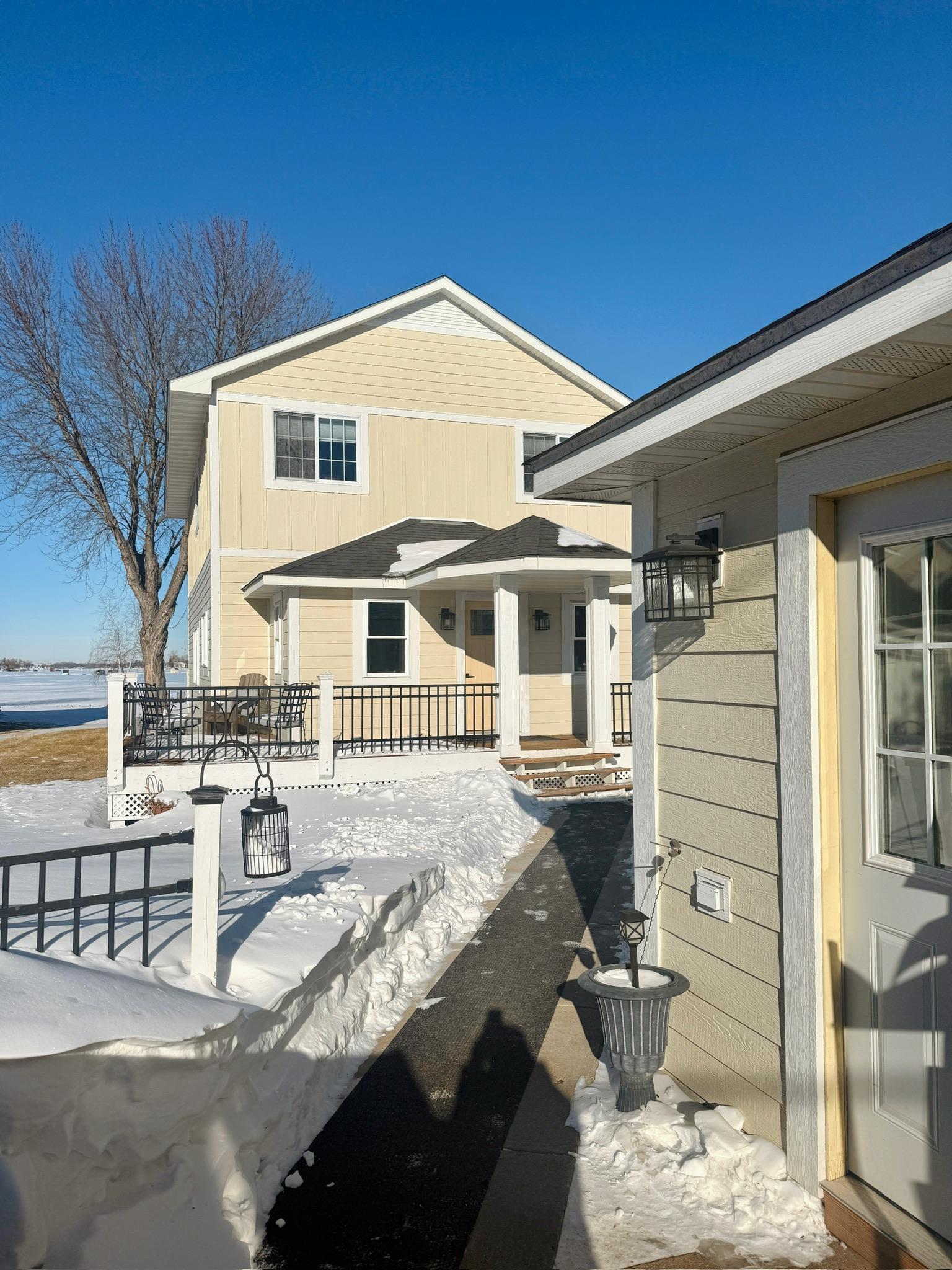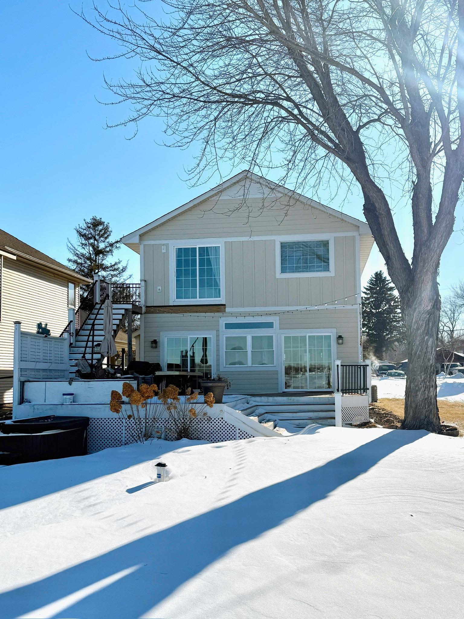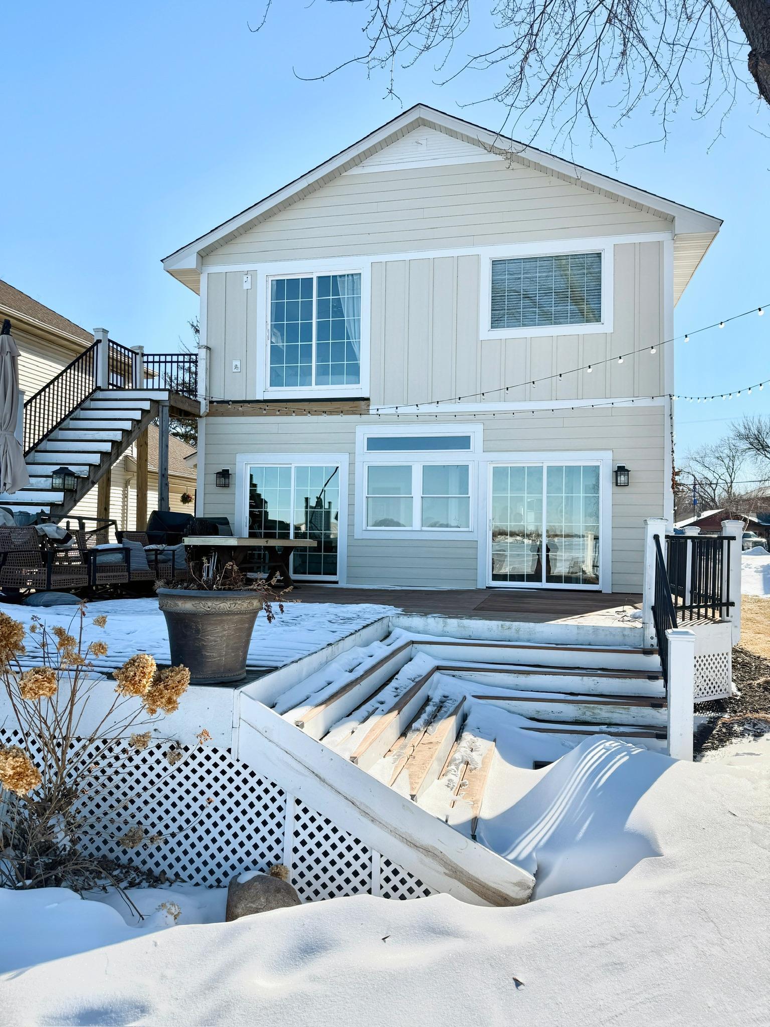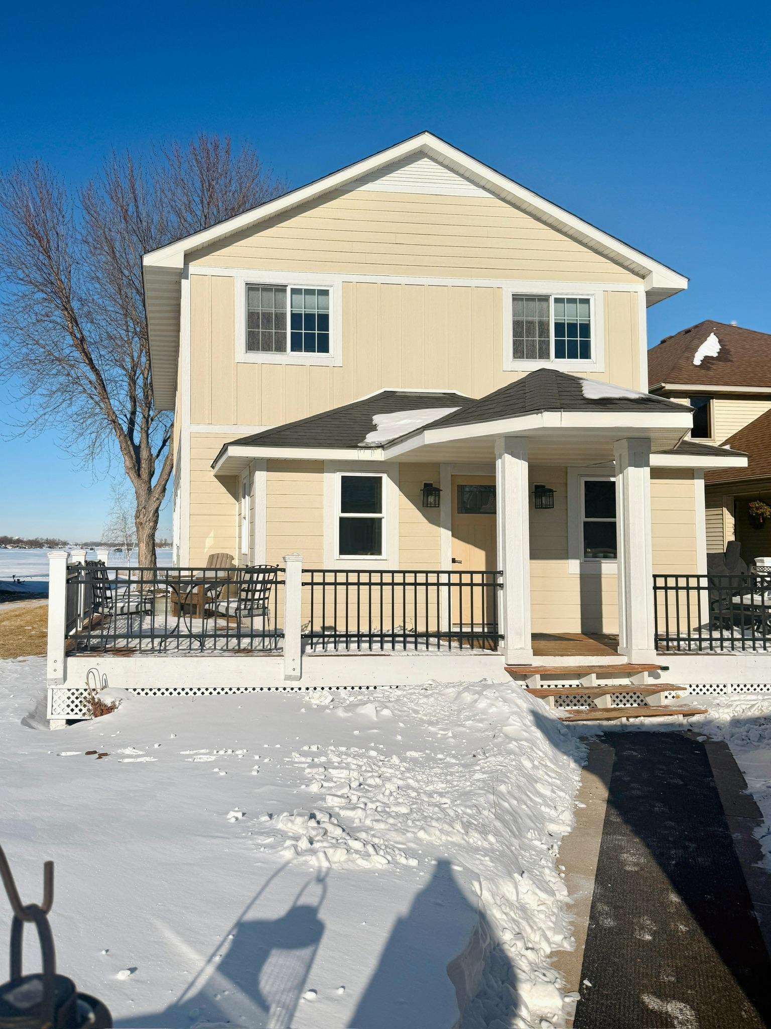 Modern Craftsman design meets relaxed lake-cottage living in this thoughtfully designed 4-bedroom, 2-bath lakefront home on highly sought-after Ideal Avenue, the name truly lives up to it. Set on a .3-acre lot with 50 feet of lakeshore, this Forest Lake property offers a well-balanced setting that combines lakefront living with a vibrant, established neighborhood feel. Inside, high ceilings and hardwood floors create a warm, inviting atmosphere that feels both elevated and comfortable. The kitchen features a functional layout with an island and flows naturally into the surrounding living and dining spaces, anchored by a cozy fireplace—perfect for every Minnesota season. Large windows throughout the home invite in natural light and frame peaceful lake views. Outside, the lifestyle takes center stage. An expansive deck overlooks the water and is ideal for sunset dinners, morning coffee, or gathering with friends and family. The shoreline offers shallow, swimmable water, making it easy to enjoy the lake throughout the day. A welcoming front porch, detached two-stall garage, and recent exterior updates including new LP SmartSide siding and windows provide everyday ease and low-maintenance living. Located just off Highway 97, this home offers convenient access to town, schools, and everyday essentials while remaining part of an ideal neighborhood made up primarily of full-time residents. The neighborhood offers a one-mile walking route that adds to the lifestyle appeal, making it easy to enjoy the area on foot year-round. A rare opportunity to own a Forest Lake home with 50 feet of lakeshore that has been loved and cared for by the same family for 30 years.