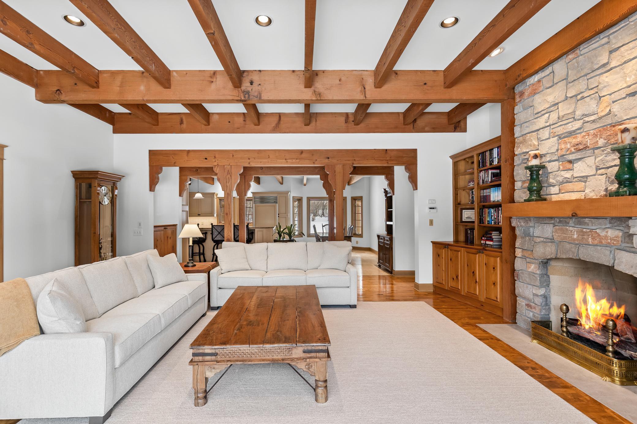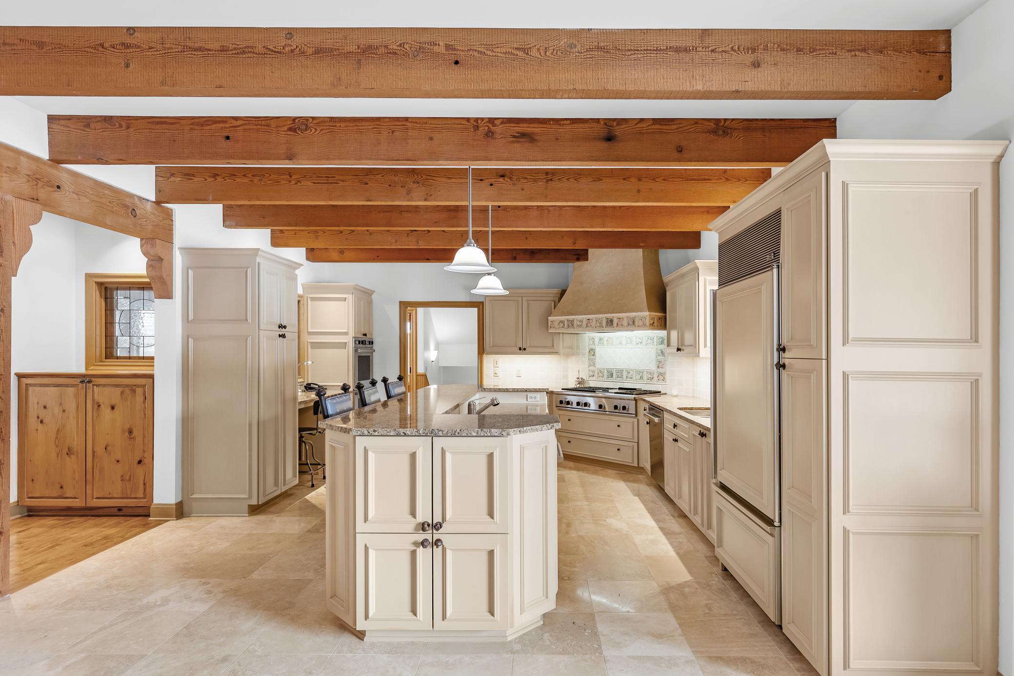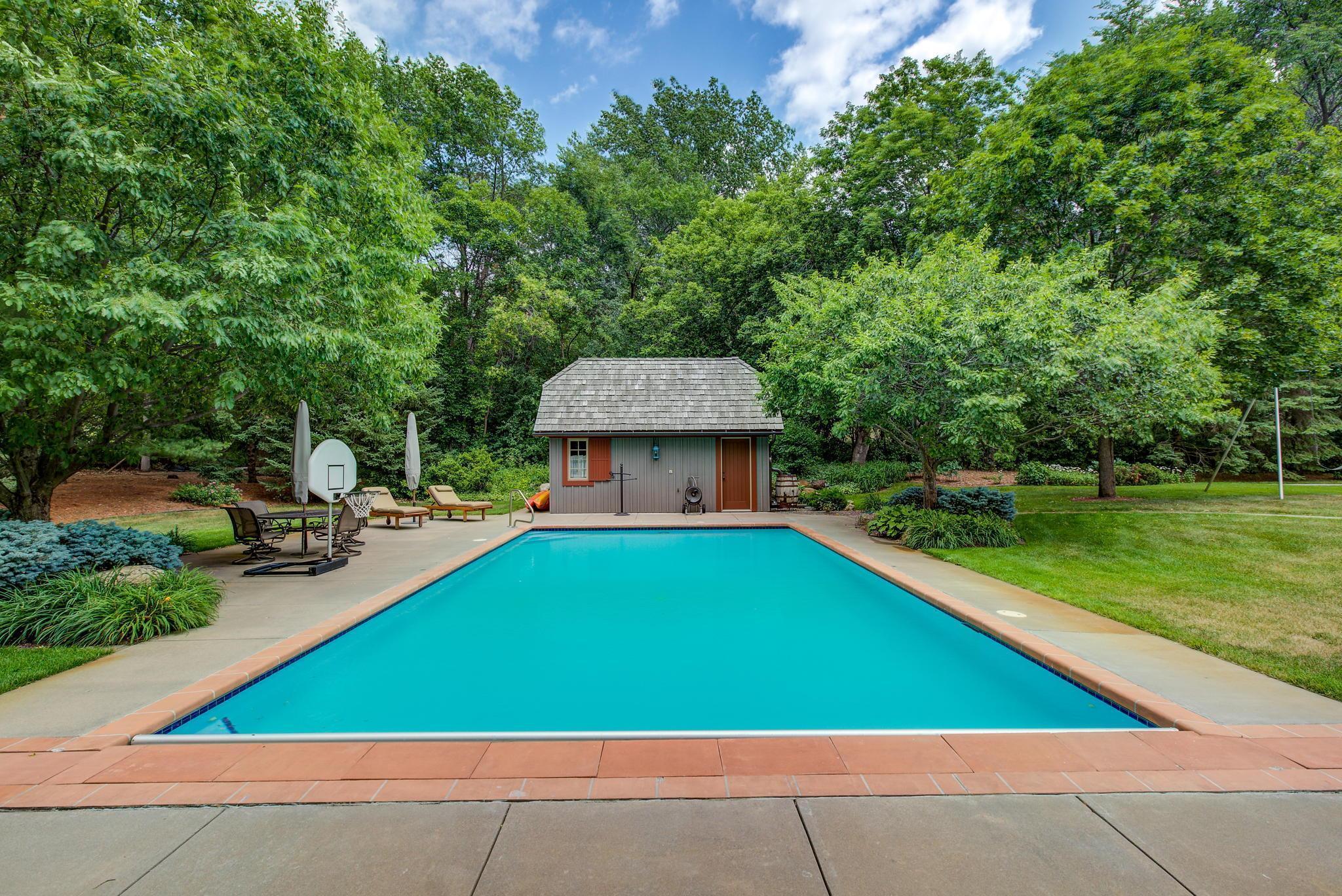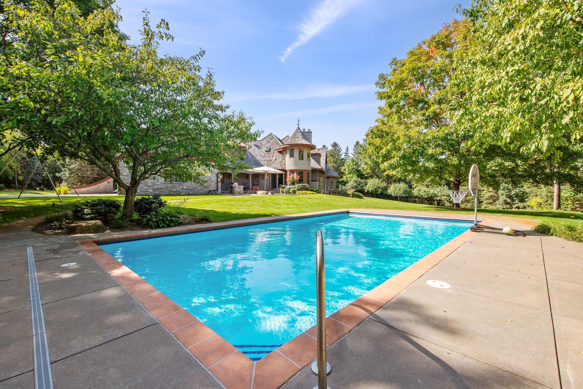 Privately tucked away at the end of a serene drive just minutes from Wayzata, this extraordinary one-owner estate rests on two breathtaking acres of level lawns, gardens, and storybook grounds. Custom built by Erotas and meticulously maintained, the residence offers over 10,000 square feet of timeless craftsmanship, architectural intention, and exceptional livability including 5+ bedrooms and 7 baths. Soaring ceilings adorned with hand-hewn beams crafted from reclaimed Lake Superior timber create warmth, scale, and a sense of enduring artistry throughout the home. Sunlight pours through expansive windows, revealing peaceful views from nearly every room and seamlessly connecting elegant interiors to the stunning landscape beyond. The main-level owner's suite is a true private retreat, featuring heated floors, steam shower, fireplace, private deck, and an expansive walk-in dressing space. Designed for both refined daily living and unforgettable entertaining, the home showcases an incredible, highly functional floor plan with dual staircases, elevator access, two laundry rooms, and beautifully flowing gathering spaces anchored by a chef’s kitchen with exceptional pantry, spacious rear entry, and custom lockers. Recreation and wellness are elevated with an indoor sport court and viewing area, dedicated workout studio, sauna, game and media spaces, and a walkout lower level with fireplace and wet bar. Outdoors, a resort-style pool and charming pool house with ¾ bath create a secluded summer sanctuary, complemented by multiple patios, grilling terrace, and the remarkable privacy of the surrounding grounds. Upper-level bedrooms each offer distinctive architectural character—including a dramatic two-story suite with lofted study, a turreted bedroom retreat, and generous bonus spaces with potential for additional bedrooms or baths. Heated floors, exquisite millwork, and uncompromising quality speak throughout. A heated four-car garage completes this rare offering—an estate where privacy, craftsmanship, recreation, and natural beauty converge just moments from the heart of Wayzata.