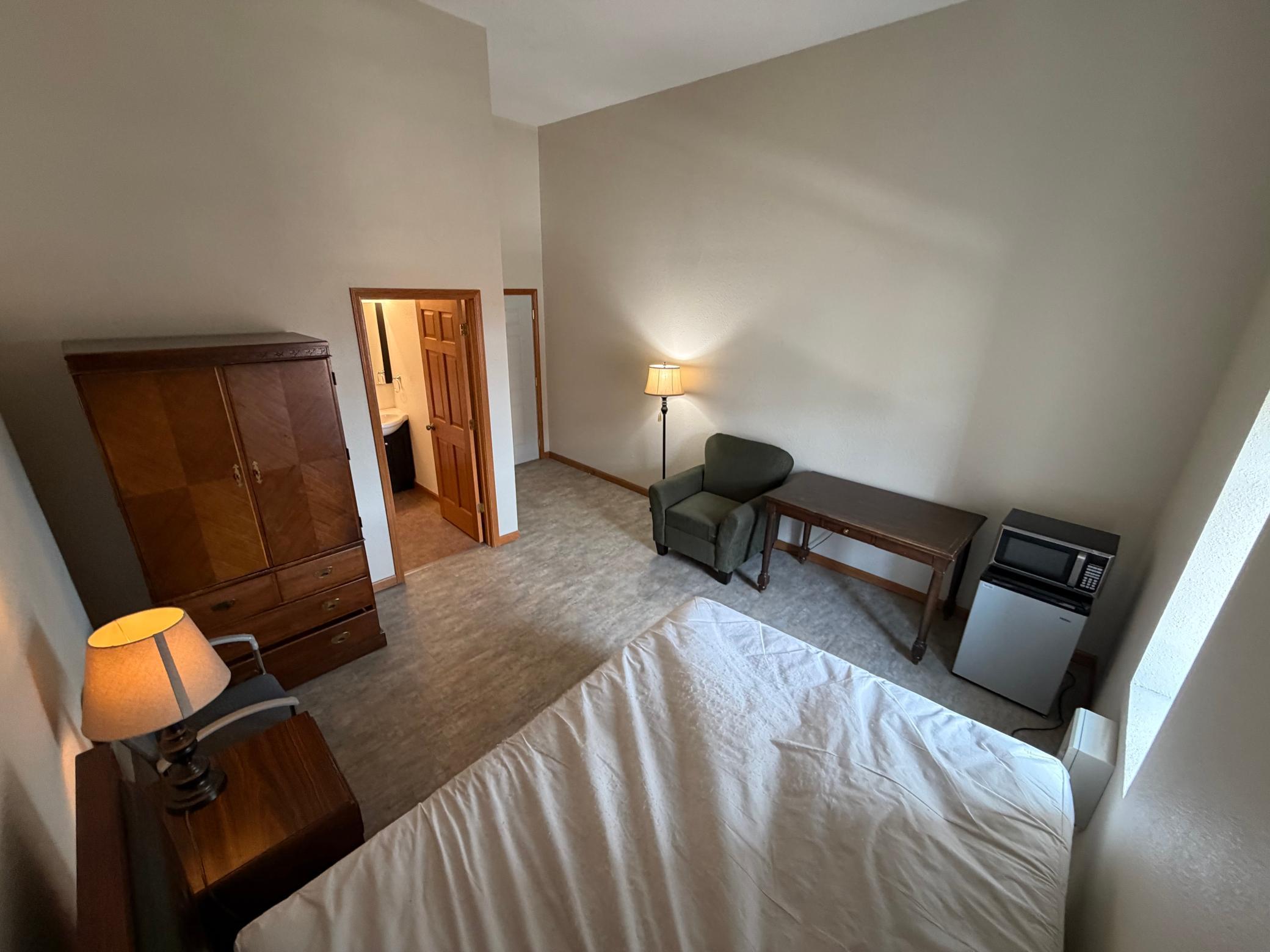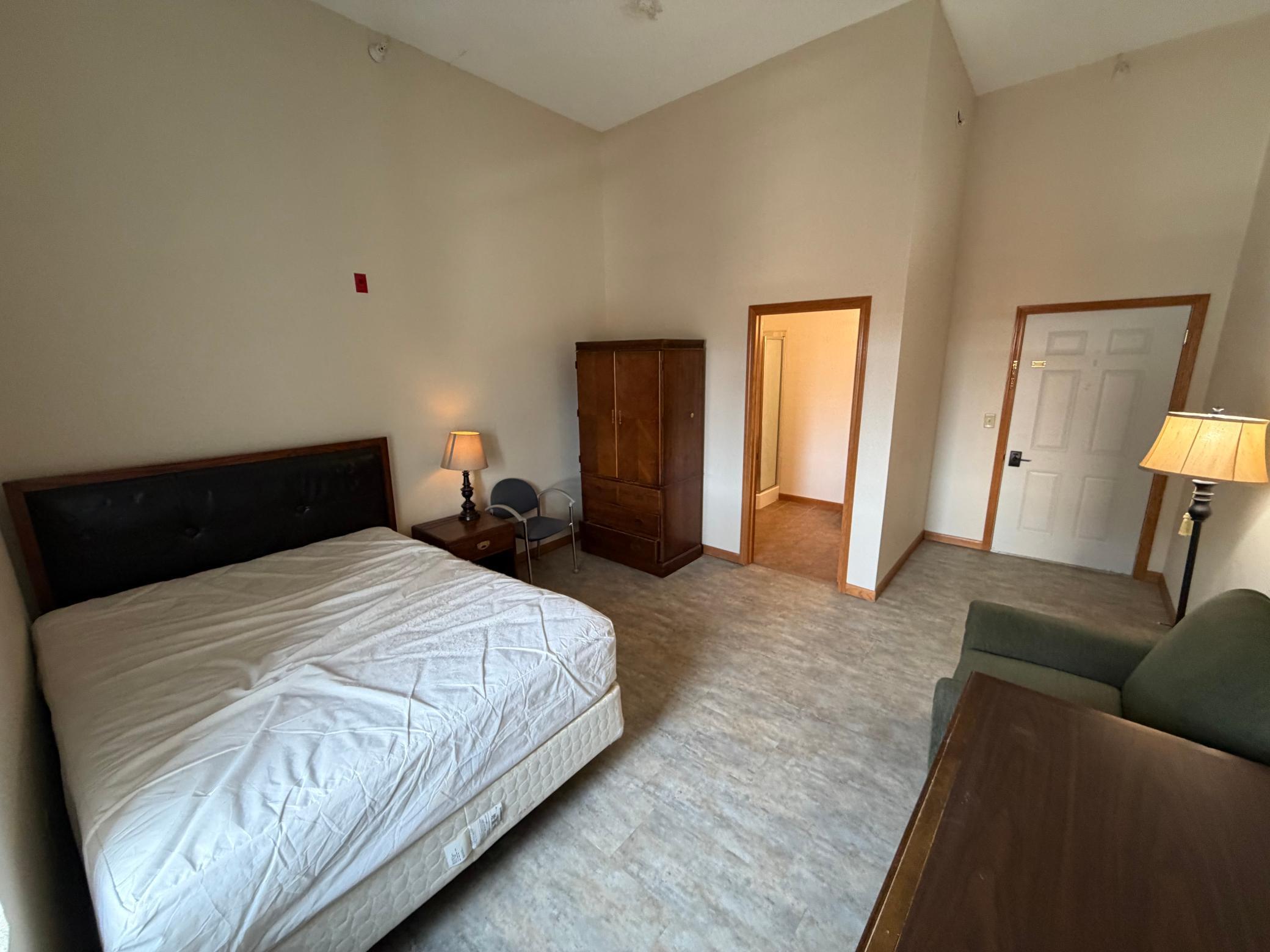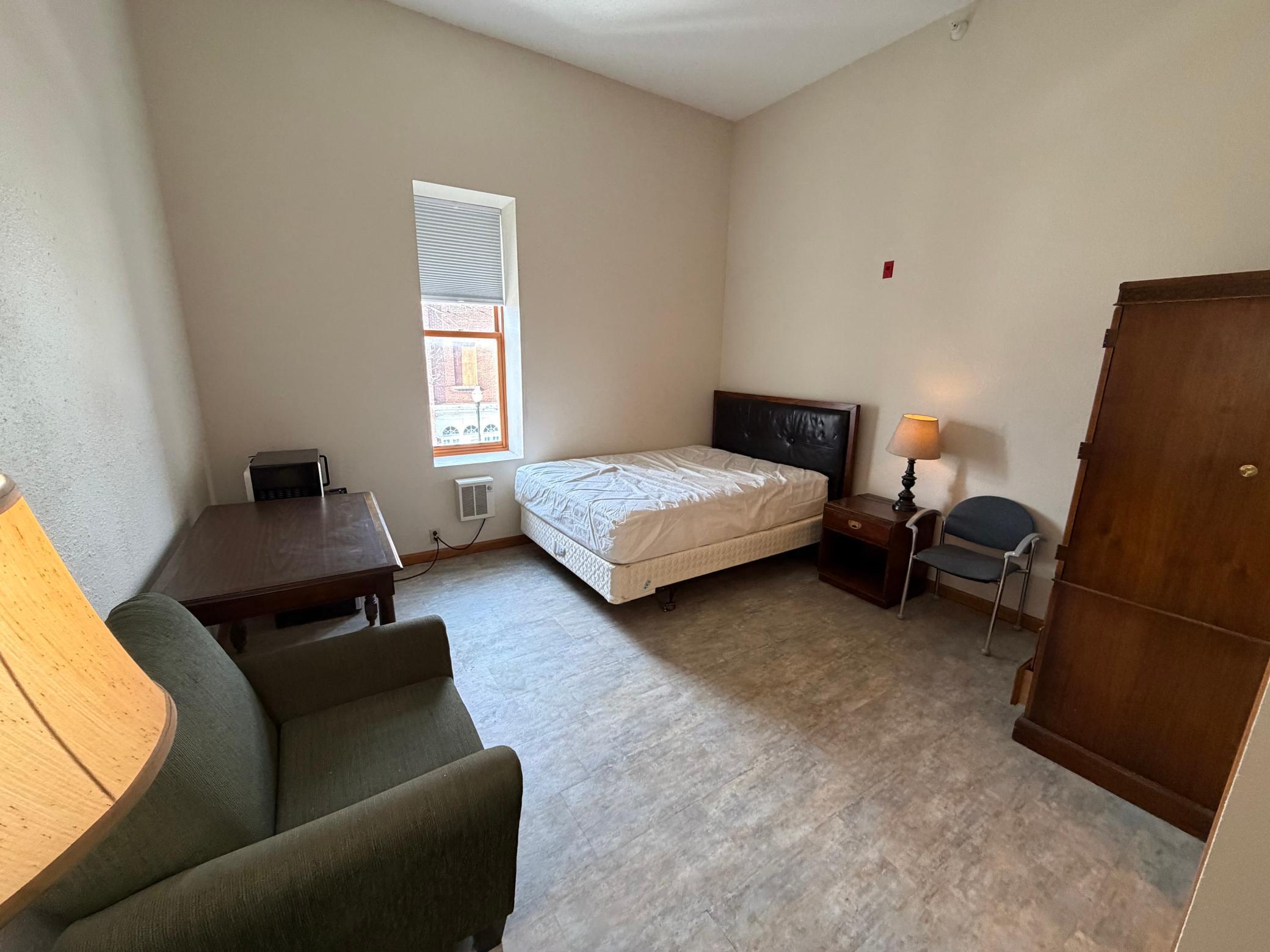 Centrally located downtown. Features several types of dwelling spaces. This ensuite listing is a studio bedroom with private 3/4 bathroom. Dorm style dwelling. The layout includes one spacious bedroom and one 3/4 bathroom. Large window provides natural light enhancing the overall ambiance of the space. All utilities included plus trash service and wifi... Available short or long term. Enjoy a small fridge and microwave provided and supply yourself with a hot plate or air fryer and such type appliances for your culinary needs. Common shared kitchen suggestive of the dormitory-style arrangement. Coin operated laundry on site. Call to schedule your private viewing and complete an application today.
