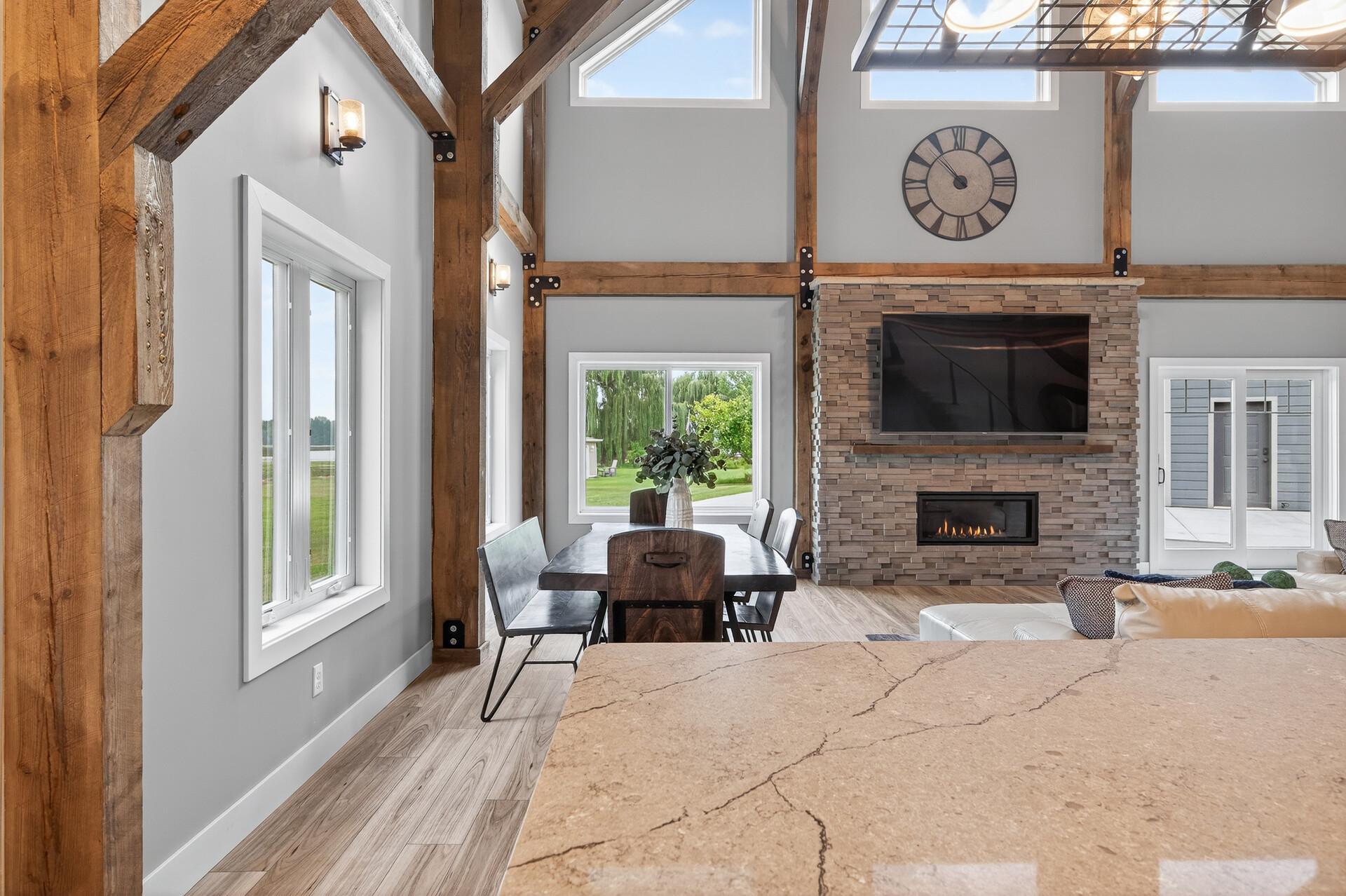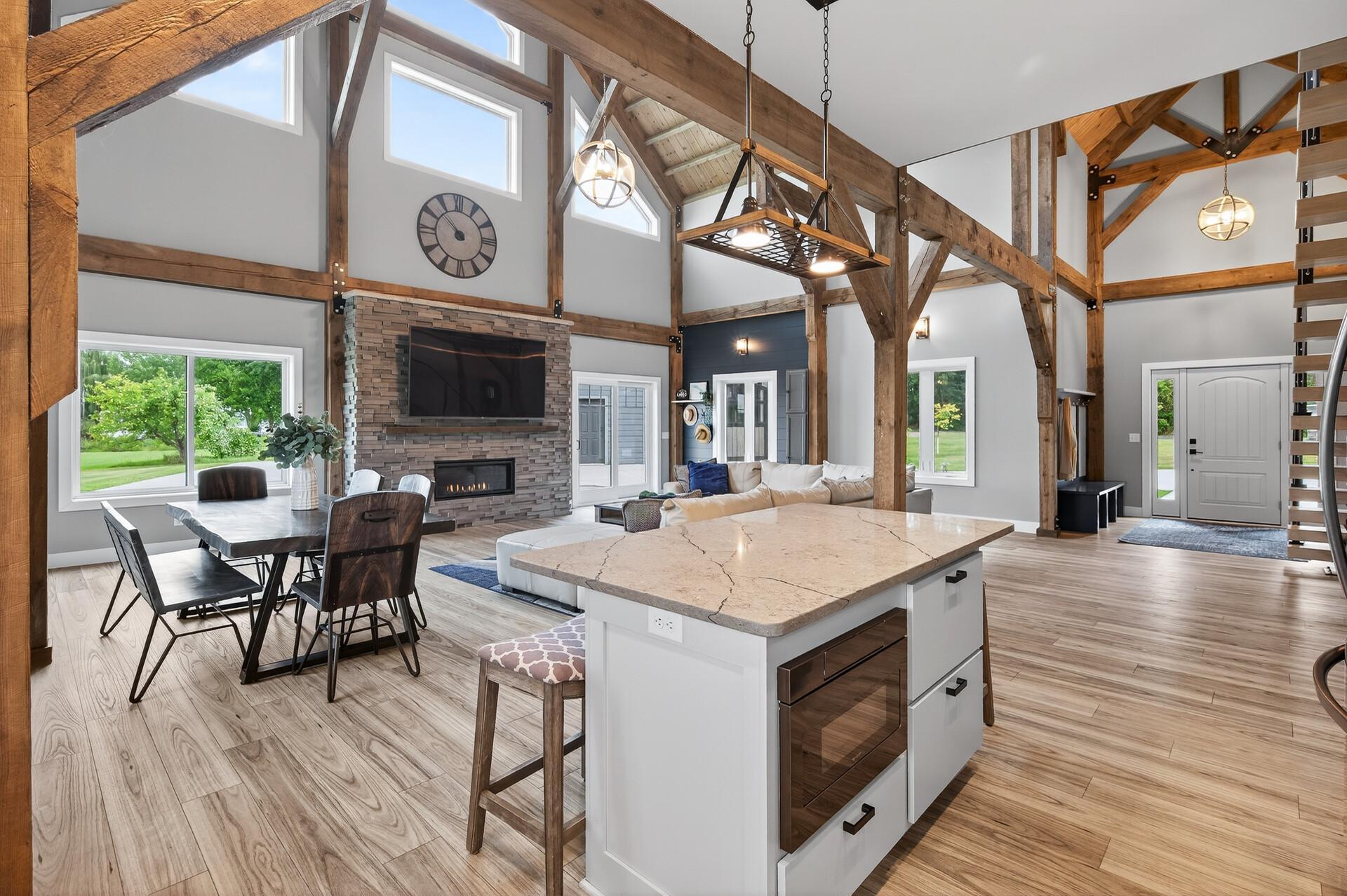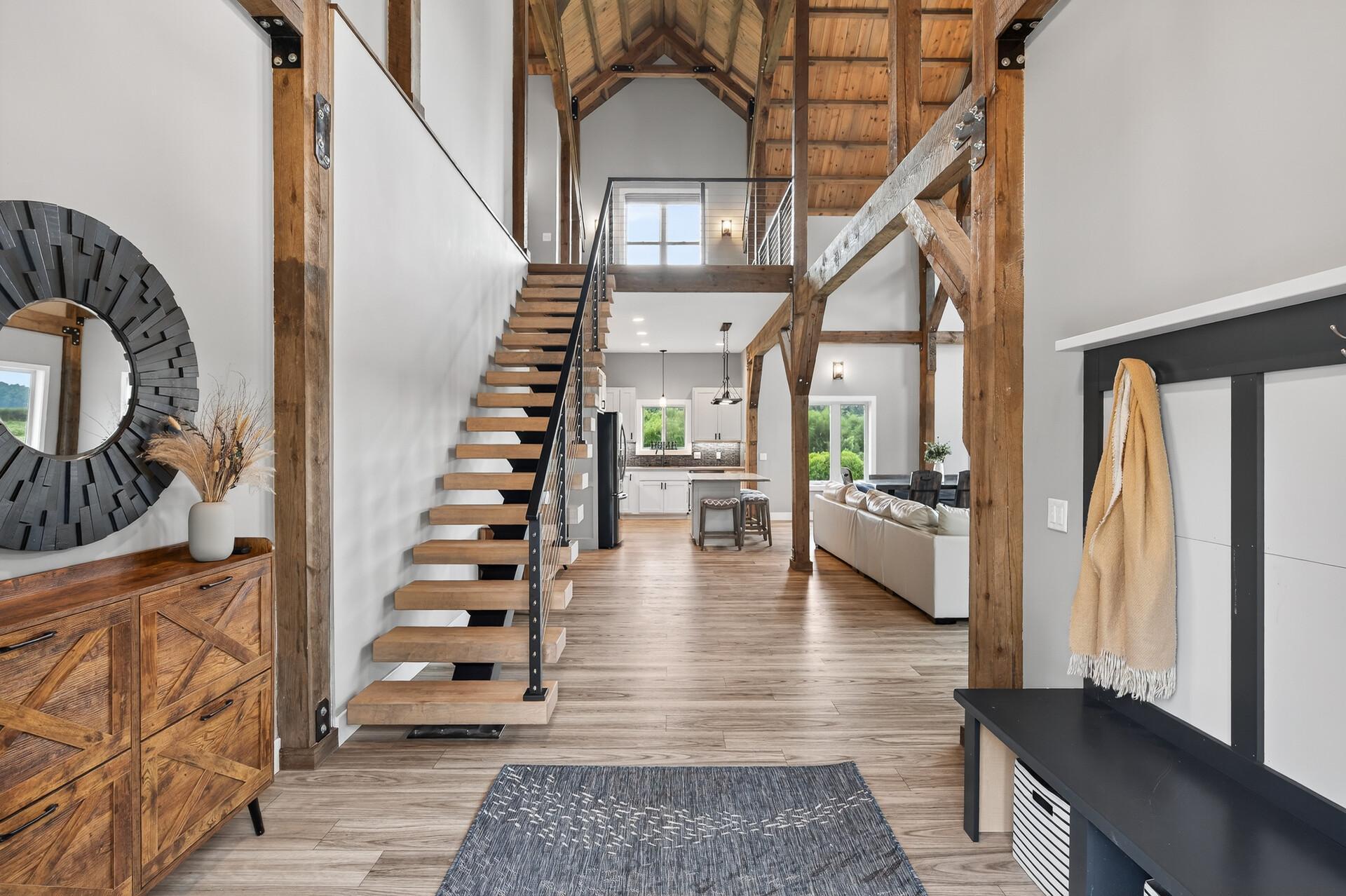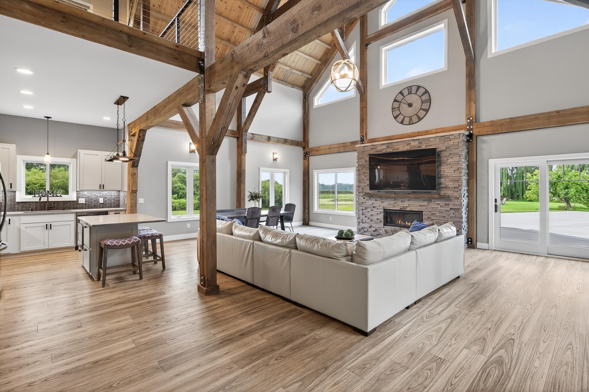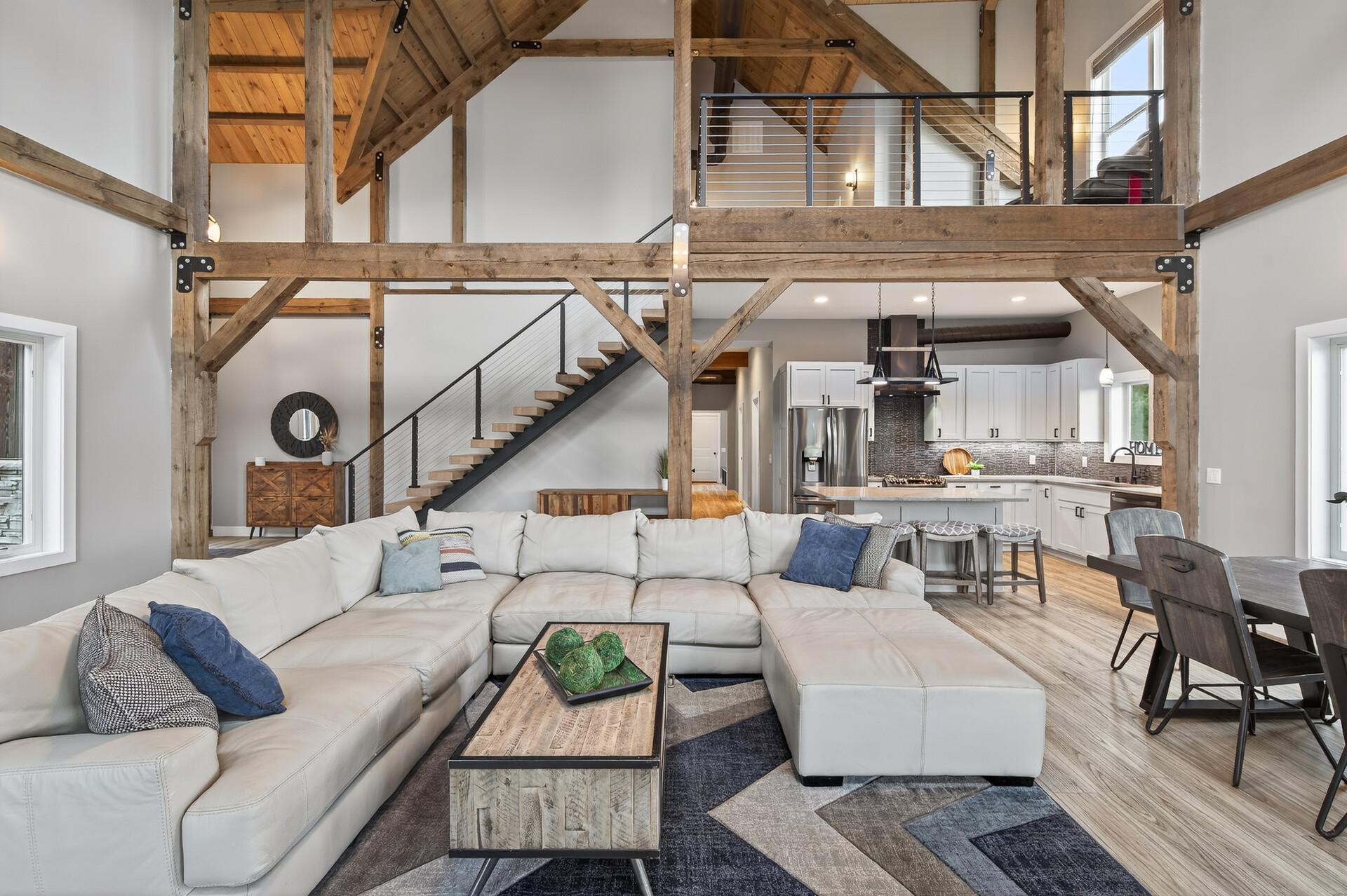 Built in 2020, this custom-designed lake home features a light, bright, open floor plan with main-level living and high-end finishes throughout. Highlights include Andersen windows, prefinished Hardie Board siding, soaring 32-foot post-and-beam natural cedar ceilings, a striking floating staircase, and a beautiful stone gas fireplace.