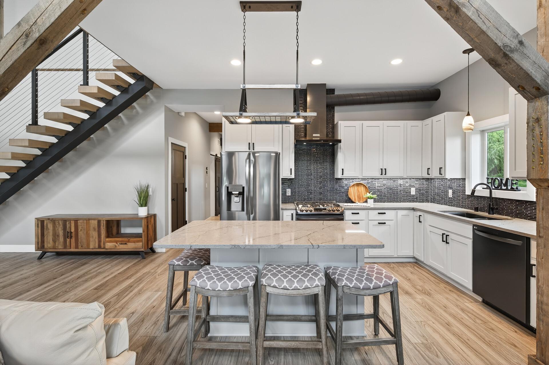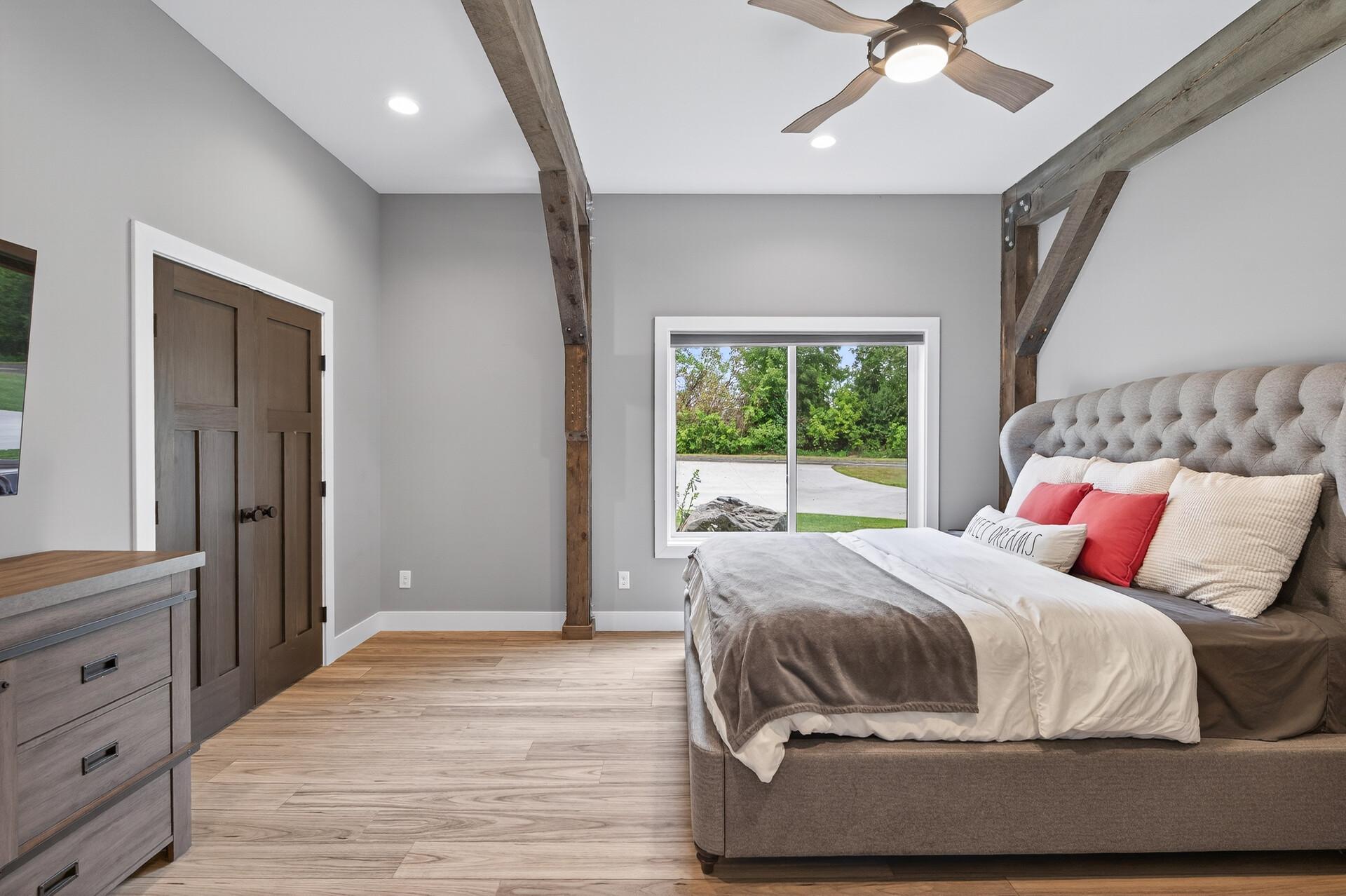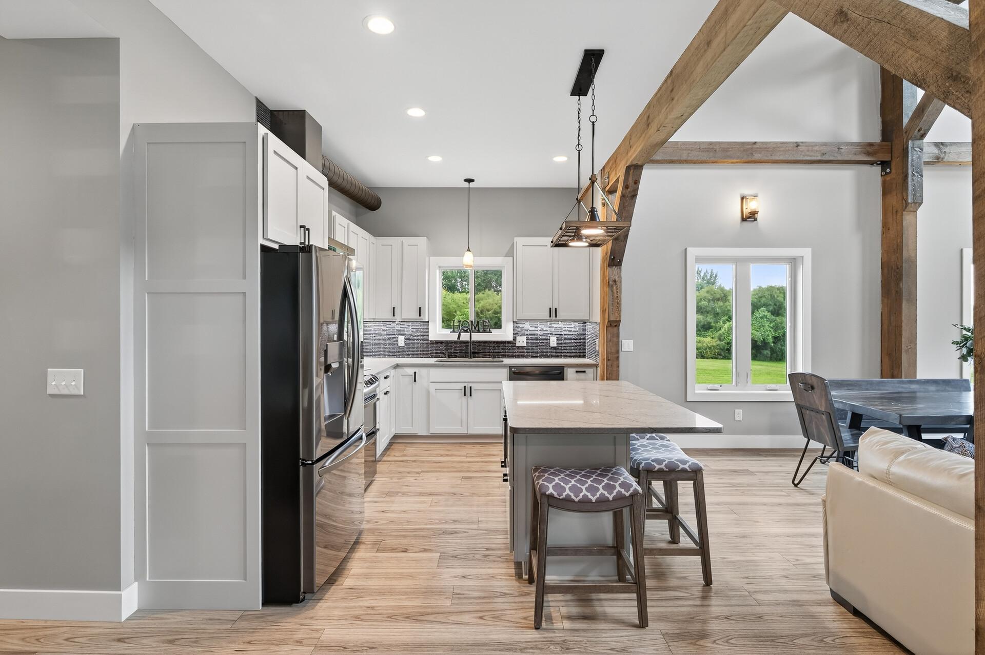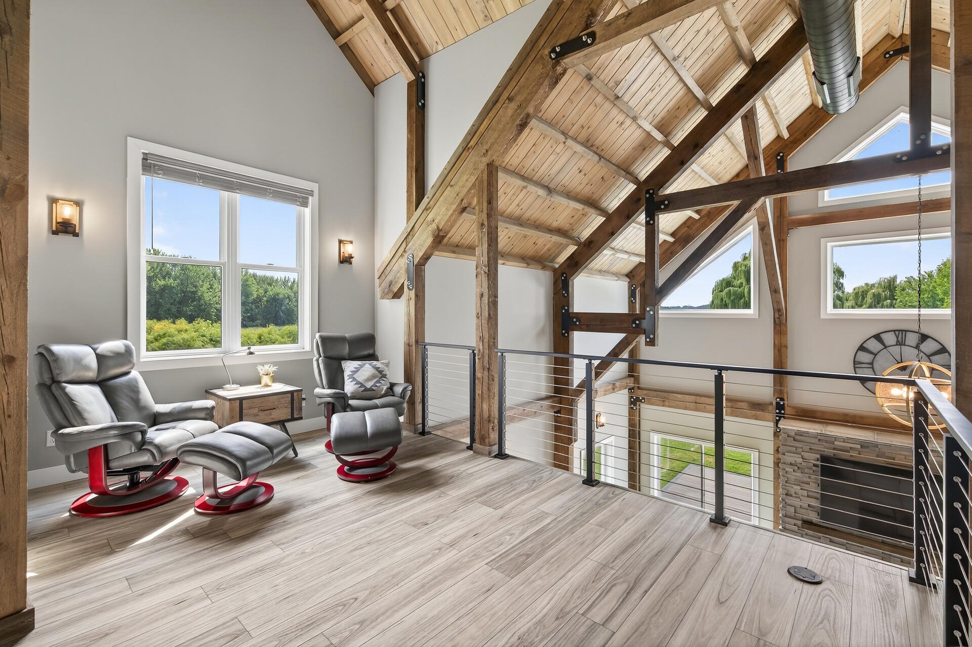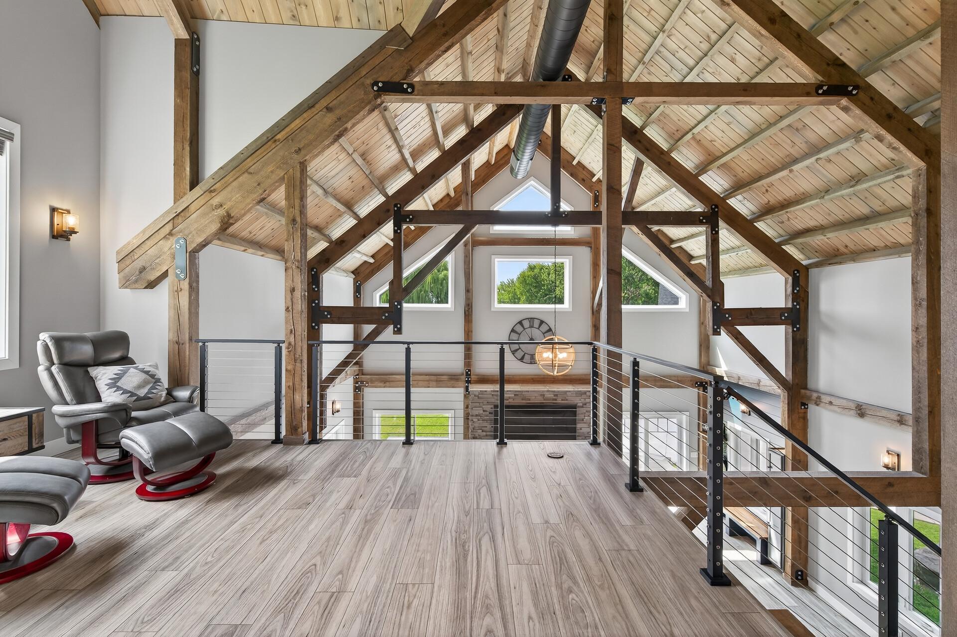Built in 2020, this custom-designed lake home features a light, bright, open floor plan with main-level living and high-end finishes throughout. Highlights include Andersen windows, prefinished Hardie Board siding, soaring 32-foot post-and-beam natural cedar ceilings, a striking floating staircase, and a beautiful stone gas fireplace.