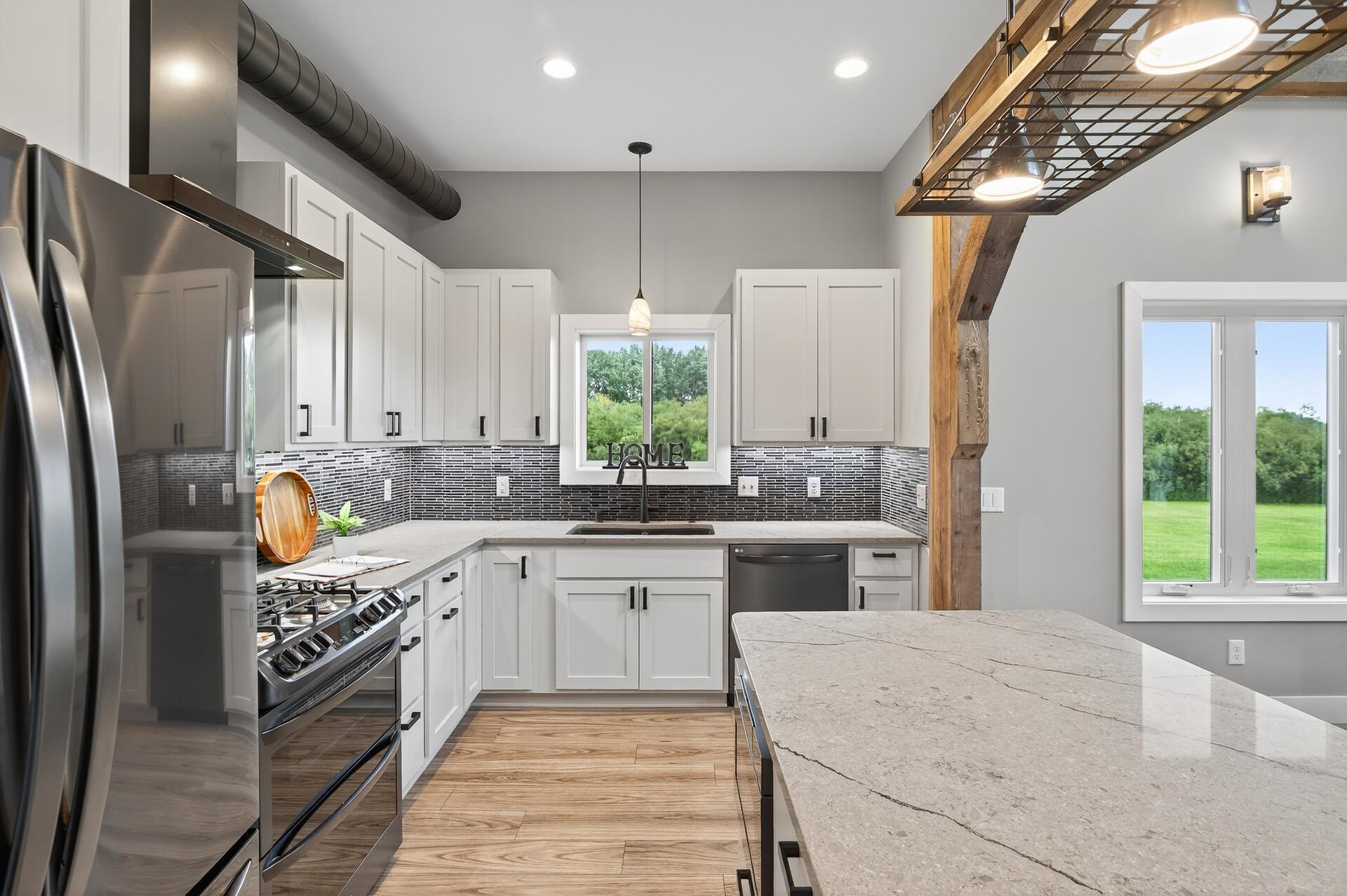 The kitchen is finished with quartz countertops, dark stainless LG appliances, and a gas range, perfect for everyday living and entertaining.