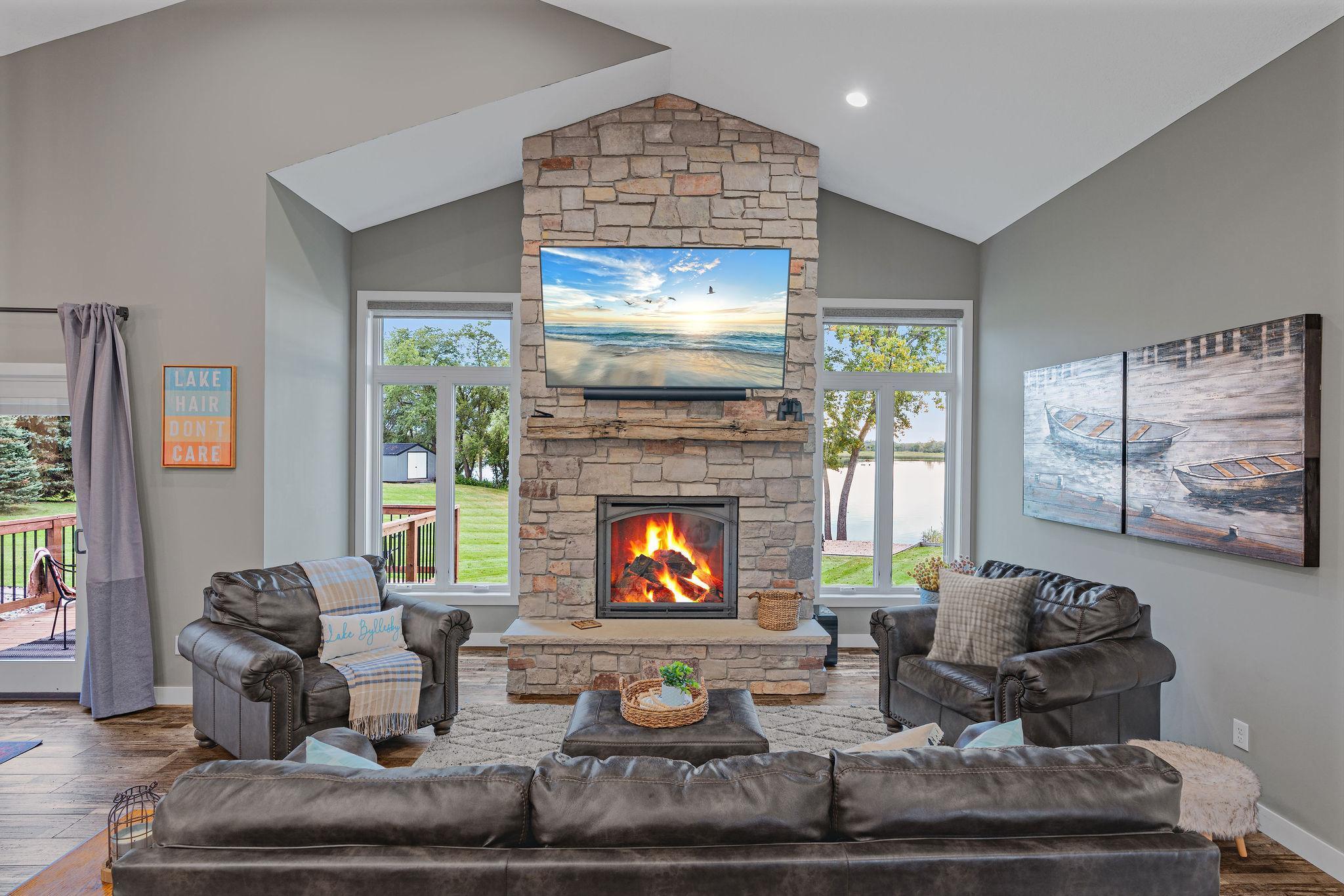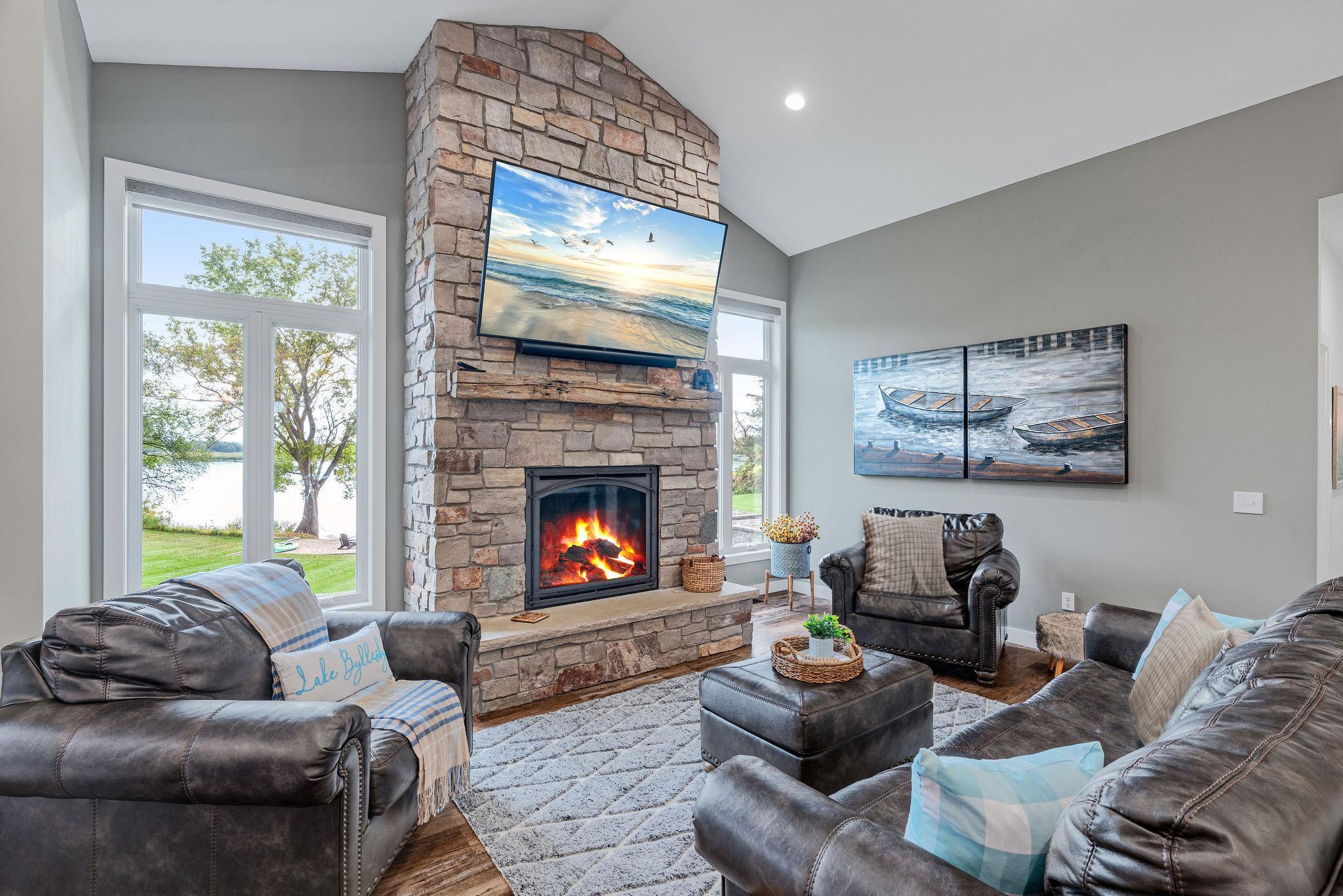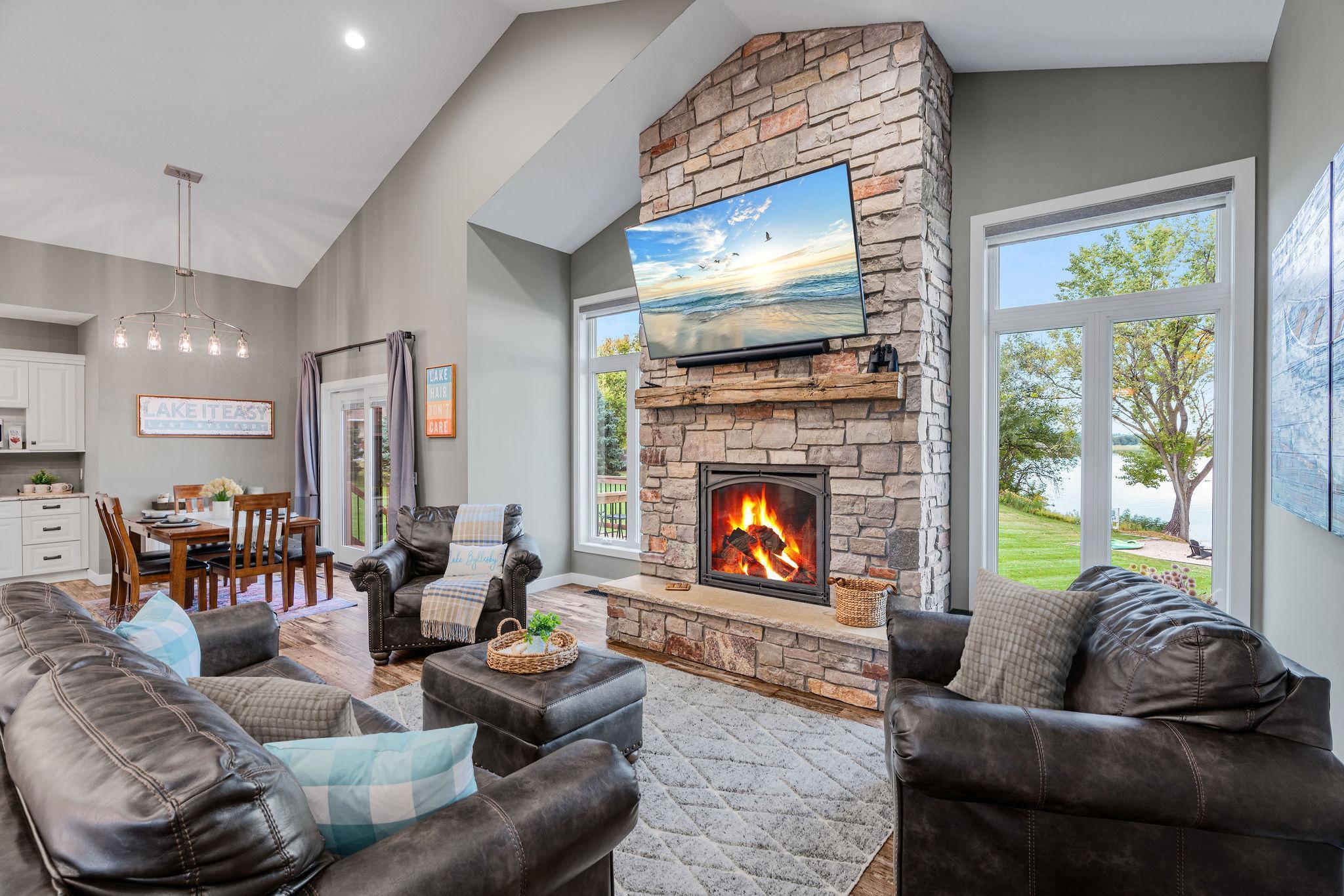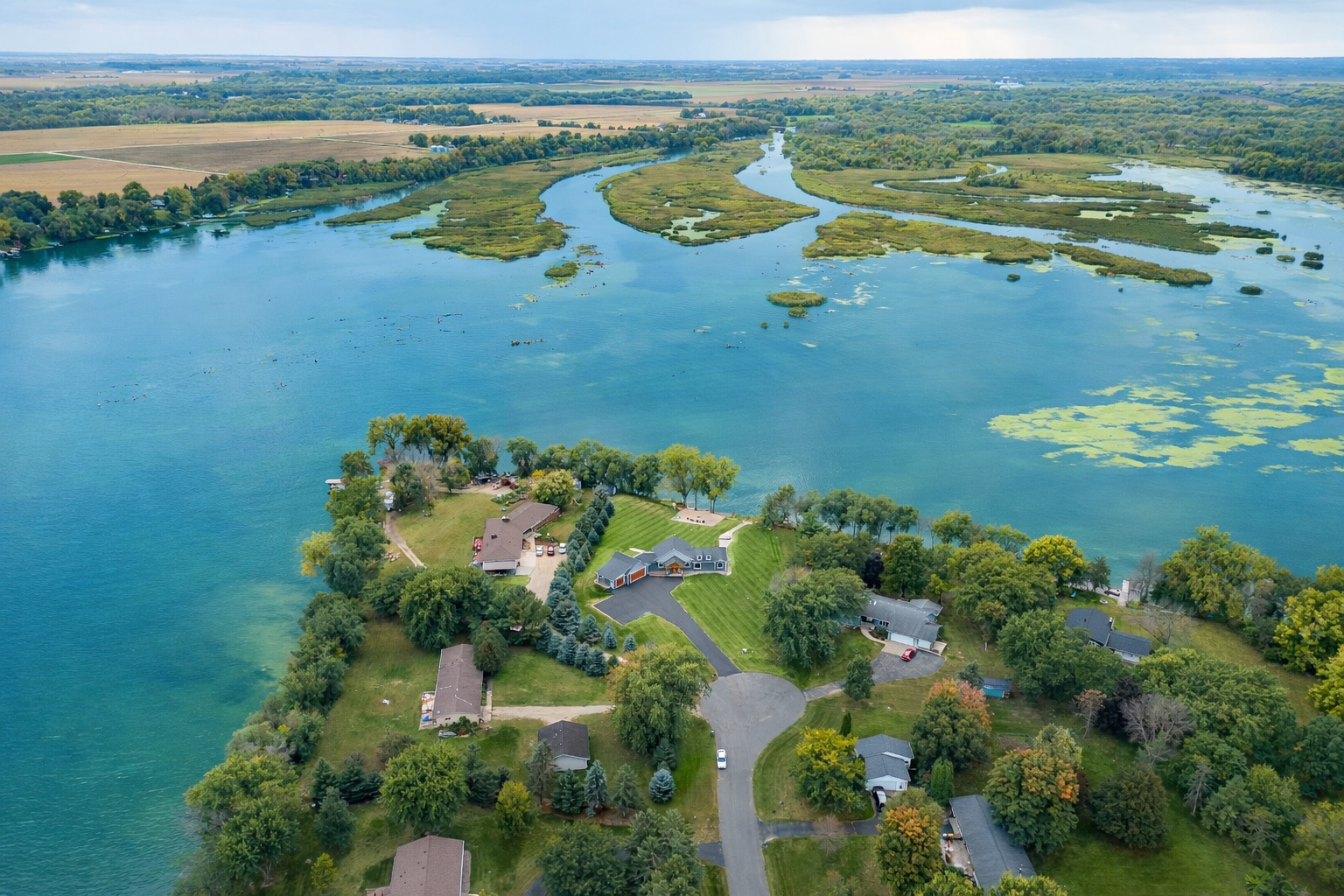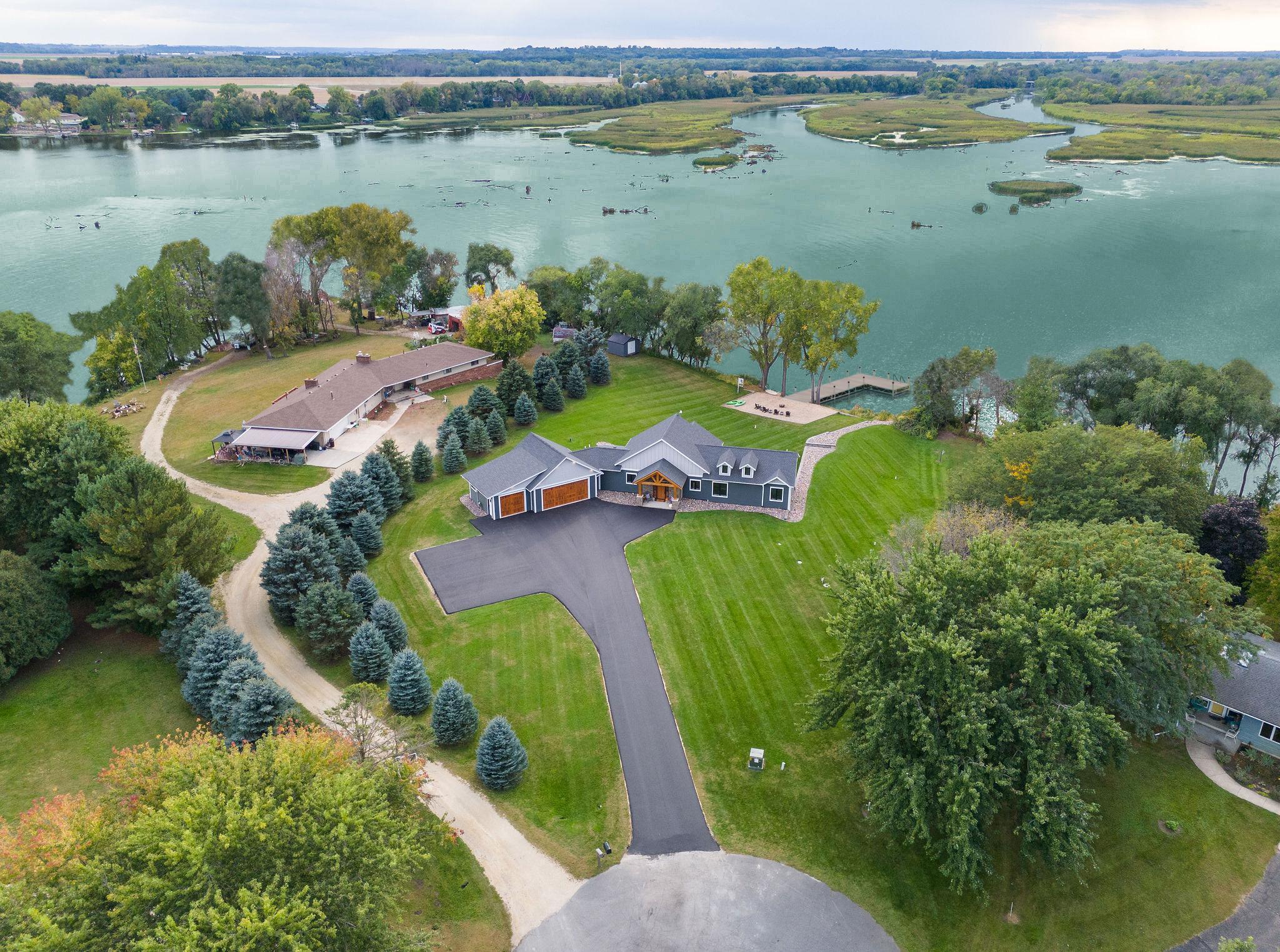 PRIVACY. PANORAMA. PENINSULA. Your Once-in-a-Generation Retreat. A peninsula setting is rare. Combine it with 1.5 acres of privacy, a near-new build, and 212 feet of west-facing, exceptionally level shoreline, and you’ve found the impossible. Claiming the premier seat on a coveted point of Lake Byllesby, this sanctuary delivers seclusion and distinction. Cradled by a natural alluvial delta, this retreat offers a quiet, secluded, island-like feel. Privacy like this rarely comes along. This rare stretch of shoreline faces calm, protected waters. Two tiers of lawn—one at walkout level to the lake—frame the water in an amphitheater panorama. Tucked on a quiet cul-de-sac, this Craftsman-inspired ranch commands attention with stately gabled rooflines & timeless dormers. A timber-framed stone entry creates a welcoming focal point, with architectural lighting illuminating the home against the evening sky. A newly paved drive sets a striking tone, with designated guest parking for effortless hospitality. Step inside to the allure of new construction with the immaculate finish of a showcase home. A breathtaking open layout soars beneath 14-foot vaulted ceilings, anchored by a stone fireplace with a hand-hewn barnwood mantel. The oversized quartz island seats six—perfect for everything from pancake breakfasts to wine-&-charcuterie nights—while a built-in coffee bar adds the indulgence of a café at home. Just steps away, a walk-in pantry keeps the kitchen clutter-free. Neutral grays & warm tones ground the design, while crisp whites & soft blues reflect the shimmer of water. Lakeside windows treat you to a front-row seat as each season paints a fresh masterpiece. The primary suite is a serene sanctuary with a private bath—a personal escape with a luxurious soaking tub and a separate walk-in tiled shower. The freshly finished lower level showcases nearly 9-foot ceilings, a sprawling family room, bedrooms, and a half bath—plus heated floors, a walkout, and a flexible space for fitness or hobbies. Plumbing is also roughed-in for an additional full bath. The attached 3-car garage offers in-floor heat & expansive space for vehicles and lake essentials. Technology here rivals the luxury of the setting, with infrastructure rarely found in residential homes. A commercial-grade wired panel with a professional mesh Wi-Fi system delivers seamless internet throughout—eliminating dead zones and combining wired-speed reliability with wireless convenience. Every bedroom is hard-wired with Ethernet for instant, buffer-free streaming. A Sonos whole-home surround sound system completes the experience with immersive audio for movies or music. Comfort is elevated with an ICF foundation, spray-foam insulation, and James Hardie siding—all working together for energy efficiency, sound insulation, and all-season comfort. Excellence extends beyond the finishes into the very bones of the property, with a state-of-the-art septic system, a high-performance well, and a parcel configuration that delivers a rare tax advantage. Be sure to request the property brochure for full details on these extraordinary upgrades. Outdoors, the lake takes center stage. Sweeping, tiered grounds unfold toward the shoreline, where 115 feet of dramatic, lighted stonework and illuminated steps ascend from the lower lawn to the upper terrace. A sandy beach invites barefoot evenings around the fire pit—feel the sugary sand between your toes as you savor s’mores under the stars. The shoreline is well-suited for a dock tailored to your lifestyle. The setting is extraordinary—your own private haven, yet expansive enough for an ethereal wedding or celebrations with 100 of your closest friends. From the backyard, you’re treated to glimpses of a rare alluvial habitat teeming with pelicans, herons, egrets, & ducks, while otters, beavers, & eagles make regular appearances. This is life most only dream of—where creamsicle sunsets melt into the water. It’s more than rare—it’s unrivaled. OOH LA LUXE.