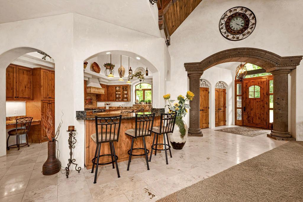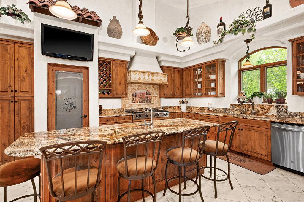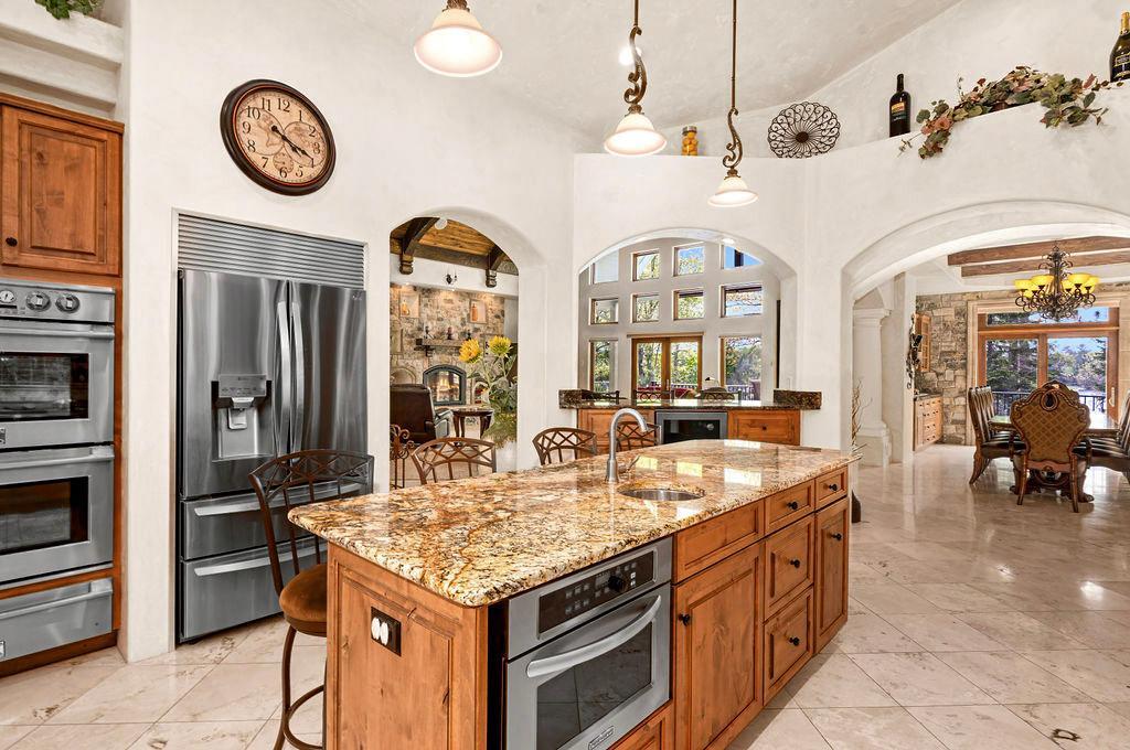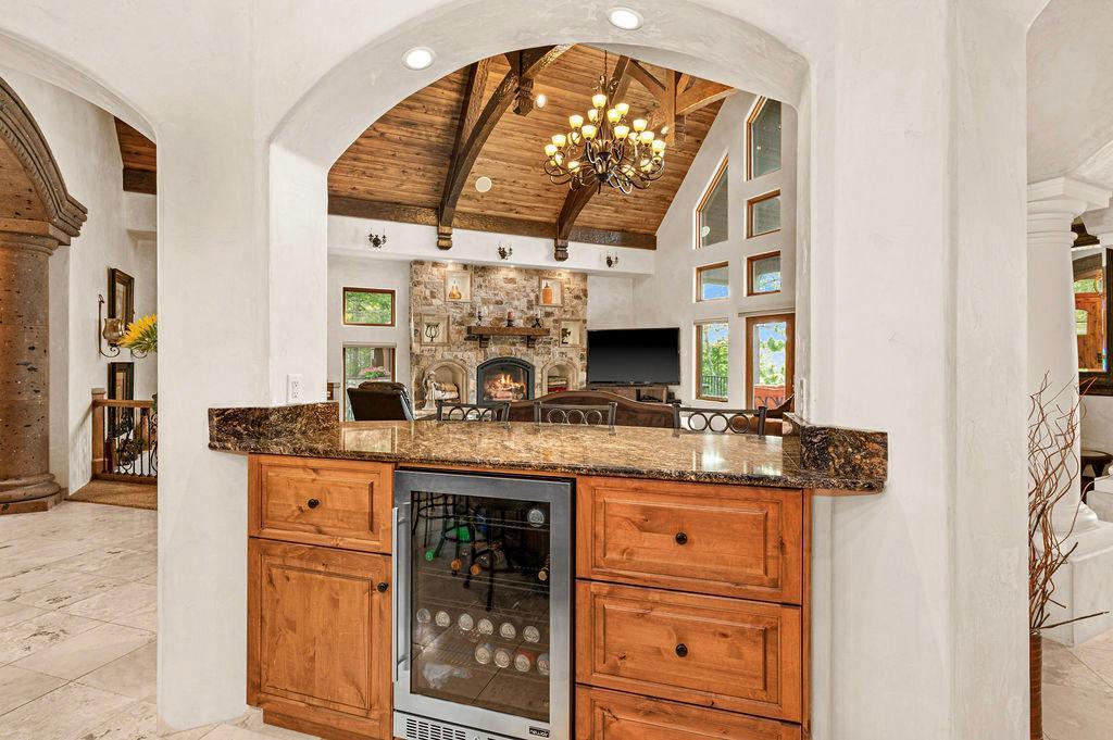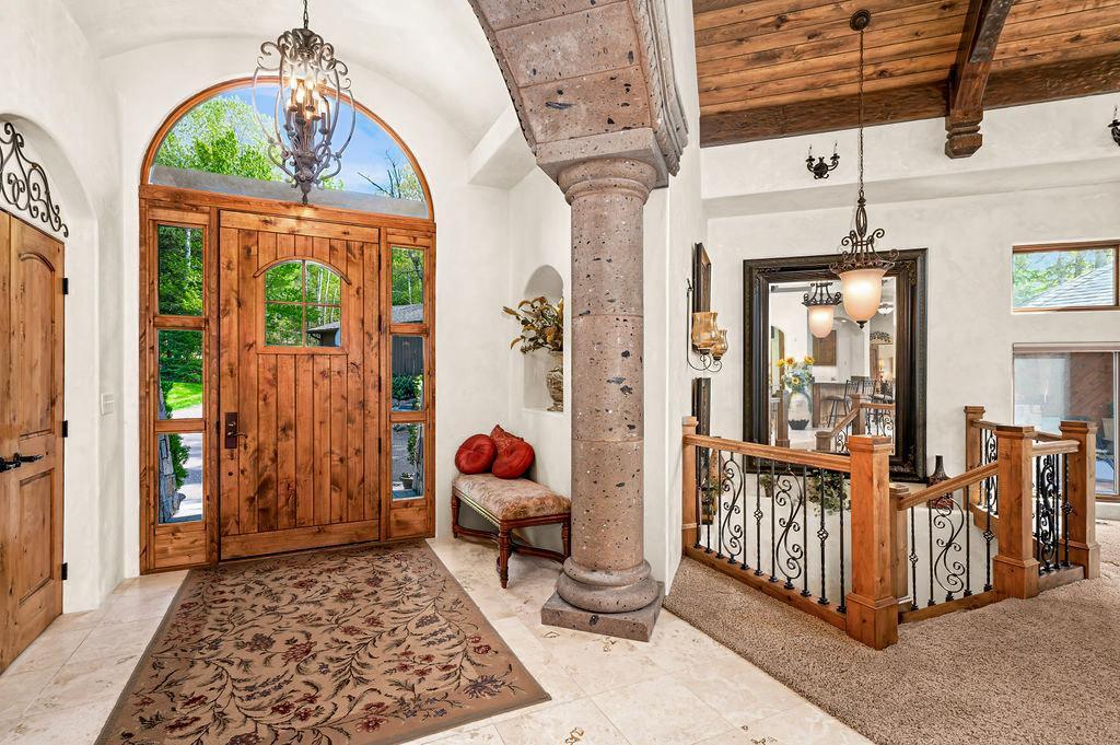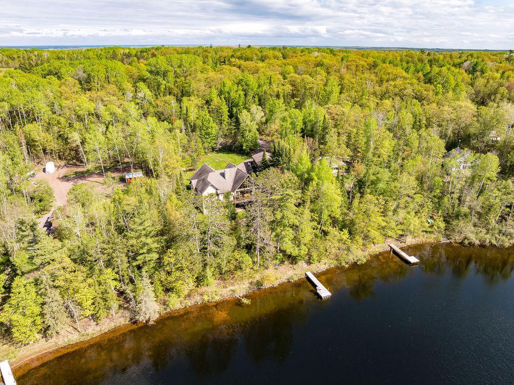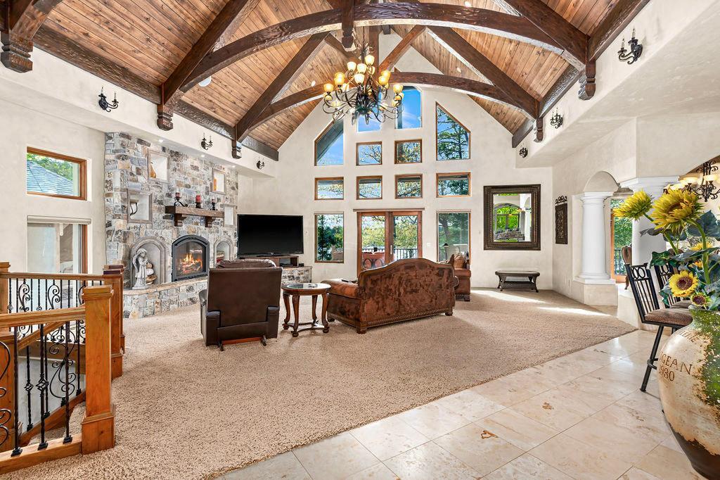 Welcome to Little Hanging Horn Lake! Step into this lakeside home with unique Italian contemporary design throughout. High vaulted ceilings with wood beams create an inviting ambiance, while stone archways add a touch of rustic charm. This stunning home boasts 4 bedrooms and 3 baths, including a main floor primary bedroom suite and custom walk-in closet with main floor laundry. Enjoy a cup of coffee on your bedroom balcony, soaking in breathtaking views of the lake. Cozy up with three gas fireplaces, including one in the primary bedroom suite and another in the bathroom, adding warmth and elegance to your personal retreat.