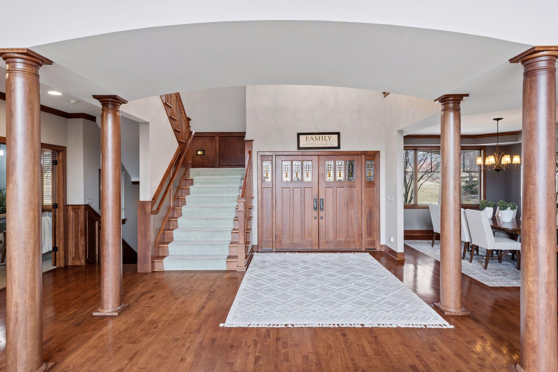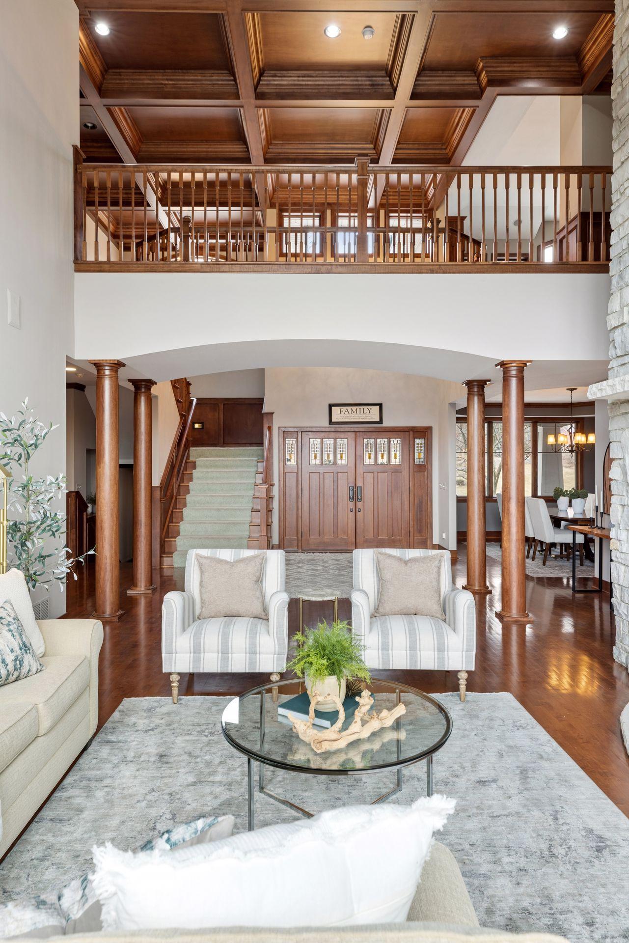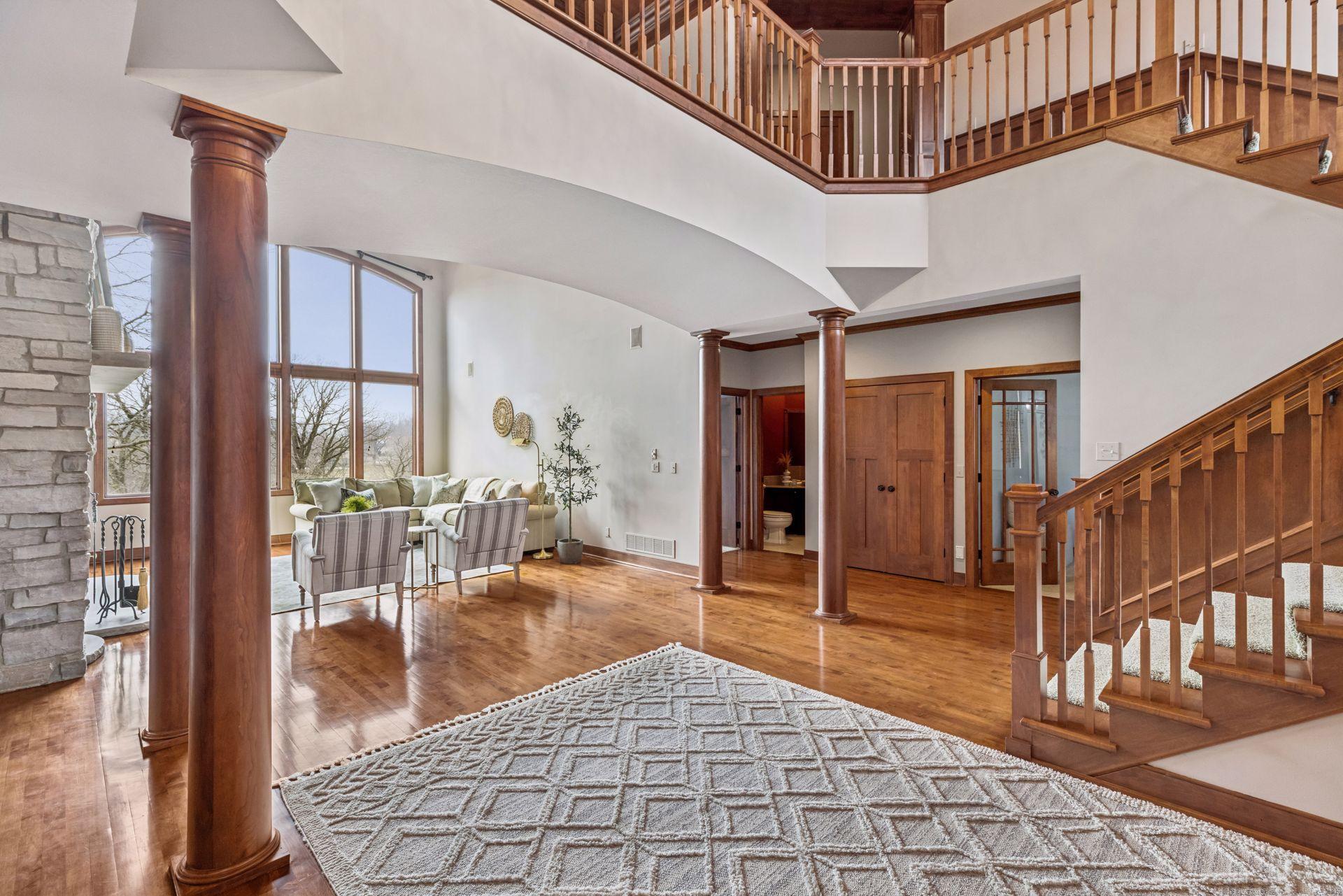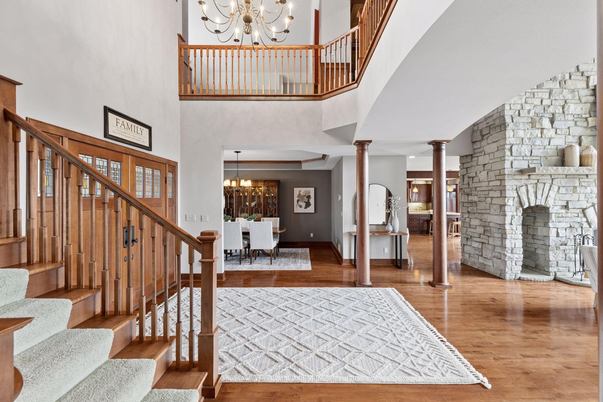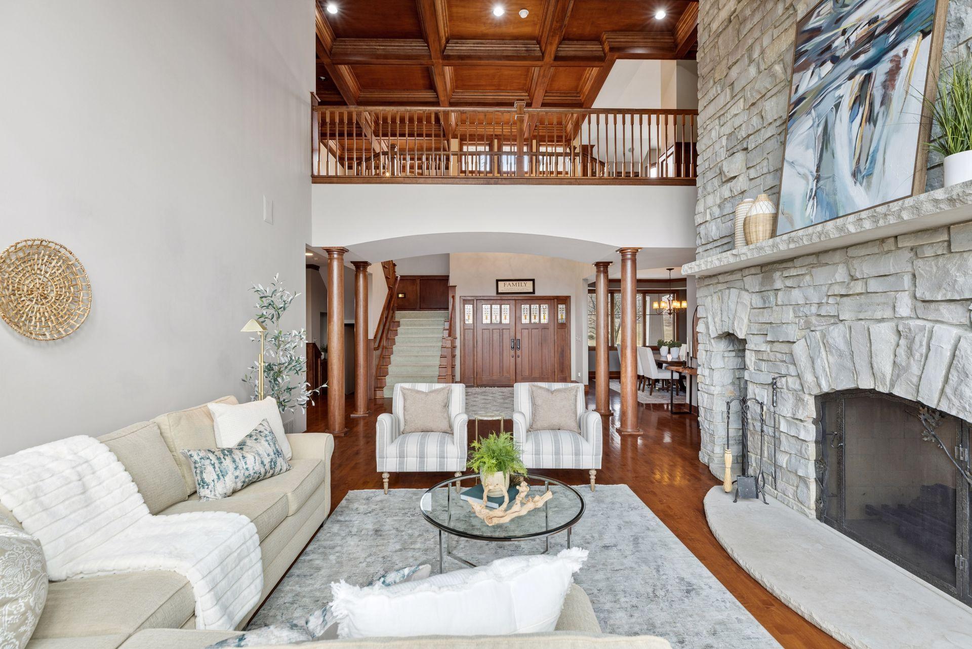 Perfectly positioned on an executive 1.8-acre setting overlooking the Vermillion River, this extraordinary custom residence offers rare privacy, serenity, and breathtaking wooded and wildlife views—an irreplaceable backdrop that feels worlds away, yet effortlessly refined. From the moment you arrive, a circular paver driveway and matching walkway create a grand sense of arrival, setting the tone for the premium craftsmanship and thoughtful design found throughout this remarkable home. Step inside to a stunning two-story foyer and great room, where a dramatic beamed ceiling with layered crown molding commands attention. Floor-to-ceiling Andersen windows frame sweeping natural views, flooding the home with light and connecting every space to the beauty beyond. Rich wood floors span most of the main level, while an authentic floor-to-ceiling real stone, see-through fireplace anchors the living spaces with timeless character and artisan detail. Extensive crown molding throughout further elevates the home’s architectural presence. The gourmet kitchen is designed for both everyday living and elevated entertaining, featuring custom cabinetry, a spacious walk-in pantry, and an inviting hearth room that expands the gathering space—perfect for hosting family and friends. An oversized mudroom impresses with built-in bench seating, cubbies, and paneled wainscoting, blending function with refined style. The main-level primary suite is a true retreat, showcasing a tray-vault ceiling, spa-inspired bath with heated floors, an oversized walk-in shower, and dual walk-in closets—creating a private sanctuary of comfort and luxury. Just off the primary suite, a main-level office offers exceptional flexibility for work, study, or lifestyle needs at every stage of life. Upstairs, dual staircases lead to an expansive loft with a media center and built-in study area, ideal for modern living. The bonus room above the garage—lined in warm knotty pine—creates the perfect gaming or recreation space and even offers direct access to the garage. Each of the four oversized bedrooms functions as a private suite, featuring walk-in closets, sitting areas, and private or adjacent baths. Two bedrooms also include private loft spaces, adding a unique and elevated touch. The walkout lower level with heated floors is an entertainer’s dream. Highlights include a private theater with counter seating, bar area, and reclining theater chairs; a spacious amusement room with wood-burning fireplace and wainscoting; a dedicated game area; a large craft room with island; a non-conforming bedroom or fitness space with additional flex room; and a ¾ bath complete with steam shower. A must-see hockey or sports room completes this exceptional level. Outdoor living is equally impressive with a maintenance-free, multi-level deck, firepit for cool evenings, and expansive views that provide year-round enjoyment. The home features multi-zone heating and cooling, plus an oversized heated four-car garage with epoxy floors—along with an additional four-car garage below, offering incredible space for vehicles, toys, or a workshop. Meticulously maintained and showcasing true pride of ownership, this home represents an exceptional value—one that simply cannot be duplicated at today’s construction costs.