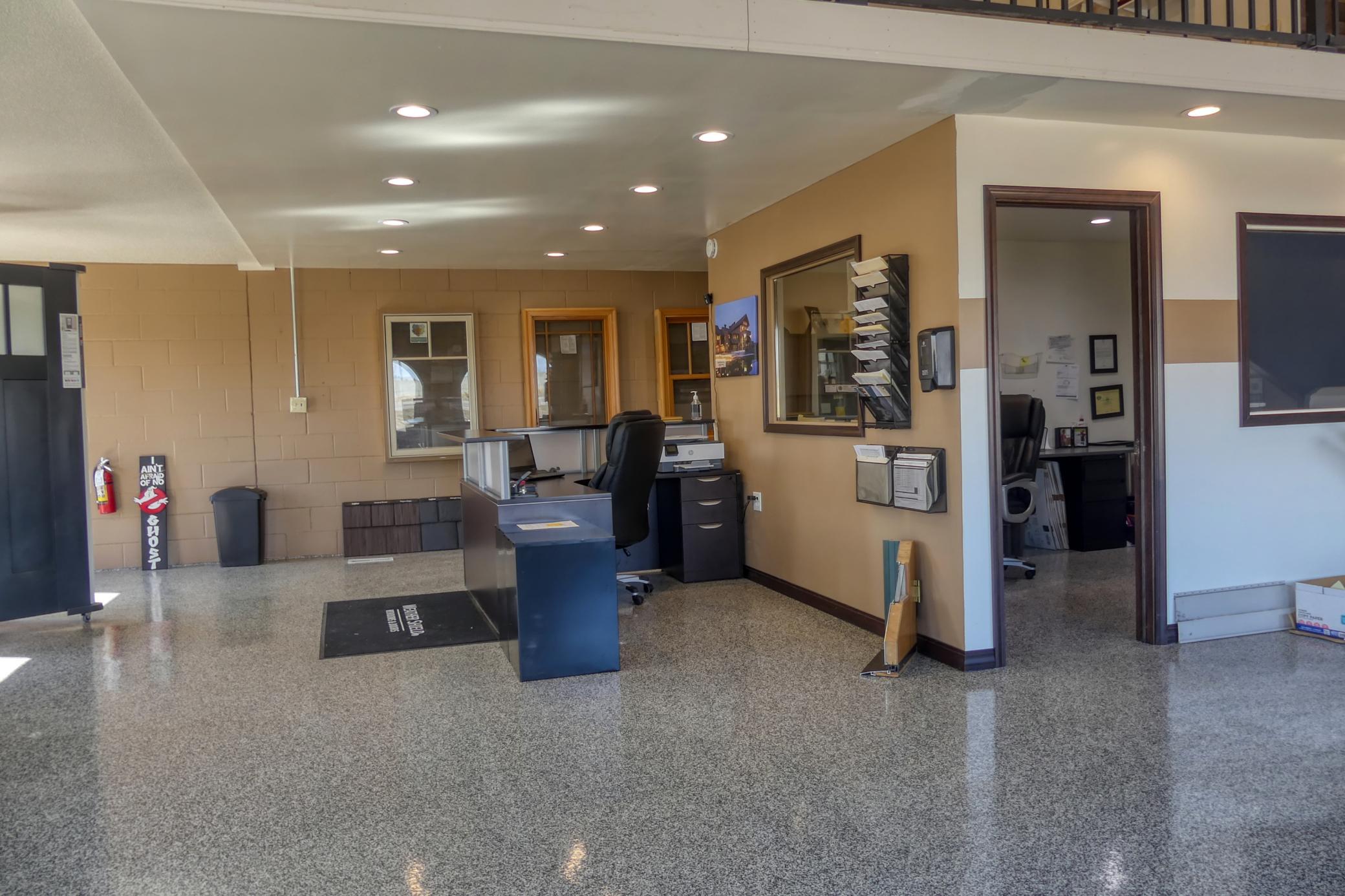 Mixed use building with 5 new 12x14 overhead doors and openers, nearly 5000 sq feet of warehouse/garage space with radiant heat through out, storage racking, mezzanine storage. 2 new forced air AC units and furnaces serve showroom and completely remodeled office space and kitchen. Showroom/sales floor with receptionist desk and 2 customer bathrooms, upper level mezzanine with approx 880 sq ft with office space, bathroom, and a conference room. Prime real estate on Hwy 10 and Armstrong Blvd. with volumes of traffic daily.