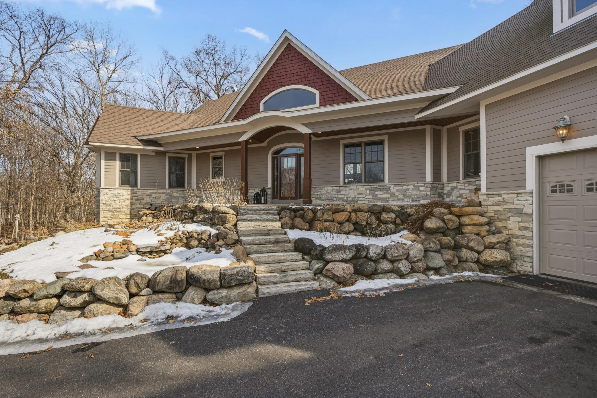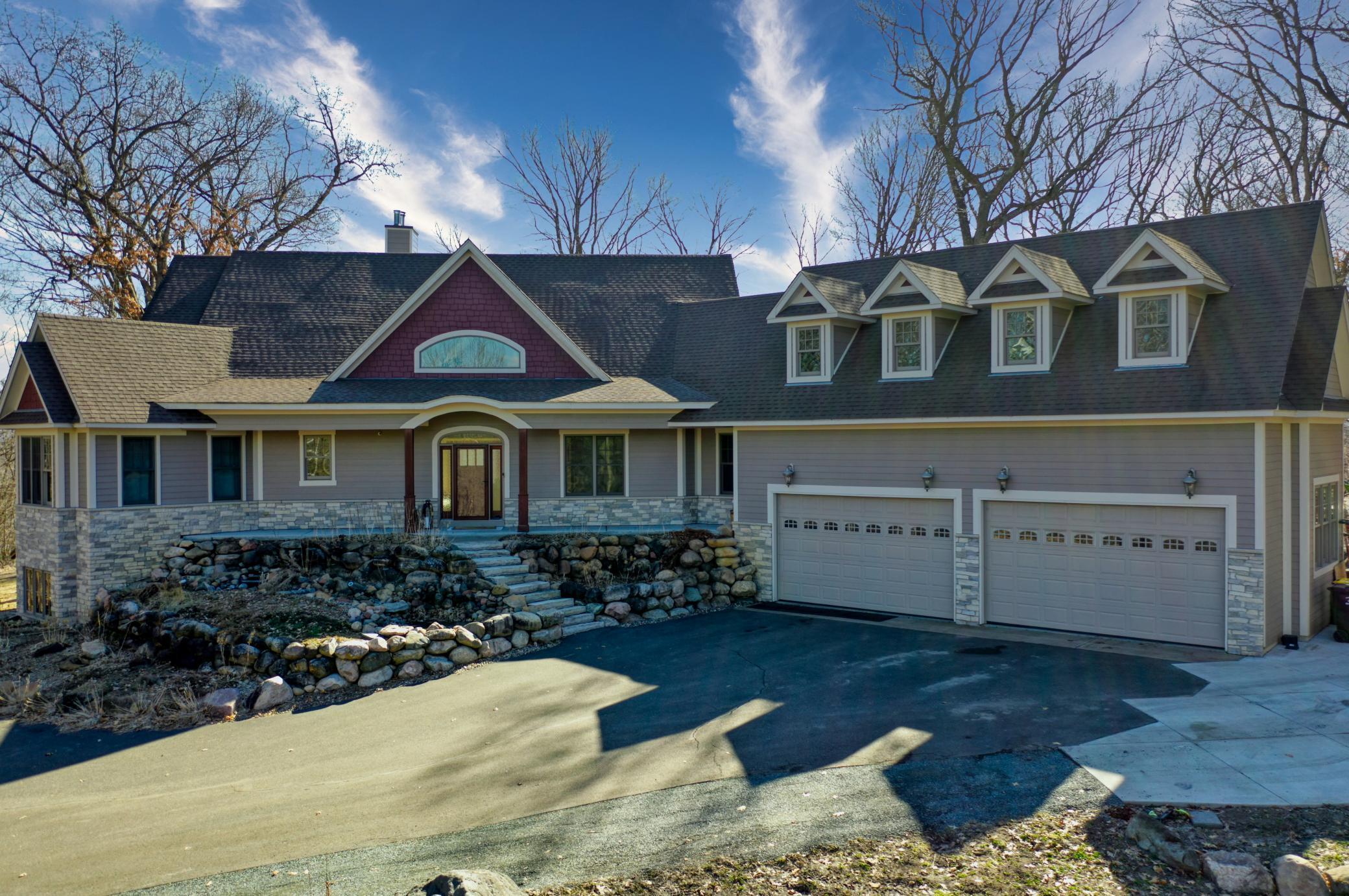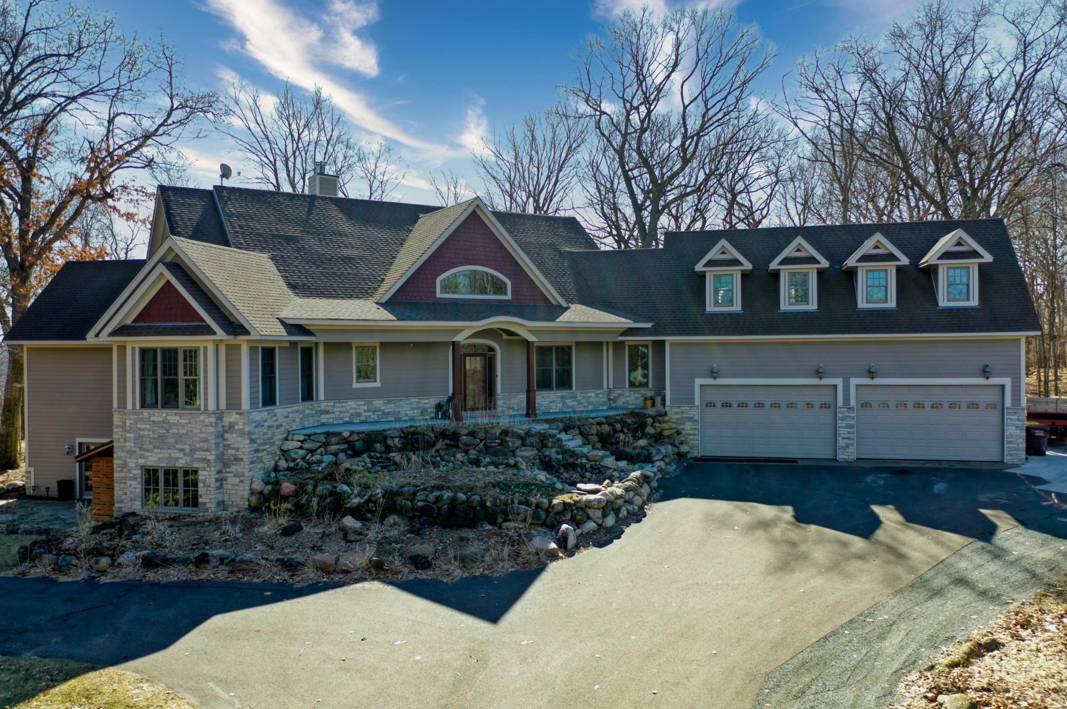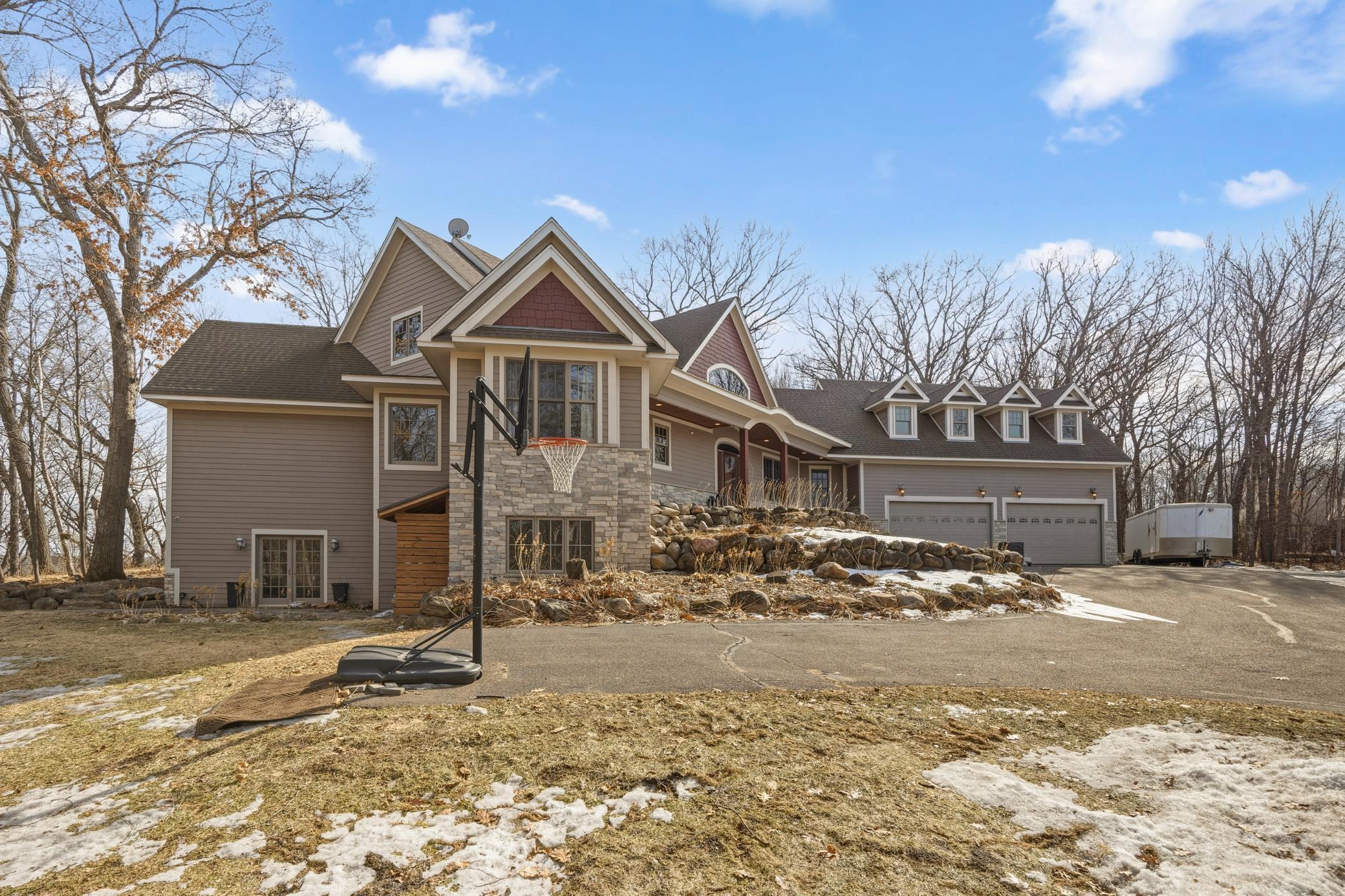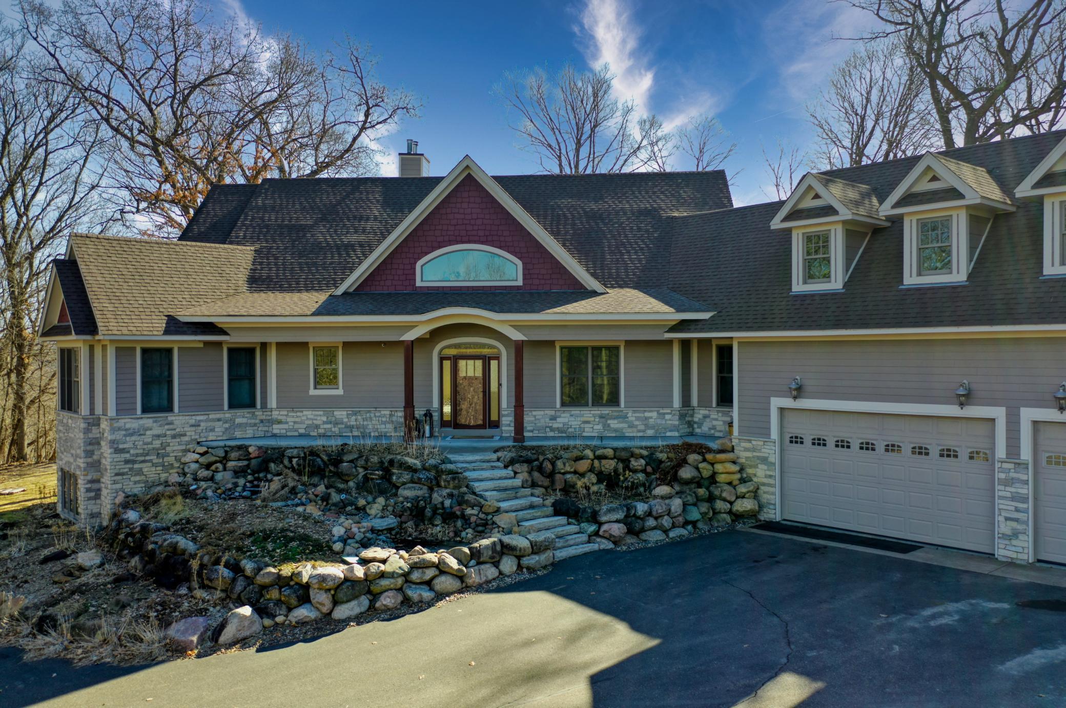 Welcome to 19155 263rd St, an exceptional custom-built home situated on 2.5 private acres along the St. Croix River in the prestigious St. Croix Bluffs neighborhood. This unique estate features a stunning floor-to-ceiling stone fireplace and impressive towering ceilings, along with cherrywood custom cabinets and tigerwood hardwood floors. The main level includes a spacious primary suite with an arched hallway entry and beautiful windows that flood the space with natural light. Upstairs, you will find two bedrooms—one with an en-suite bath—as well as a generous bonus room, ideal for a children's play area, a flexible room, a movie room, or a creative space. The large open basement features a family room with a wood-burning fireplace and wet bar, a bathroom with a walk-in steam shower, and additional unfinished flex space currently used as a hobby shop. The home is equipped with in-floor heating throughout. The heated four-car garage even includes an elevator for easy transport of your belongings into the house! Outside, you'll find ample deck and patio space, perfect for entertaining or simply enjoying the tranquility of the private wooded surroundings.