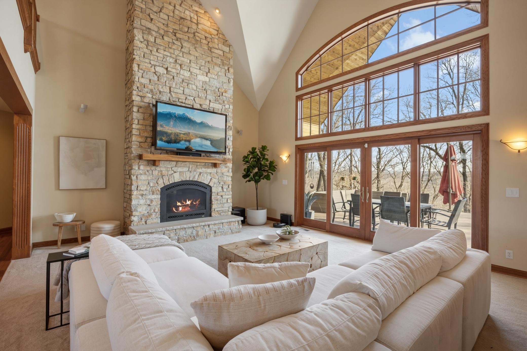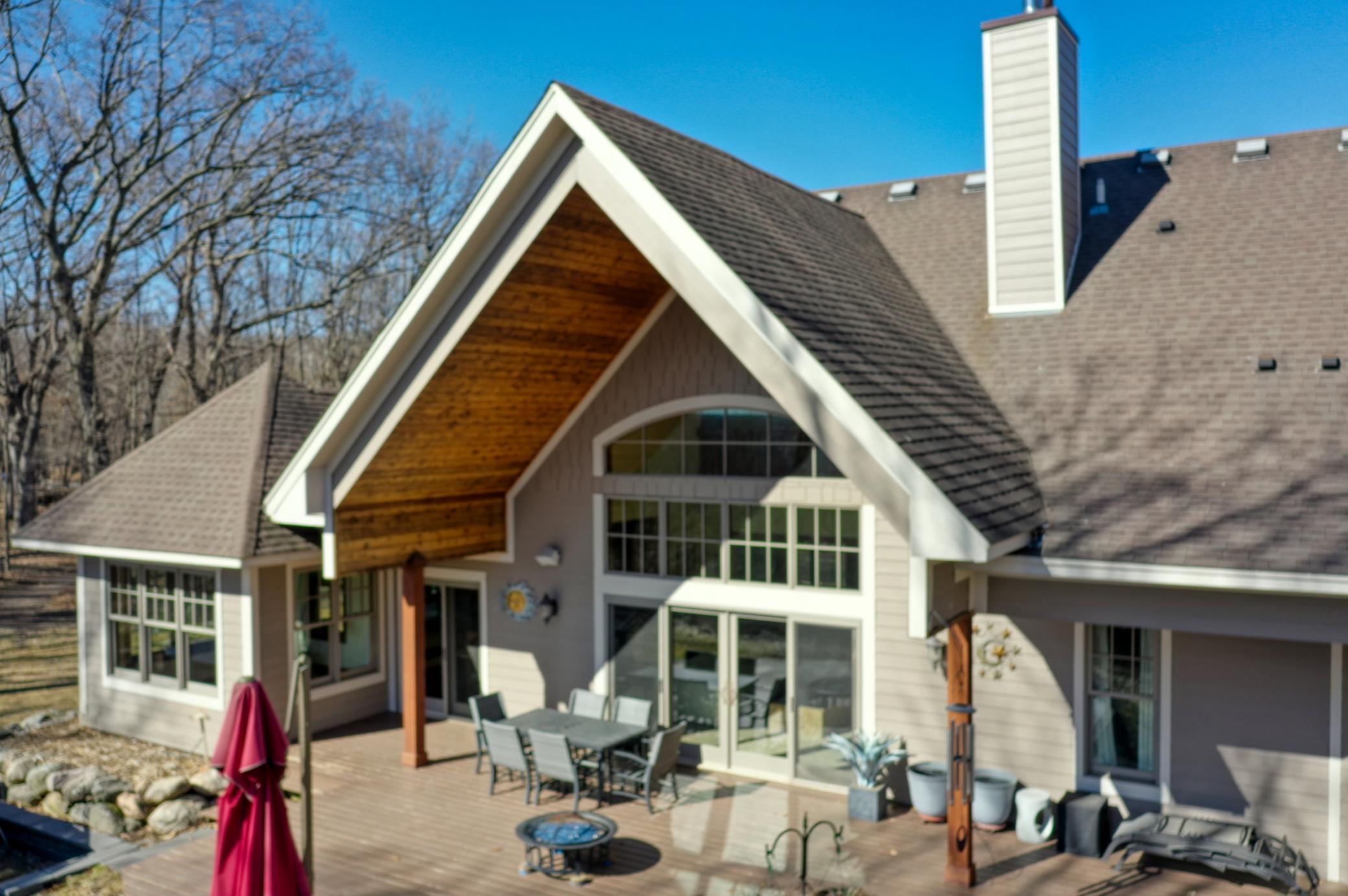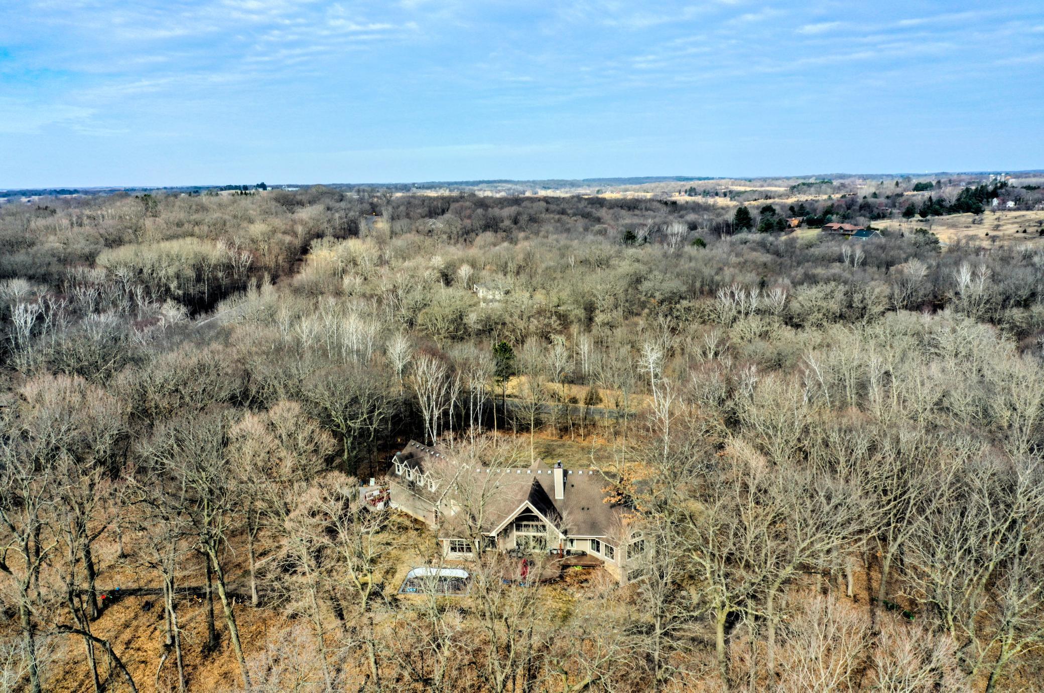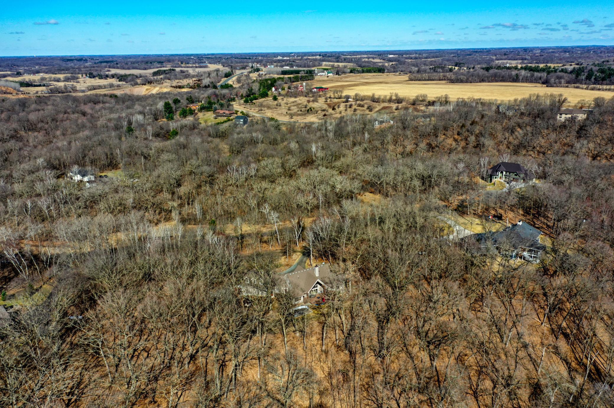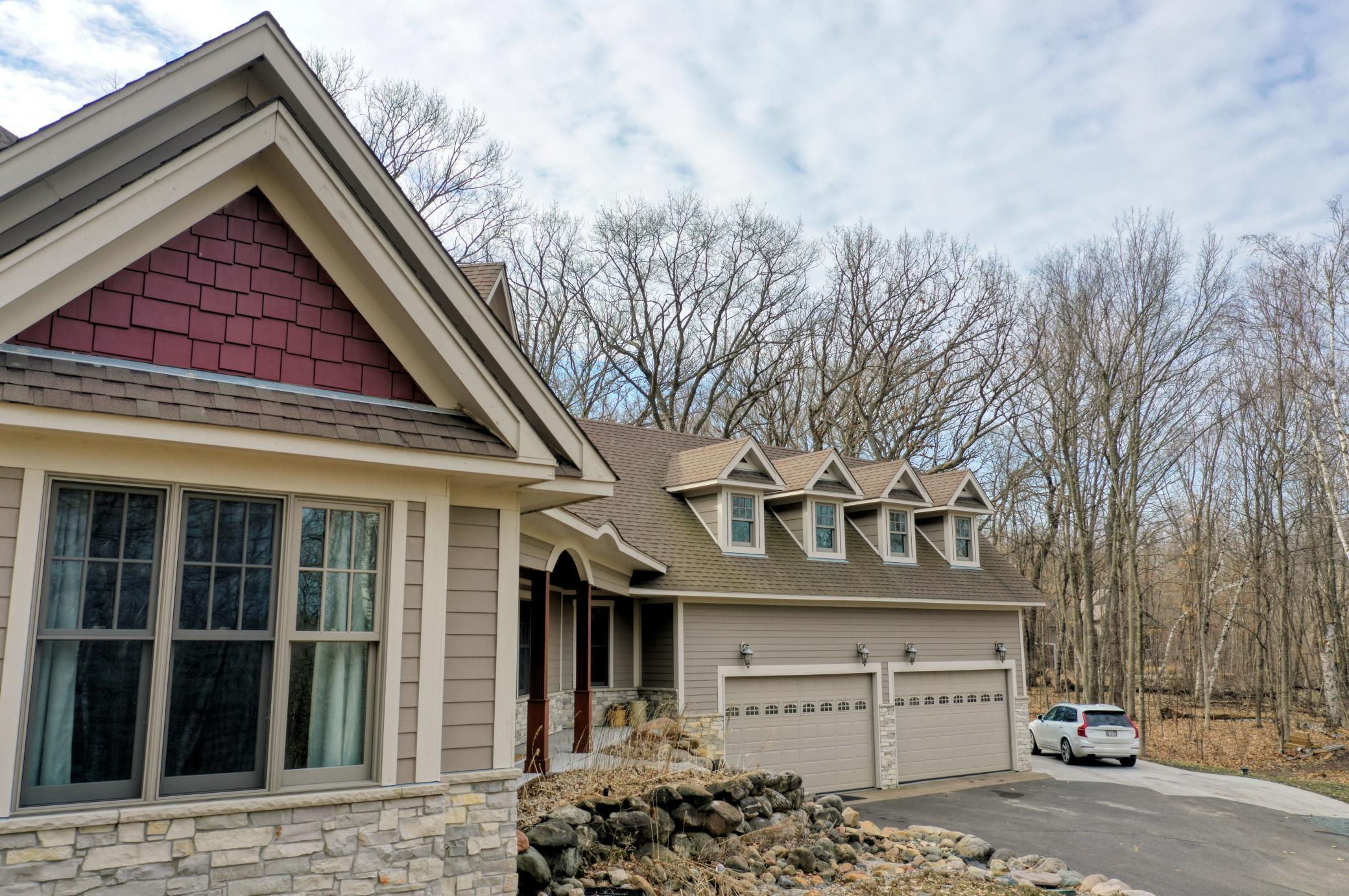 Welcome to 19155 263rd St, an exceptional custom-built home situated on 2.5 private acres along the St. Croix River in the prestigious St. Croix Bluffs neighborhood. This unique estate features a stunning floor-to-ceiling stone fireplace and impressive towering ceilings, along with cherrywood custom cabinets and tigerwood hardwood floors. The main level includes a spacious primary suite with an arched hallway entry and beautiful windows that flood the space with natural light. Upstairs, you will find two bedrooms—one with an en-suite bath—as well as a generous bonus room, ideal for a children's play area, a flexible room, a movie room, or a creative space. The large open basement features a family room with a wood-burning fireplace and wet bar, a bathroom with a walk-in steam shower, and additional unfinished flex space currently used as a hobby shop. The home is equipped with in-floor heating throughout. The heated four-car garage even includes an elevator for easy transport of your belongings into the house! Outside, you'll find ample deck and patio space, perfect for entertaining or simply enjoying the tranquility of the private wooded surroundings.