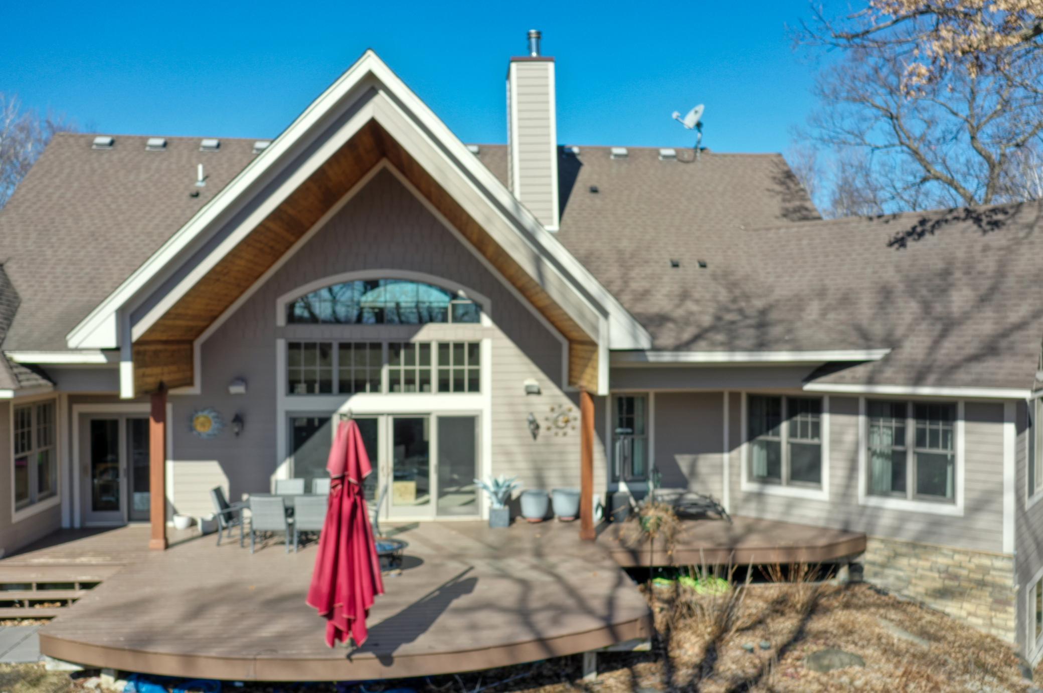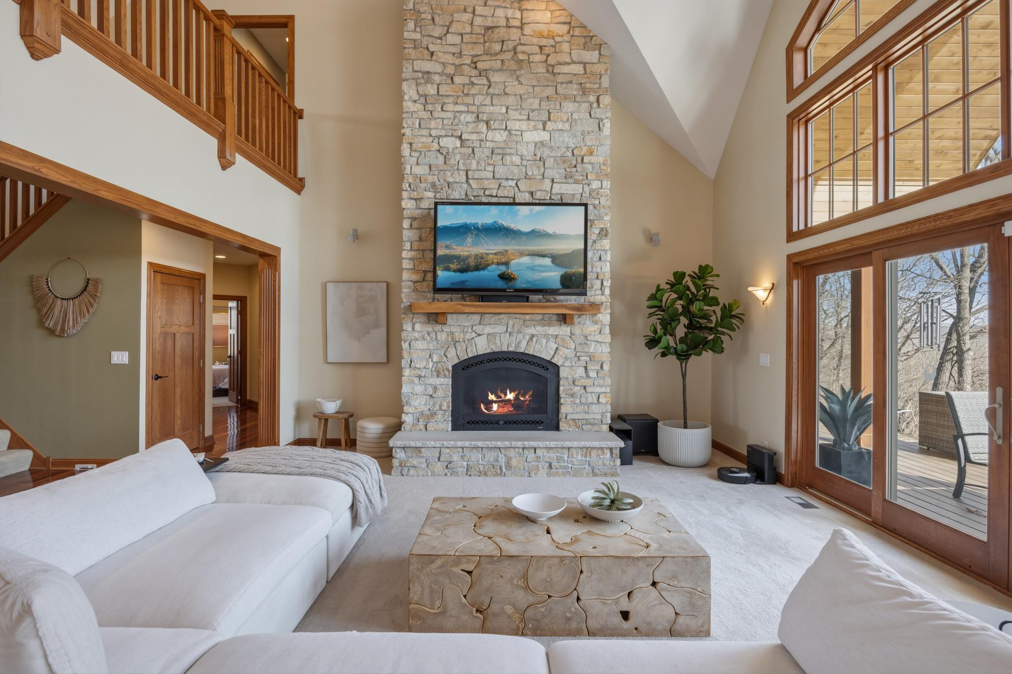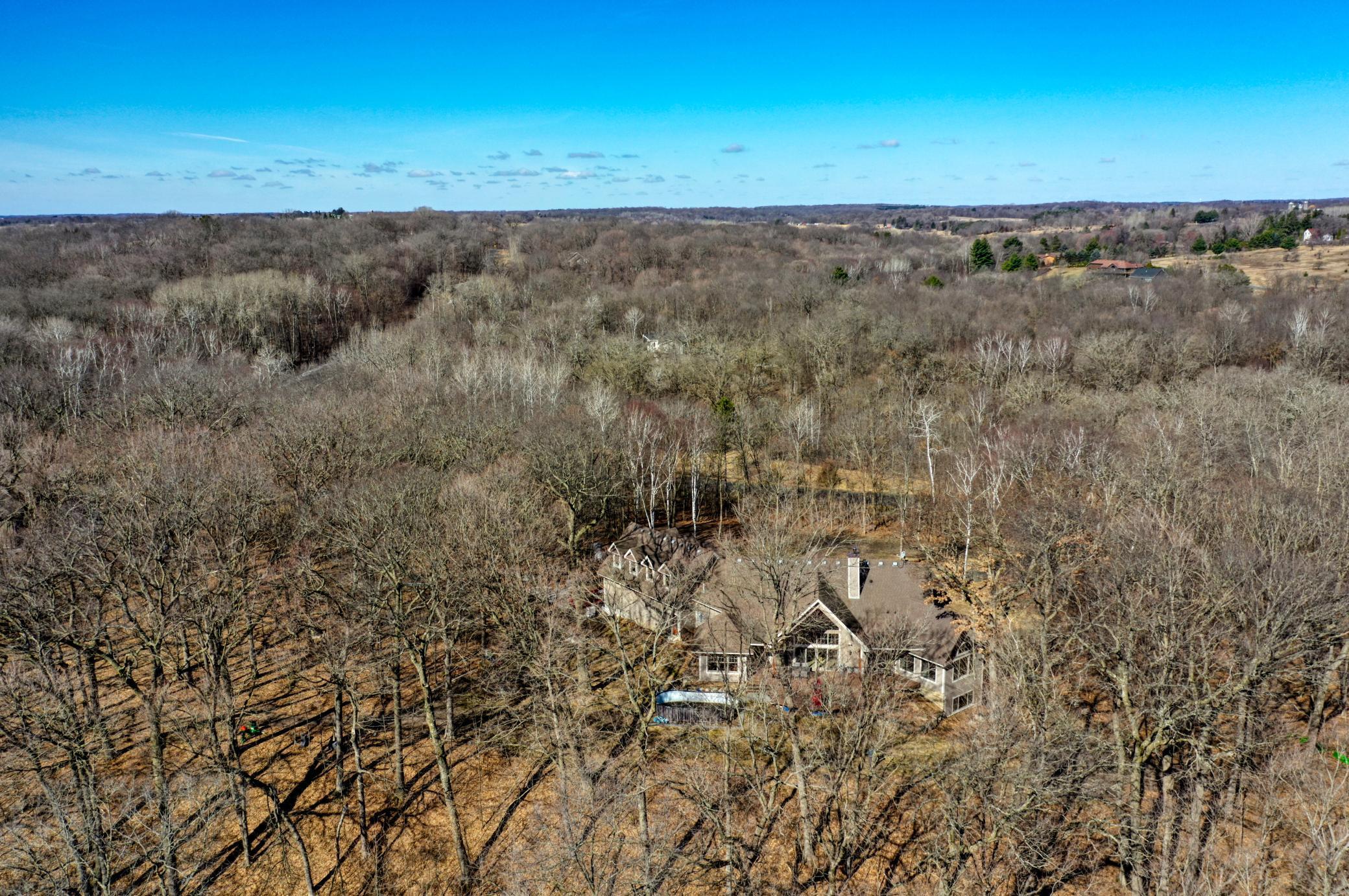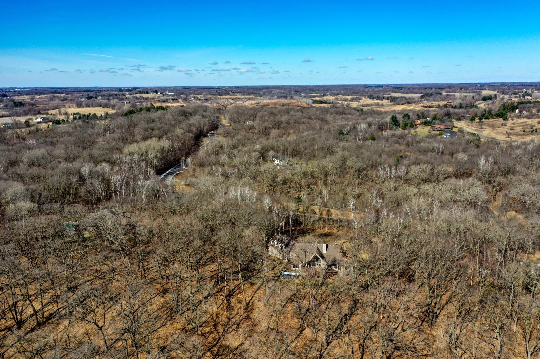 Welcome to 19155 263rd St, an exceptional custom-built home situated on 2.5 private acres along the St. Croix River in the prestigious St. Croix Bluffs neighborhood. This unique estate features a stunning floor-to-ceiling stone fireplace and impressive towering ceilings, along with cherrywood custom cabinets and tigerwood hardwood floors. The main level includes a spacious primary suite with an arched hallway entry and beautiful windows that flood the space with natural light. Upstairs, you will find two bedrooms—one with an en-suite bath—as well as a generous bonus room, ideal for a children's play area, a flexible room, a movie room, or a creative space. The large open basement features a family room with a wood-burning fireplace and wet bar, a bathroom with a walk-in steam shower, and additional unfinished flex space currently used as a hobby shop. The home is equipped with in-floor heating throughout. The heated four-car garage even includes an elevator for easy transport of your belongings into the house! Outside, you'll find ample deck and patio space, perfect for entertaining or simply enjoying the tranquility of the private wooded surroundings.