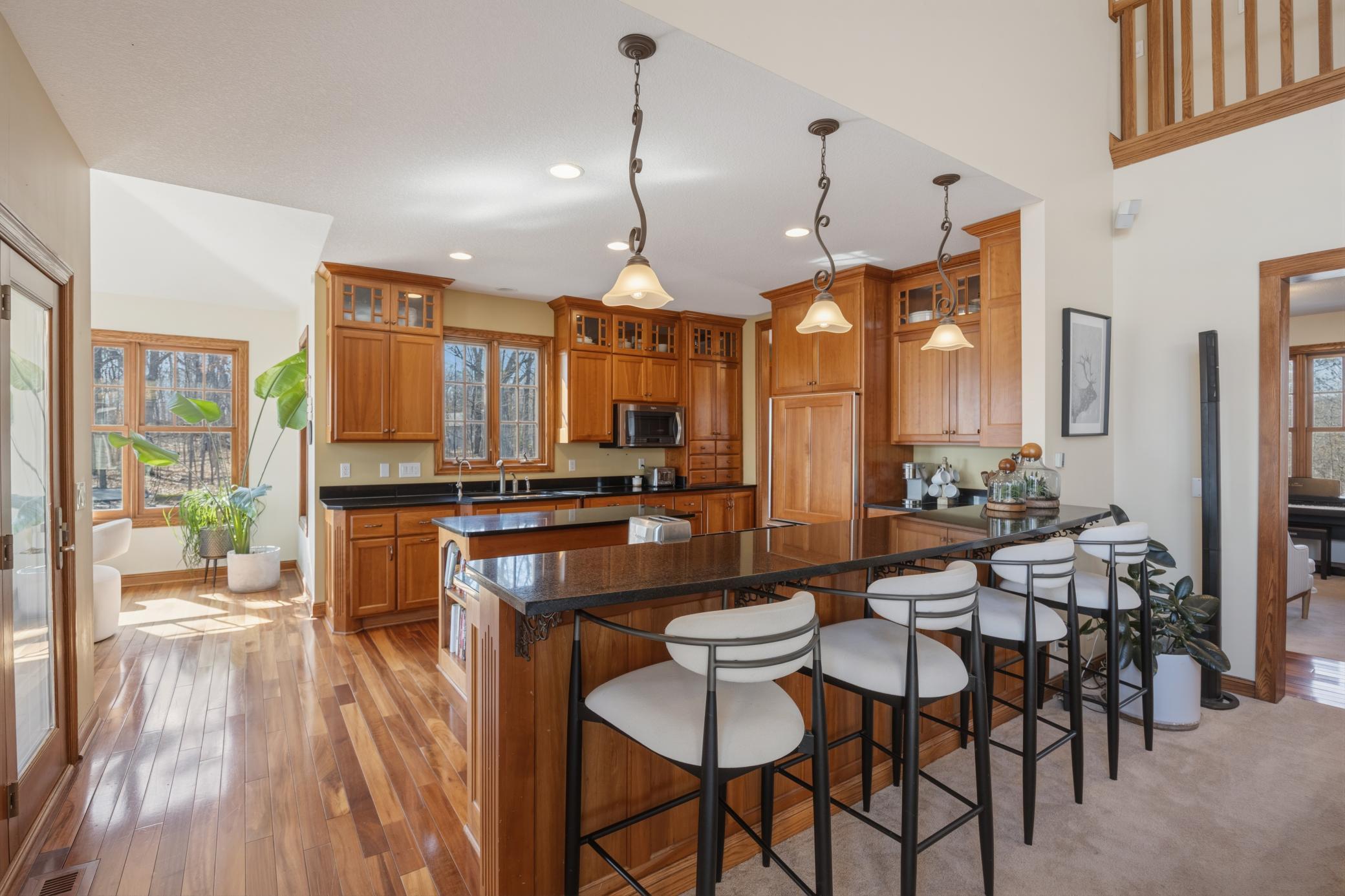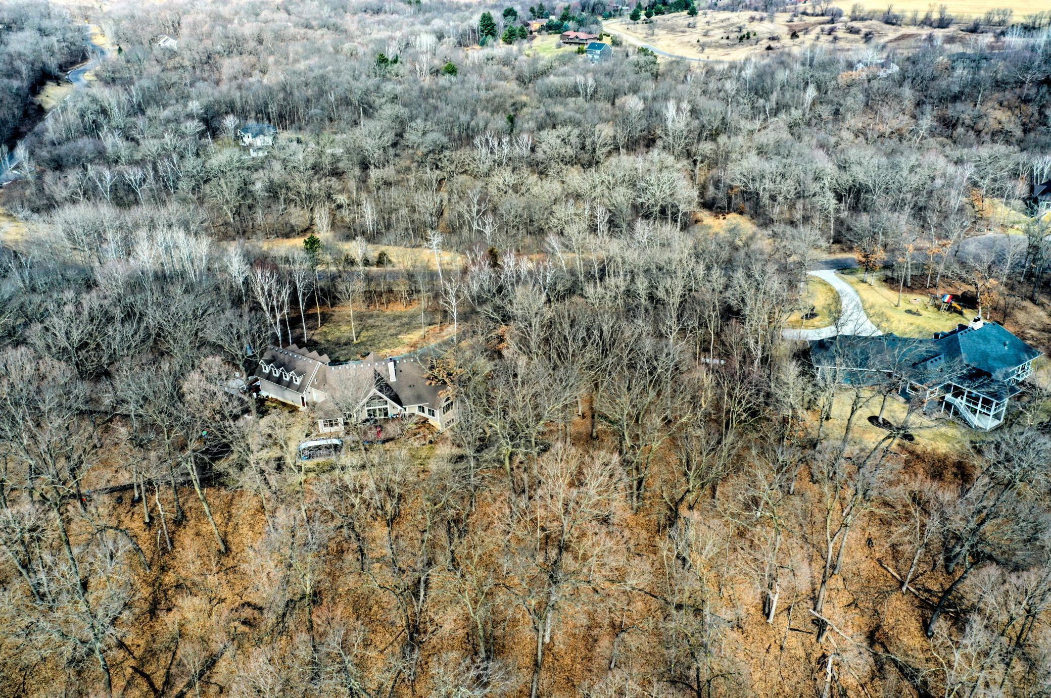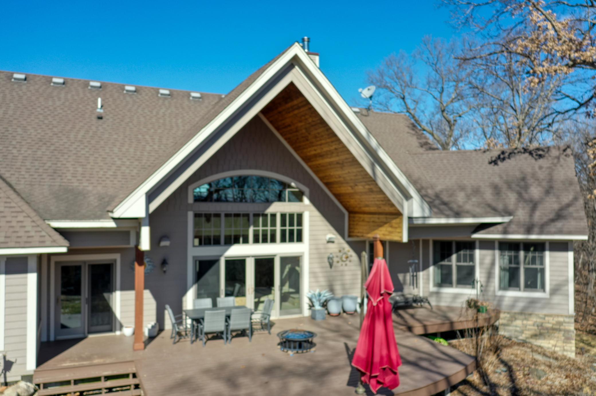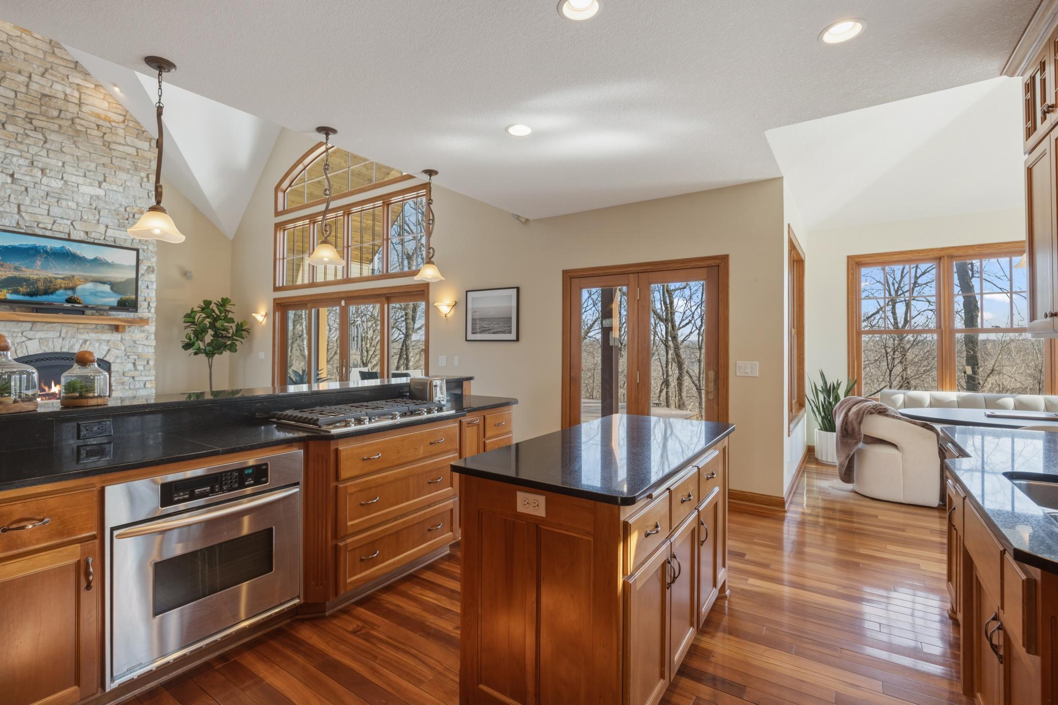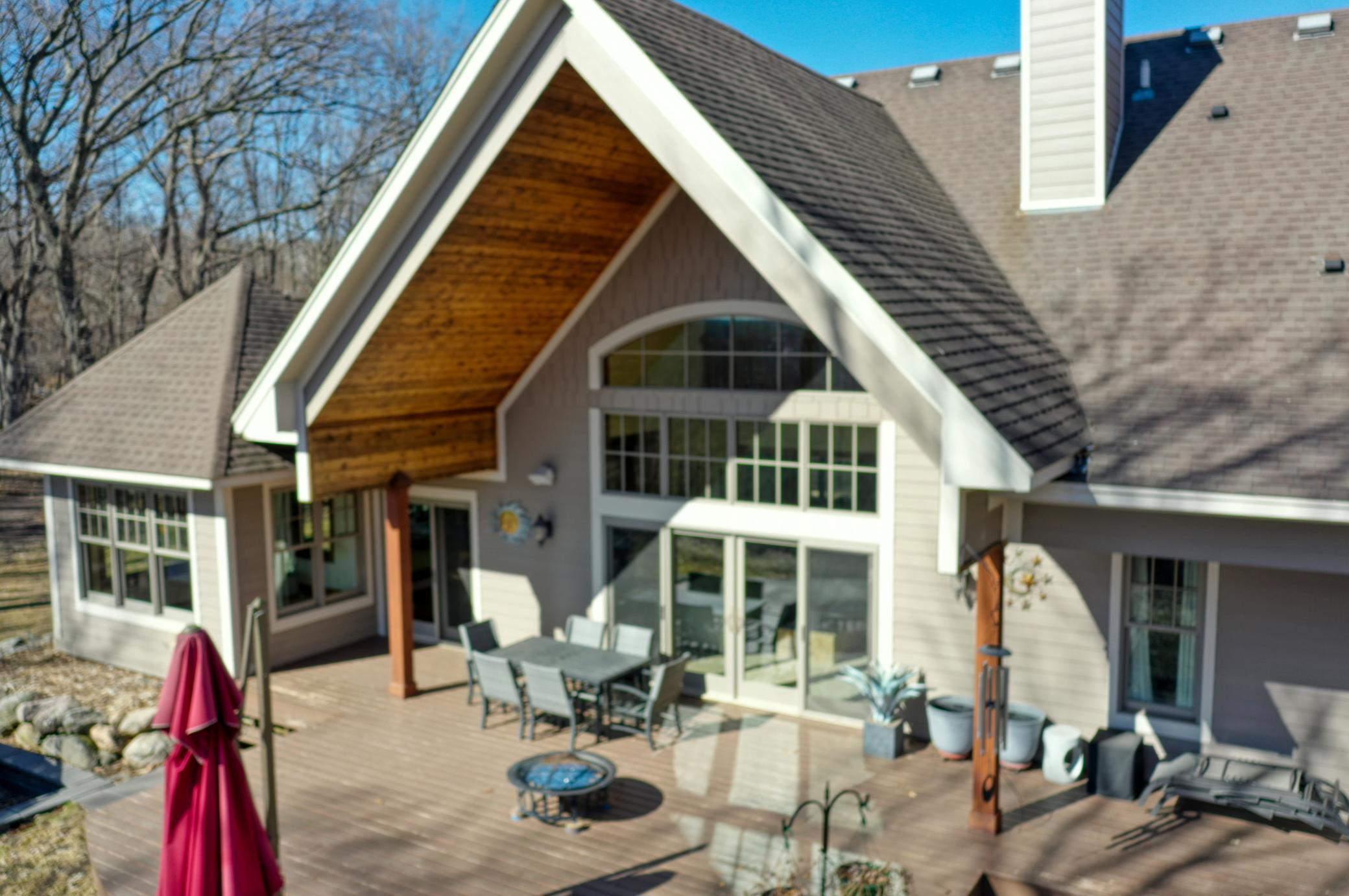 Welcome to 19155 263rd St, an exceptional custom-built home situated on 2.5 private acres along the St. Croix River in the prestigious St. Croix Bluffs neighborhood. This unique estate features a stunning floor-to-ceiling stone fireplace and impressive towering ceilings, along with cherrywood custom cabinets and tigerwood hardwood floors. The main level includes a spacious primary suite with an arched hallway entry and beautiful windows that flood the space with natural light. Upstairs, you will find two bedrooms—one with an en-suite bath—as well as a generous bonus room, ideal for a children's play area, a flexible room, a movie room, or a creative space. The large open basement features a family room with a wood-burning fireplace and wet bar, a bathroom with a walk-in steam shower, and additional unfinished flex space currently used as a hobby shop. The home is equipped with in-floor heating throughout. The heated four-car garage even includes an elevator for easy transport of your belongings into the house! Outside, you'll find ample deck and patio space, perfect for entertaining or simply enjoying the tranquility of the private wooded surroundings.