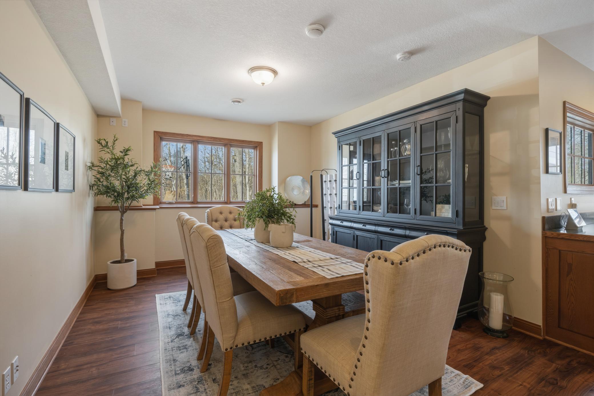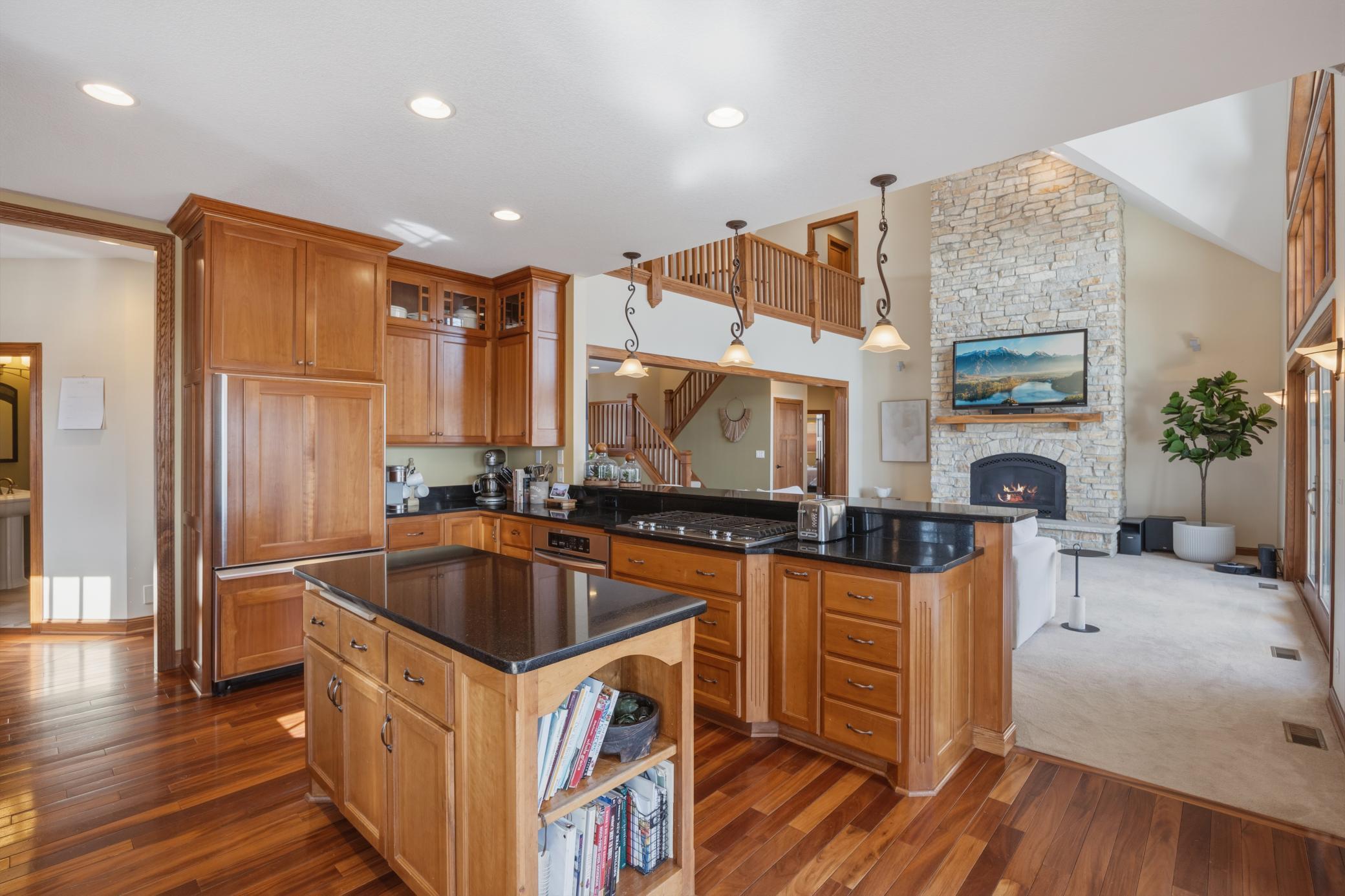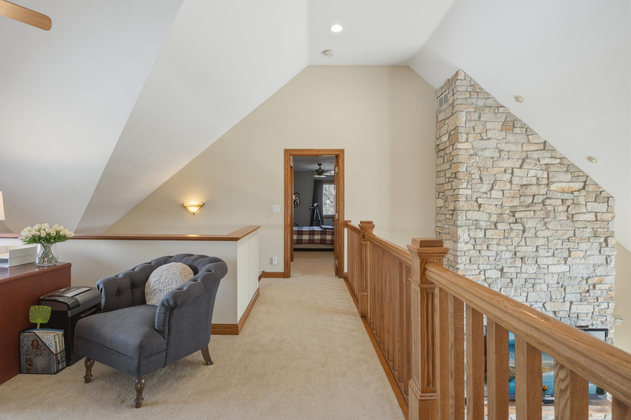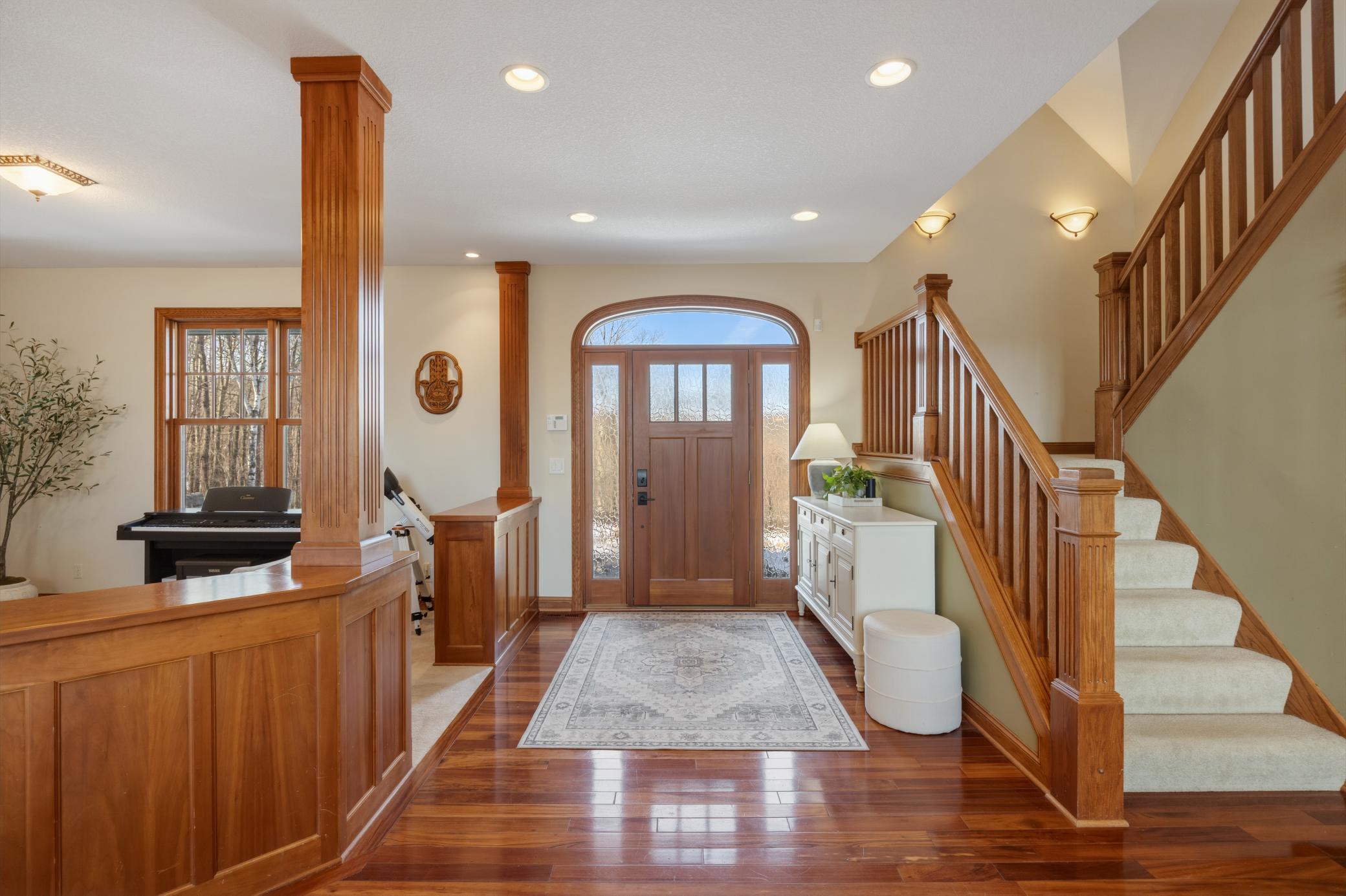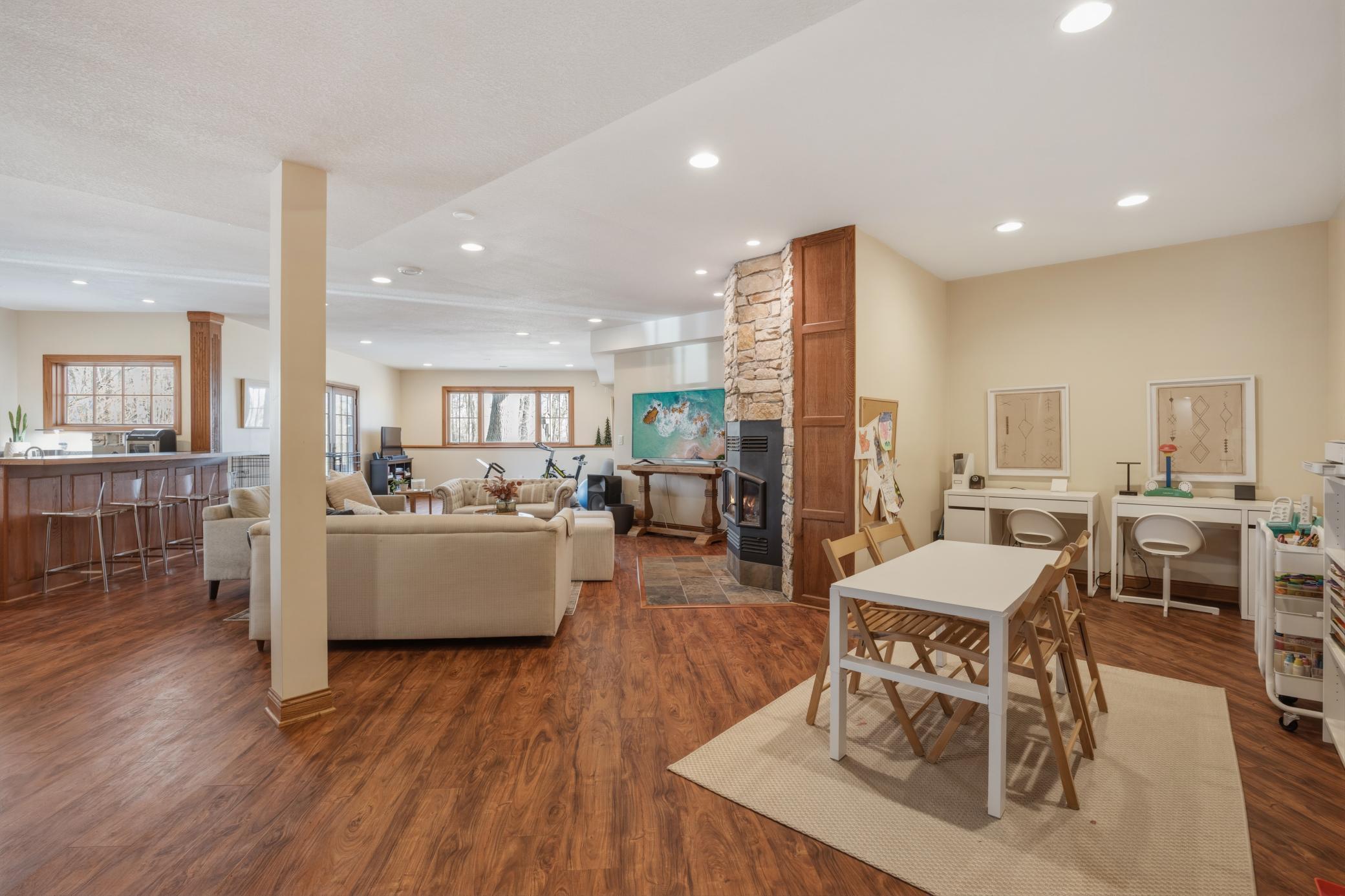 Welcome to 19155 263rd St, an exceptional custom-built home situated on 2.5 private acres along the St. Croix River in the prestigious St. Croix Bluffs neighborhood. This unique estate features a stunning floor-to-ceiling stone fireplace and impressive towering ceilings, along with cherrywood custom cabinets and tigerwood hardwood floors. The main level includes a spacious primary suite with an arched hallway entry and beautiful windows that flood the space with natural light. Upstairs, you will find two bedrooms—one with an en-suite bath—as well as a generous bonus room, ideal for a children's play area, a flexible room, a movie room, or a creative space. The large open basement features a family room with a wood-burning fireplace and wet bar, a bathroom with a walk-in steam shower, and additional unfinished flex space currently used as a hobby shop. The home is equipped with in-floor heating throughout. The heated four-car garage even includes an elevator for easy transport of your belongings into the house! Outside, you'll find ample deck and patio space, perfect for entertaining or simply enjoying the tranquility of the private wooded surroundings.