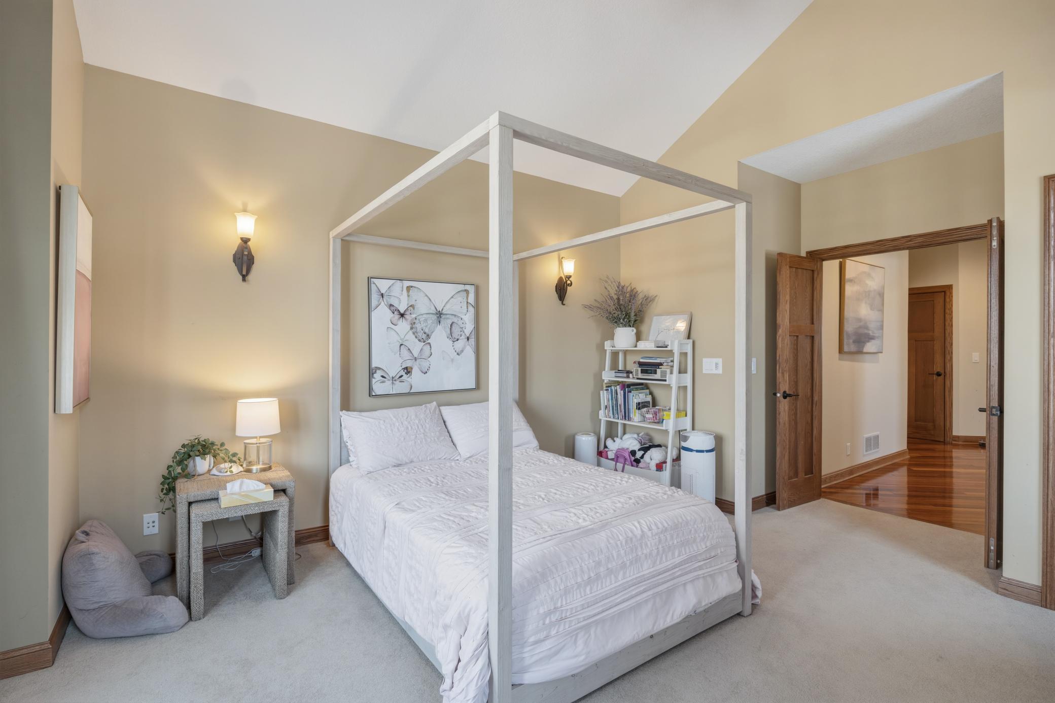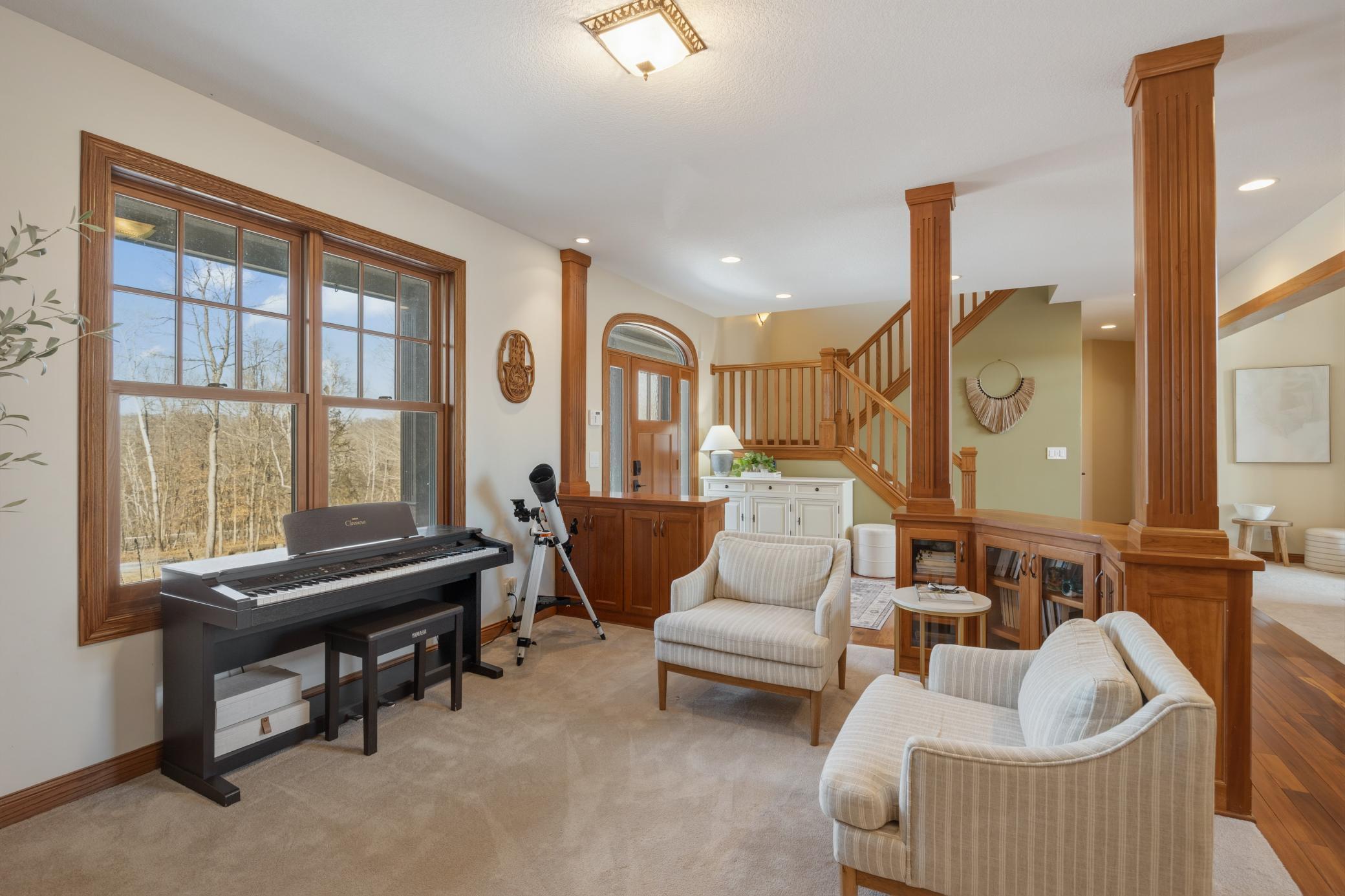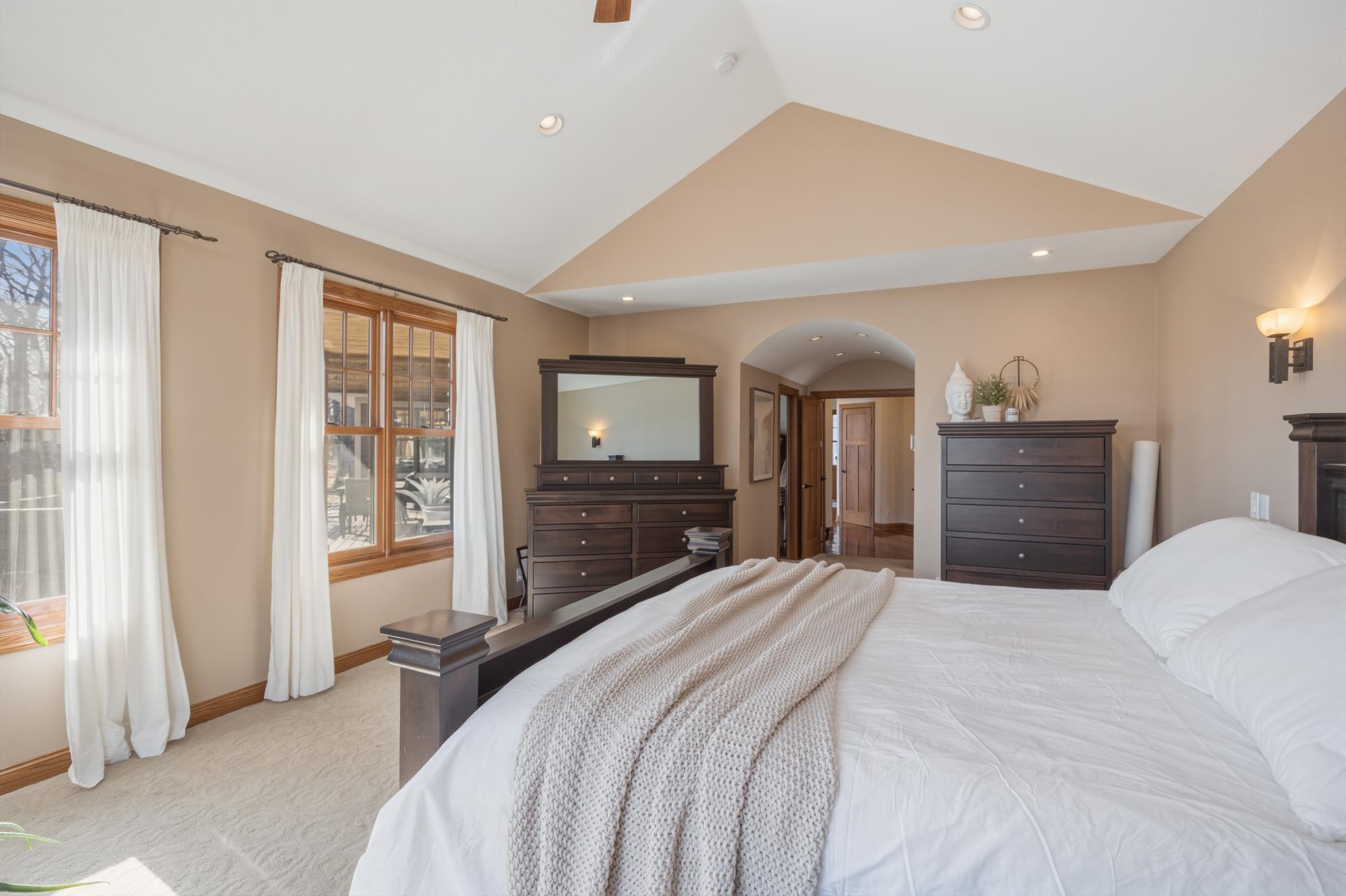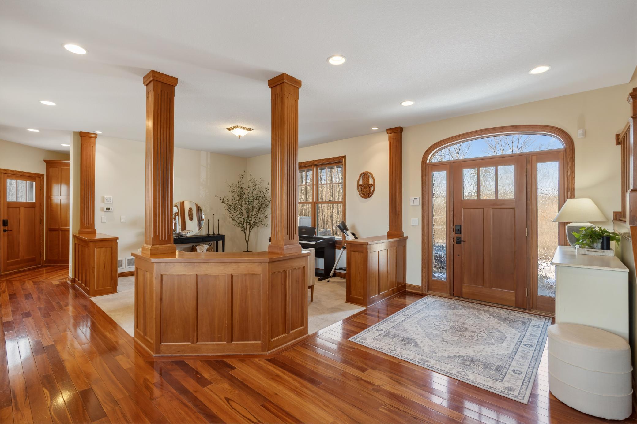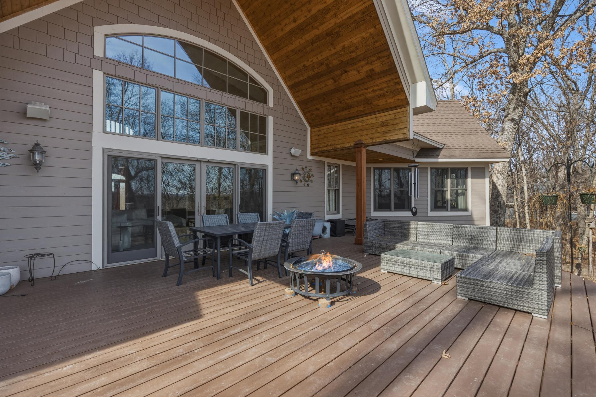 Welcome to 19155 263rd St, an exceptional custom-built home situated on 2.5 private acres along the St. Croix River in the prestigious St. Croix Bluffs neighborhood. This unique estate features a stunning floor-to-ceiling stone fireplace and impressive towering ceilings, along with cherrywood custom cabinets and tigerwood hardwood floors. The main level includes a spacious primary suite with an arched hallway entry and beautiful windows that flood the space with natural light. Upstairs, you will find two bedrooms—one with an en-suite bath—as well as a generous bonus room, ideal for a children's play area, a flexible room, a movie room, or a creative space. The large open basement features a family room with a wood-burning fireplace and wet bar, a bathroom with a walk-in steam shower, and additional unfinished flex space currently used as a hobby shop. The home is equipped with in-floor heating throughout. The heated four-car garage even includes an elevator for easy transport of your belongings into the house! Outside, you'll find ample deck and patio space, perfect for entertaining or simply enjoying the tranquility of the private wooded surroundings.