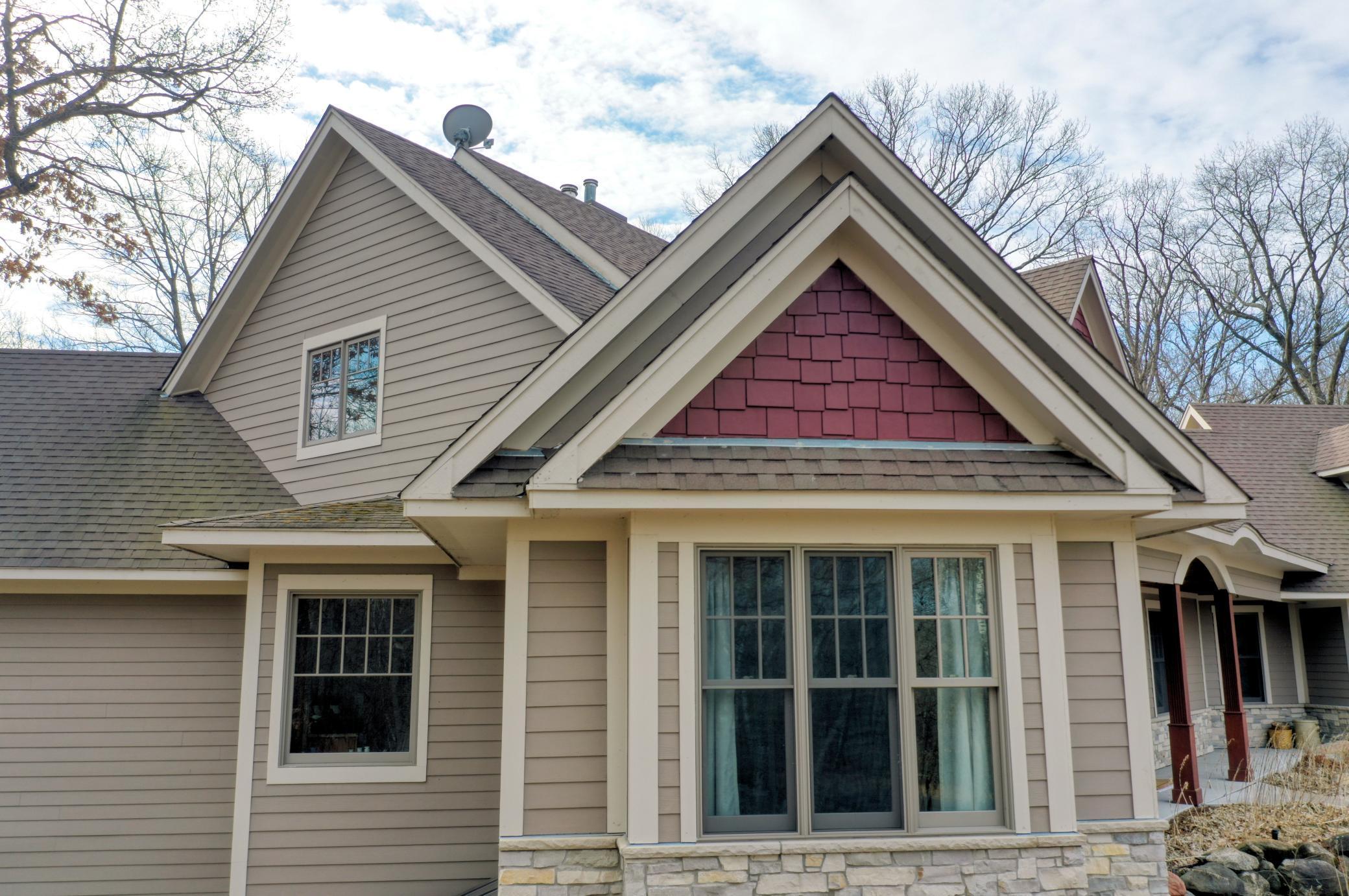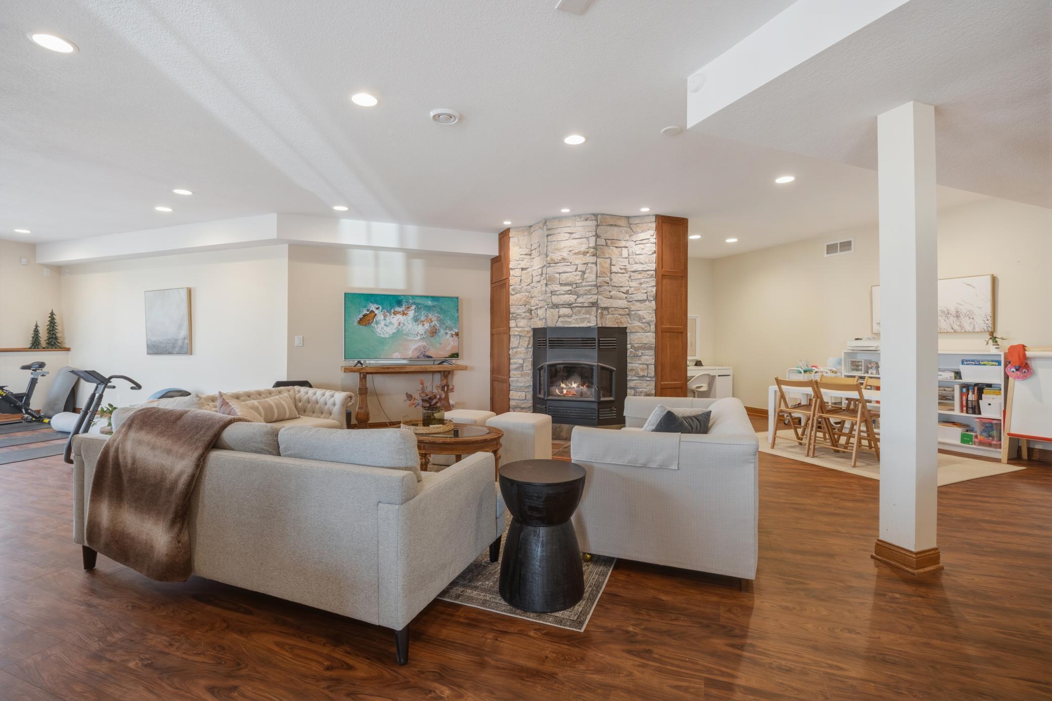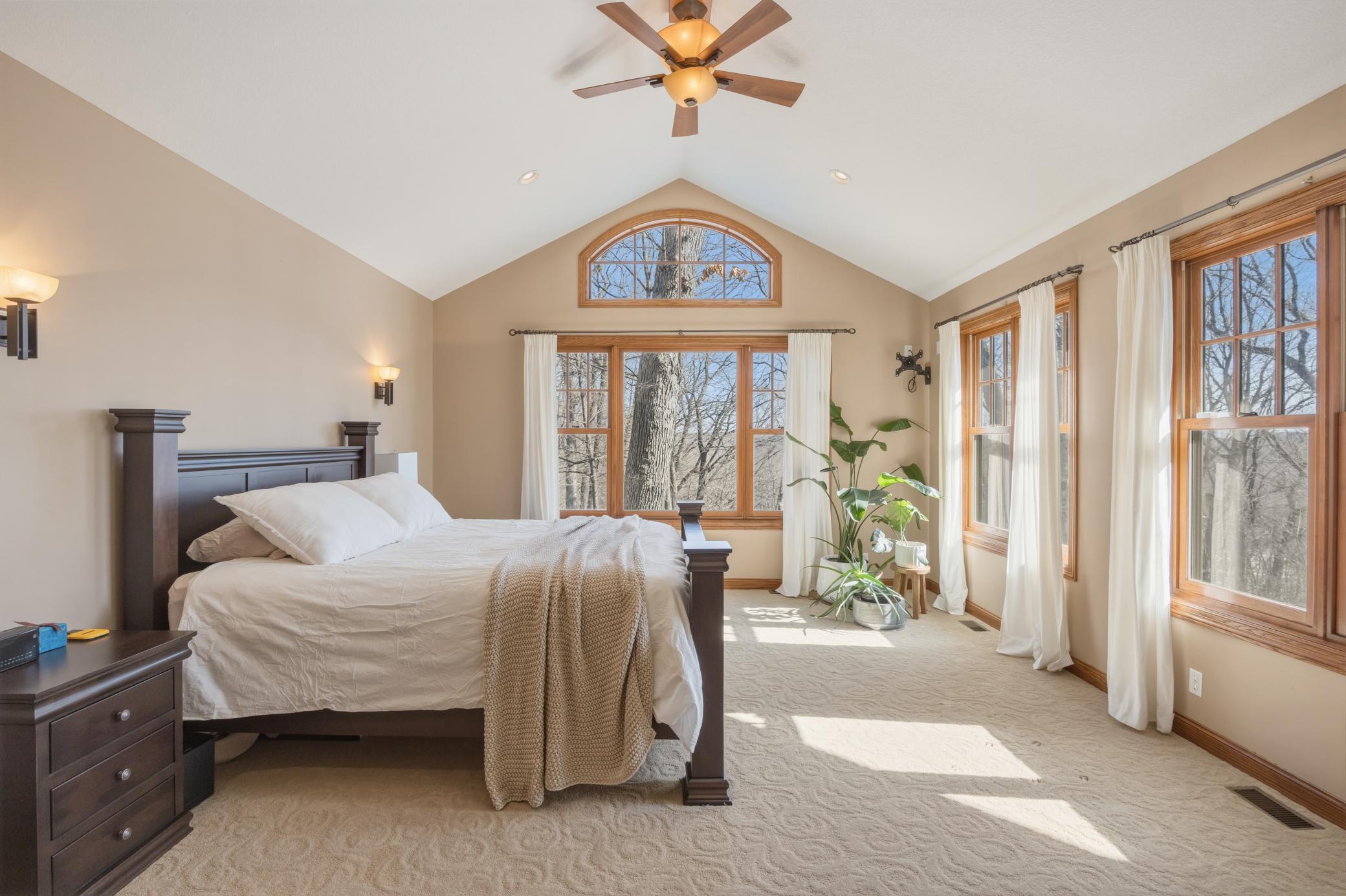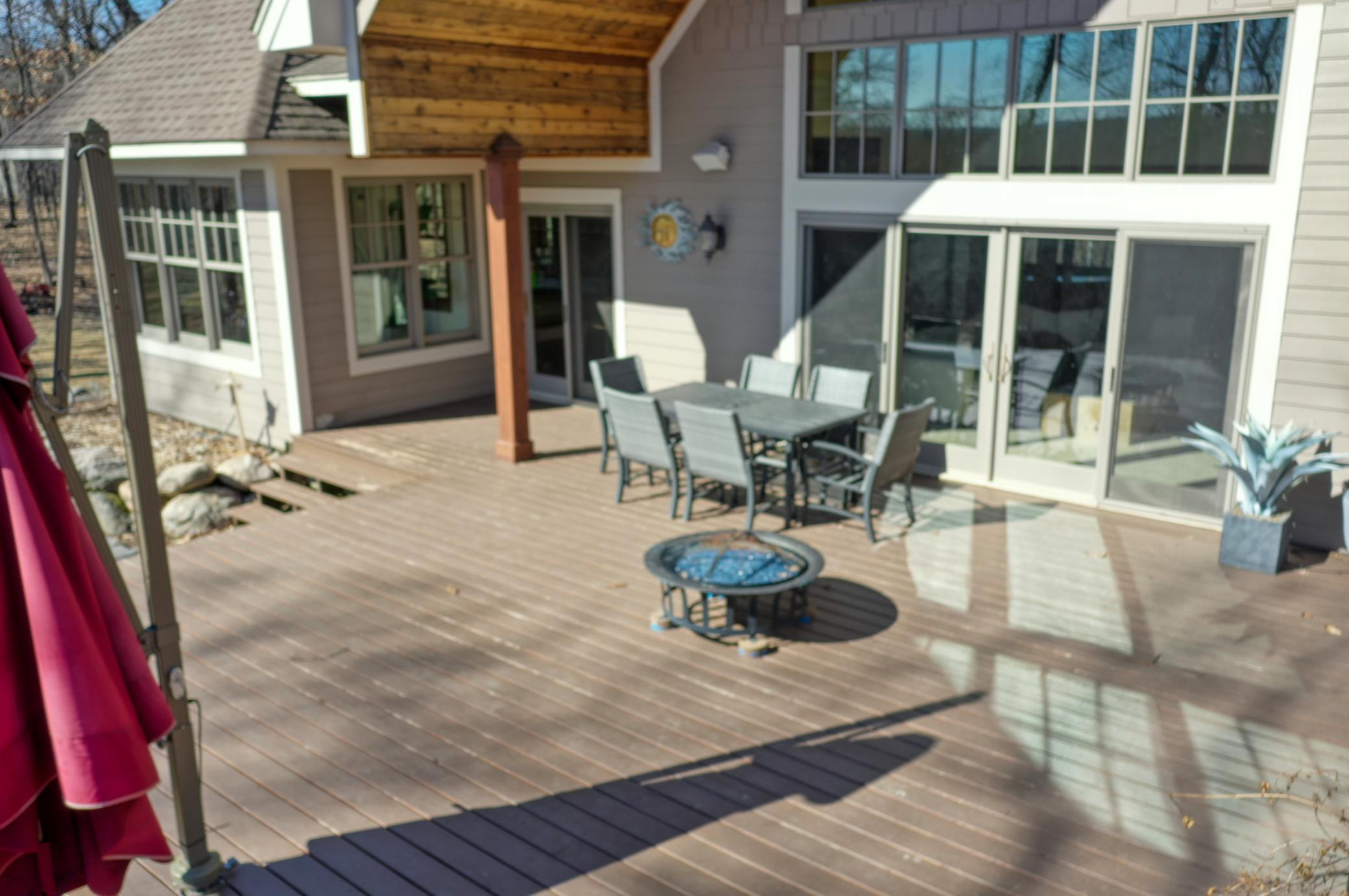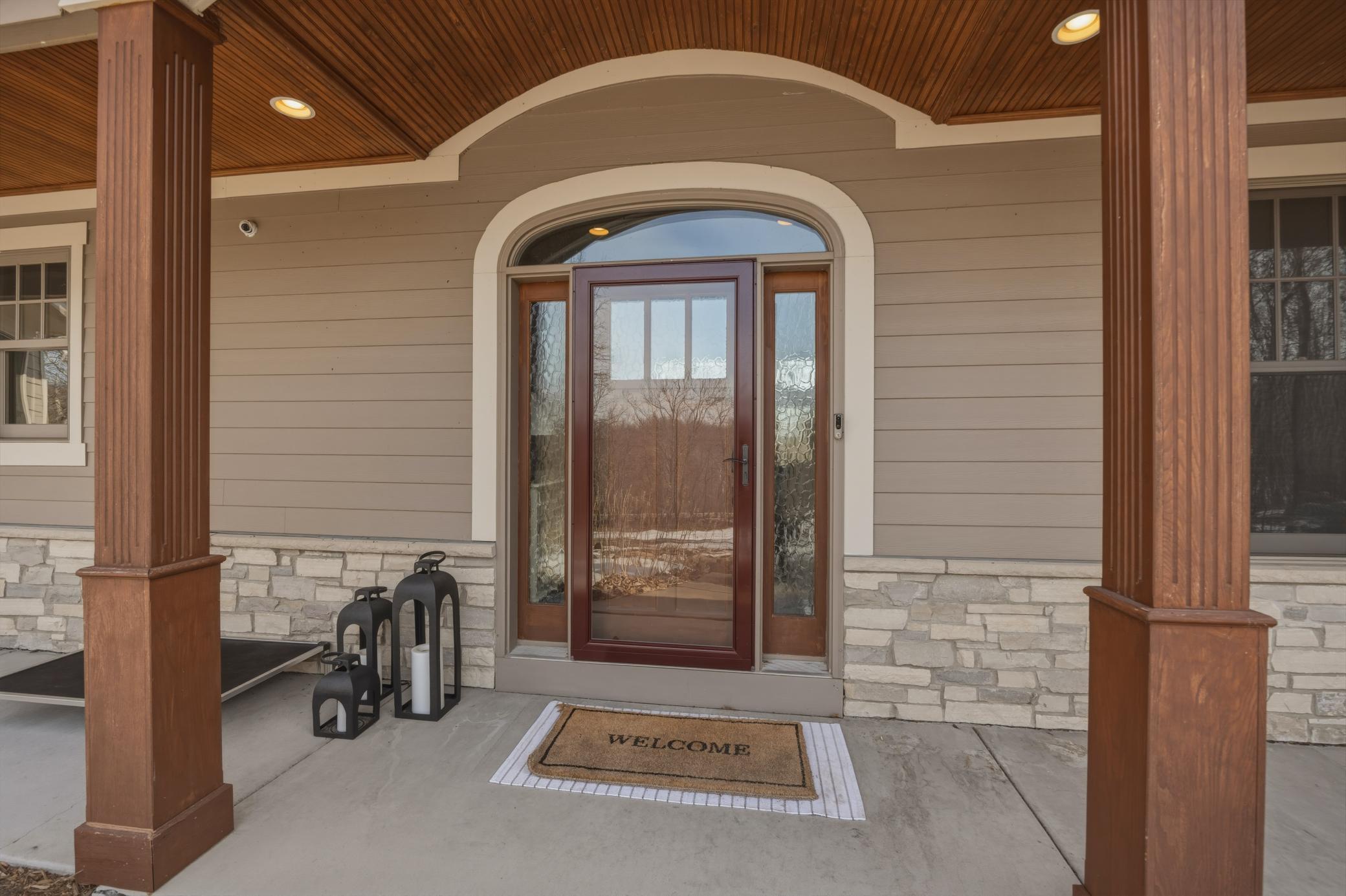 Welcome to 19155 263rd St, an exceptional custom-built home situated on 2.5 private acres along the St. Croix River in the prestigious St. Croix Bluffs neighborhood. This unique estate features a stunning floor-to-ceiling stone fireplace and impressive towering ceilings, along with cherrywood custom cabinets and tigerwood hardwood floors. The main level includes a spacious primary suite with an arched hallway entry and beautiful windows that flood the space with natural light. Upstairs, you will find two bedrooms—one with an en-suite bath—as well as a generous bonus room, ideal for a children's play area, a flexible room, a movie room, or a creative space. The large open basement features a family room with a wood-burning fireplace and wet bar, a bathroom with a walk-in steam shower, and additional unfinished flex space currently used as a hobby shop. The home is equipped with in-floor heating throughout. The heated four-car garage even includes an elevator for easy transport of your belongings into the house! Outside, you'll find ample deck and patio space, perfect for entertaining or simply enjoying the tranquility of the private wooded surroundings.