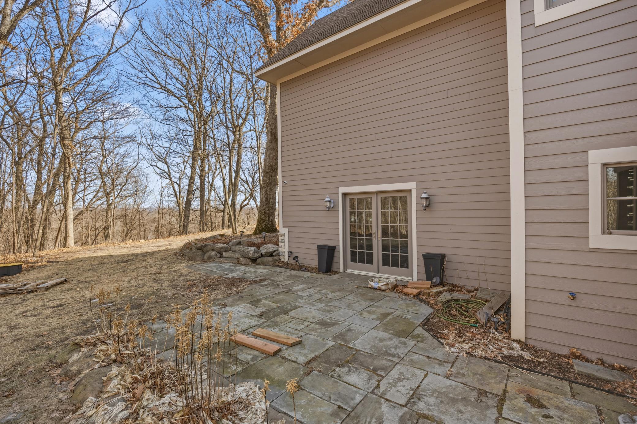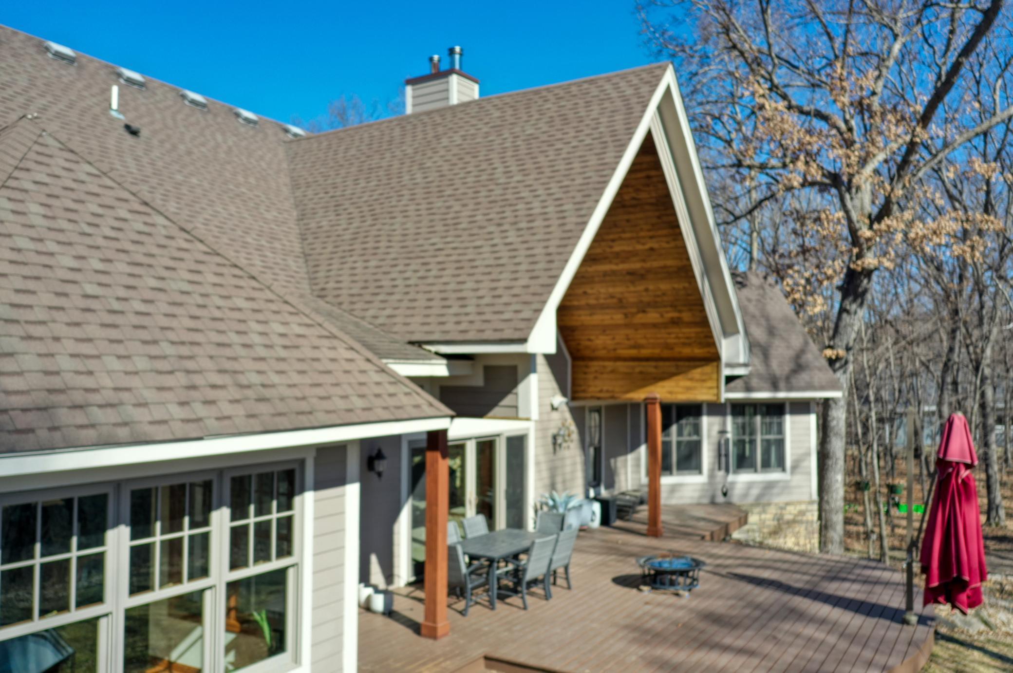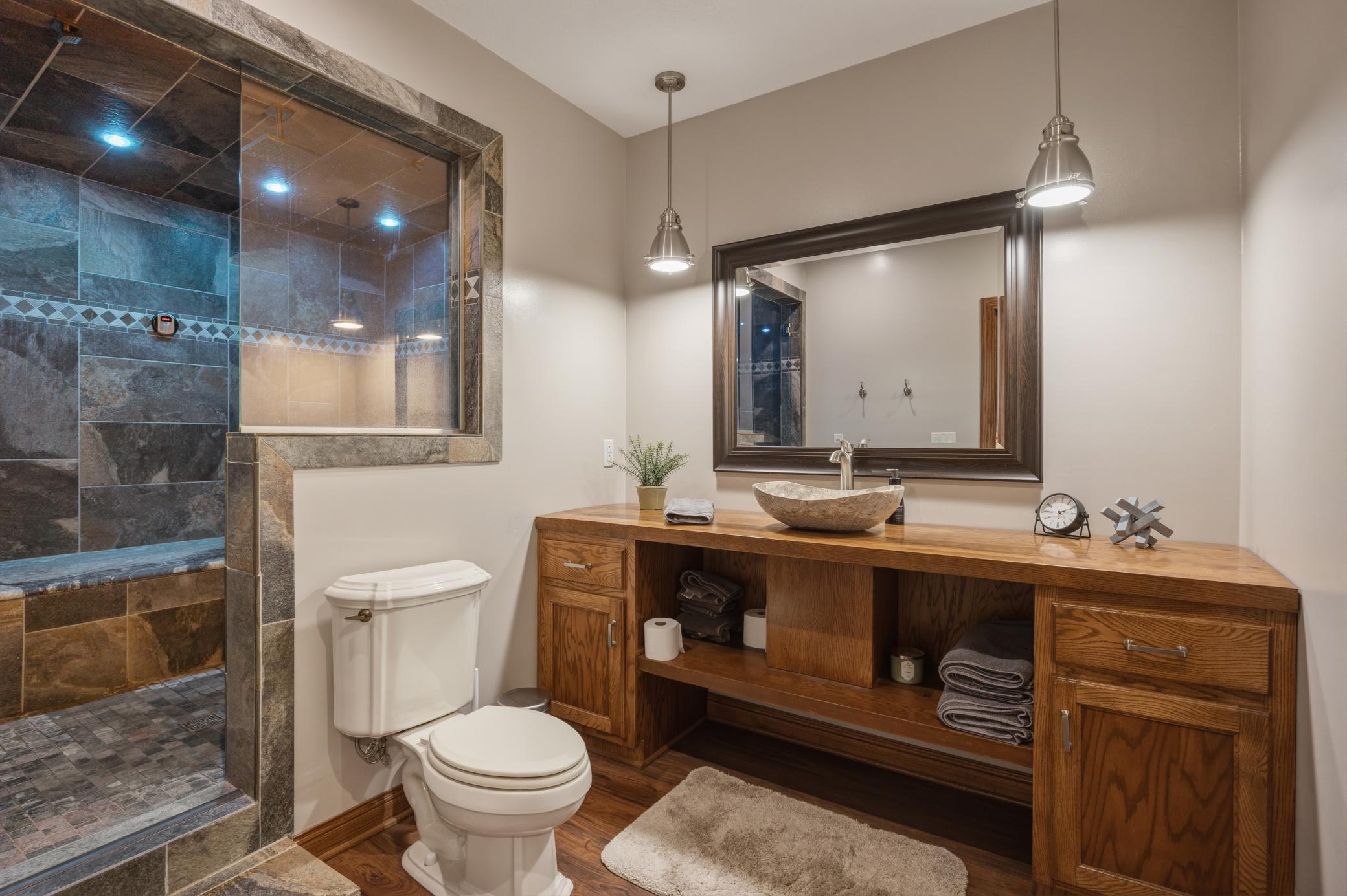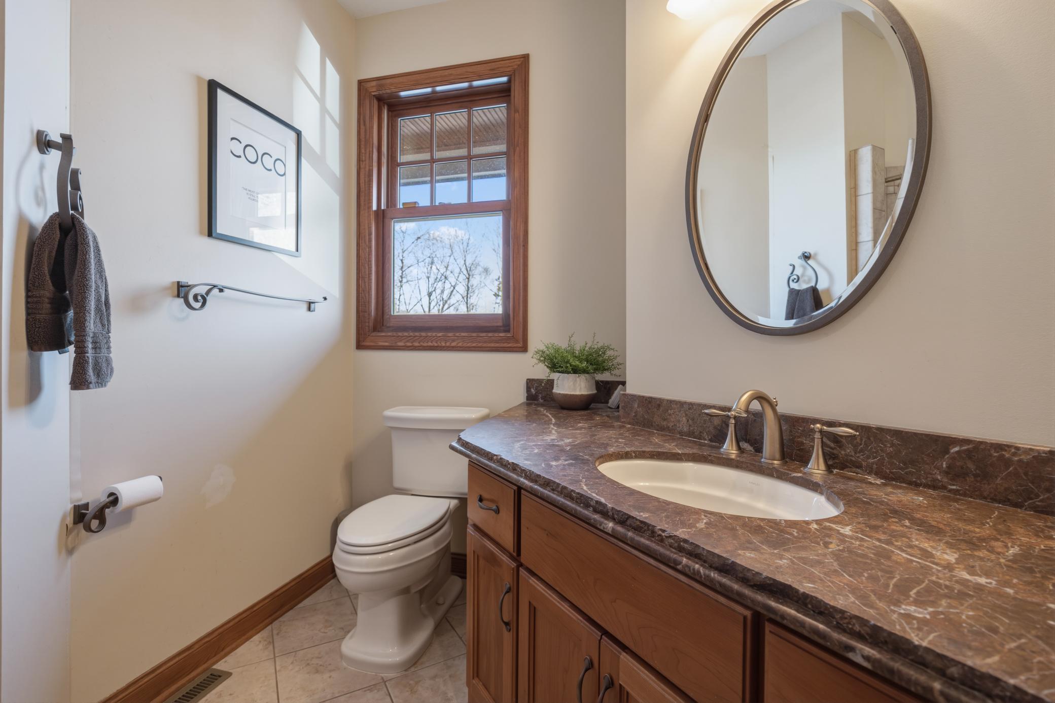 Welcome to 19155 263rd St, an exceptional custom-built home situated on 2.5 private acres along the St. Croix River in the prestigious St. Croix Bluffs neighborhood. This unique estate features a stunning floor-to-ceiling stone fireplace and impressive towering ceilings, along with cherrywood custom cabinets and tigerwood hardwood floors. The main level includes a spacious primary suite with an arched hallway entry and beautiful windows that flood the space with natural light. Upstairs, you will find two bedrooms—one with an en-suite bath—as well as a generous bonus room, ideal for a children's play area, a flexible room, a movie room, or a creative space. The large open basement features a family room with a wood-burning fireplace and wet bar, a bathroom with a walk-in steam shower, and additional unfinished flex space currently used as a hobby shop. The home is equipped with in-floor heating throughout. The heated four-car garage even includes an elevator for easy transport of your belongings into the house! Outside, you'll find ample deck and patio space, perfect for entertaining or simply enjoying the tranquility of the private wooded surroundings.