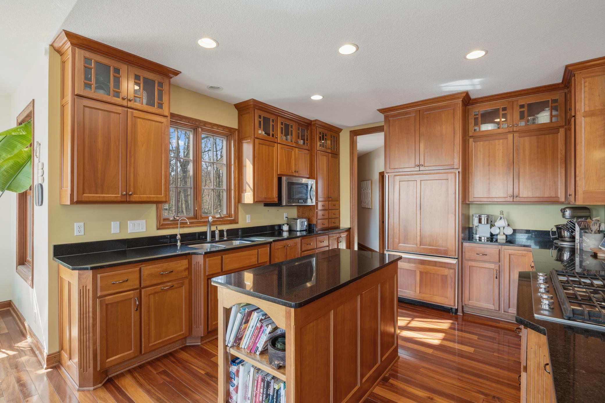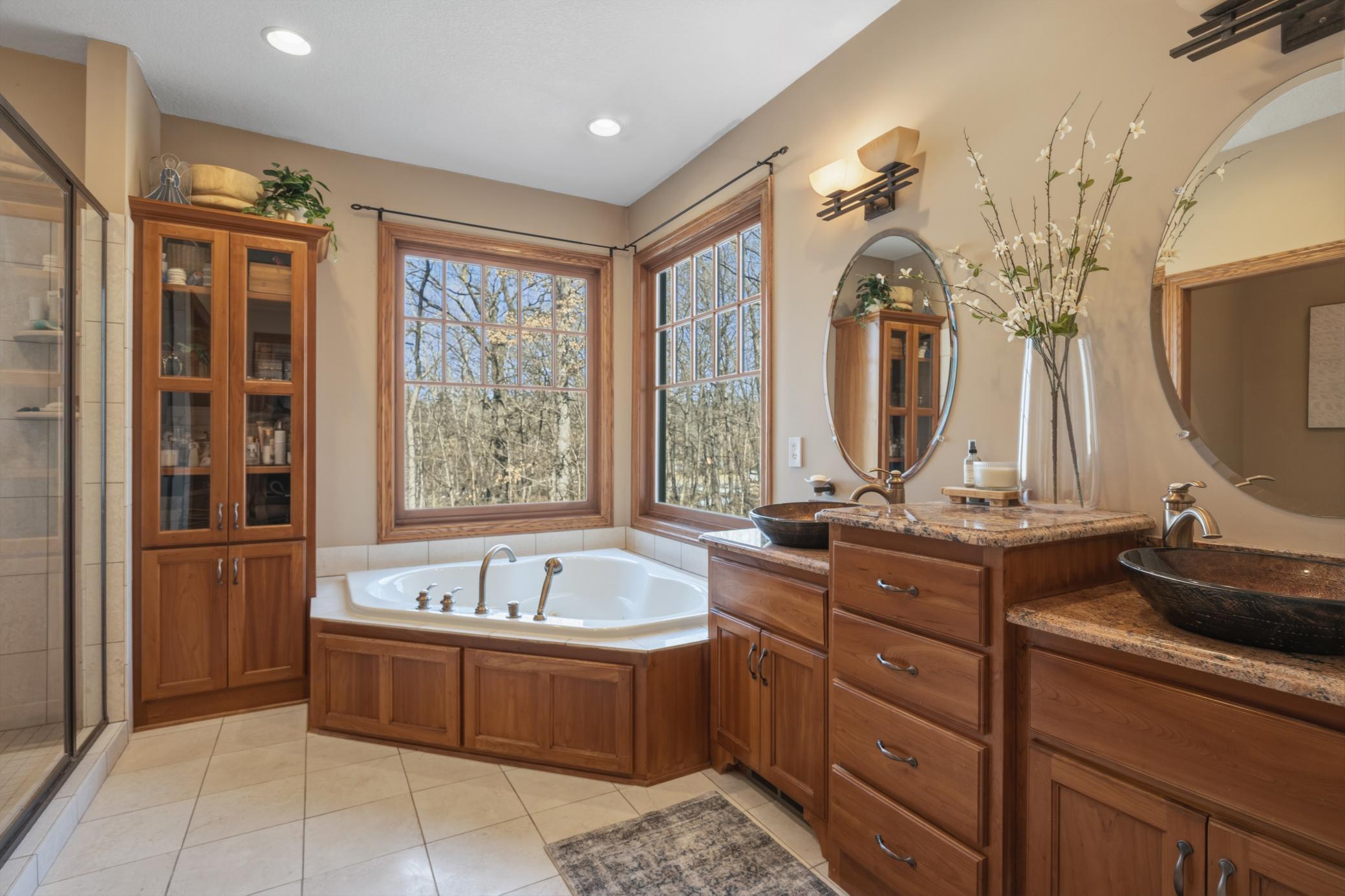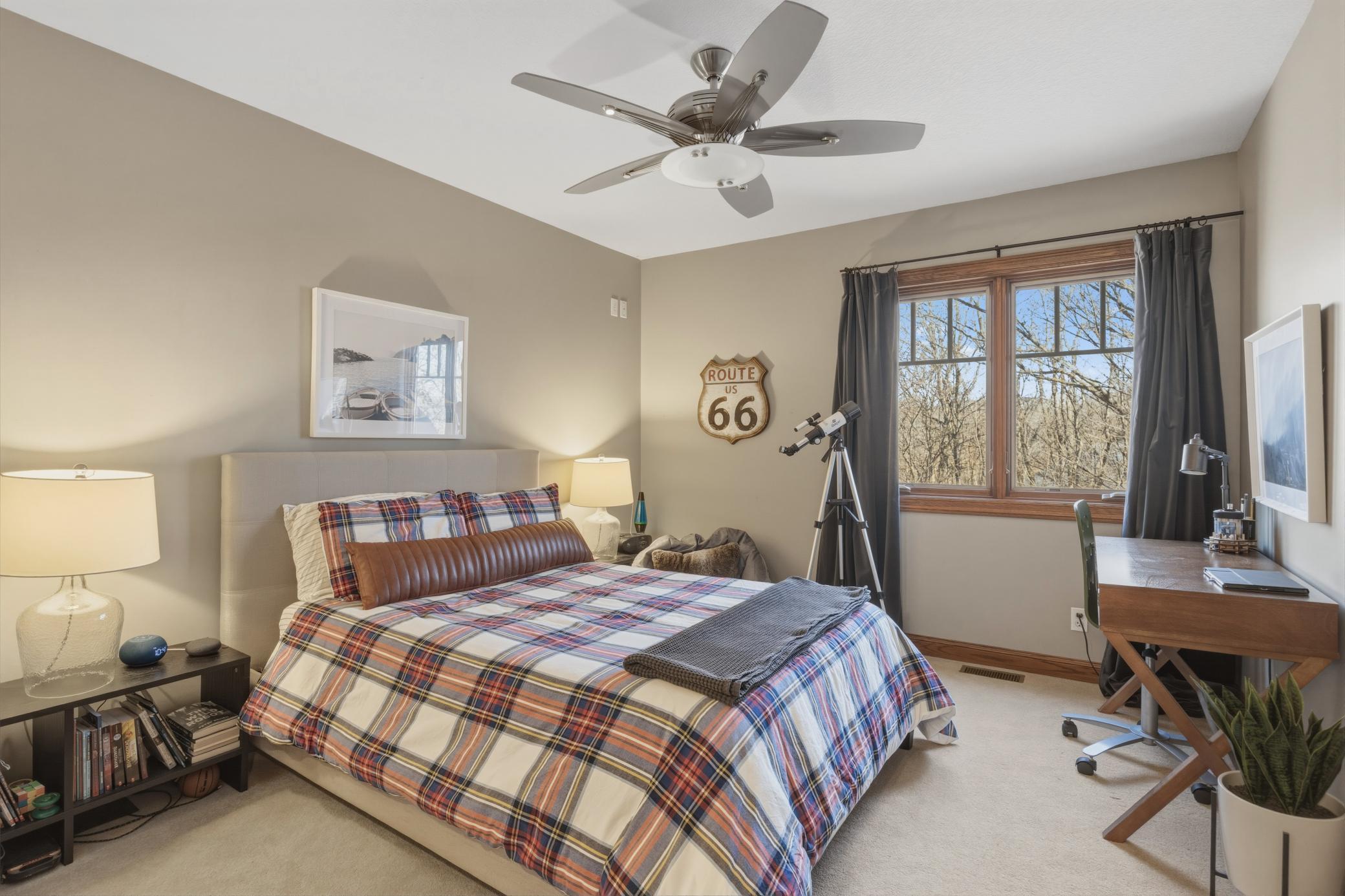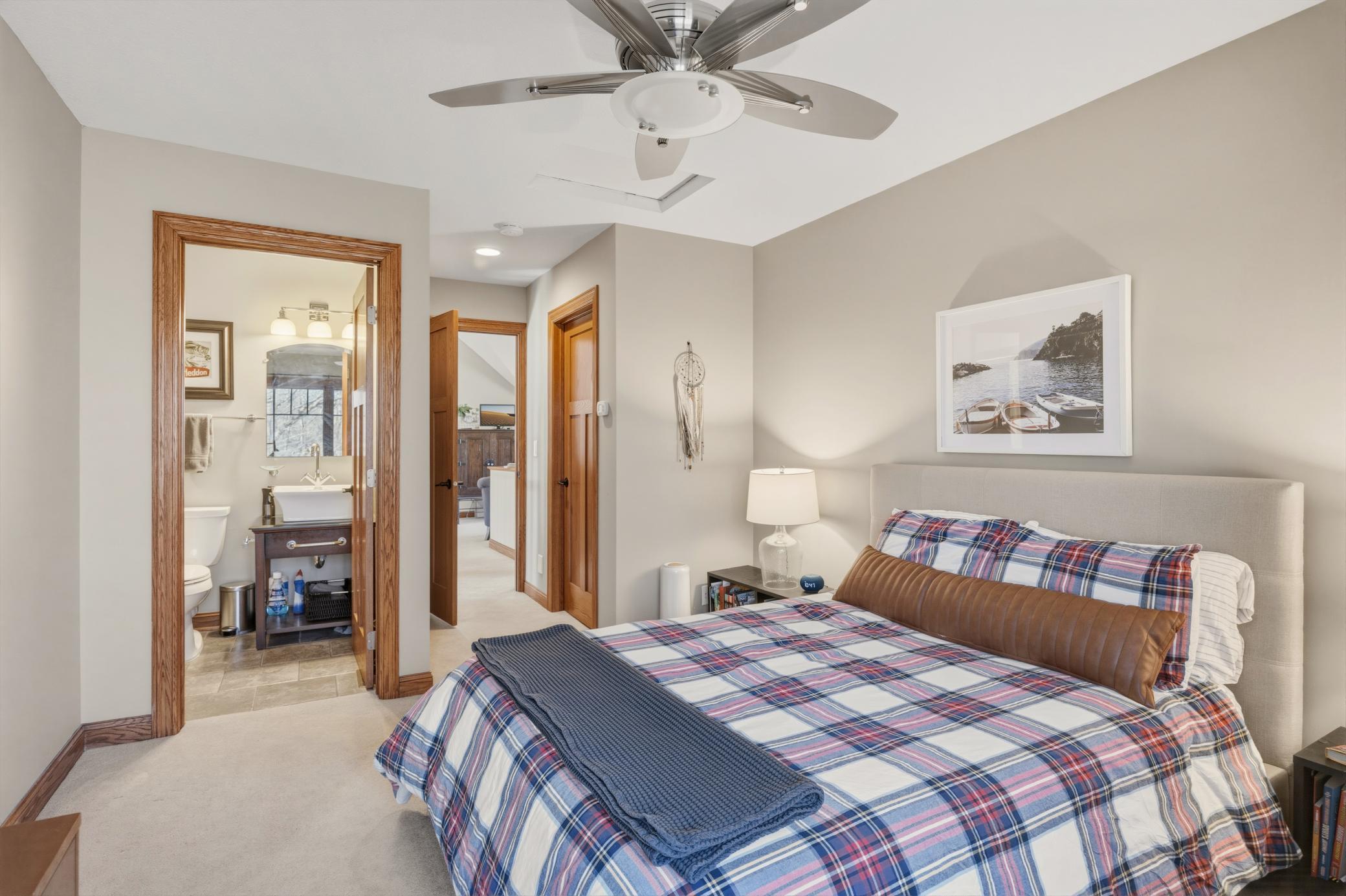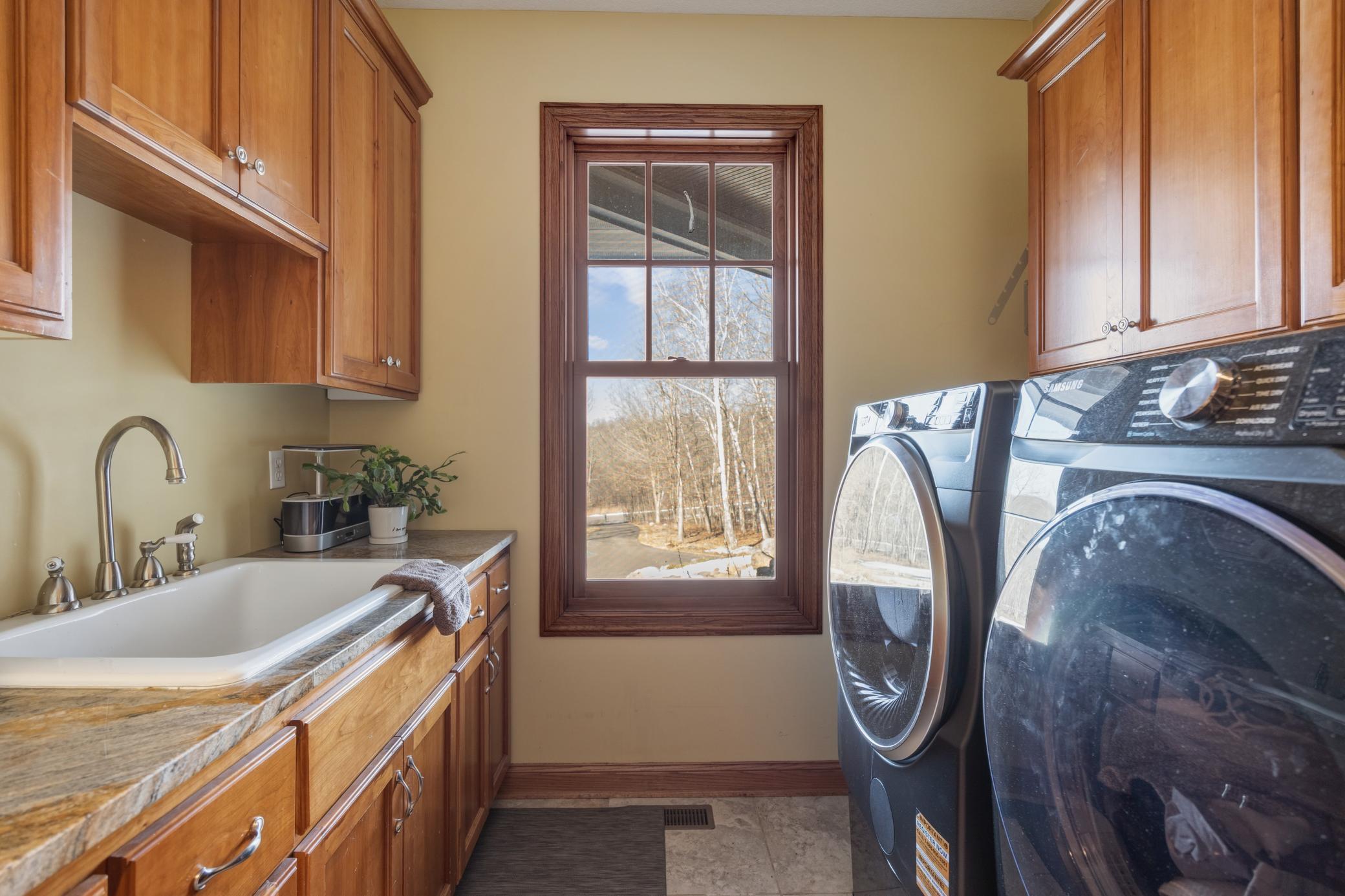 Welcome to 19155 263rd St, an exceptional custom-built home situated on 2.5 private acres along the St. Croix River in the prestigious St. Croix Bluffs neighborhood. This unique estate features a stunning floor-to-ceiling stone fireplace and impressive towering ceilings, along with cherrywood custom cabinets and tigerwood hardwood floors. The main level includes a spacious primary suite with an arched hallway entry and beautiful windows that flood the space with natural light. Upstairs, you will find two bedrooms—one with an en-suite bath—as well as a generous bonus room, ideal for a children's play area, a flexible room, a movie room, or a creative space. The large open basement features a family room with a wood-burning fireplace and wet bar, a bathroom with a walk-in steam shower, and additional unfinished flex space currently used as a hobby shop. The home is equipped with in-floor heating throughout. The heated four-car garage even includes an elevator for easy transport of your belongings into the house! Outside, you'll find ample deck and patio space, perfect for entertaining or simply enjoying the tranquility of the private wooded surroundings.