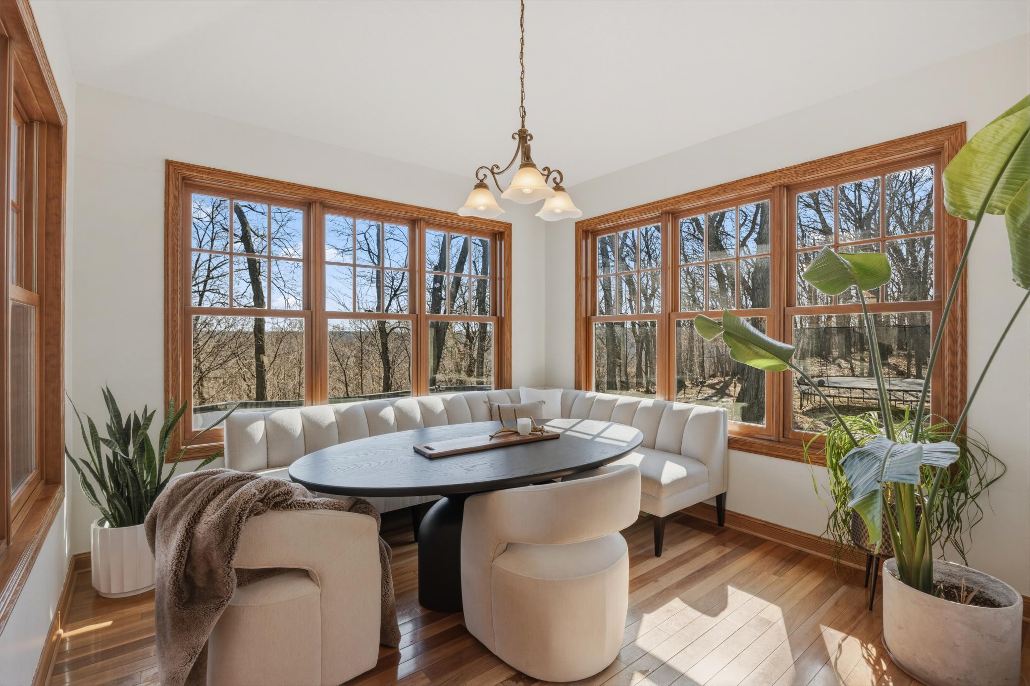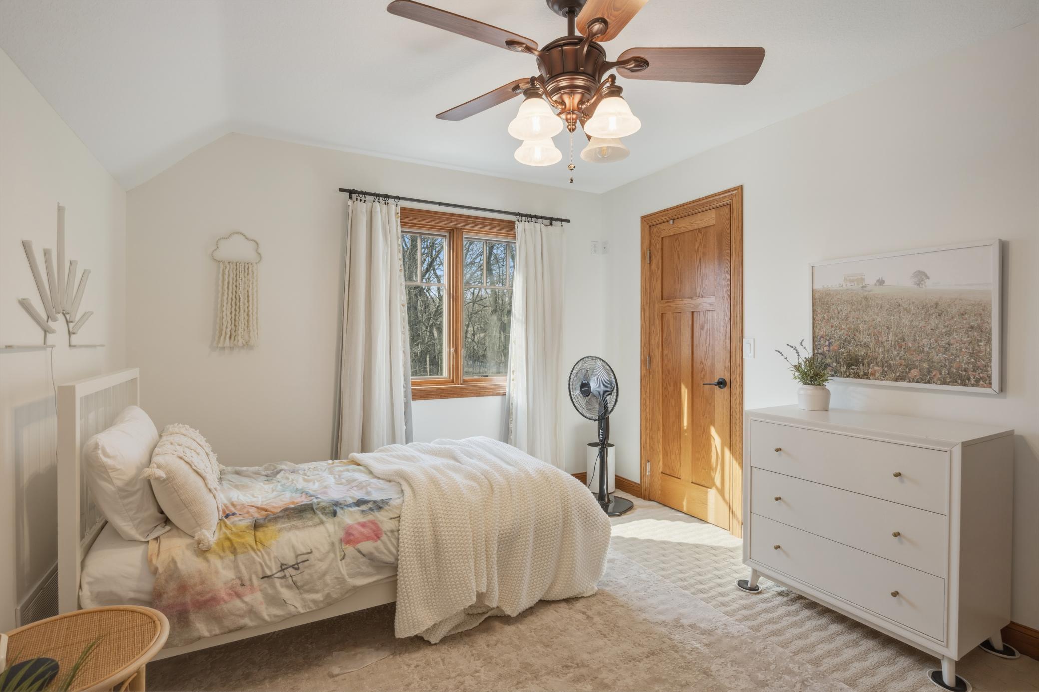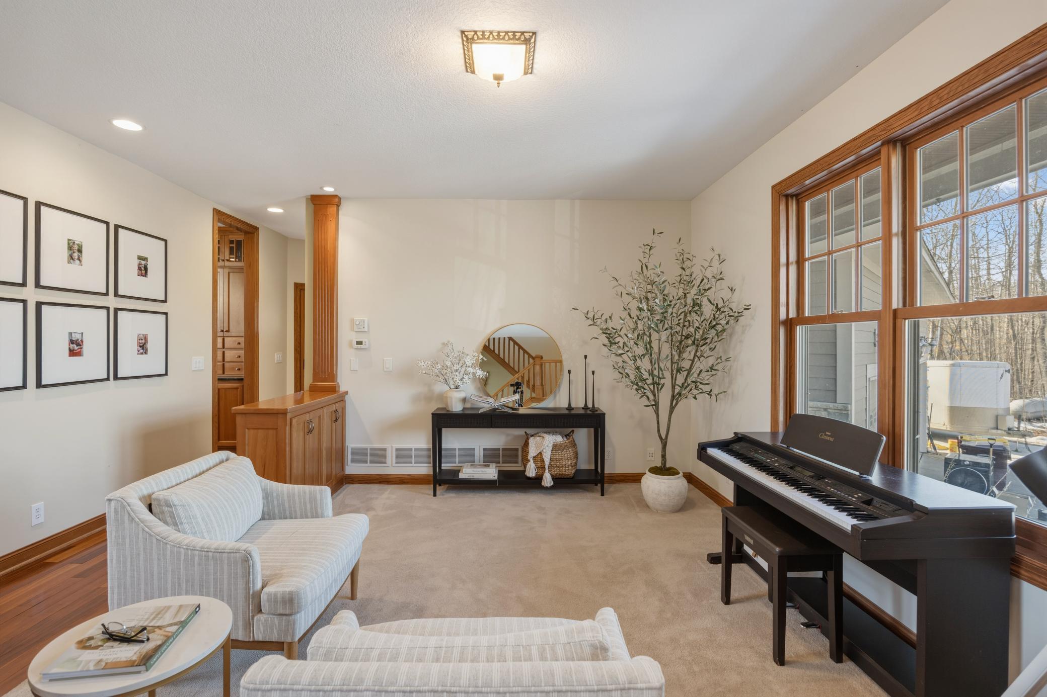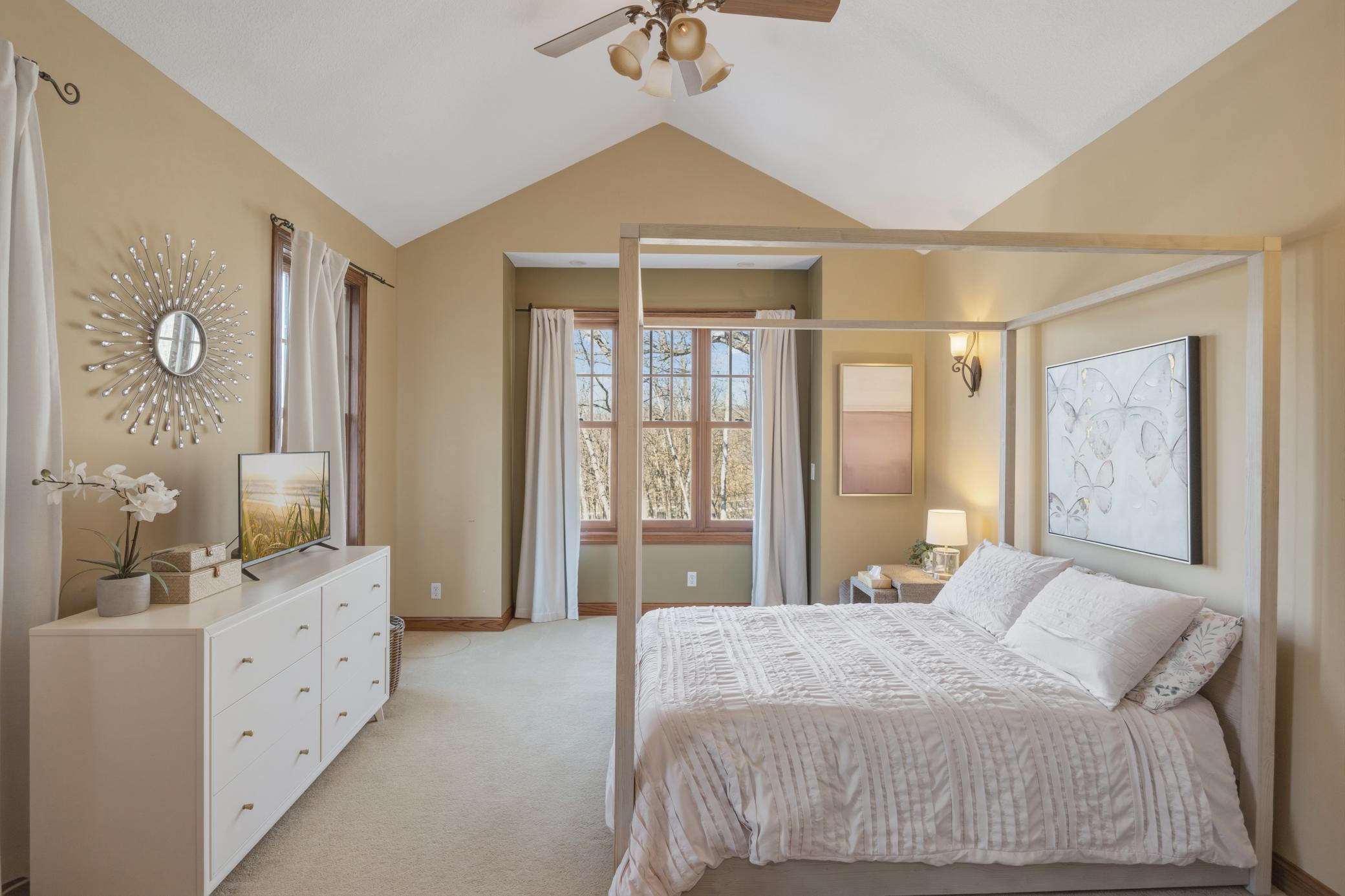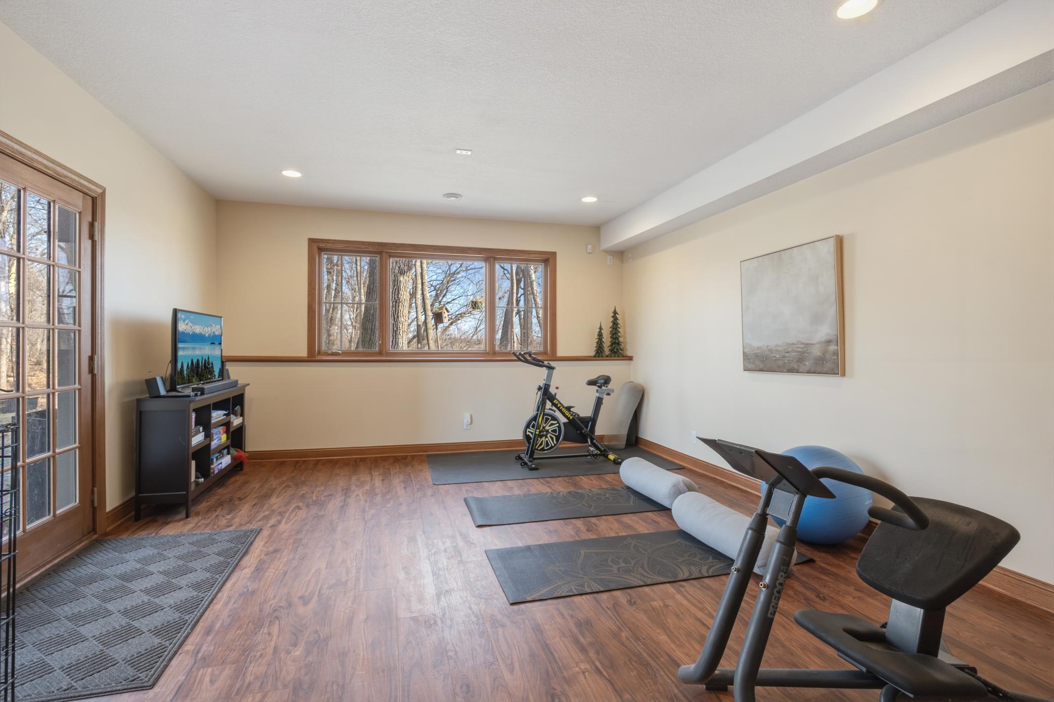 Welcome to 19155 263rd St, an exceptional custom-built home situated on 2.5 private acres along the St. Croix River in the prestigious St. Croix Bluffs neighborhood. This unique estate features a stunning floor-to-ceiling stone fireplace and impressive towering ceilings, along with cherrywood custom cabinets and tigerwood hardwood floors. The main level includes a spacious primary suite with an arched hallway entry and beautiful windows that flood the space with natural light. Upstairs, you will find two bedrooms—one with an en-suite bath—as well as a generous bonus room, ideal for a children's play area, a flexible room, a movie room, or a creative space. The large open basement features a family room with a wood-burning fireplace and wet bar, a bathroom with a walk-in steam shower, and additional unfinished flex space currently used as a hobby shop. The home is equipped with in-floor heating throughout. The heated four-car garage even includes an elevator for easy transport of your belongings into the house! Outside, you'll find ample deck and patio space, perfect for entertaining or simply enjoying the tranquility of the private wooded surroundings.