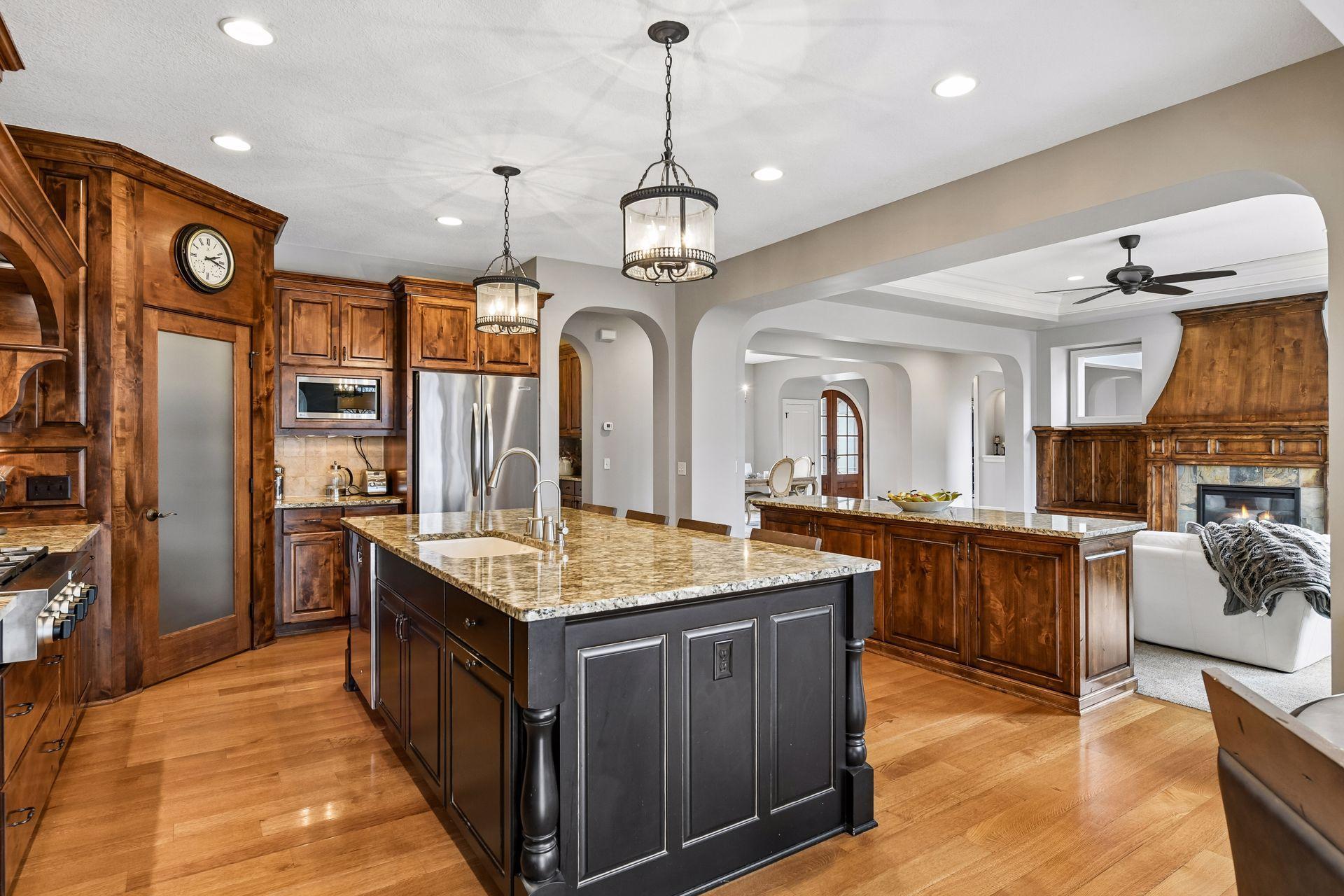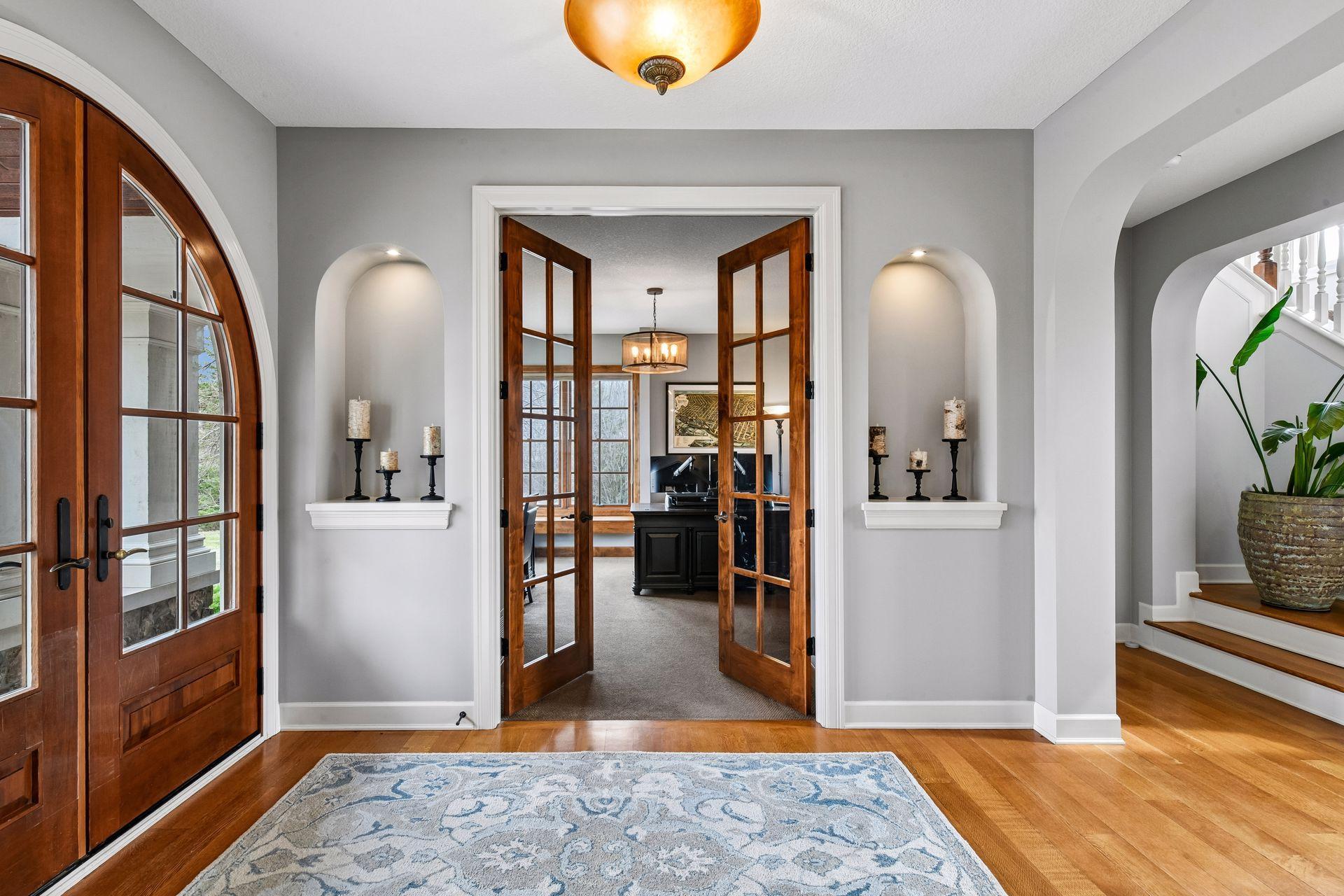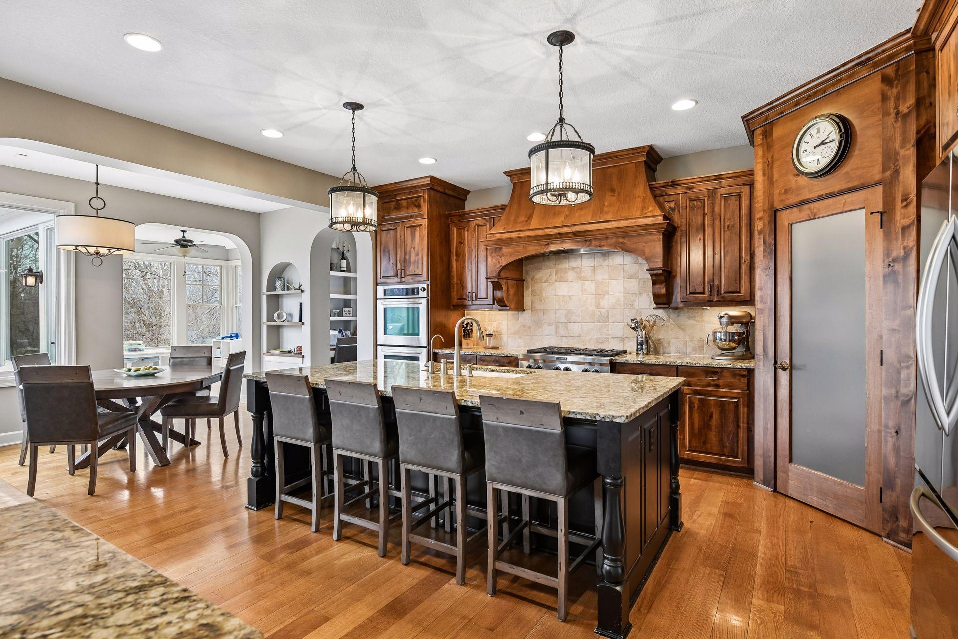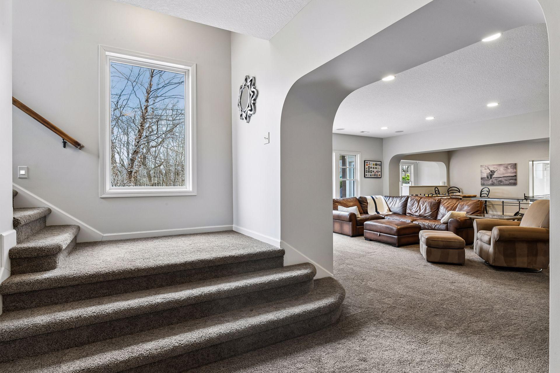 Stunning Charles Cudd built two story home set on 2.13 private acres, abutting woods and the Luce Line Trail in Orono’s premier estate neighborhood, Graham Hill Preserve. This home offers an exceptional balance of privacy and refined neighborhood living. Exquisite architectural details are showcased throughout, including custom cabinetry, arched openings, dramatic gallery hallways, and oversized windows that fill the home with natural light. The spacious open floor plan is ideal for everyday living and effortless entertaining. The main level features a chef’s kitchen with double islands, walk in pantry, and high-end appliances. An adjacent sunroom with three walls of windows provides a bright and inviting retreat, perfect for morning coffee or flexible living space. Additional main level highlights include a formal dining room with built in buffet, dedicated home office, spacious office/den, and a mudroom with lockers. The upper level offers a private primary suite with its own entry hall and sweeping wooded views, along with three additional spacious bedrooms. A bonus room provides excellent flexibility as a study, media room, or additional bedroom. The lower level is designed for recreation and relaxation, complete with heated floors, a large media area, generous space for game tables, room for a future bar, and a full sport court with 16-foot ceilings. A spacious four car garage with floor drains and roughed in for heat completes the home. Graham Hill Preserve amenities include a community tennis/pickleball/basketball court, gazebo, firepit, walking paths, and access to the Luce Line Trail. Located within the highly sought after Orono School District, with a convenient five-minute drive to campus.