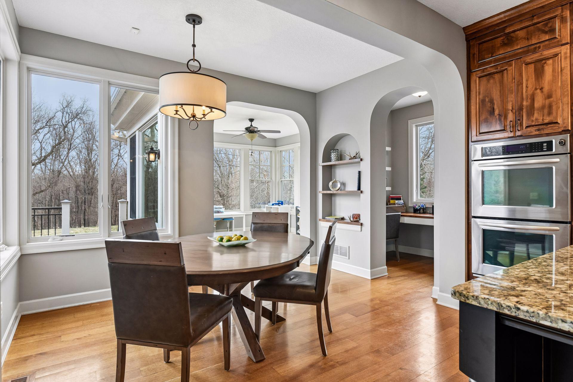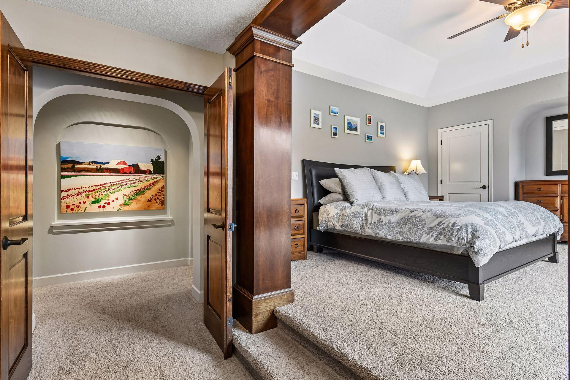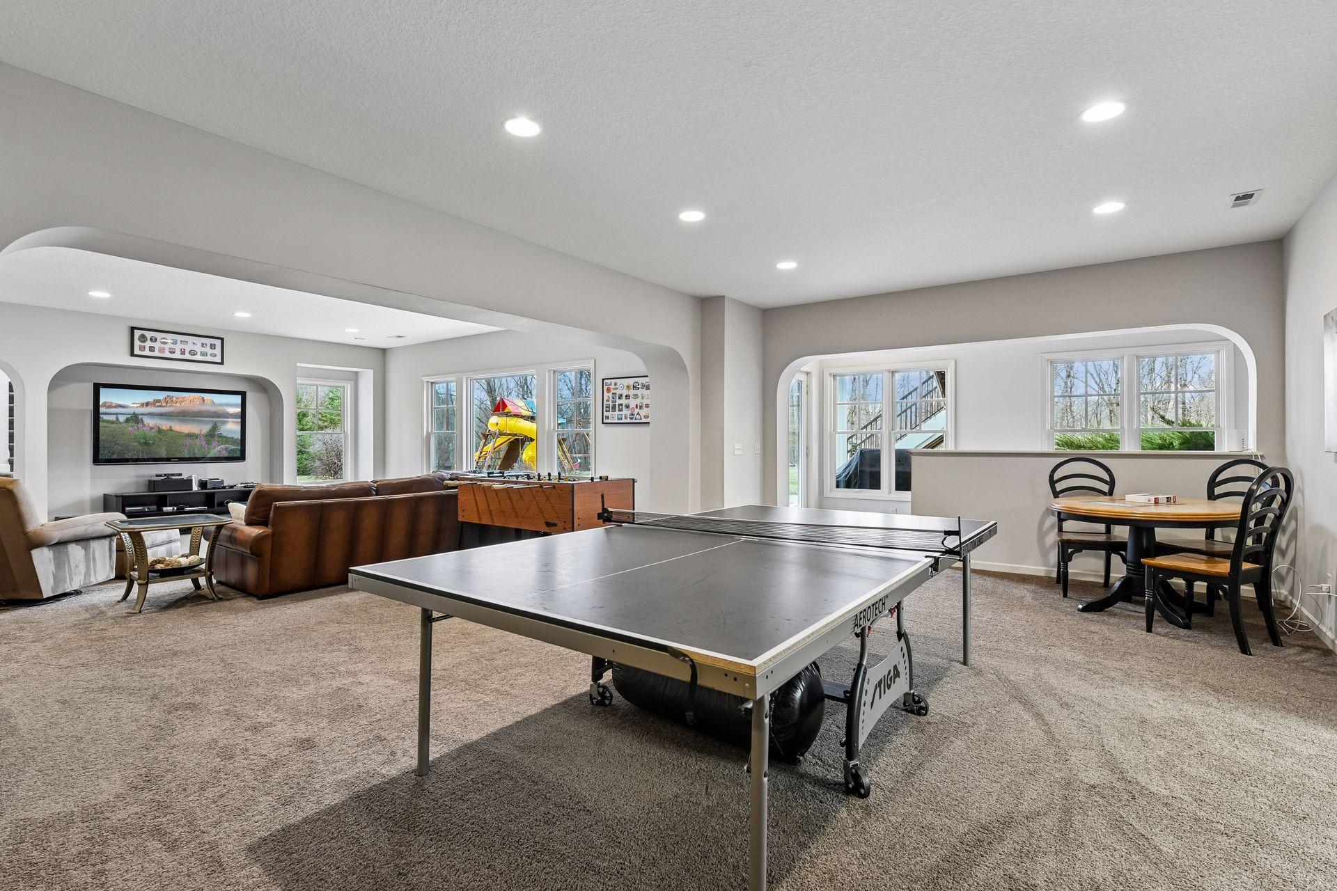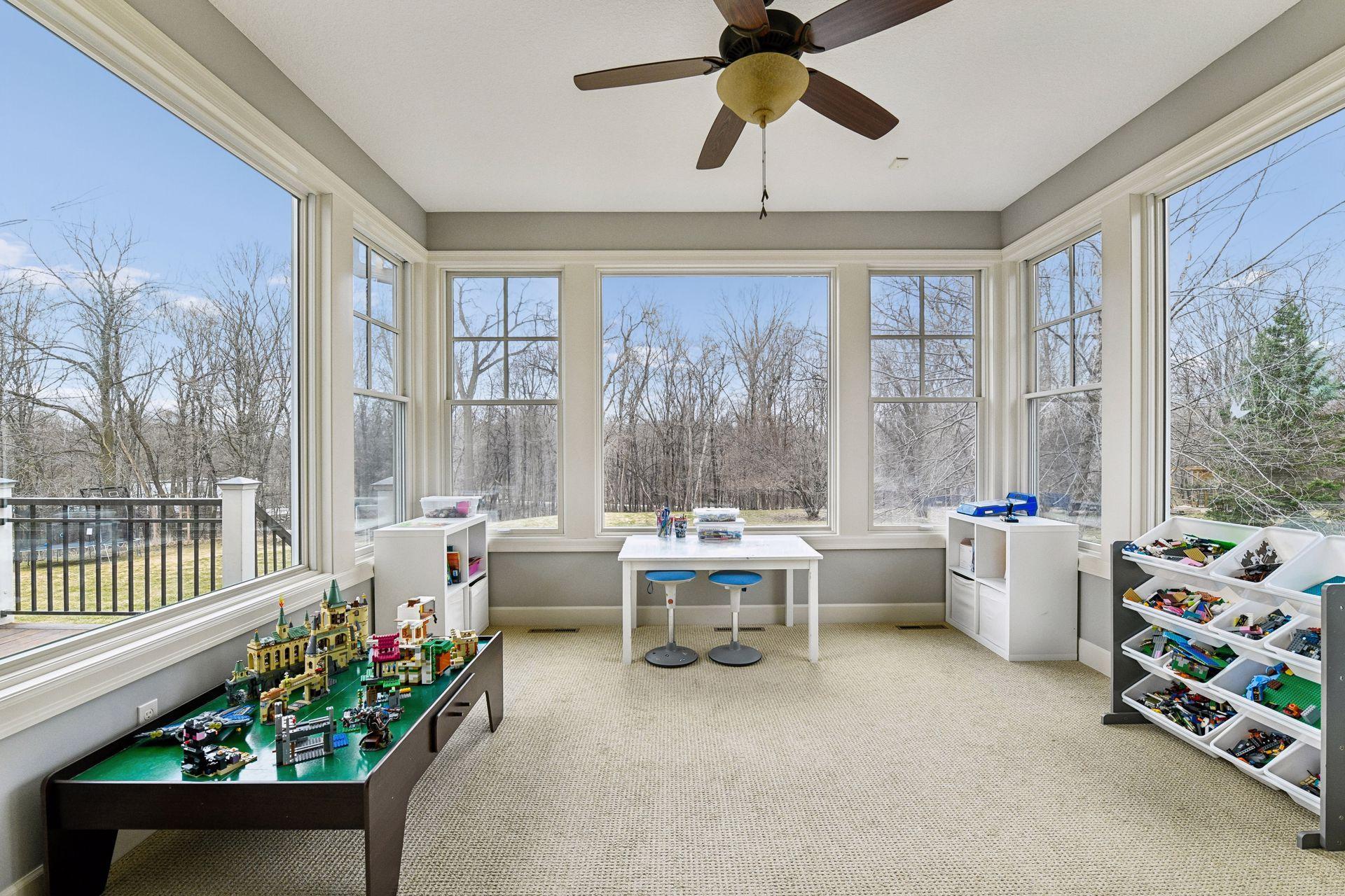 Stunning Charles Cudd built two story home set on 2.13 private acres, abutting woods and the Luce Line Trail in Orono’s premier estate neighborhood, Graham Hill Preserve. This home offers an exceptional balance of privacy and refined neighborhood living. Exquisite architectural details are showcased throughout, including custom cabinetry, arched openings, dramatic gallery hallways, and oversized windows that fill the home with natural light. The spacious open floor plan is ideal for everyday living and effortless entertaining. The main level features a chef’s kitchen with double islands, walk in pantry, and high-end appliances. An adjacent sunroom with three walls of windows provides a bright and inviting retreat, perfect for morning coffee or flexible living space. Additional main level highlights include a formal dining room with built in buffet, dedicated home office, spacious office/den, and a mudroom with lockers. The upper level offers a private primary suite with its own entry hall and sweeping wooded views, along with three additional spacious bedrooms. A bonus room provides excellent flexibility as a study, media room, or additional bedroom. The lower level is designed for recreation and relaxation, complete with heated floors, a large media area, generous space for game tables, room for a future bar, and a full sport court with 16-foot ceilings. A spacious four car garage with floor drains and roughed in for heat completes the home. Graham Hill Preserve amenities include a community tennis/pickleball/basketball court, gazebo, firepit, walking paths, and access to the Luce Line Trail. Located within the highly sought after Orono School District, with a convenient five-minute drive to campus.