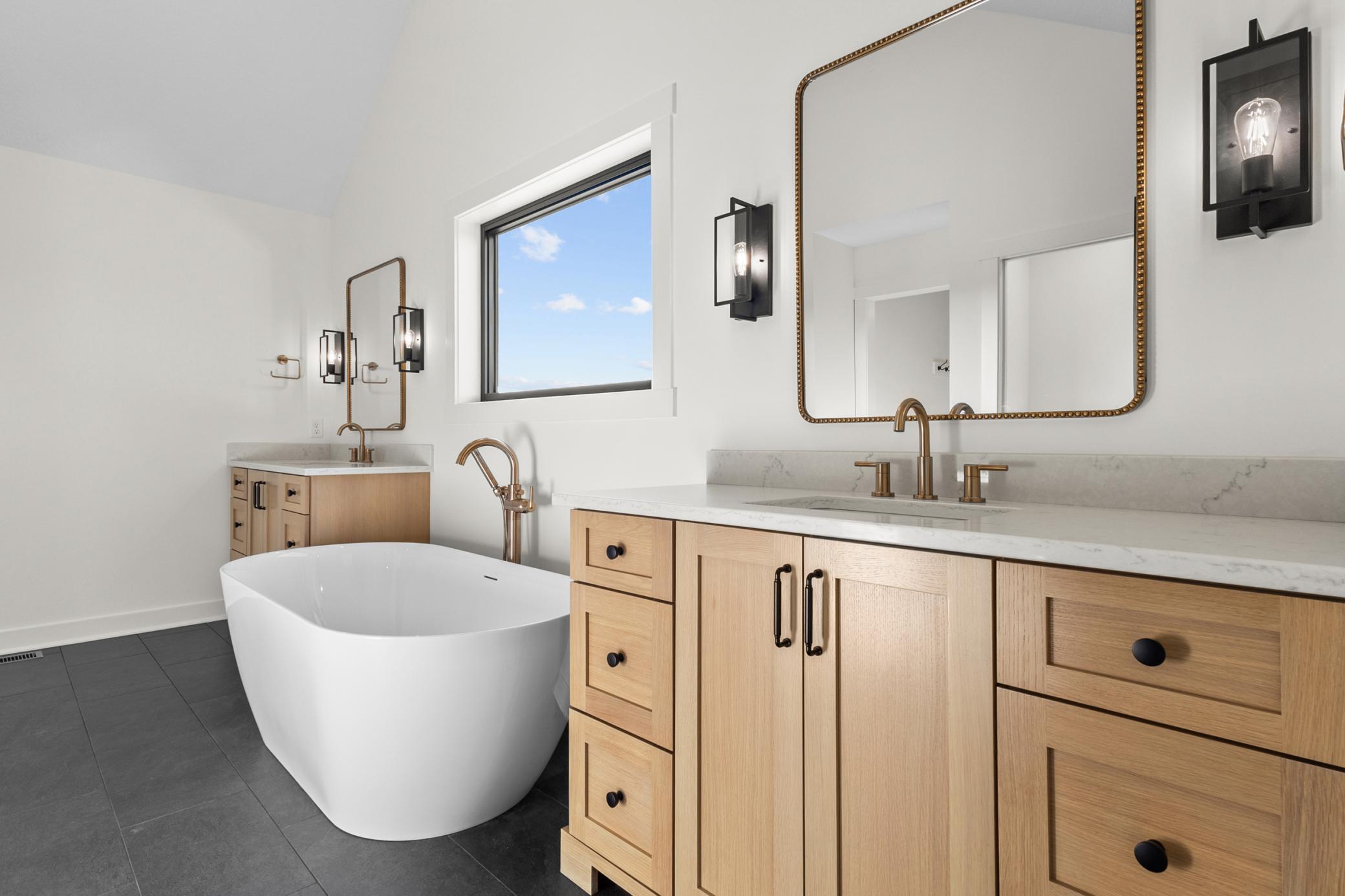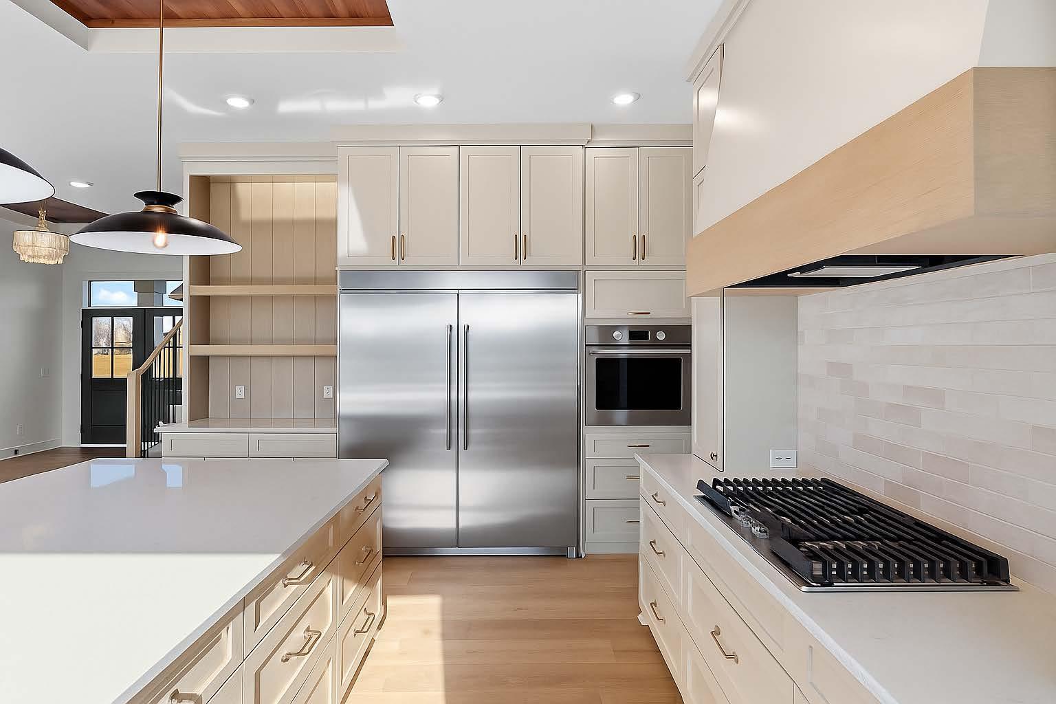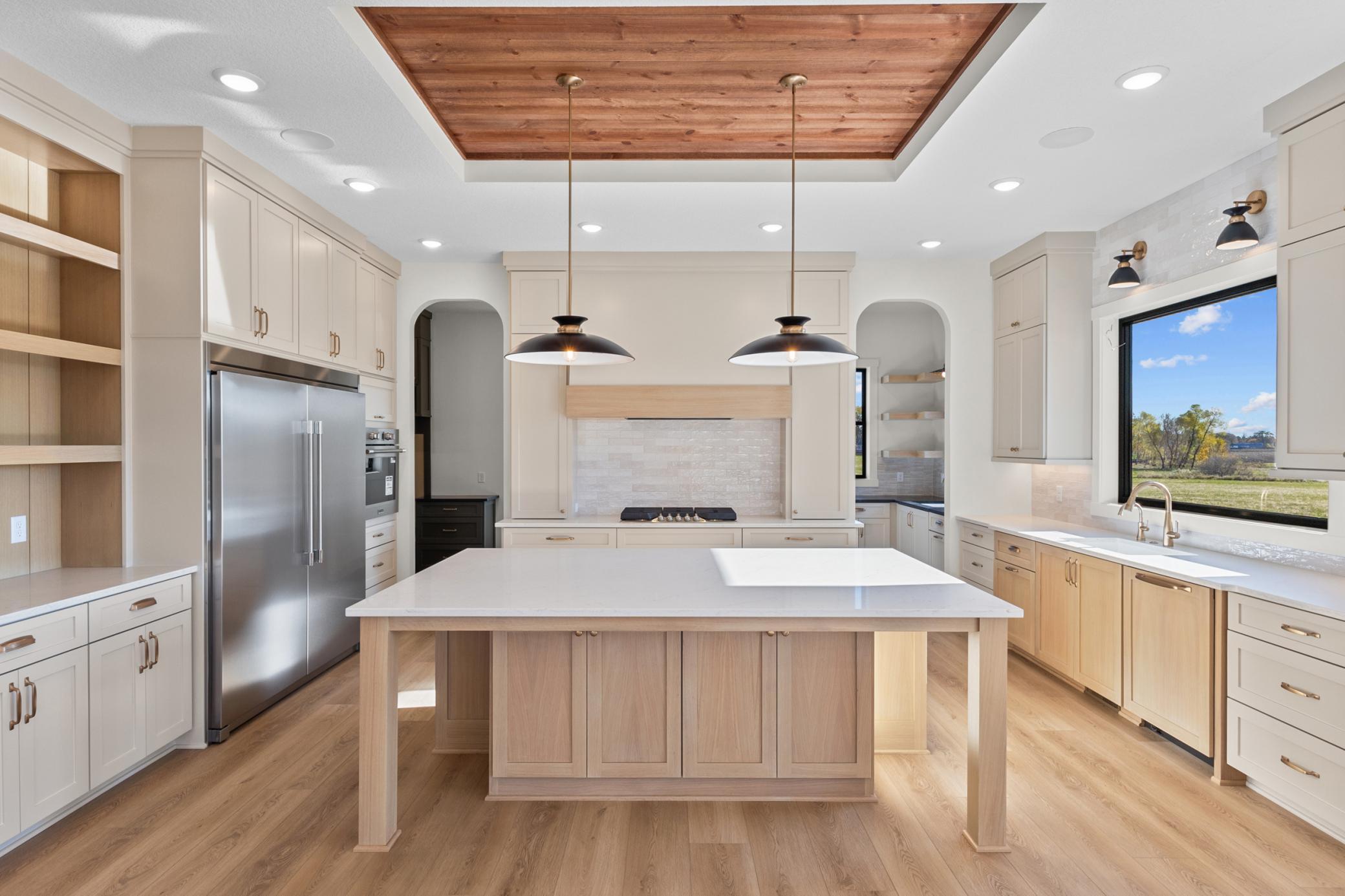 mantel anchoring a stunning fireplace feature wall. The custom kitchen, vaulted primary bath with heated