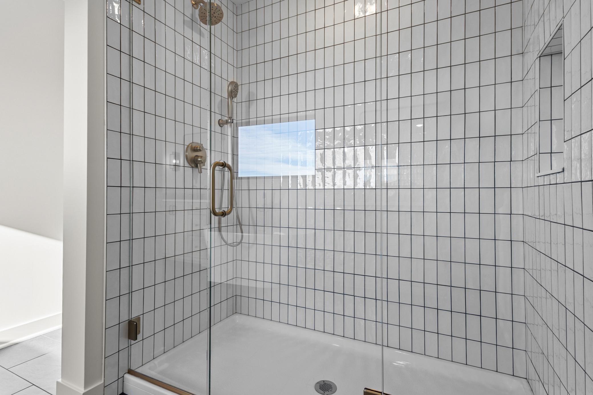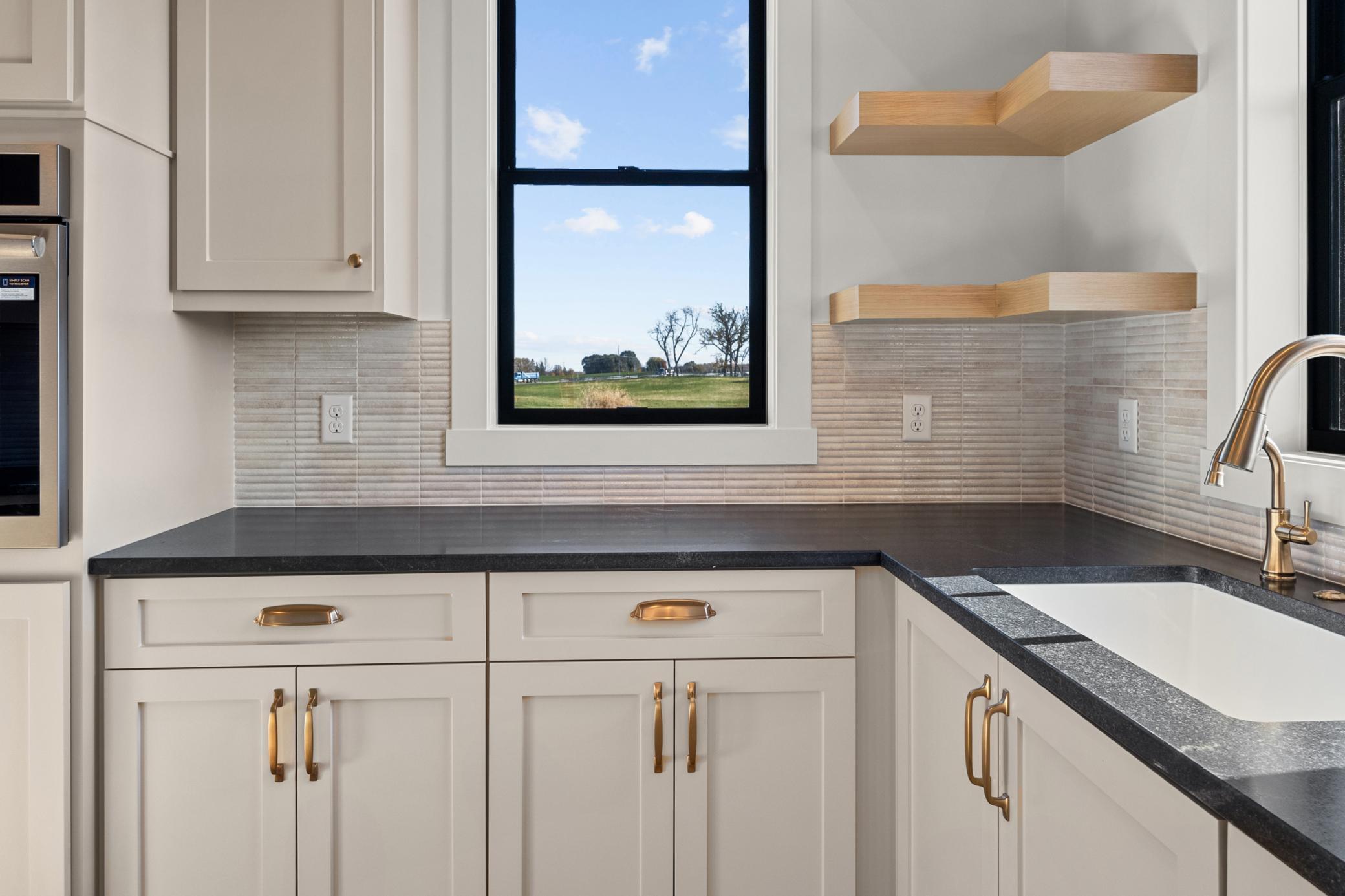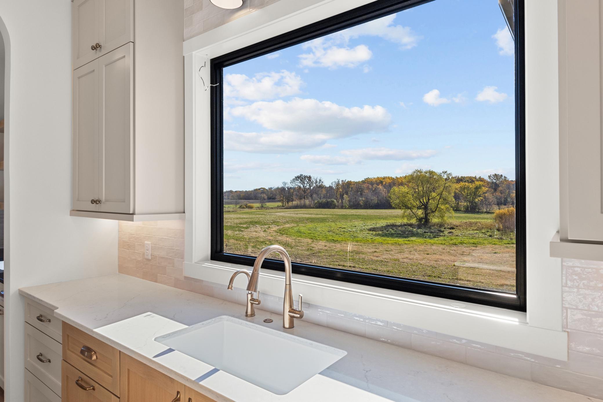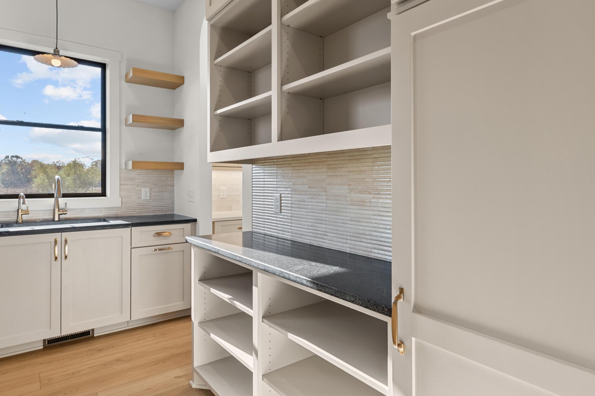 mantel anchoring a stunning fireplace feature wall. The custom kitchen, vaulted primary bath with heated