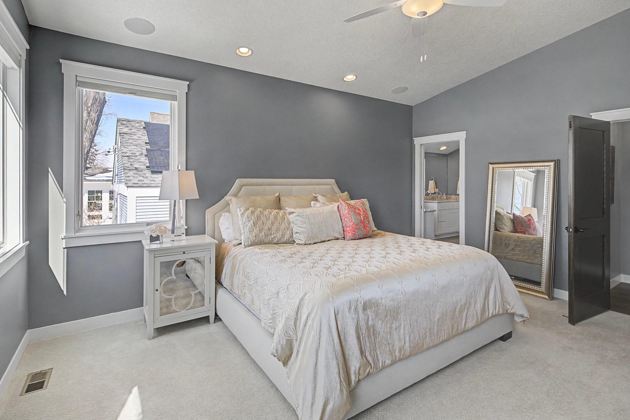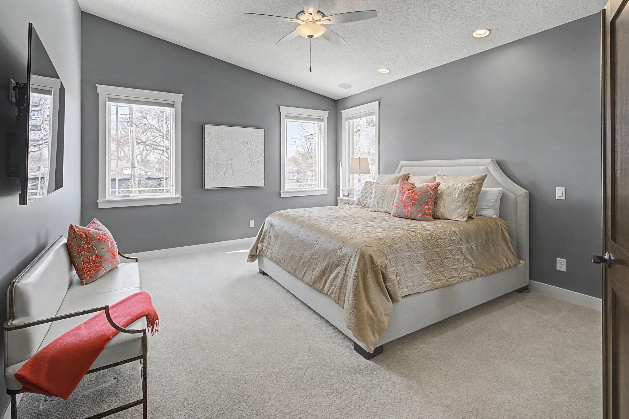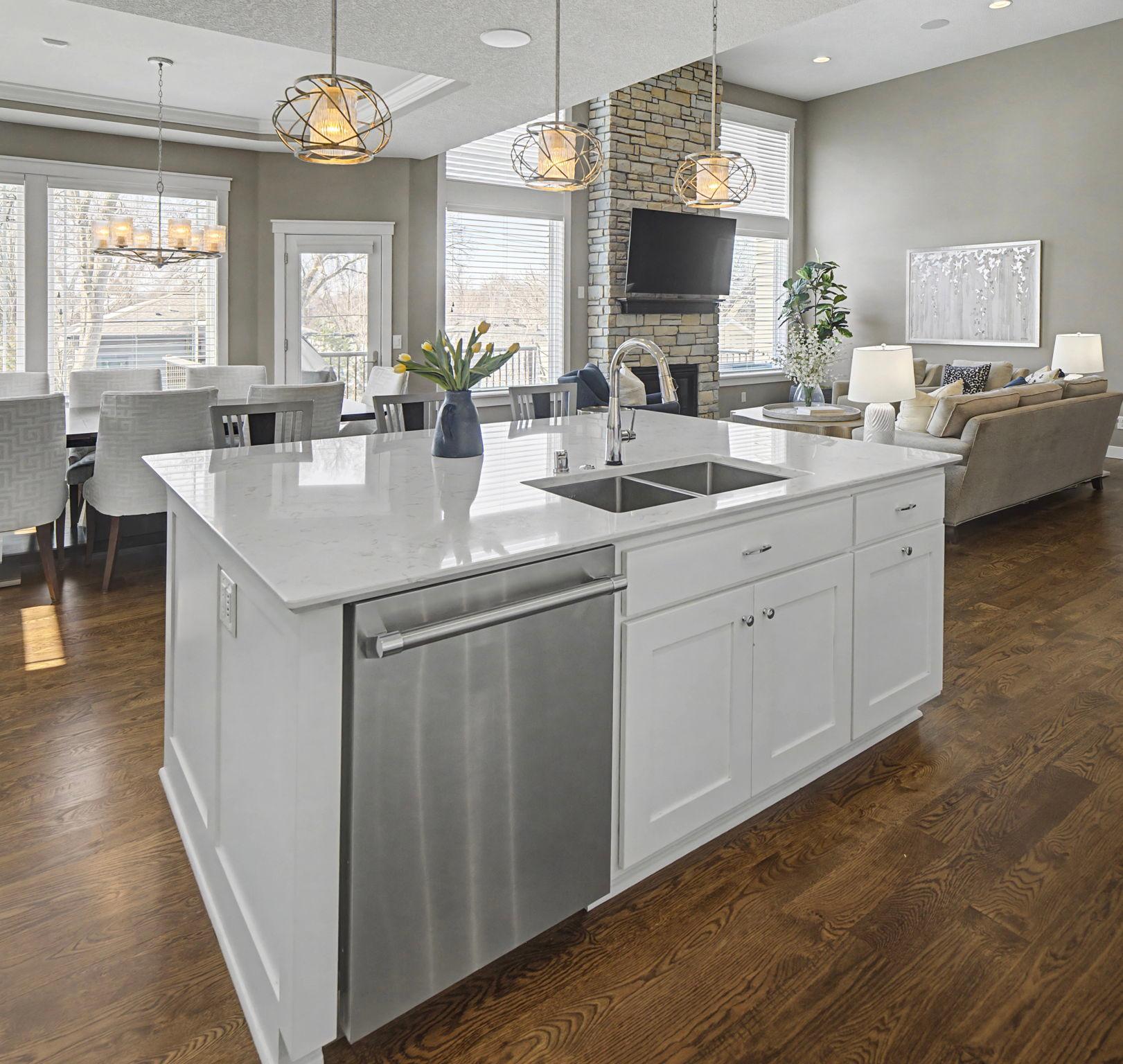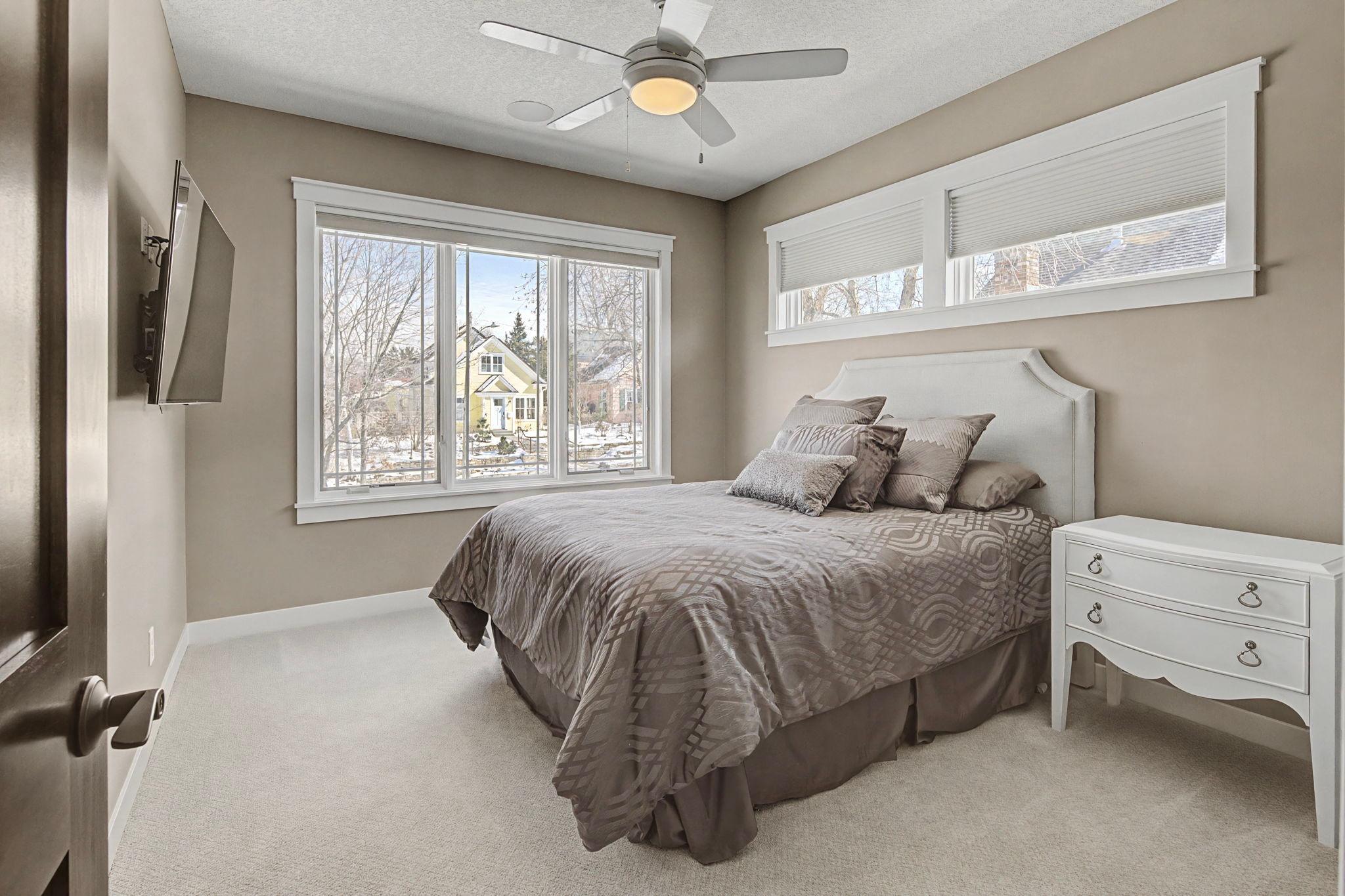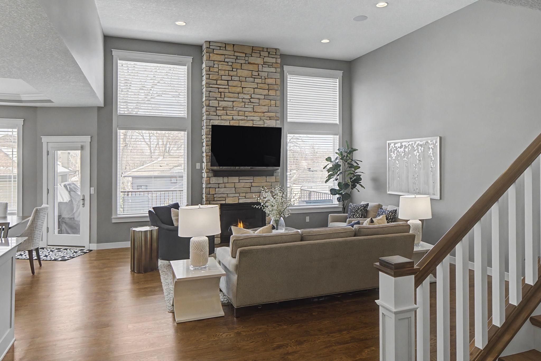 Set on a beautiful west facing double lot just steps to Lake Bde Maka Ska, this wonderful newer home features high ceilings, great natural light, a rare main level primary suite, and walls of glass overlooking the fully fenced rear yard. Take advantage of the spacious main level deck, front covered porch, and walkout level EZ screened porch. The main level features a 2-story great room with fireplace open to the expansive center island kitchen with Cambria counters, top-of-the-line appliances, hardwood floors and walk-in pantry, as well as a terrific den/office, ½ bath, mudroom, and heated attached garage. The convenient main level primary suite features a vaulted bedroom and full bath with dual vanities. Two additional bedrooms, bath and laundry are found on the upper level, while the walkout lower level offers a 4th bedroom, two baths, media room, exercise room, generous family room with 2-sided gas fireplace & wet bar, as well as access to the screened porch.