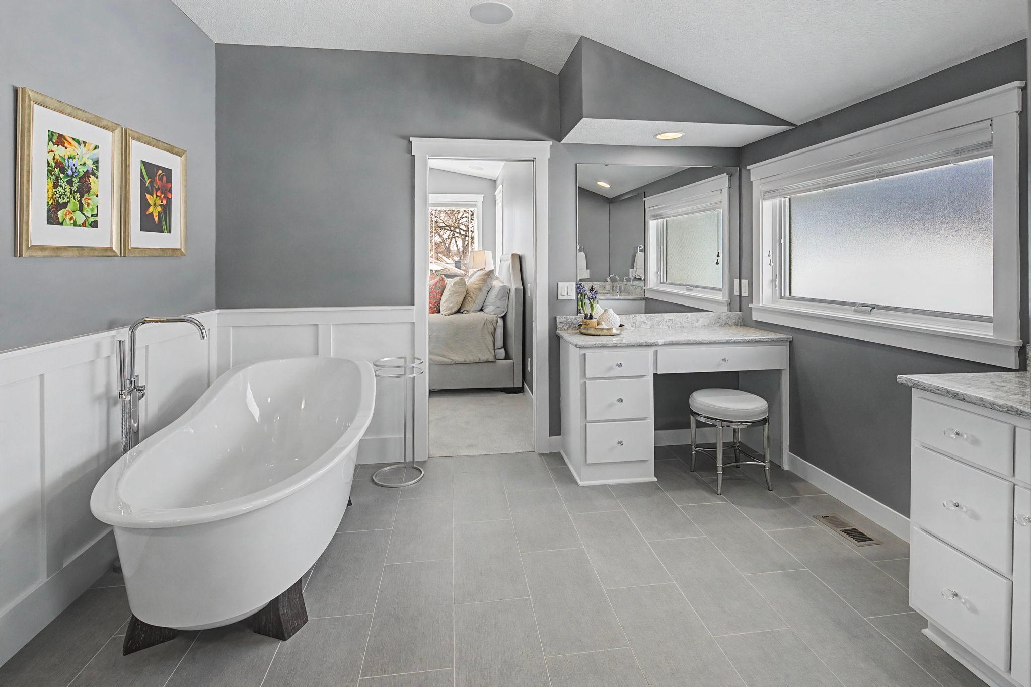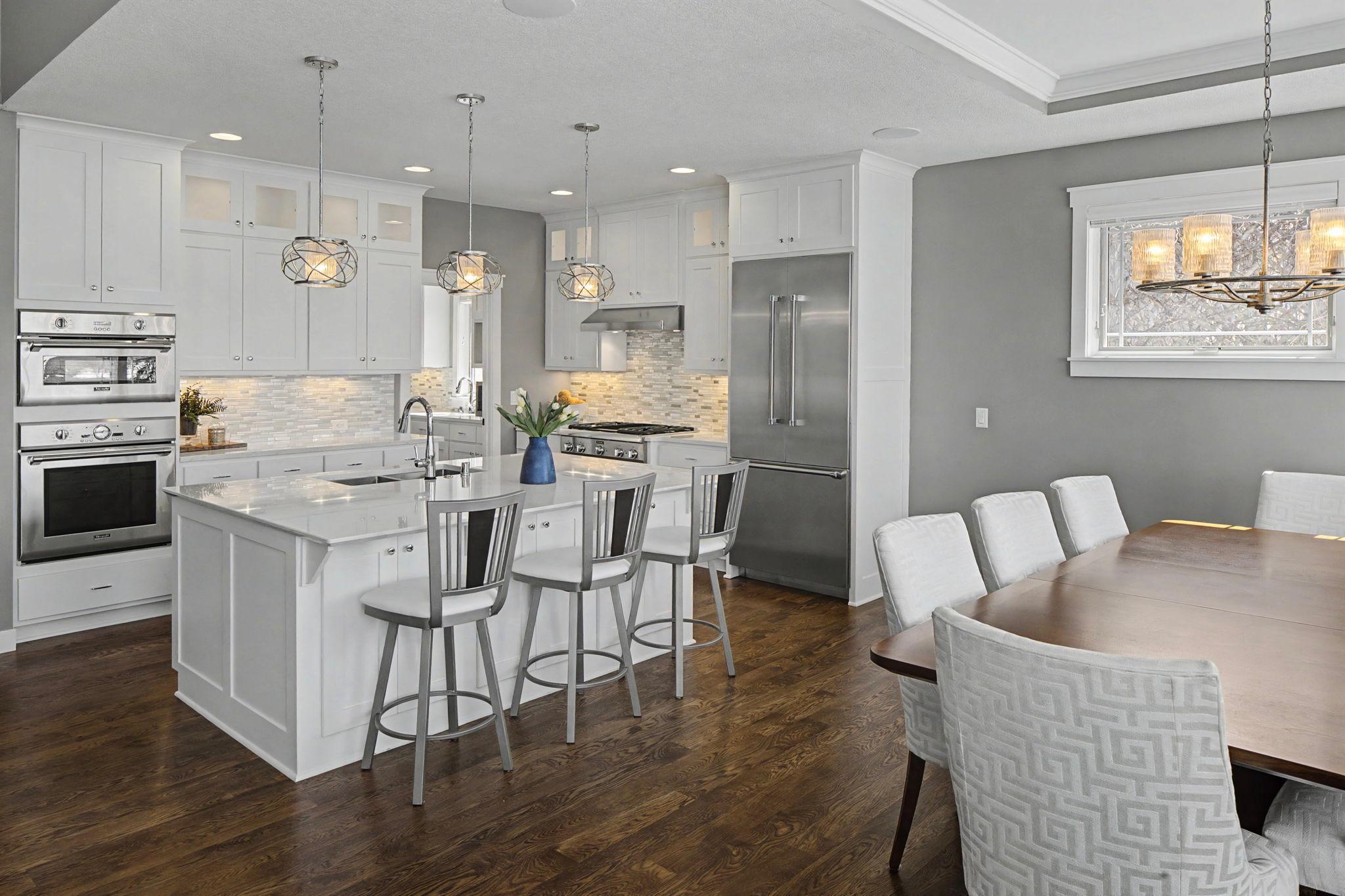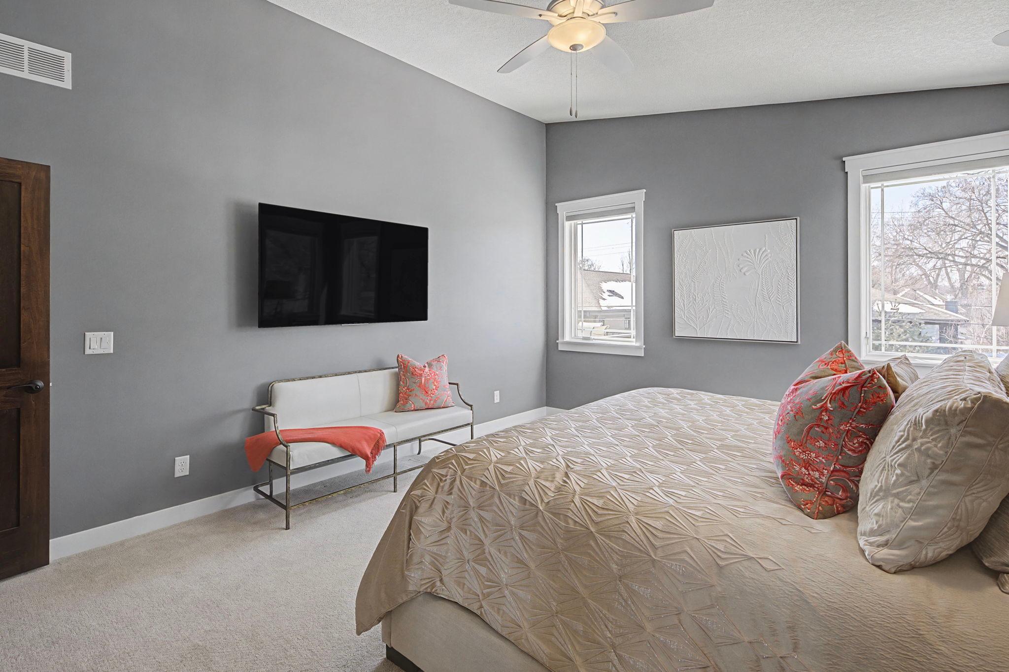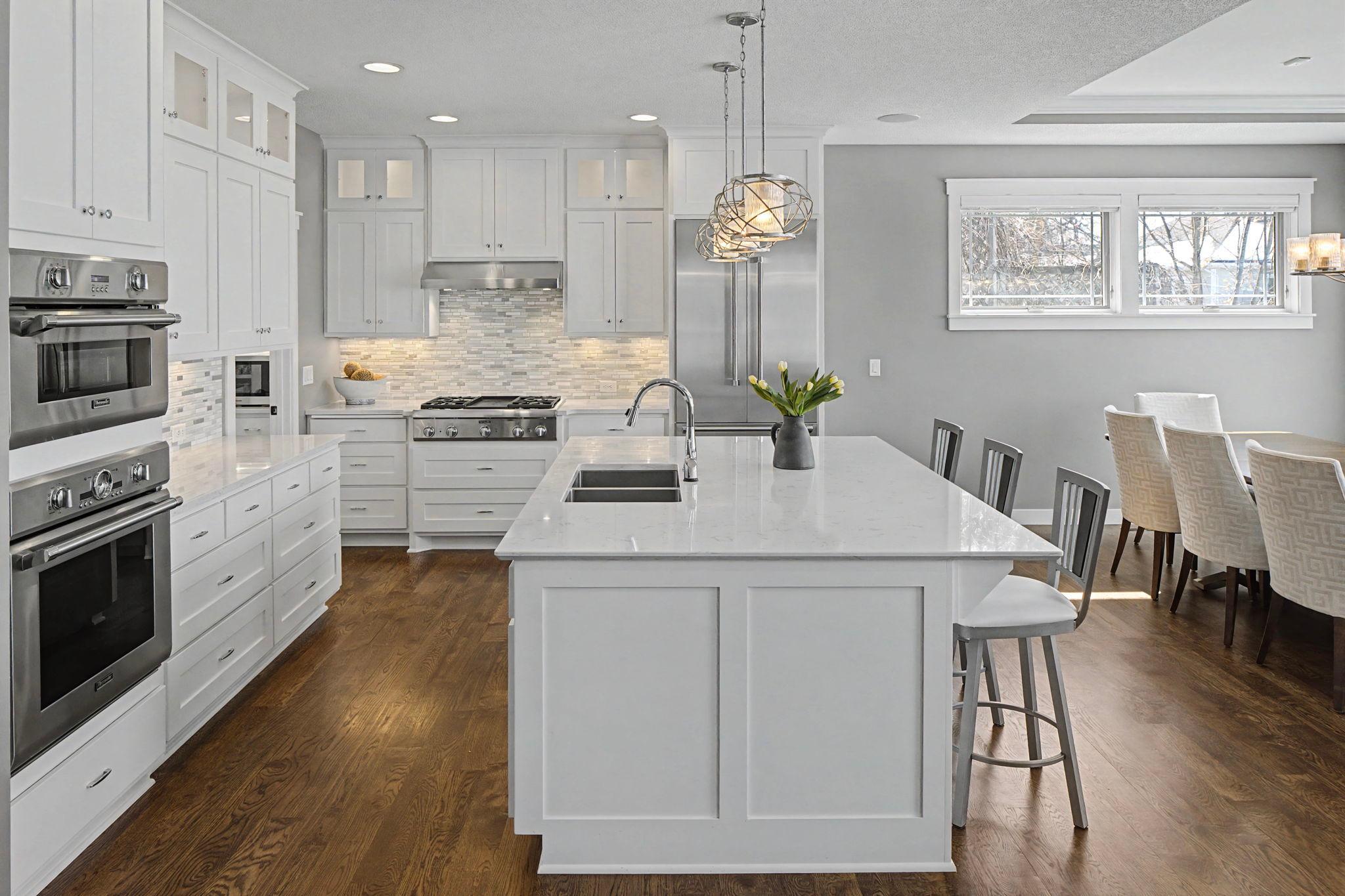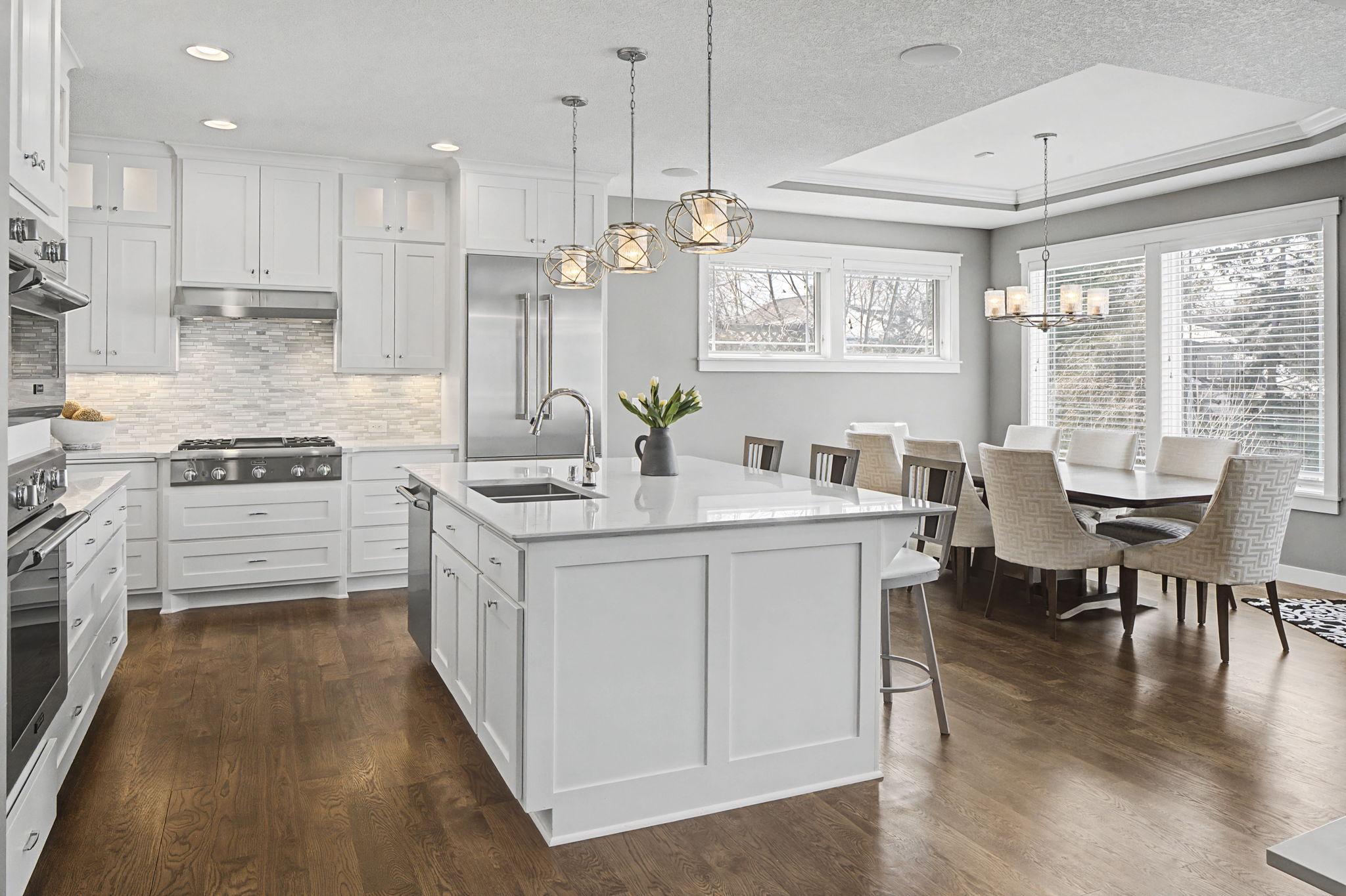 Set on a beautiful west facing double lot just steps to Lake Bde Maka Ska, this wonderful newer home features high ceilings, great natural light, a rare main level primary suite, and walls of glass overlooking the fully fenced rear yard. Take advantage of the spacious main level deck, front covered porch, and walkout level EZ screened porch. The main level features a 2-story great room with fireplace open to the expansive center island kitchen with Cambria counters, top-of-the-line appliances, hardwood floors and walk-in pantry, as well as a terrific den/office, ½ bath, mudroom, and heated attached garage. The convenient main level primary suite features a vaulted bedroom and full bath with dual vanities. Two additional bedrooms, bath and laundry are found on the upper level, while the walkout lower level offers a 4th bedroom, two baths, media room, exercise room, generous family room with 2-sided gas fireplace & wet bar, as well as access to the screened porch.